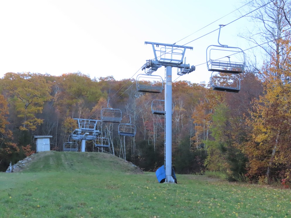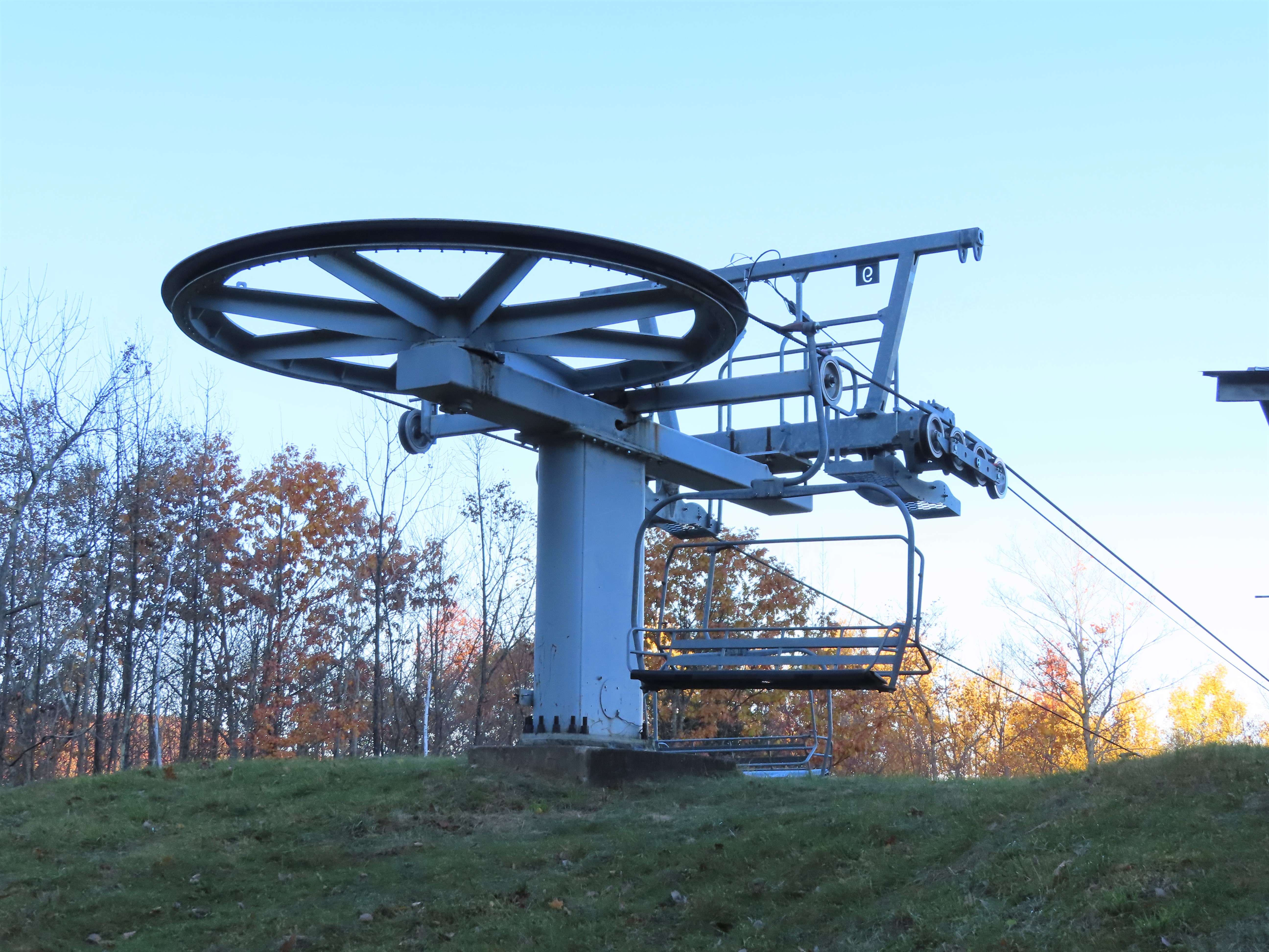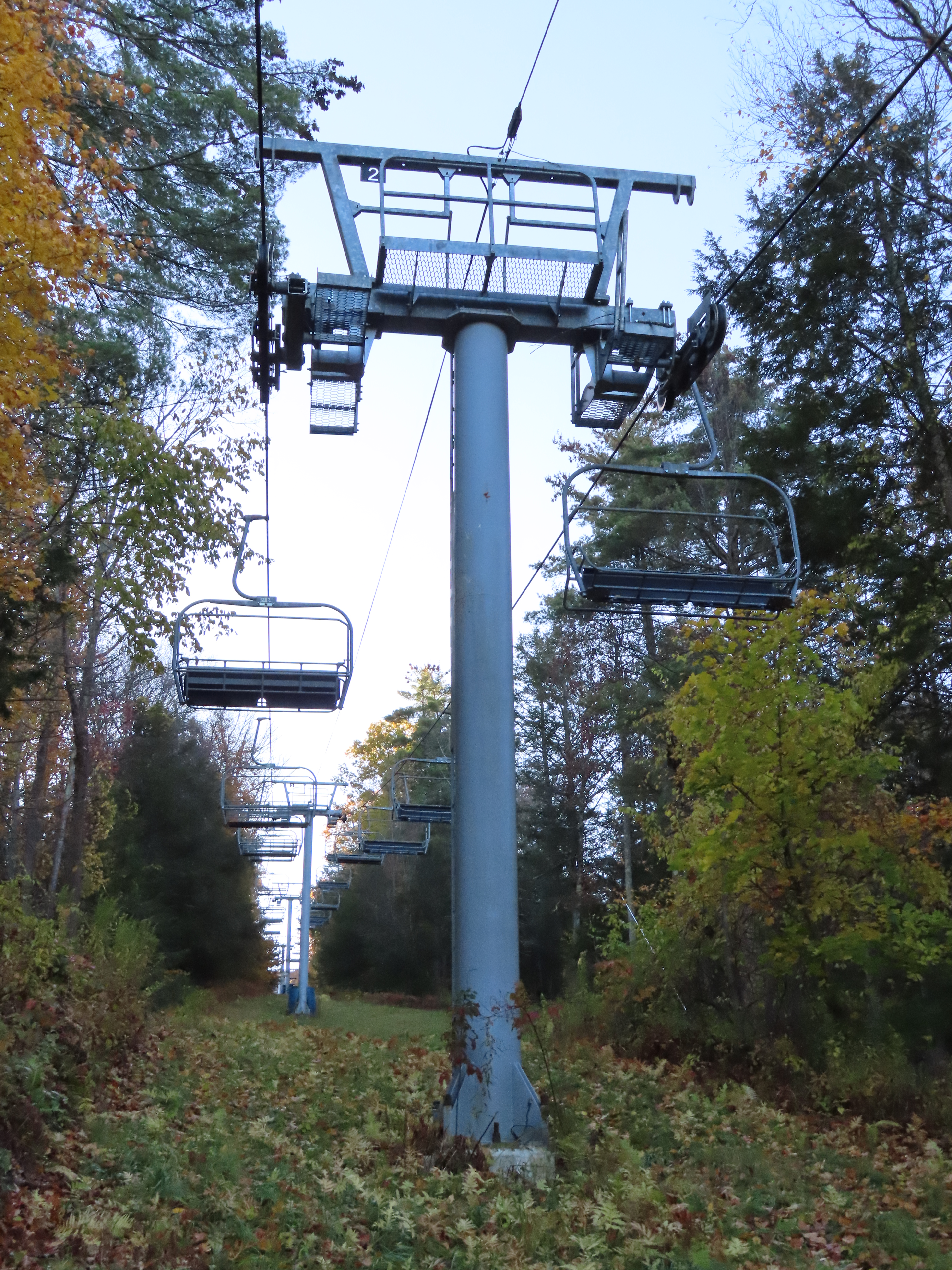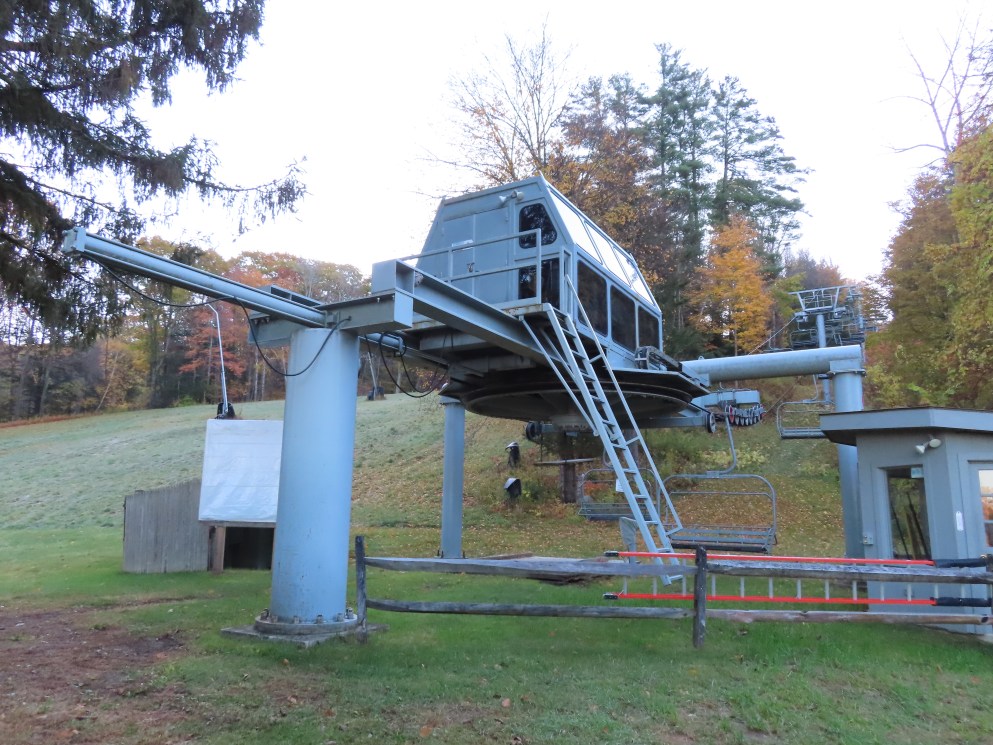 This lift opened in 2005 and replaced a double called Granny’s.Sprint terminal with hydraulic tensioning.View up at tower 2.Lower part of the lift line.Upper lift line.Tower 6.The last tower and top terminal.Monopod return station.Side view of the top.