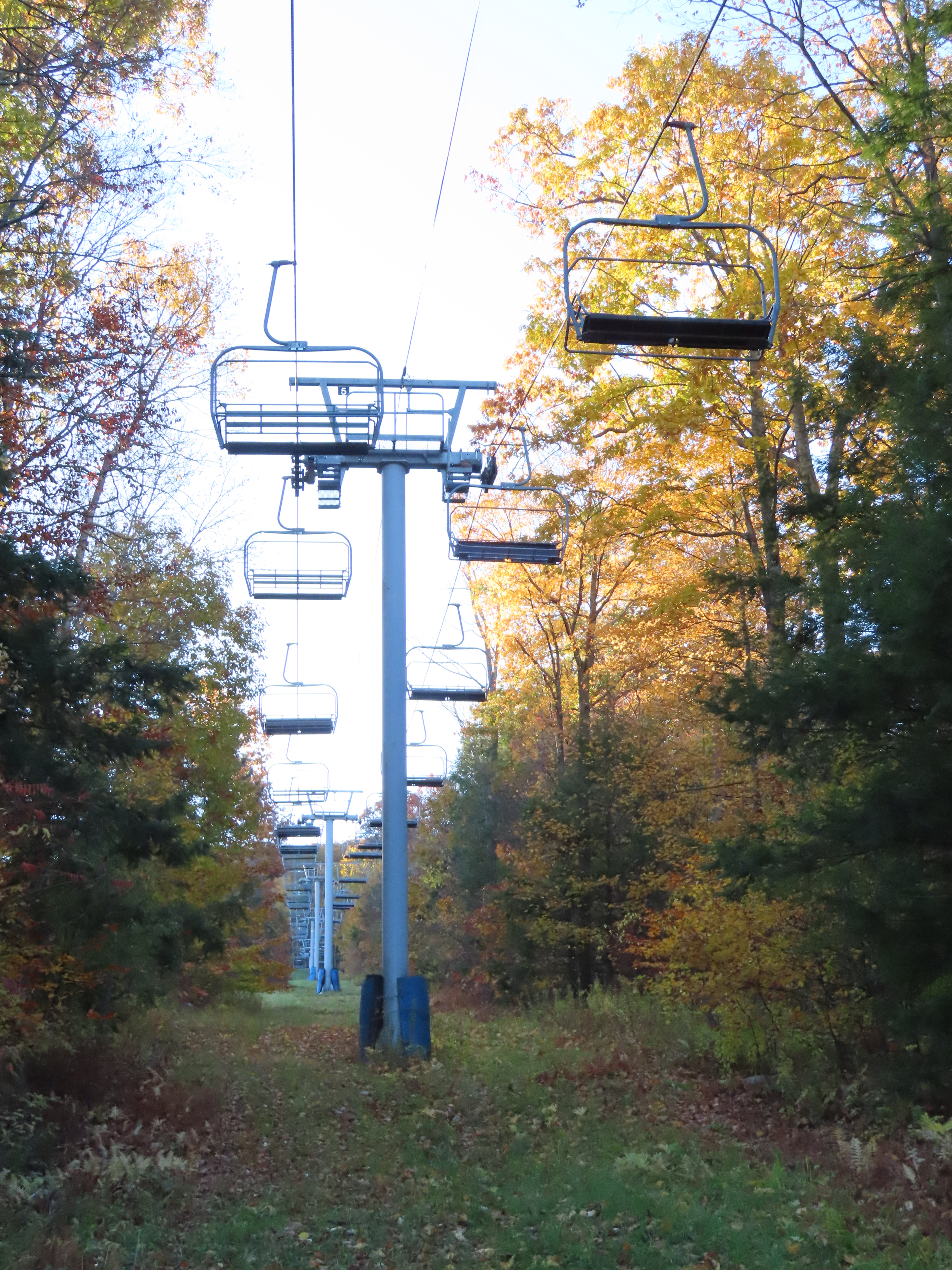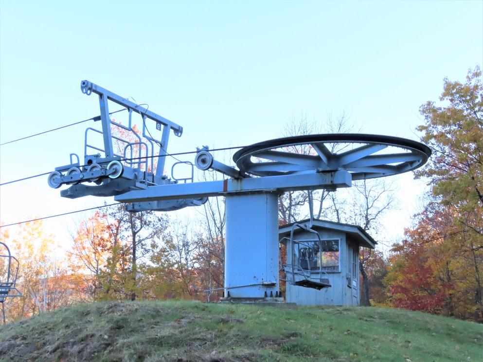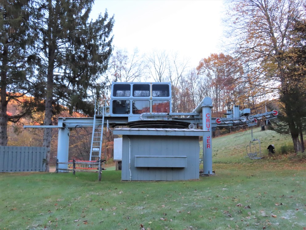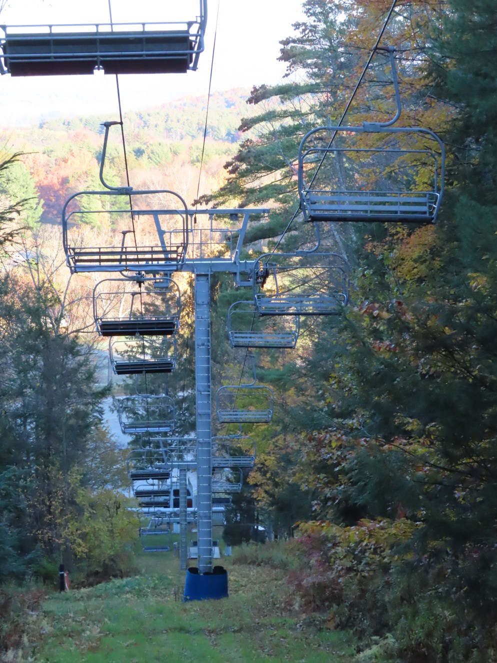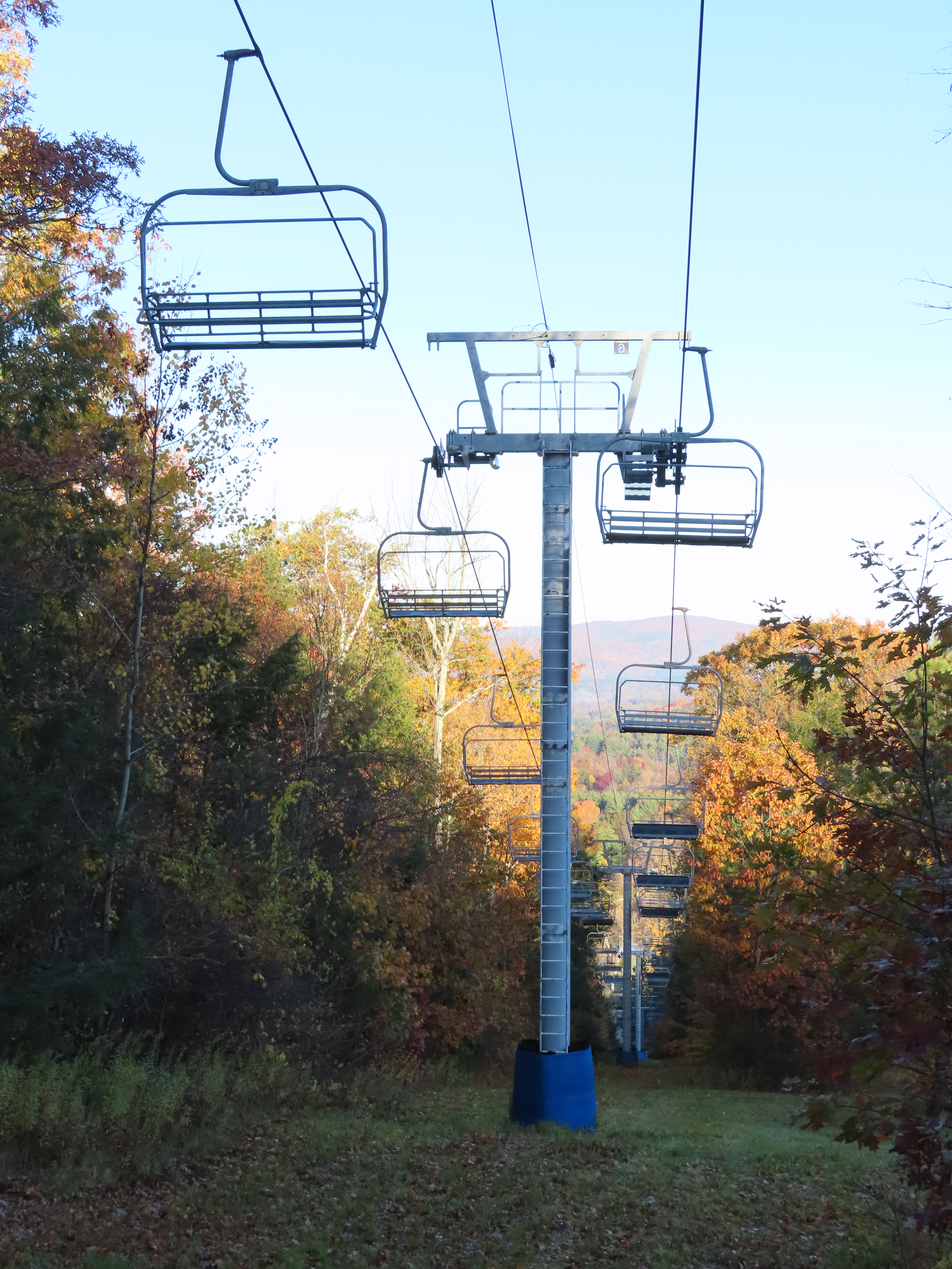 This lift opened in 2005 and replaced a double called Granny’s.Sprint terminal with hydraulic tensioning.View up at tower 2.Lower part of the lift line.Upper lift line.Tower 6.The last tower and top terminal.Monopod return station.Side view of the top.
