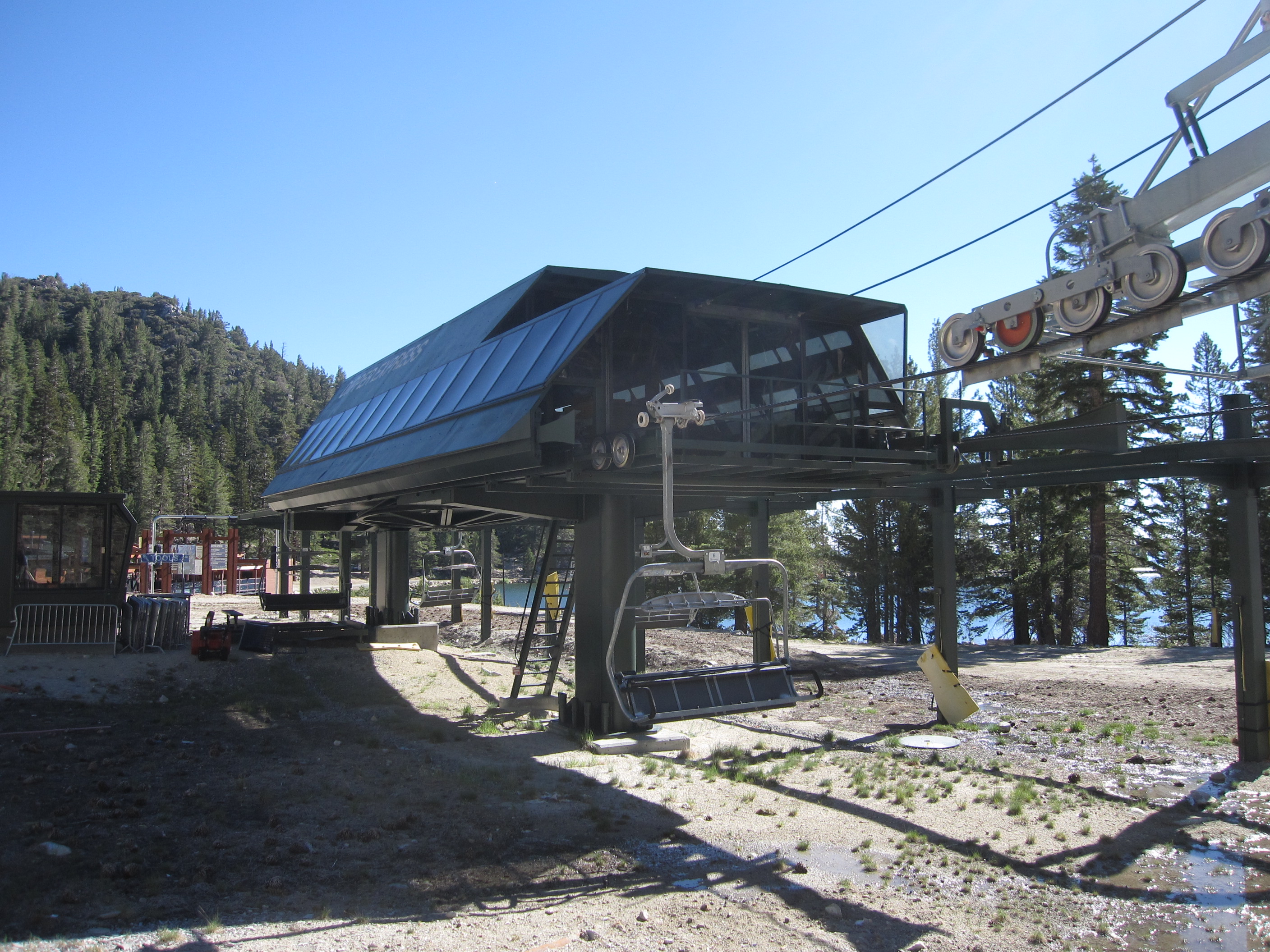 View up from the base terminal.Doppelmayr Uni return terminal with exposed bullwheel.Parking rail at the bottom.Side view of the terminal.Work chair.Loading area and lift shack.Doppelmayr Worldbook entry.Leaving the base.Riding up the line.Arriving at the top.Unload at the drive.