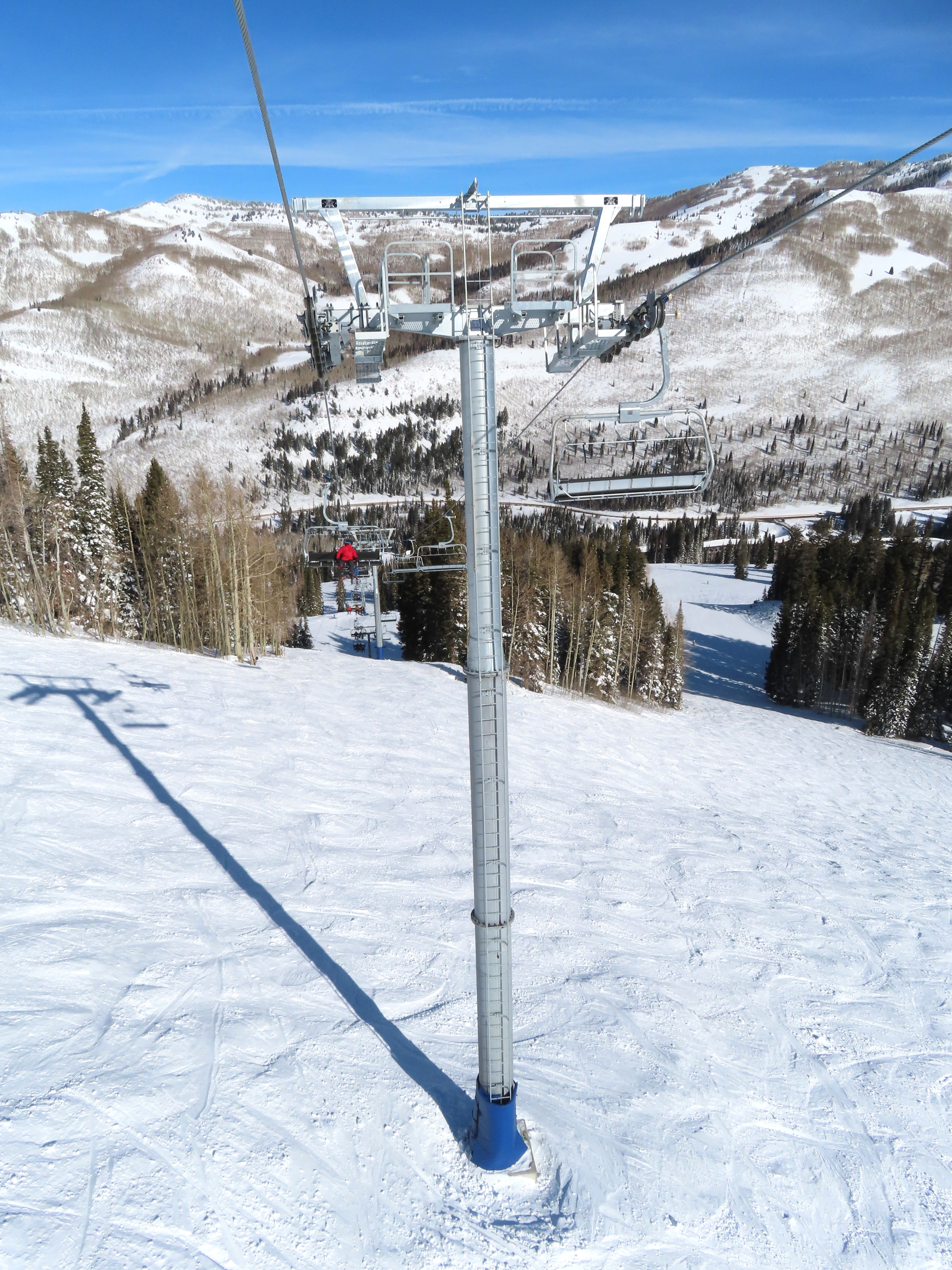 This lift being built alongside Crest 6 allows one to compare a D-Line to a new UNI G. Plus one observes how Soltitude went in the opposite direction of Brighton: whereas the Crest quad had footrests, Crest 6 lacks them. With the Eagle Express, the quad didn’t have footrests, but the six pack does have them.