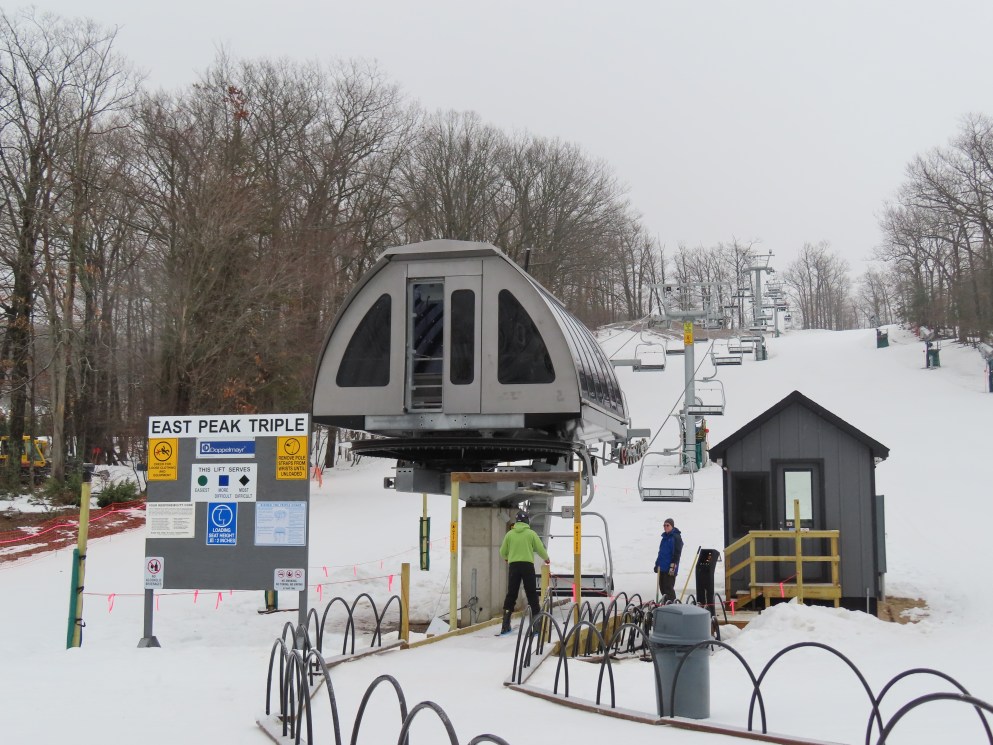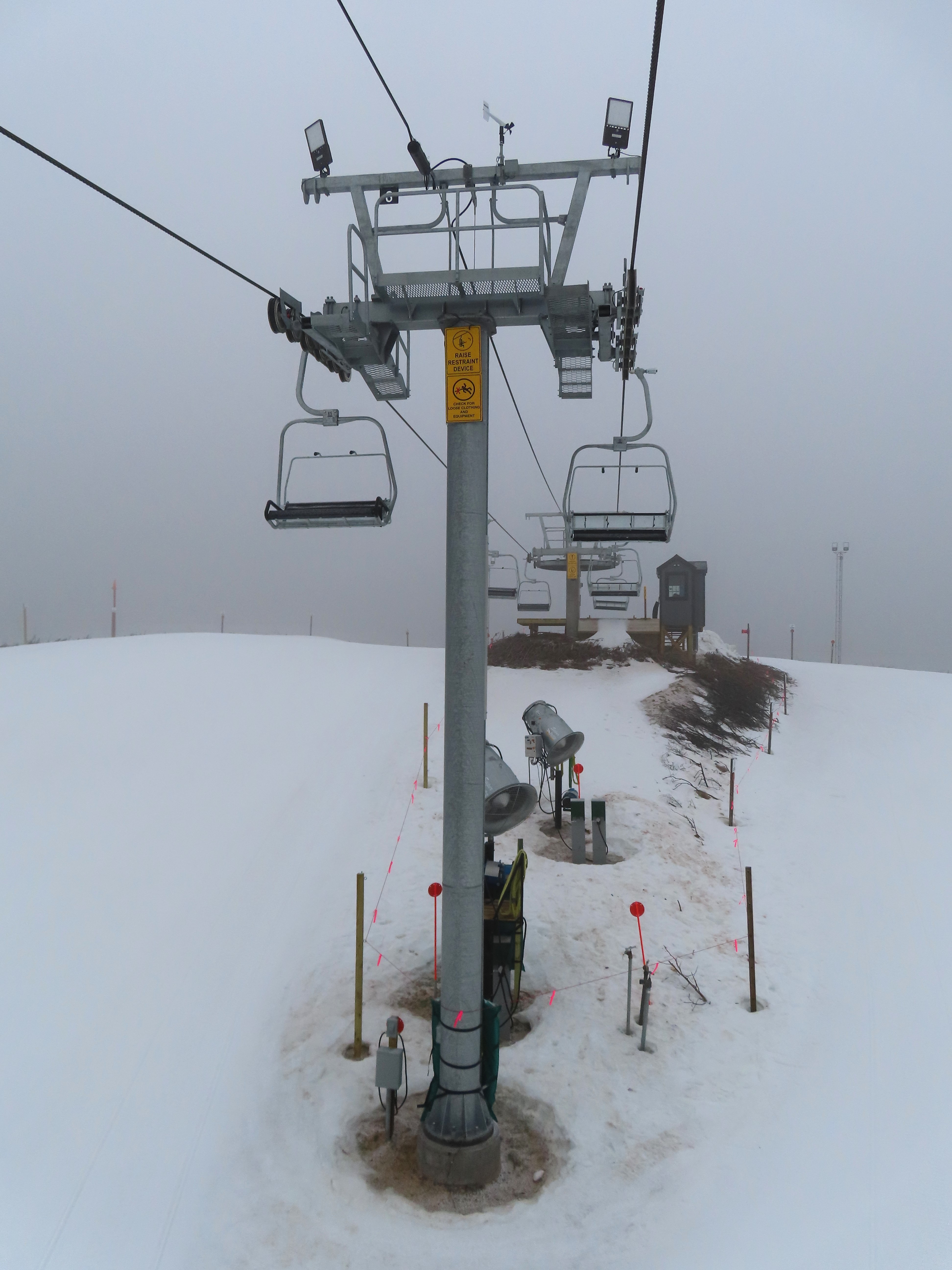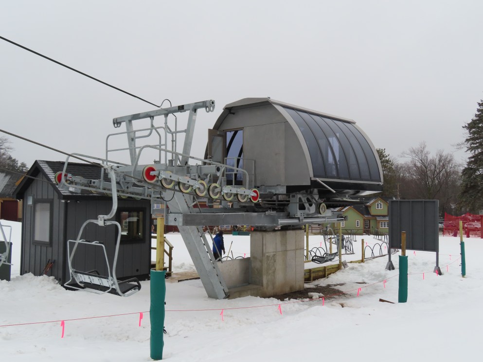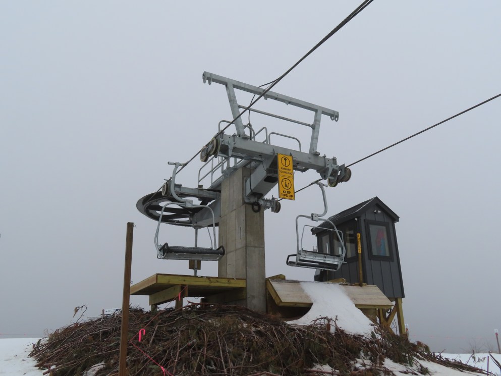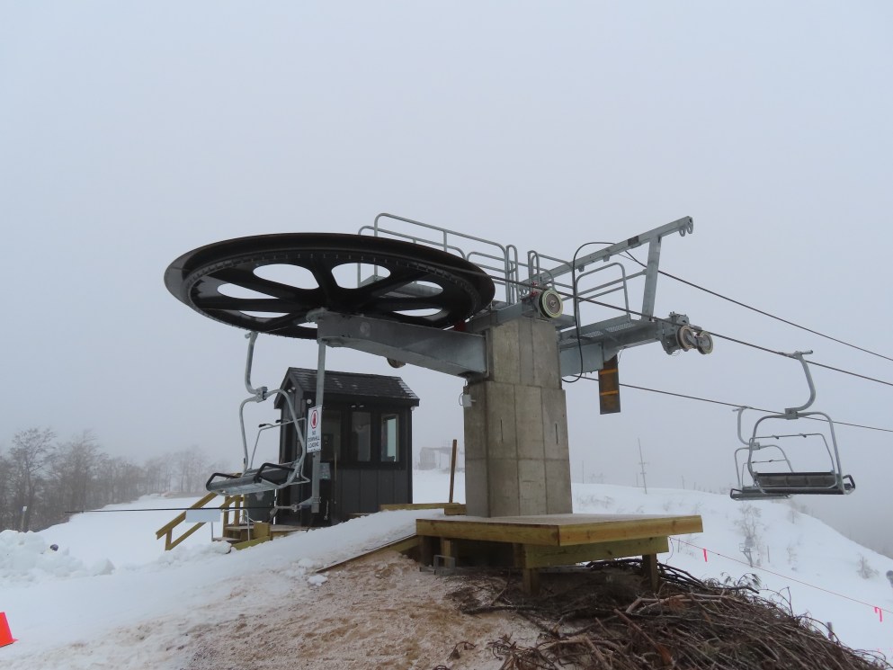 Look closely and you can see a Hall tower left over from the lift this replaced.This is the second modern Doppelmayr lift for Caberfae.View riding up the line.Combo assemblies on tower 4.Tower 5.View back down.T6 with night lighting.Arriving at the top terminal located on man made fill.Return bullwheel up top.Another view of the top terminal on East Peak.View down near the summit.Lower lift line.Tower 2.Alpenstar drive station.Loading area and lower lift line with the top not visible.
