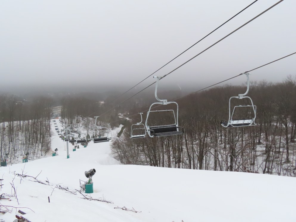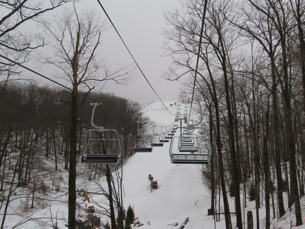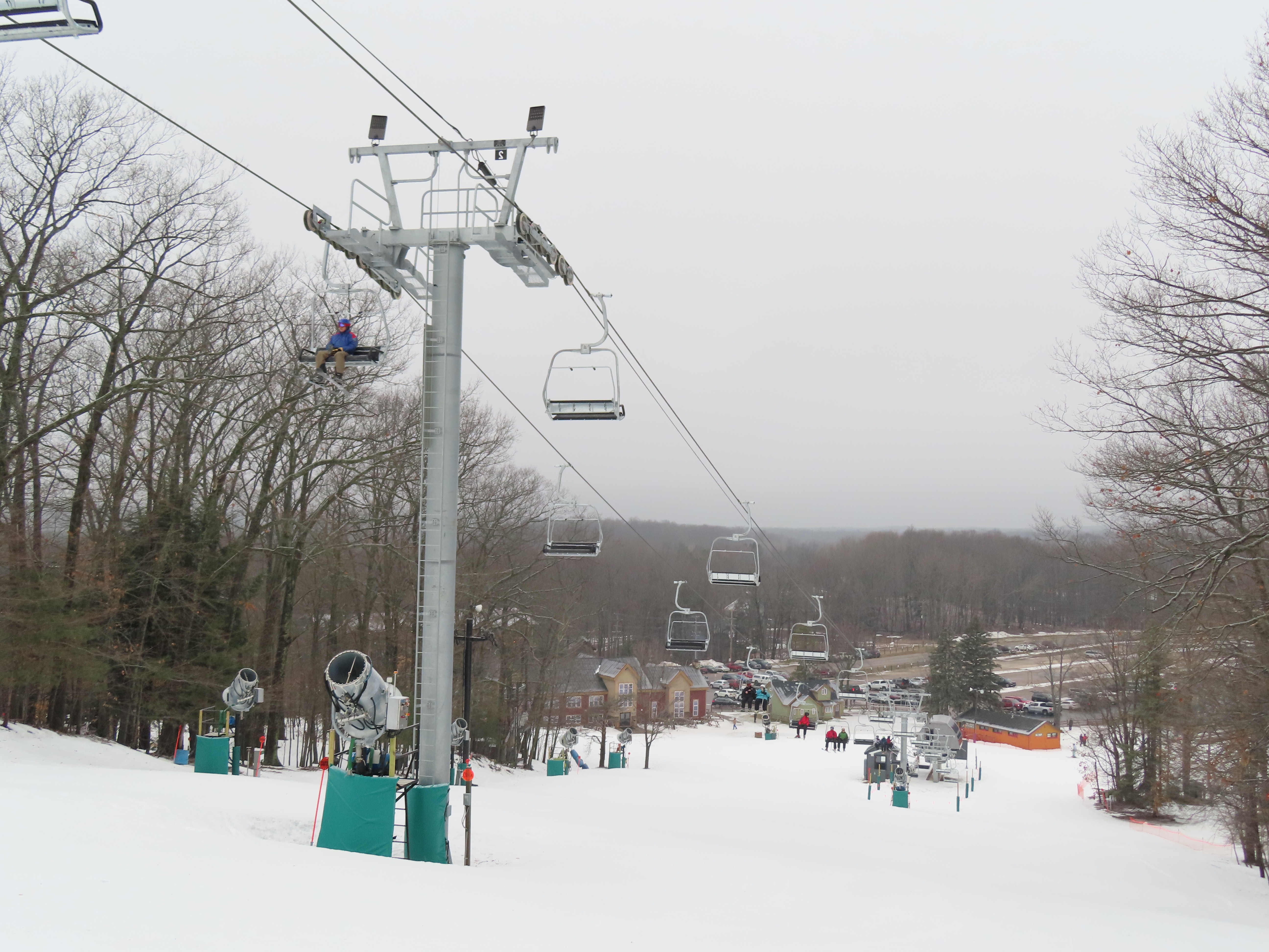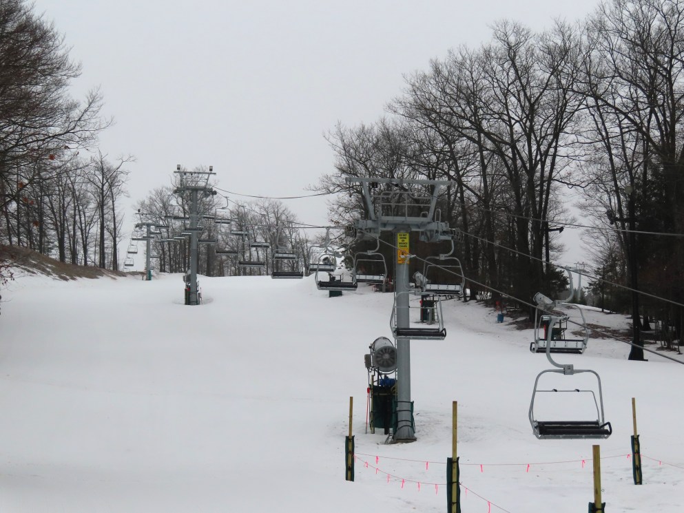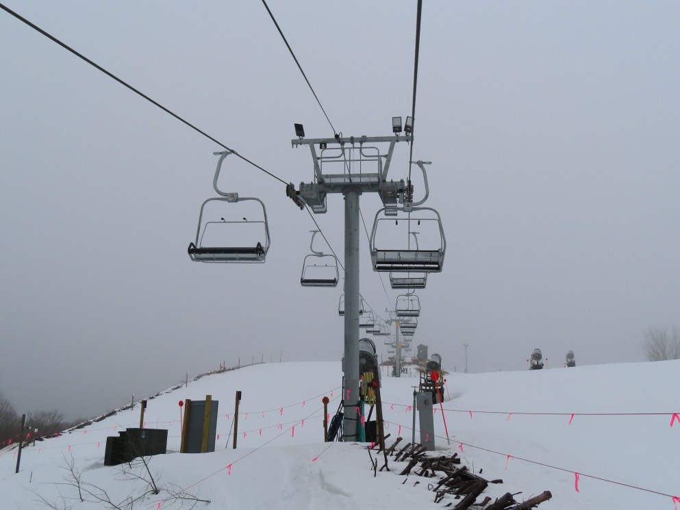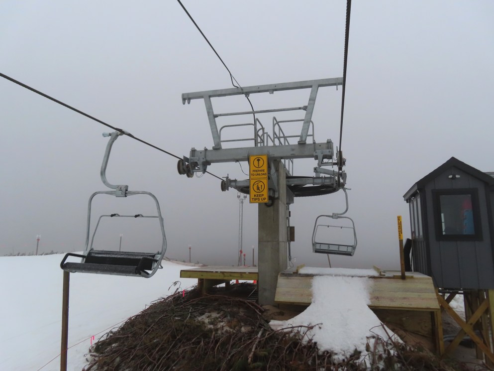 Look closely and you can see a Hall tower left over from the lift this replaced.This is the second modern Doppelmayr lift for Caberfae.View riding up the line.Combo assemblies on tower 4.Tower 5.View back down.T6 with night lighting.Arriving at the top terminal located on man made fill.Return bullwheel up top.Another view of the top terminal on East Peak.View down near the summit.Lower lift line.Tower 2.Alpenstar drive station.Loading area and lower lift line with the top not visible.