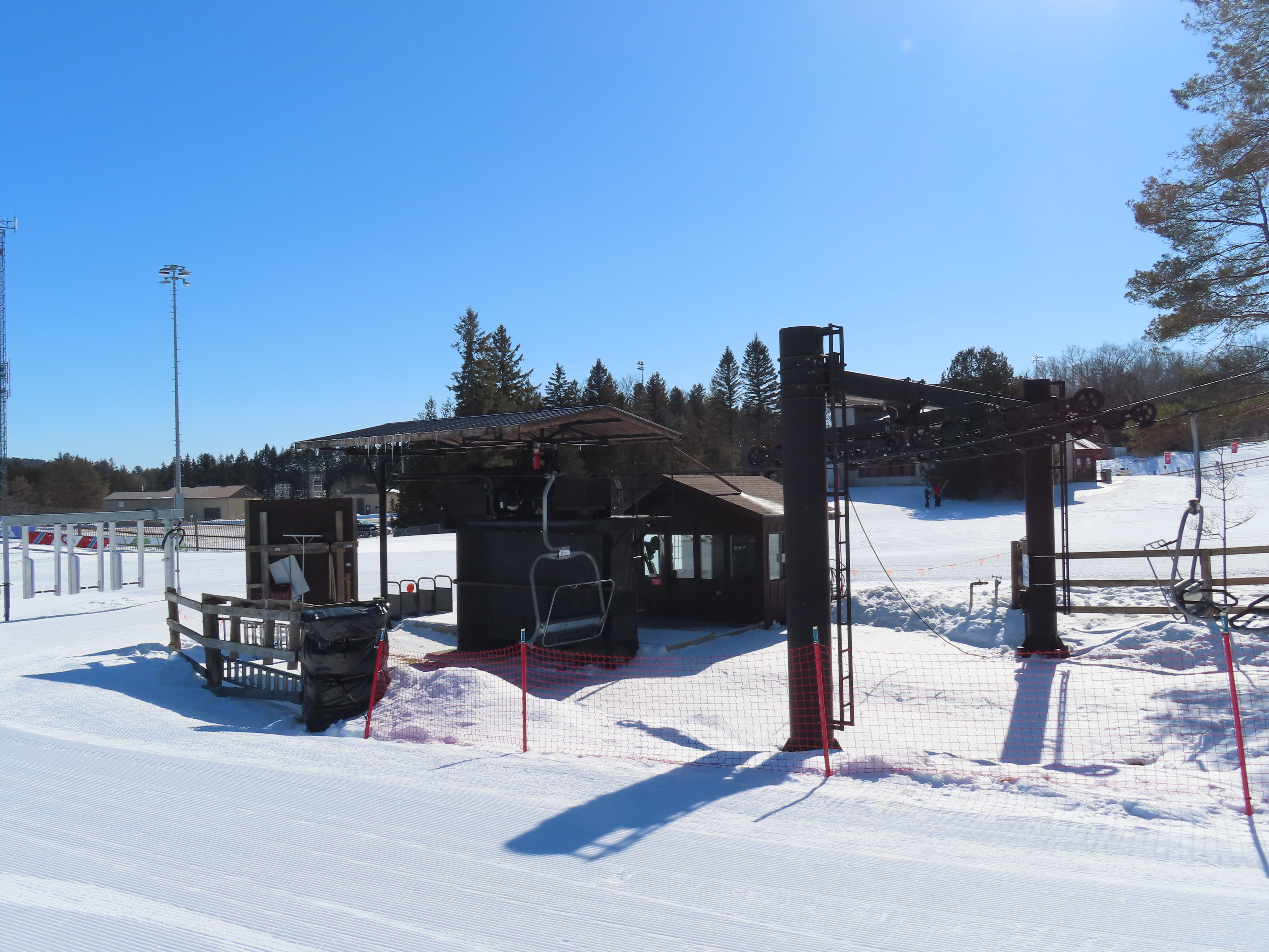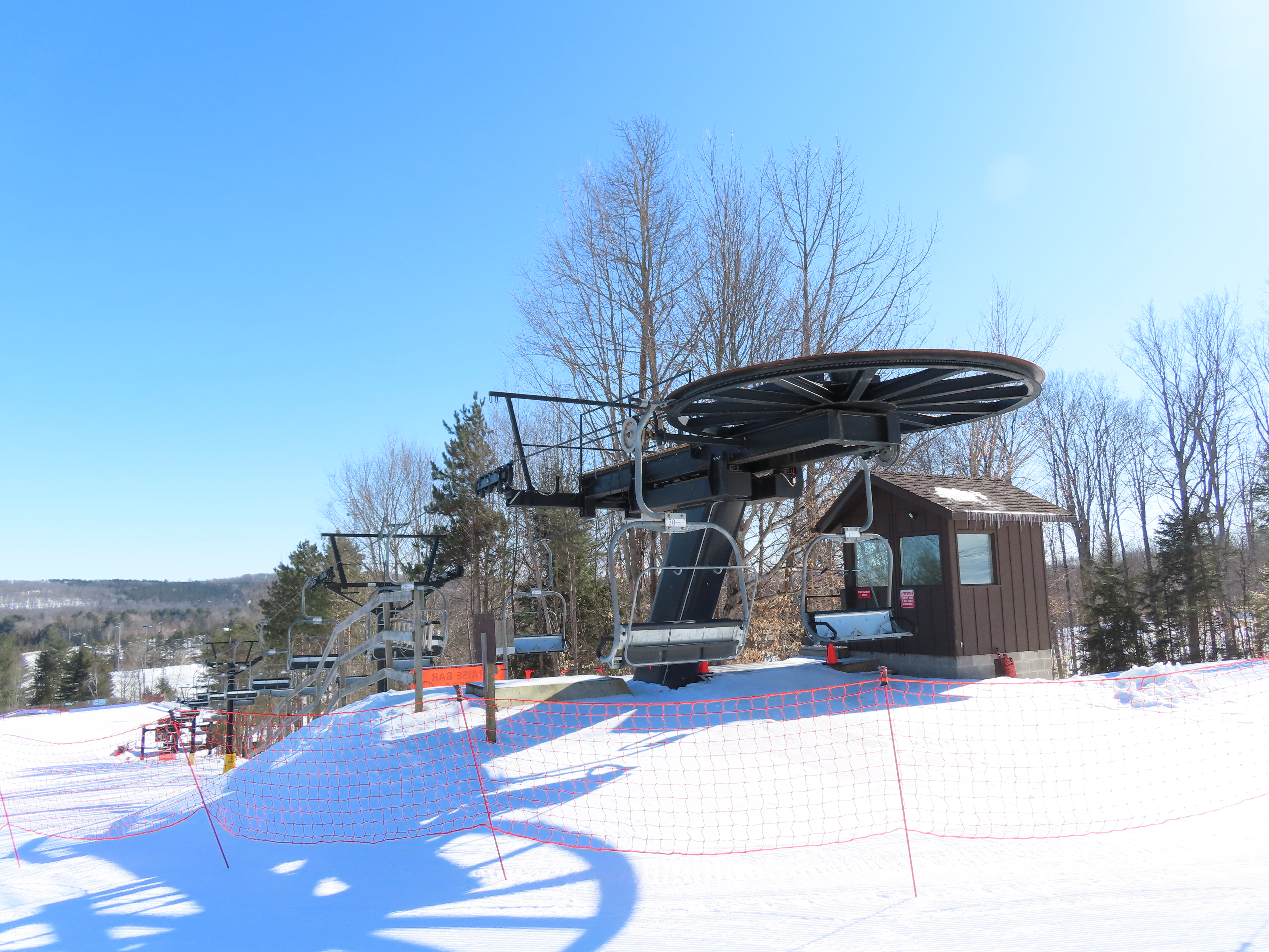 Lower terminal is (most likely) relocated from old 1969 Yodeler triple and re-installed in 1991, using a new Poma top terminal and originally using the old Yodeler chairs (that were shared/divided up with Gentle Ben); new Poma chairs installed 2008.