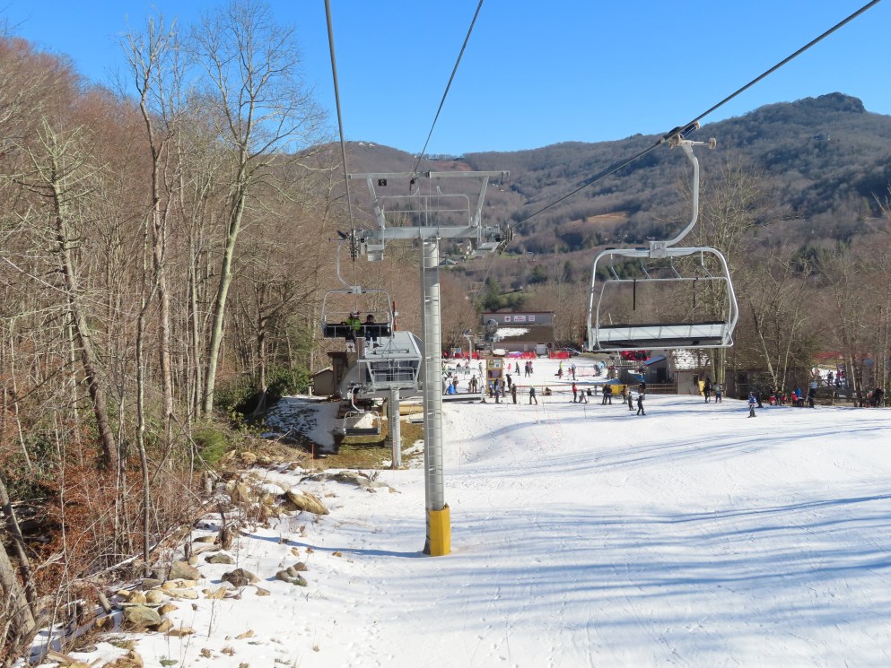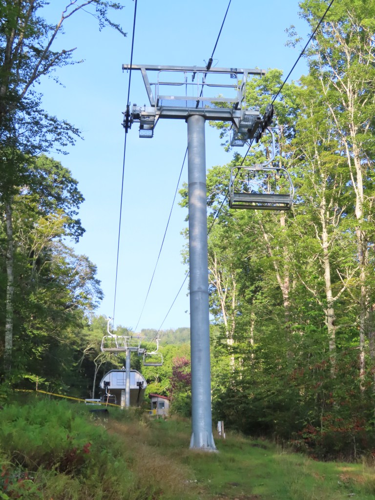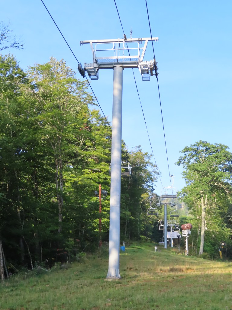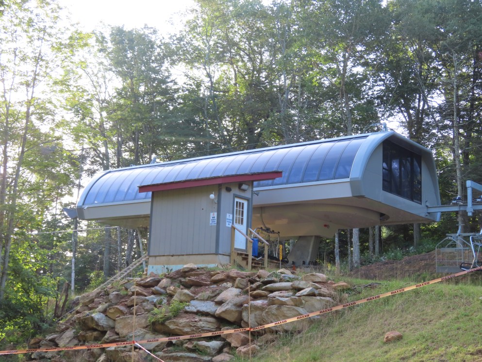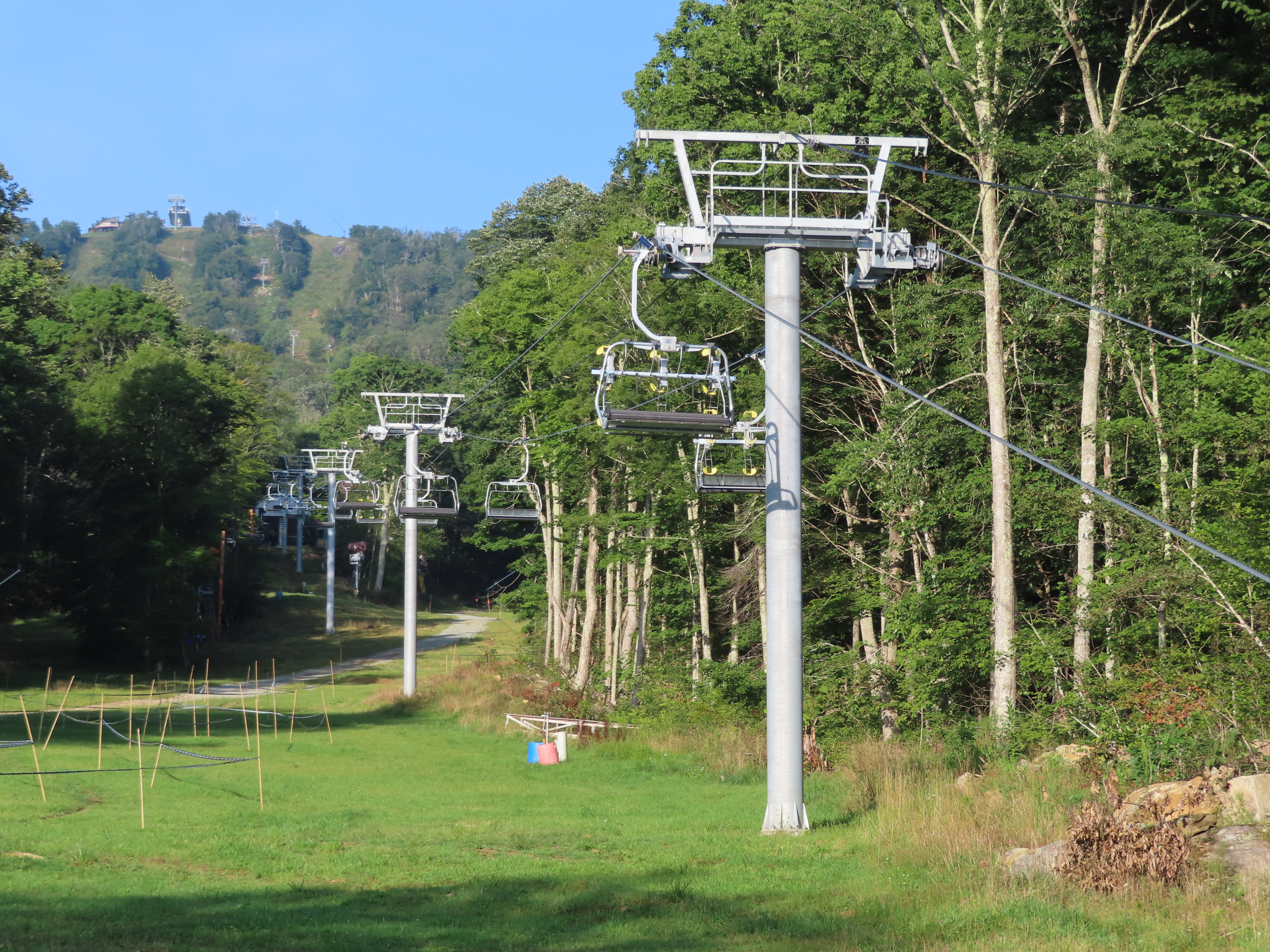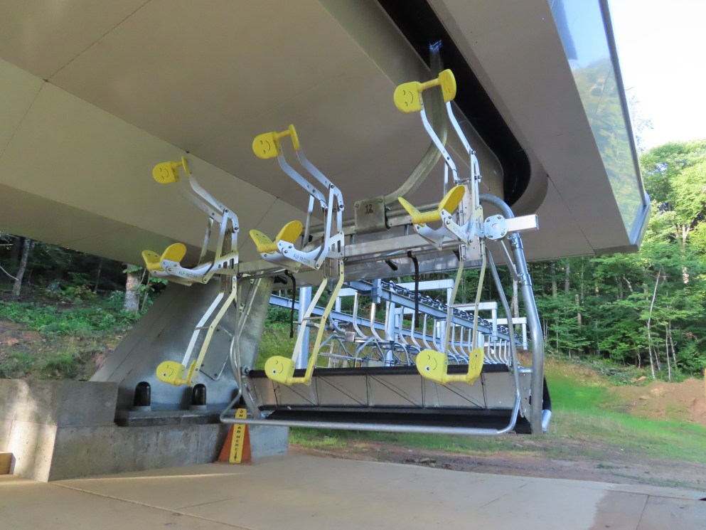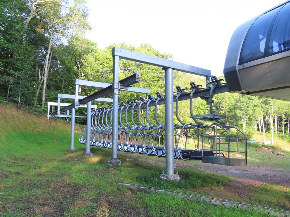 This detachable quad replaced a Hall double in 2019.The new lift has six towers and 36 chairs.Side view of the top terminal.Chairs parked for summer operations.Parking rail for all chairs.The return terminal.Downhill end of the top station.View down at tower 6.Bike carriers.Tower 5.Lower part of the lift line.Upper lift line.Towers 1 and 2.90 degree loading.The entire lift line.Loading area.Drive station side view.Tower 5 in winter.View back to the bottom station.Riding up with the Summit Express in the background.Arriving up top.Unloading area.