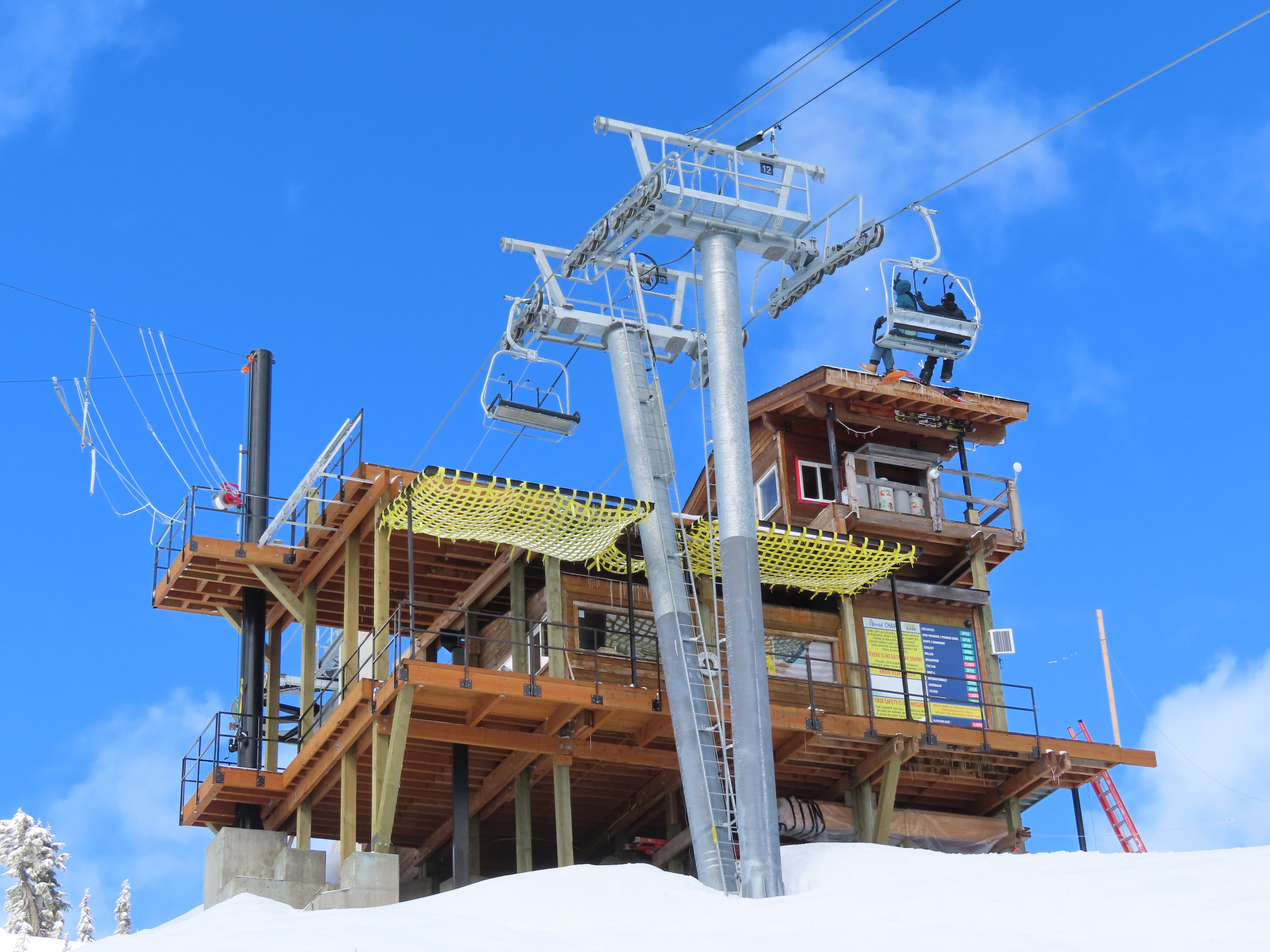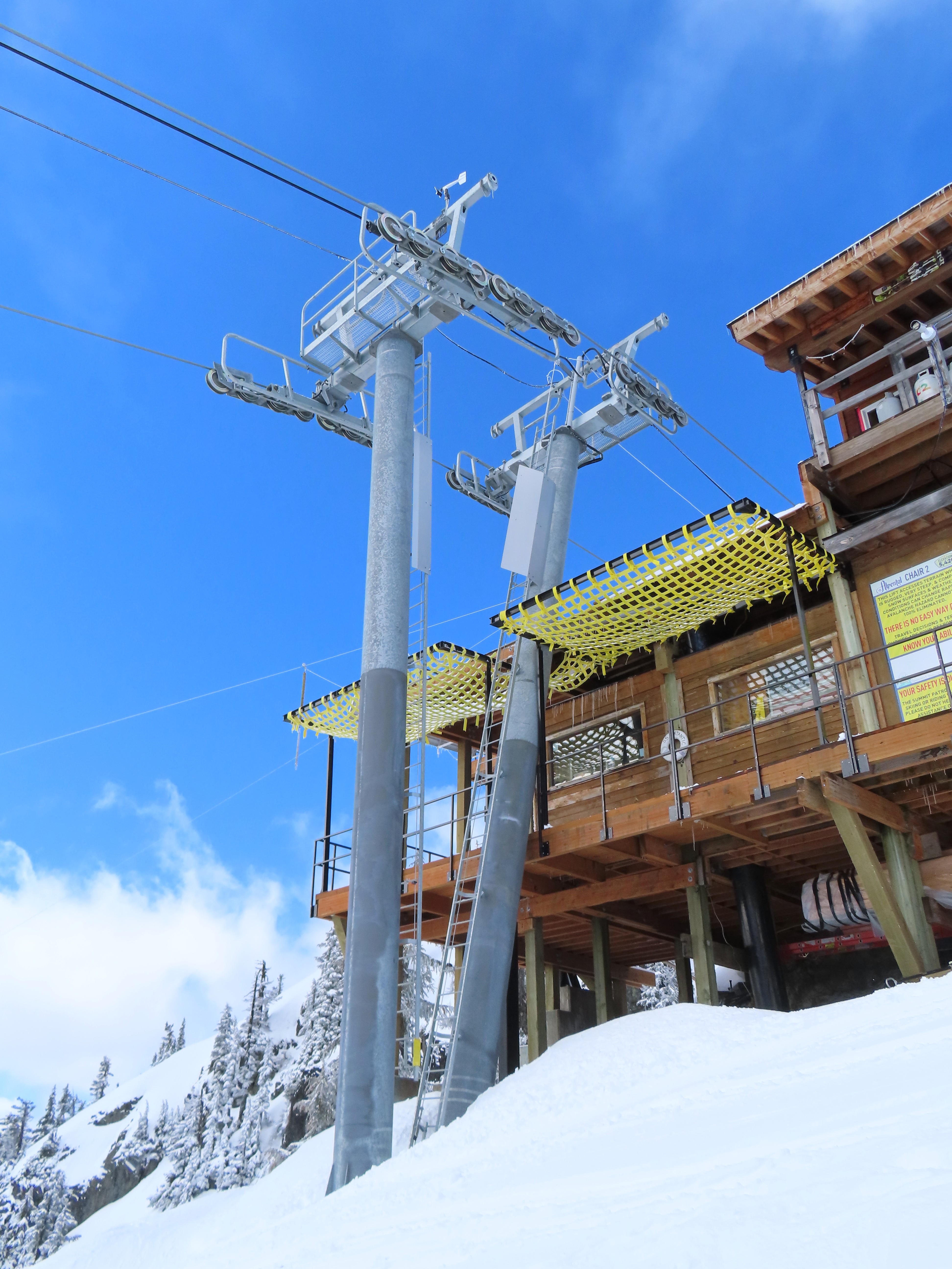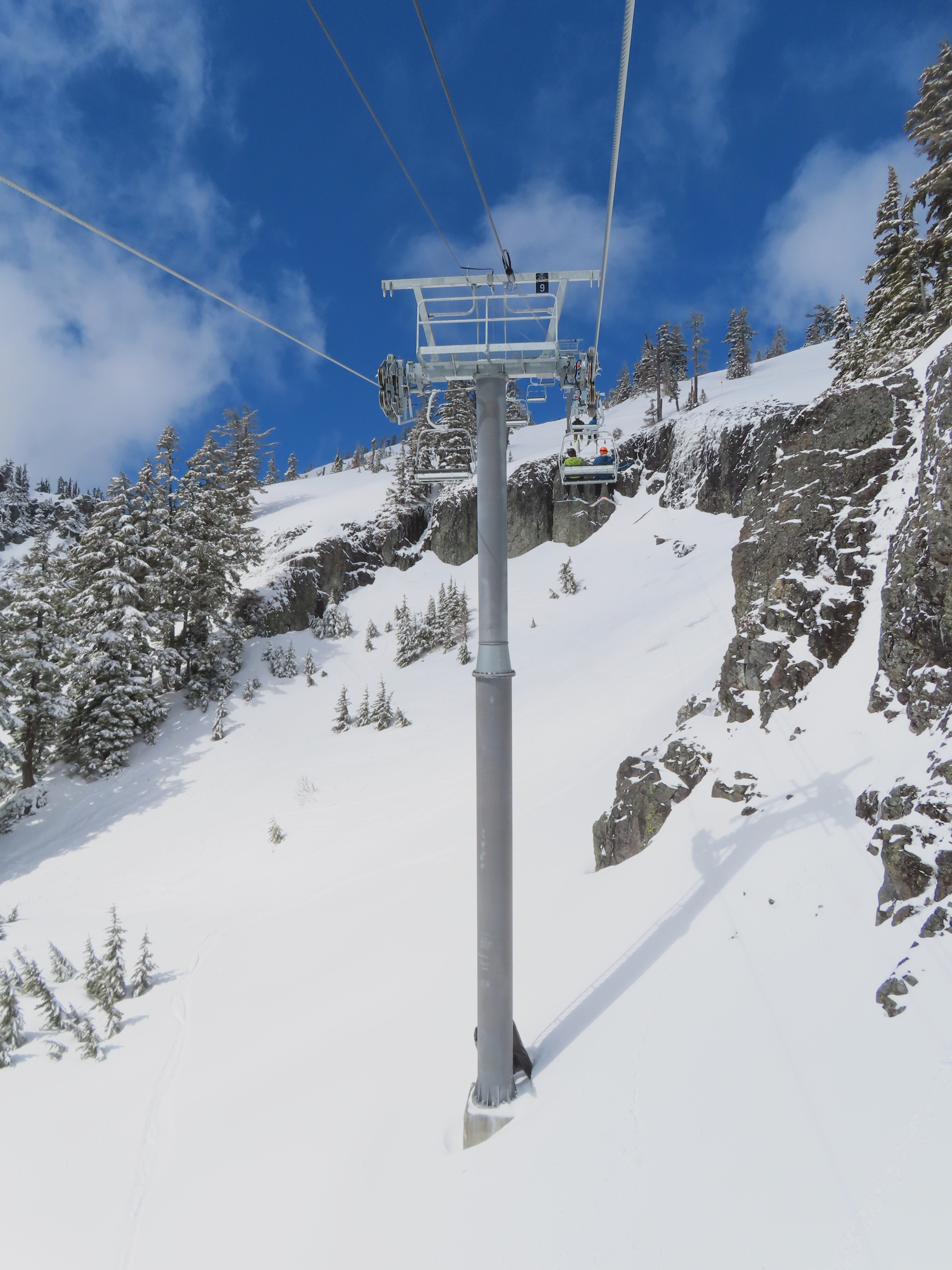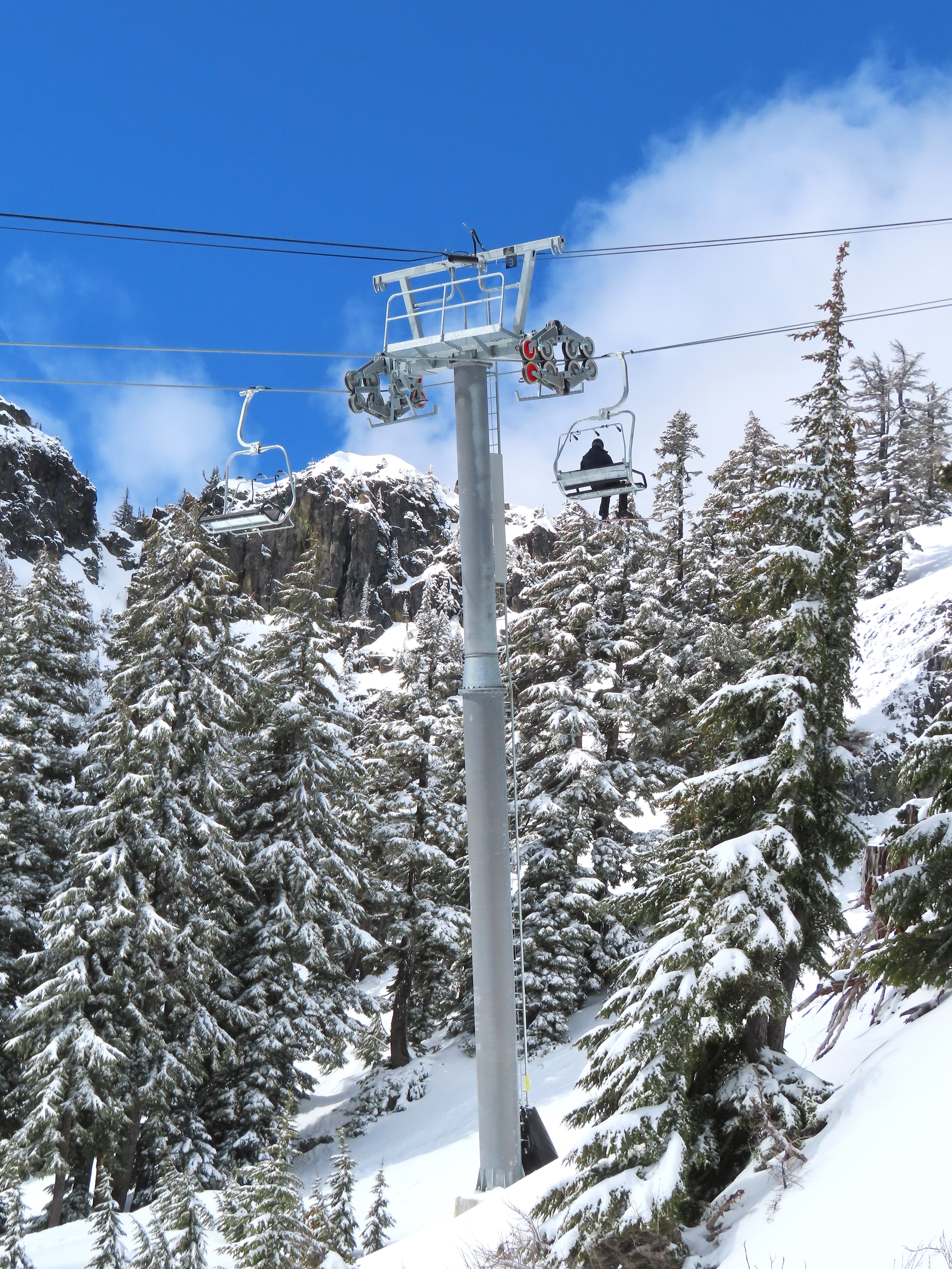 Doppelmayr worked for several years to replace the mountaintop Edelweiss double with the new Edelweiss triple.This is the third Alpenstar triple at Alpental.Drive station and tower 1.View riding up the first pitch.The first of many towers on this lift with combination assemblies on both sides.View back down toward Summit West.The first breakover.View down the line at tower 10.Tower 11.Very rare overhead unloading for a new lift.Tall top bullwheel structure.The top terminal ramp was re-used so new towers were built around it.T11.View down near the summit.Tower 9.Middle section of the line.View up at tower 8.EJ triple chair.Padded chair.View down at tower 5.Lower lift line.Tower 3.View up near the bottom terminal.Tower 5.Heavily loaded tower 6.Flat middle segment of the alignment.The previous Riblet followed the exact same route.Tall tower 9.Tower 10.Arriving at the summit.Top terminal complex.Patrol shack on the lower level.View from the summit.Tower 10.T6 and T7.Side view of the drive.Grip, hanger and taco.