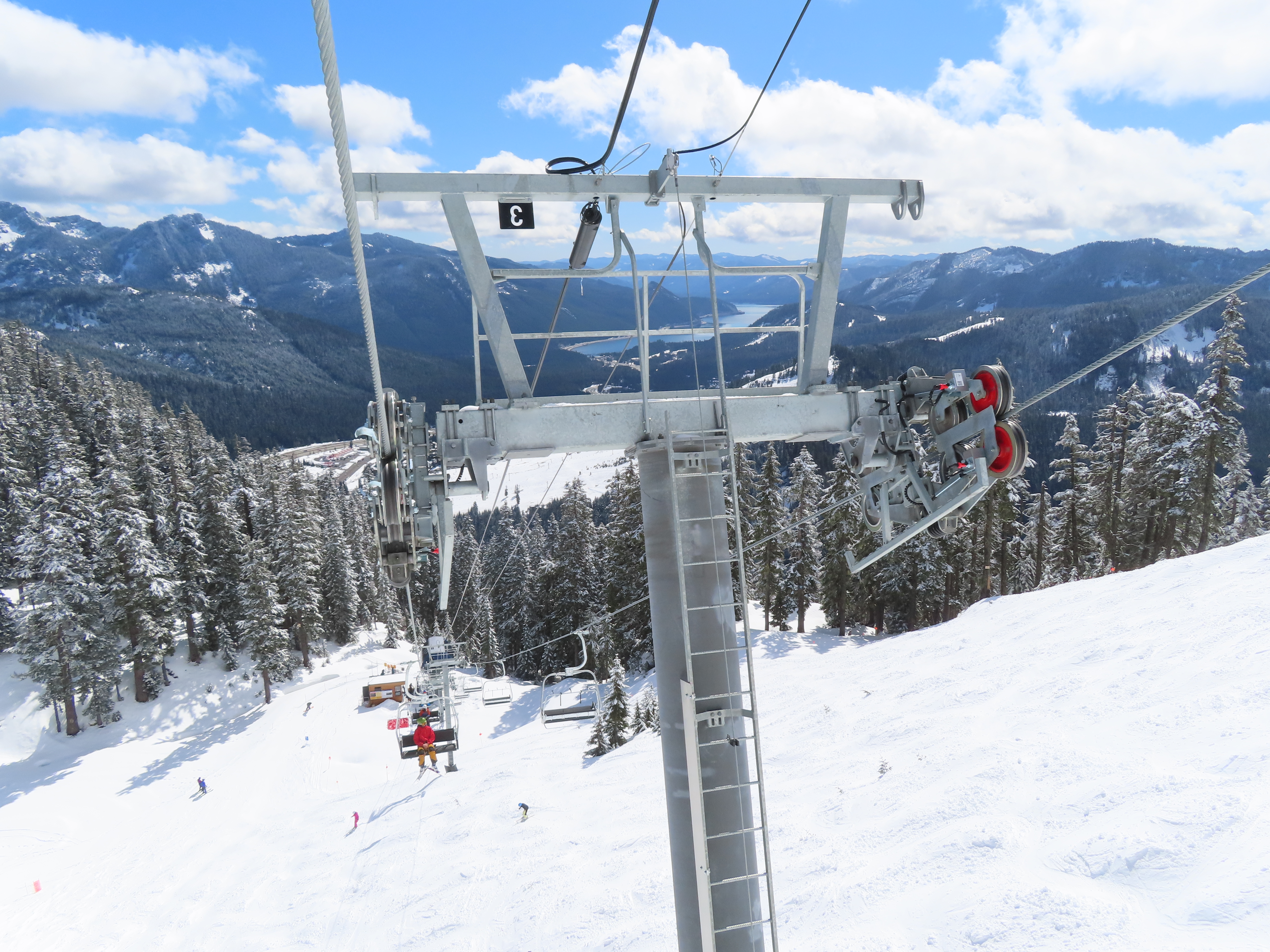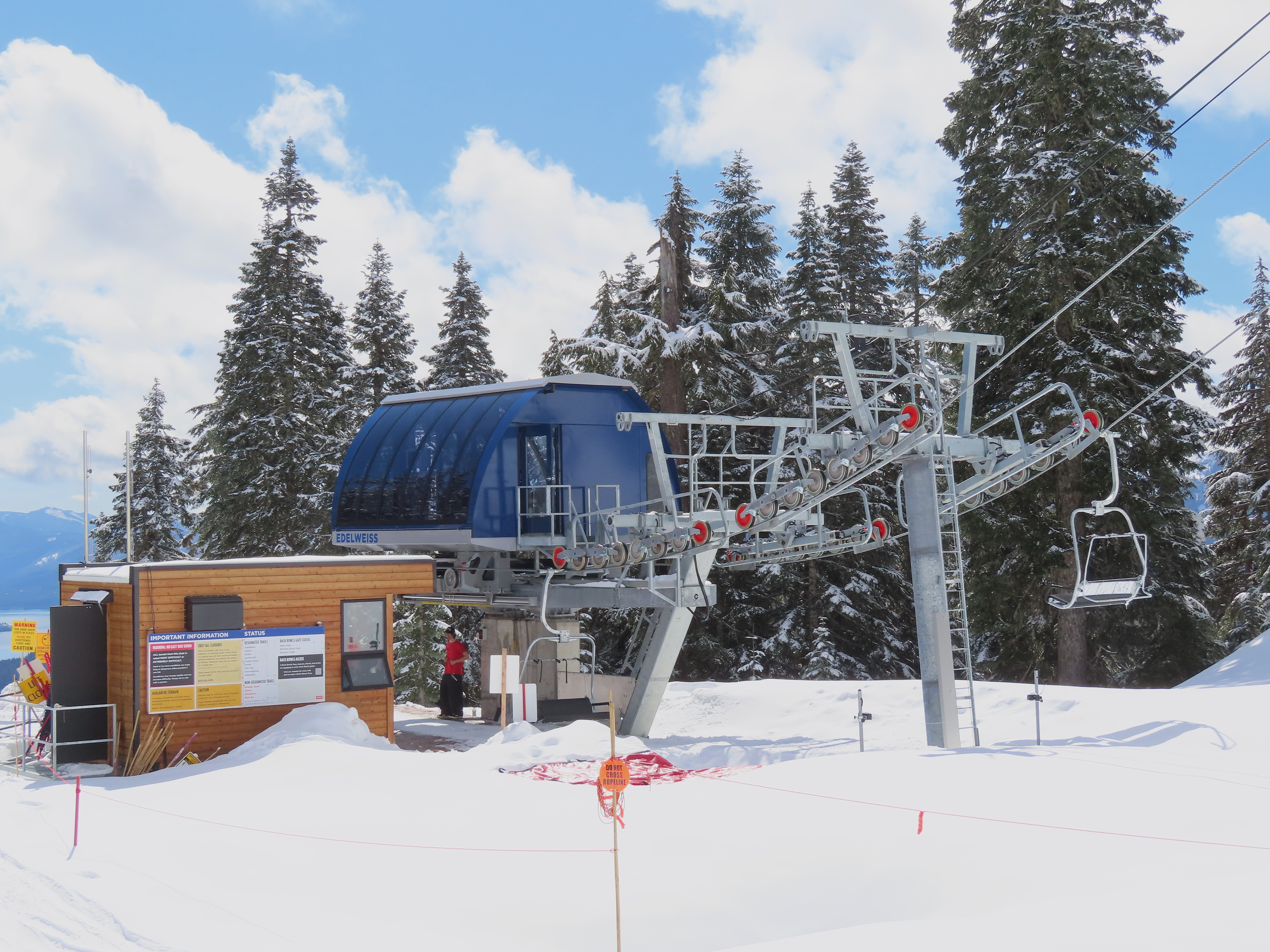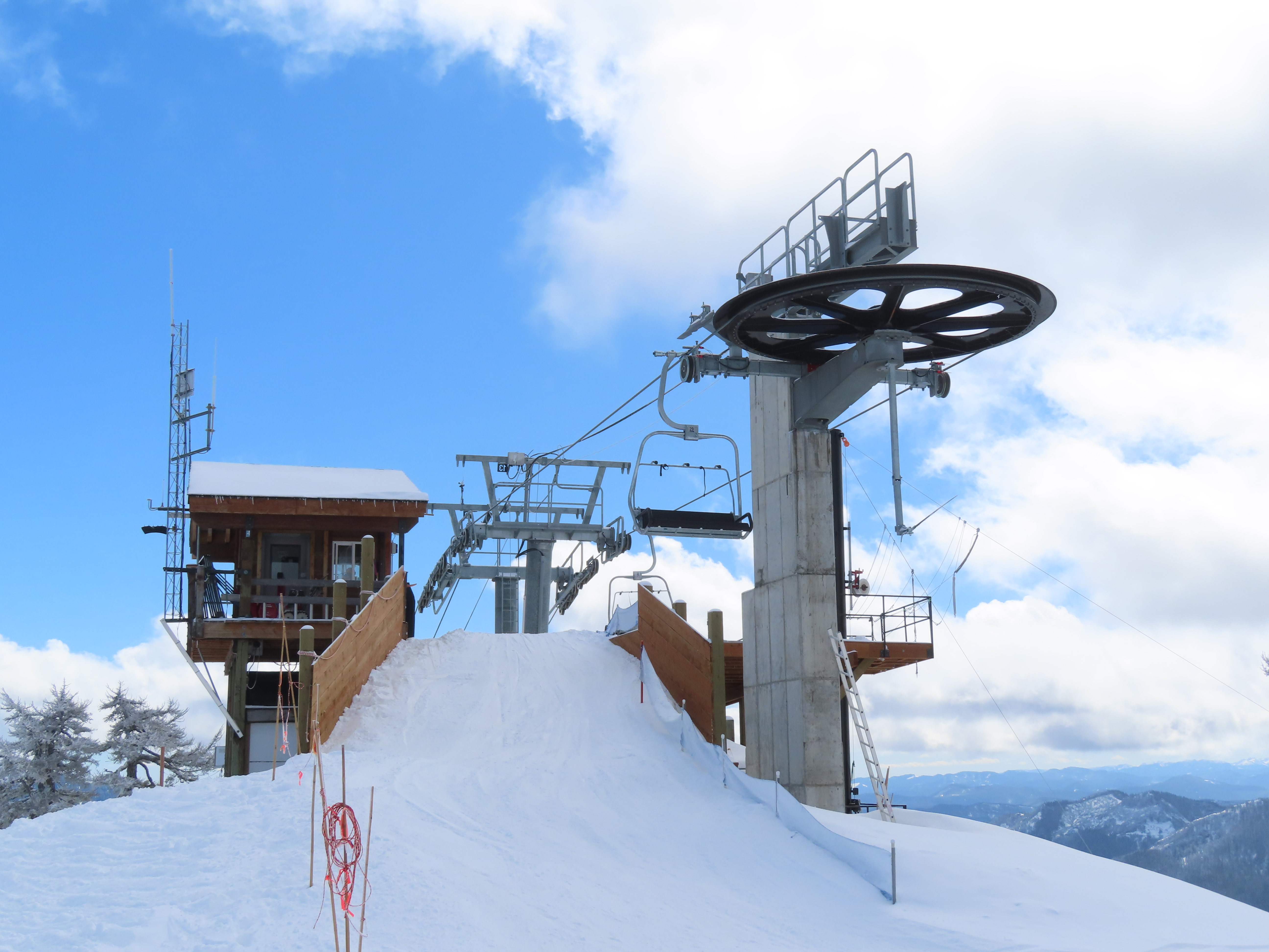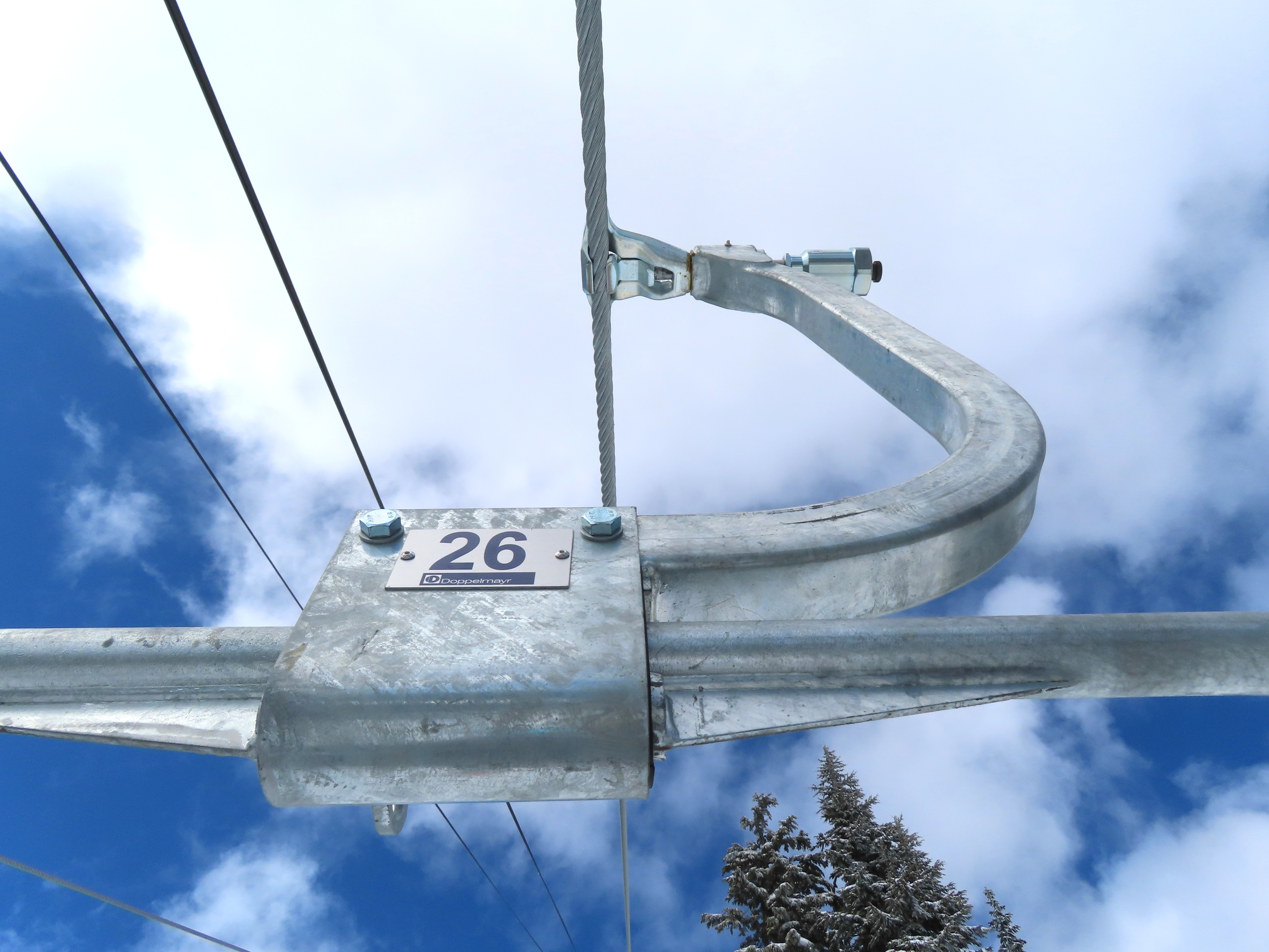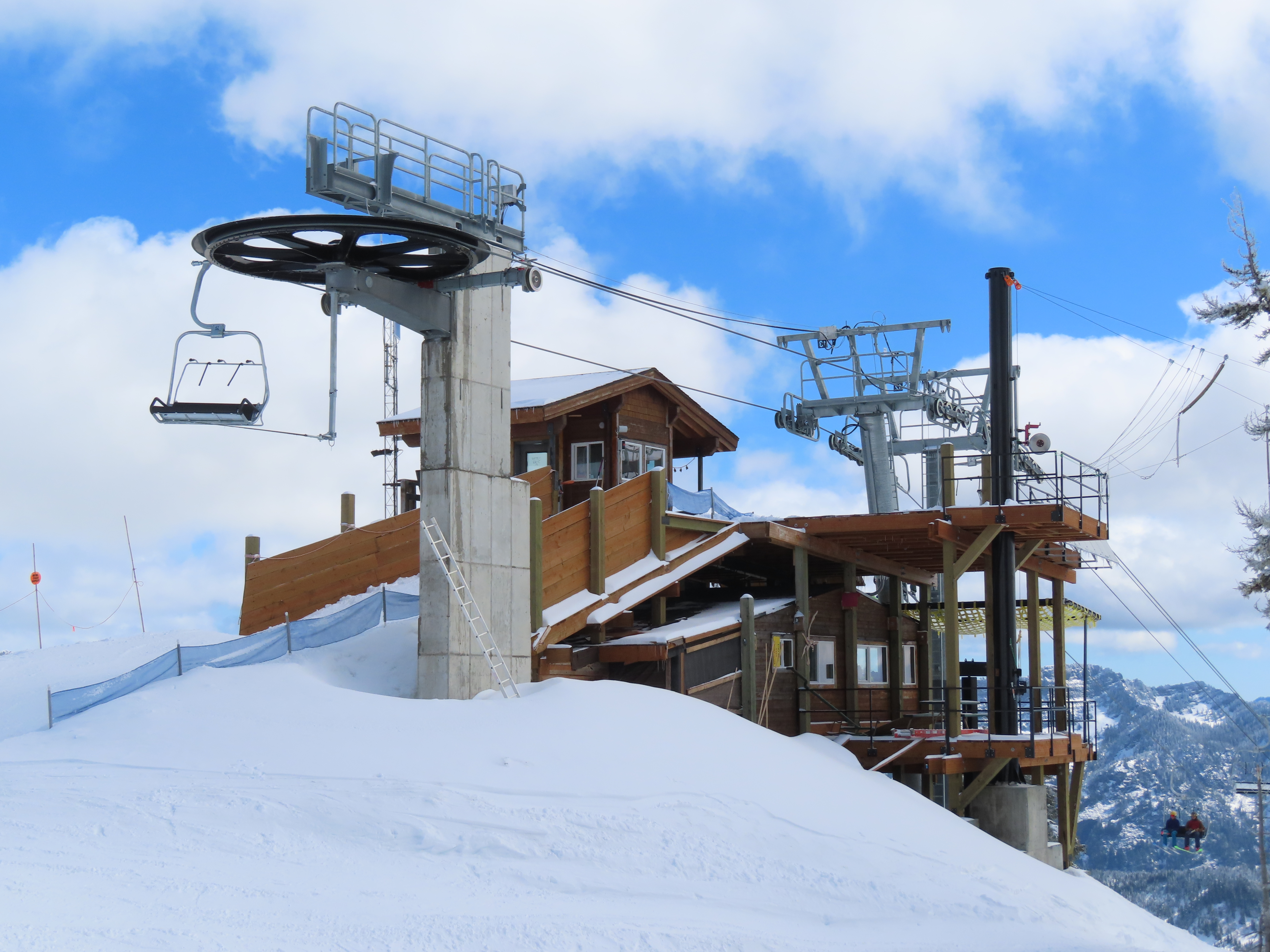 Doppelmayr worked for several years to replace the mountaintop Edelweiss double with the new Edelweiss triple.This is the third Alpenstar triple at Alpental.Drive station and tower 1.View riding up the first pitch.The first of many towers on this lift with combination assemblies on both sides.View back down toward Summit West.The first breakover.View down the line at tower 10.Tower 11.Very rare overhead unloading for a new lift.Tall top bullwheel structure.The top terminal ramp was re-used so new towers were built around it.T11.View down near the summit.Tower 9.Middle section of the line.View up at tower 8.EJ triple chair.Padded chair.View down at tower 5.Lower lift line.Tower 3.View up near the bottom terminal.Tower 5.Heavily loaded tower 6.Flat middle segment of the alignment.The previous Riblet followed the exact same route.Tall tower 9.Tower 10.Arriving at the summit.Top terminal complex.Patrol shack on the lower level.View from the summit.Tower 10.T6 and T7.Side view of the drive.Grip, hanger and taco.