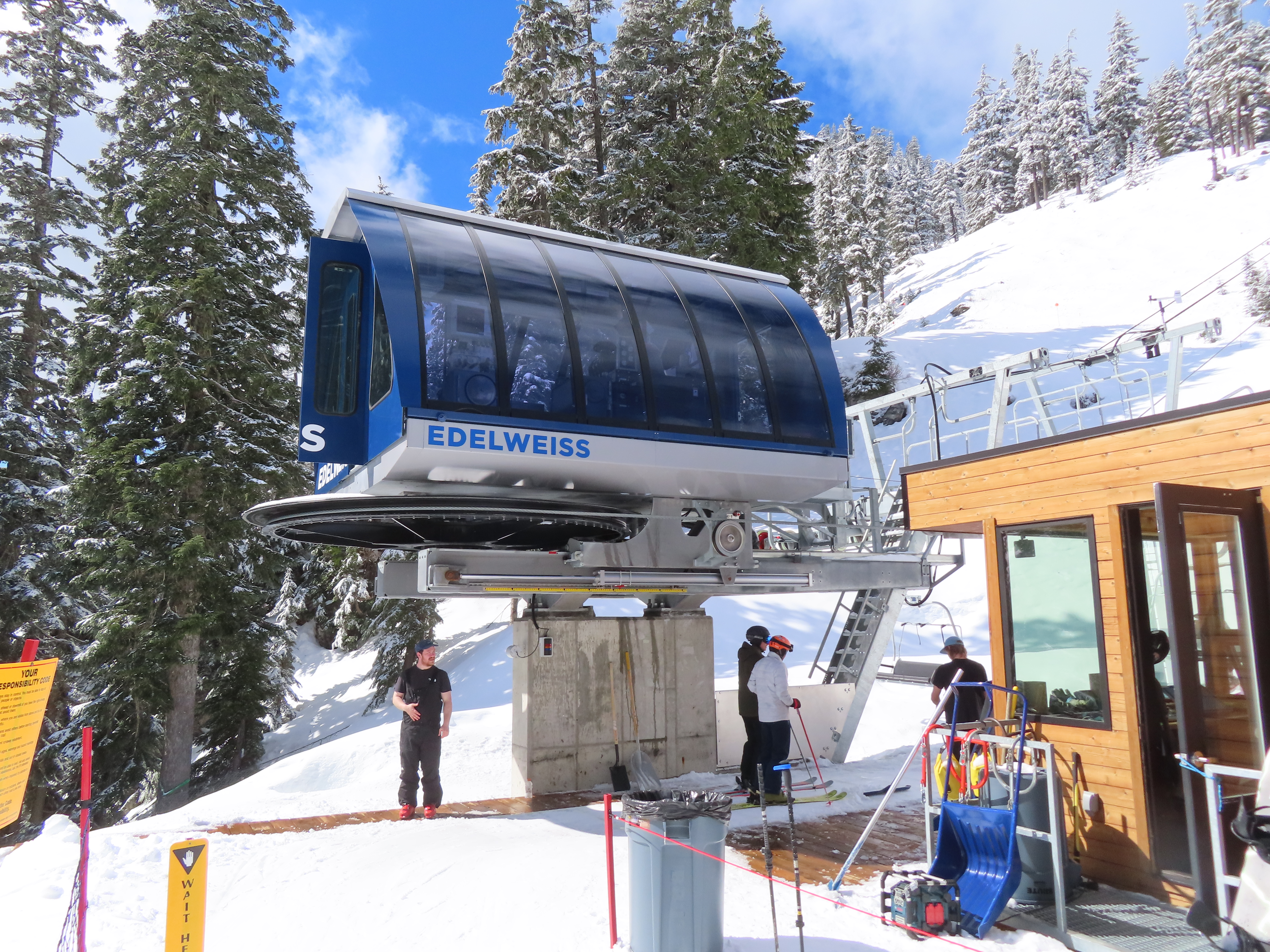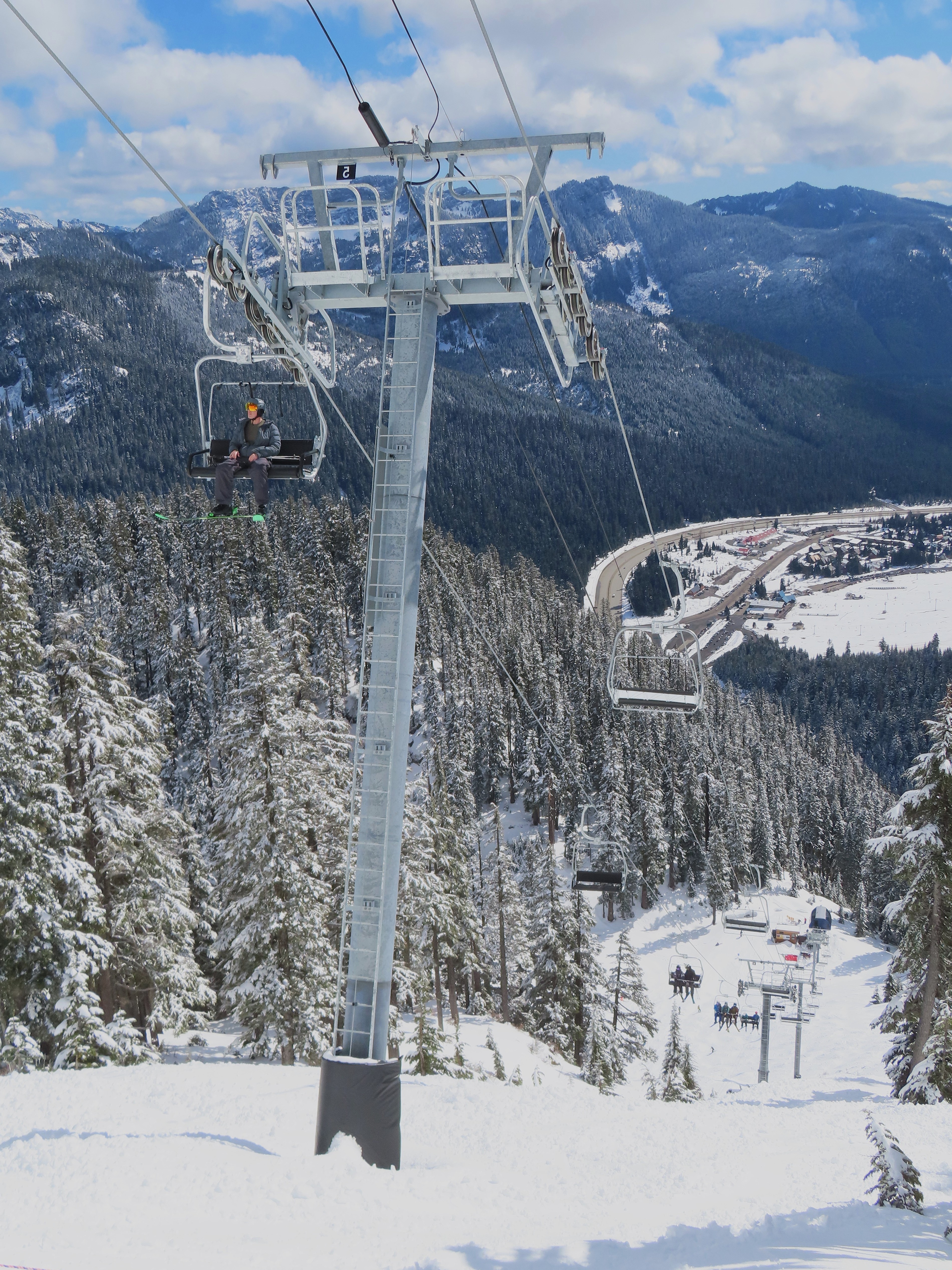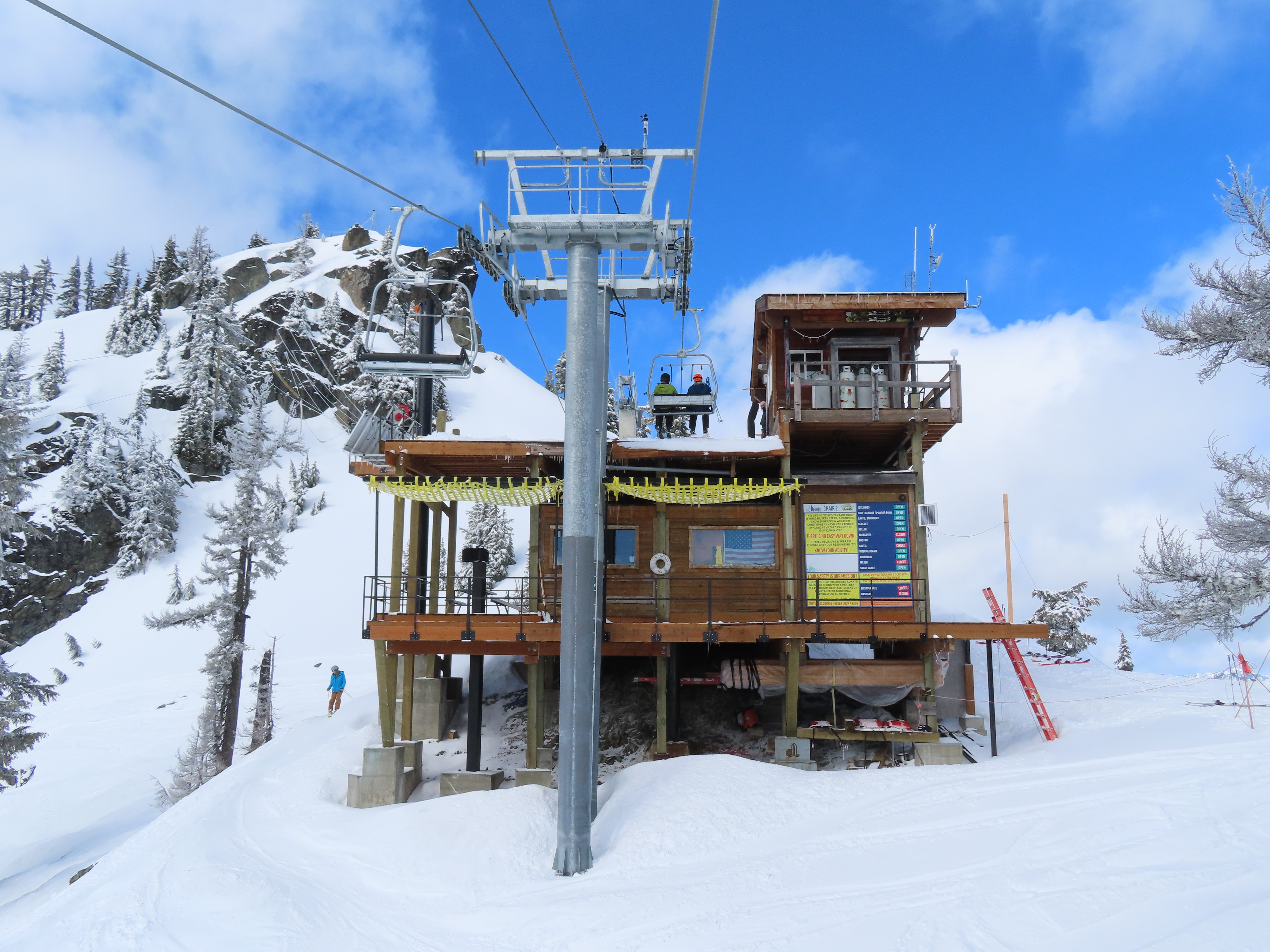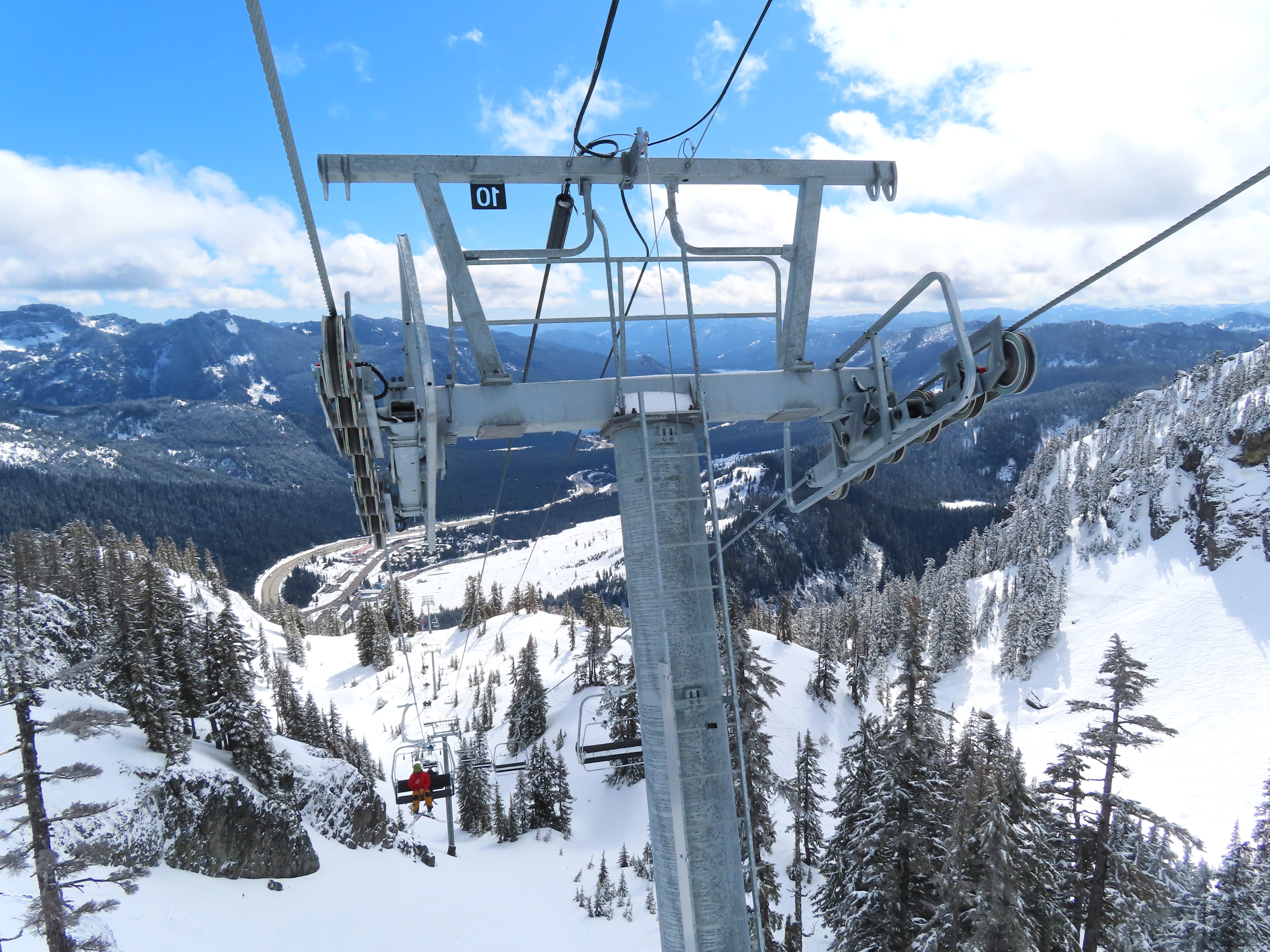 Doppelmayr worked for several years to replace the mountaintop Edelweiss double with the new Edelweiss triple.This is the third Alpenstar triple at Alpental.Drive station and tower 1.View riding up the first pitch.The first of many towers on this lift with combination assemblies on both sides.View back down toward Summit West.The first breakover.View down the line at tower 10.Tower 11.Very rare overhead unloading for a new lift.Tall top bullwheel structure.The top terminal ramp was re-used so new towers were built around it.T11.View down near the summit.Tower 9.Middle section of the line.View up at tower 8.EJ triple chair.Padded chair.View down at tower 5.Lower lift line.Tower 3.View up near the bottom terminal.Tower 5.Heavily loaded tower 6.Flat middle segment of the alignment.The previous Riblet followed the exact same route.Tall tower 9.Tower 10.Arriving at the summit.Top terminal complex.Patrol shack on the lower level.View from the summit.Tower 10.T6 and T7.Side view of the drive.Grip, hanger and taco.