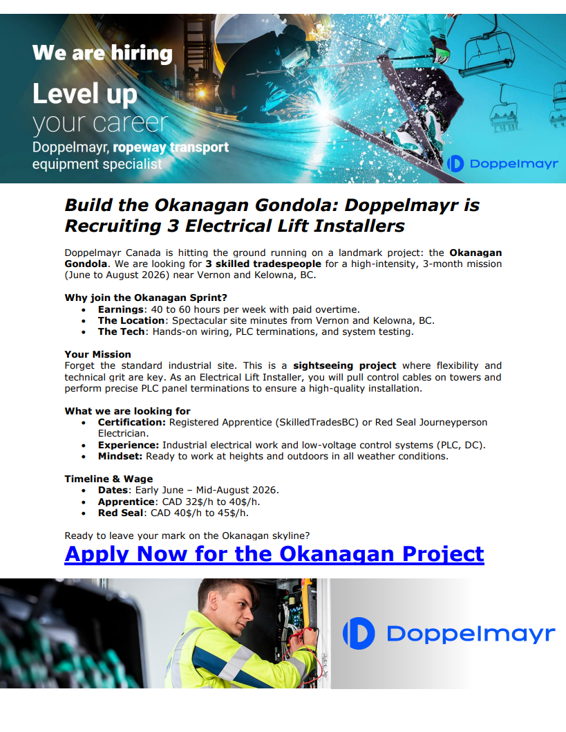 Electrical Lift Installer – Okanagan Project – Doppelmayr Canada Share this: Email a link to a friend (Opens in new window) Email Share on X (Opens in new window) X Share on Facebook (Opens in new window) Facebook Like Loading...