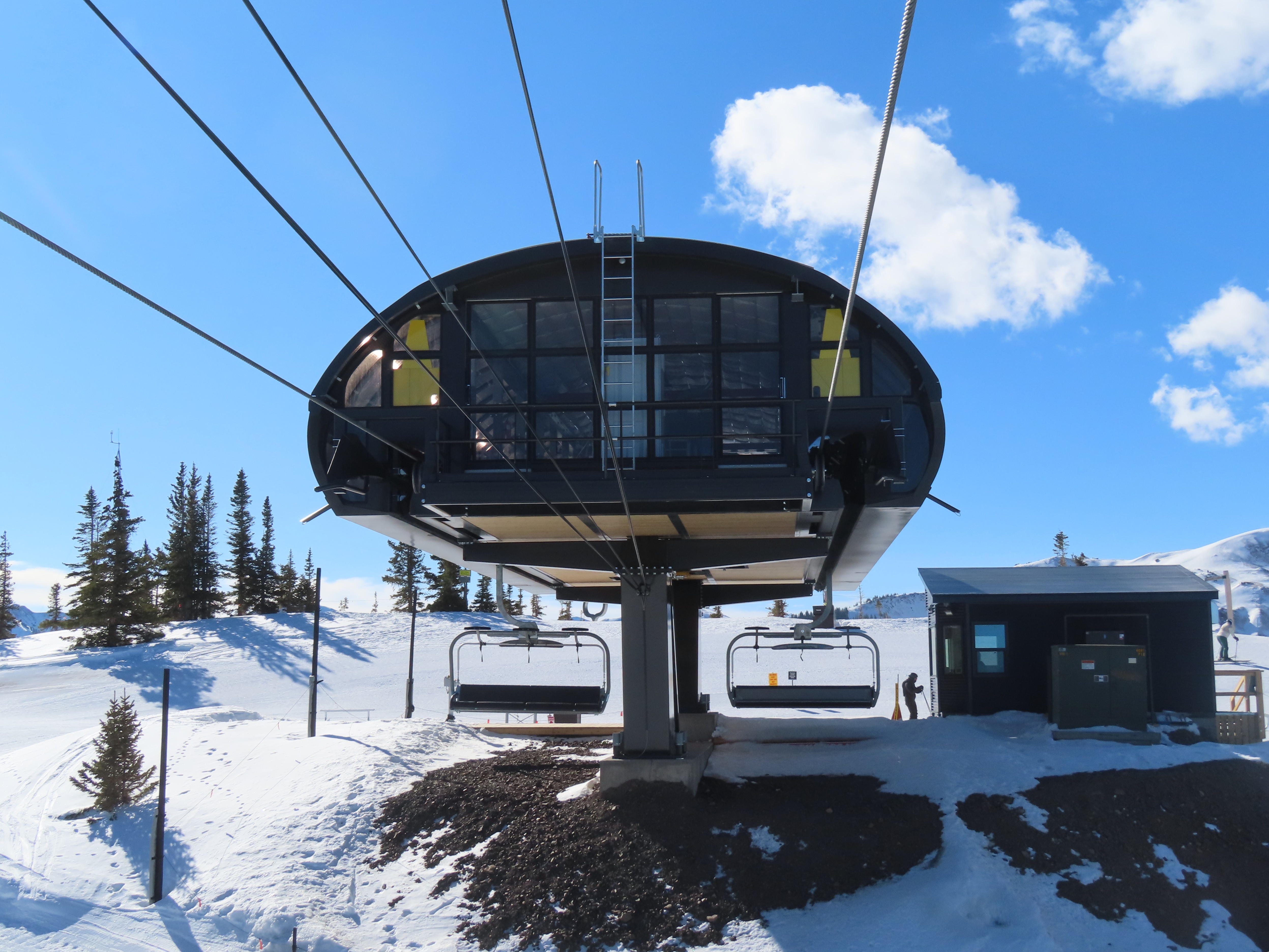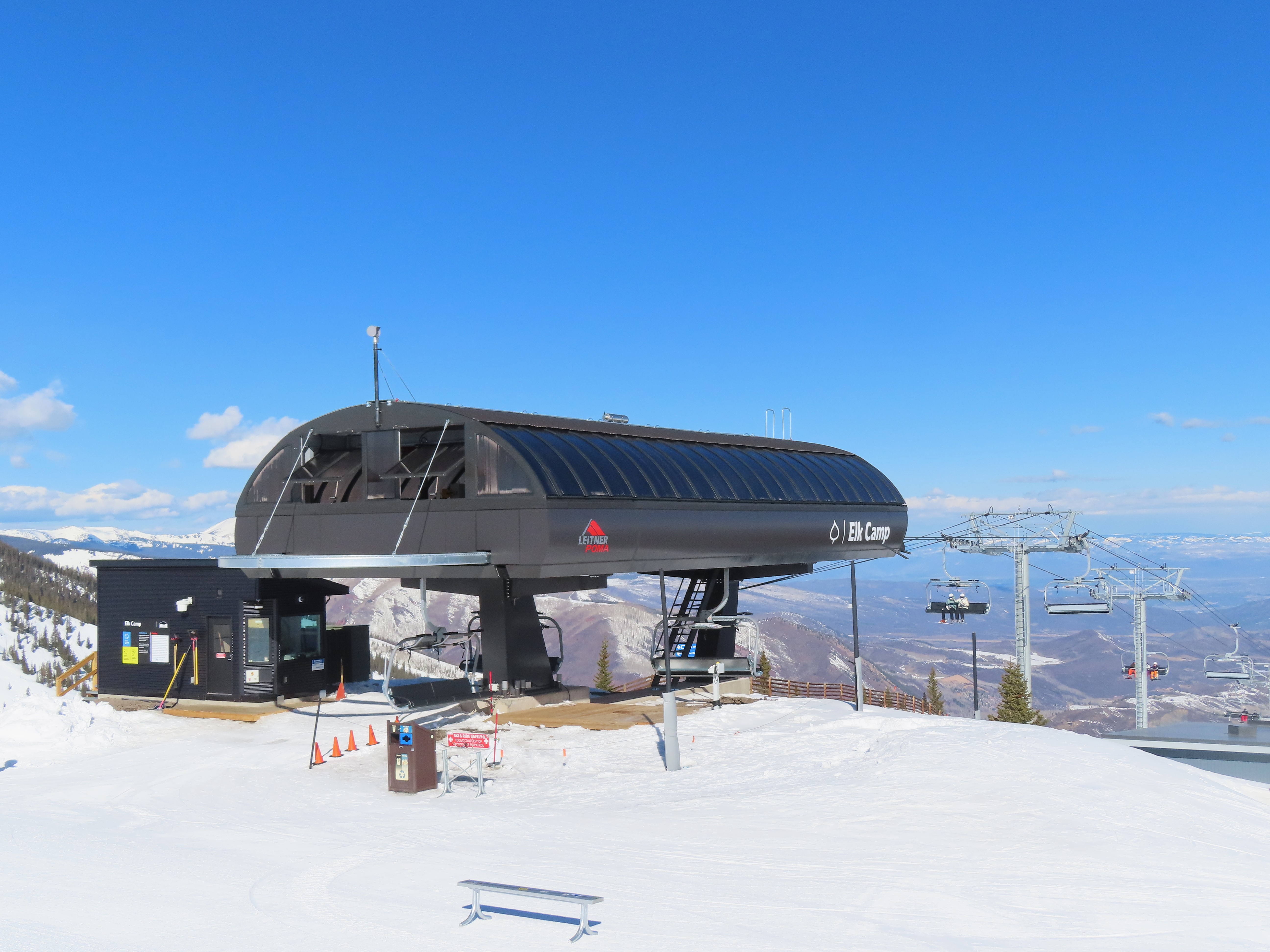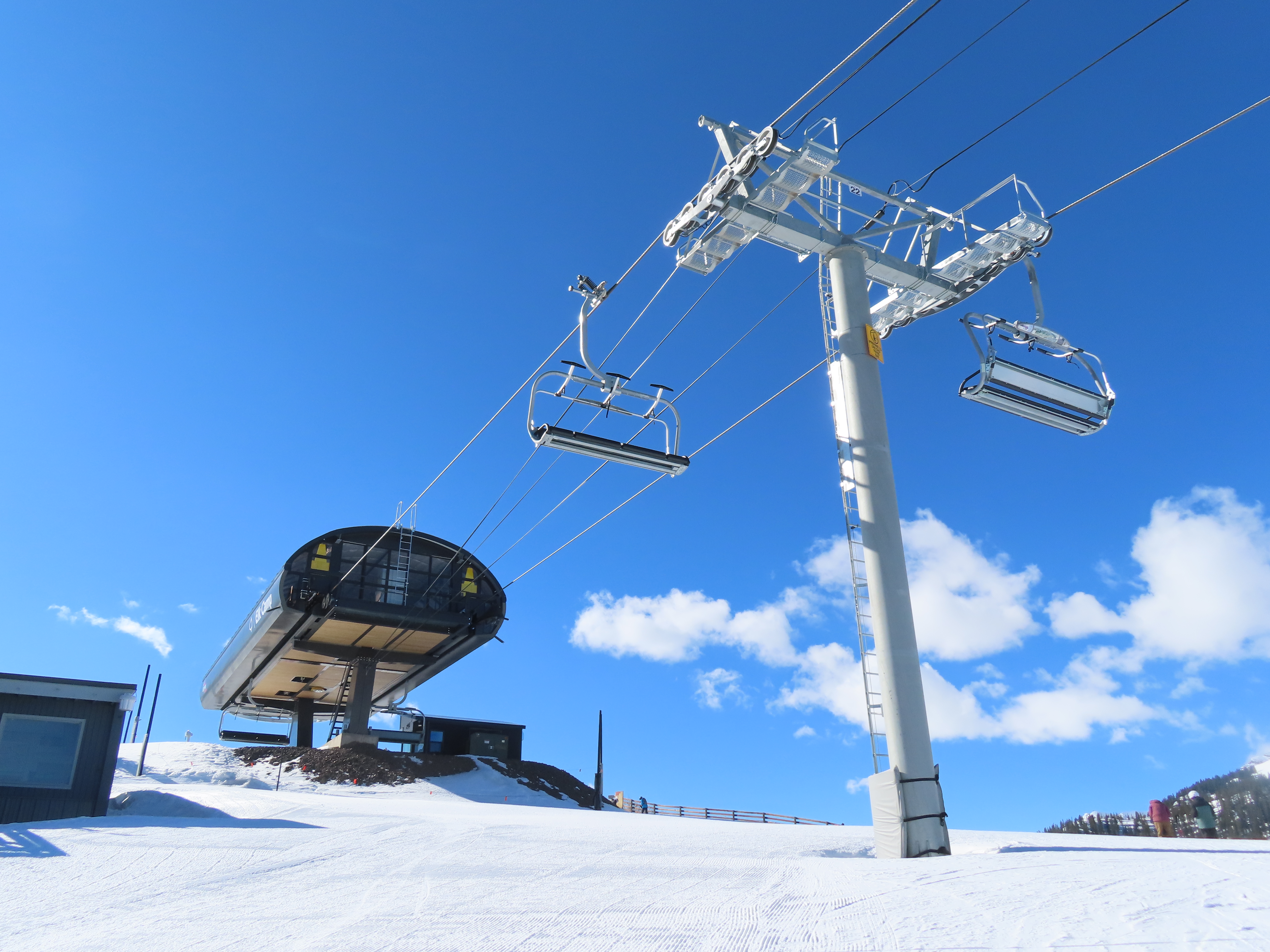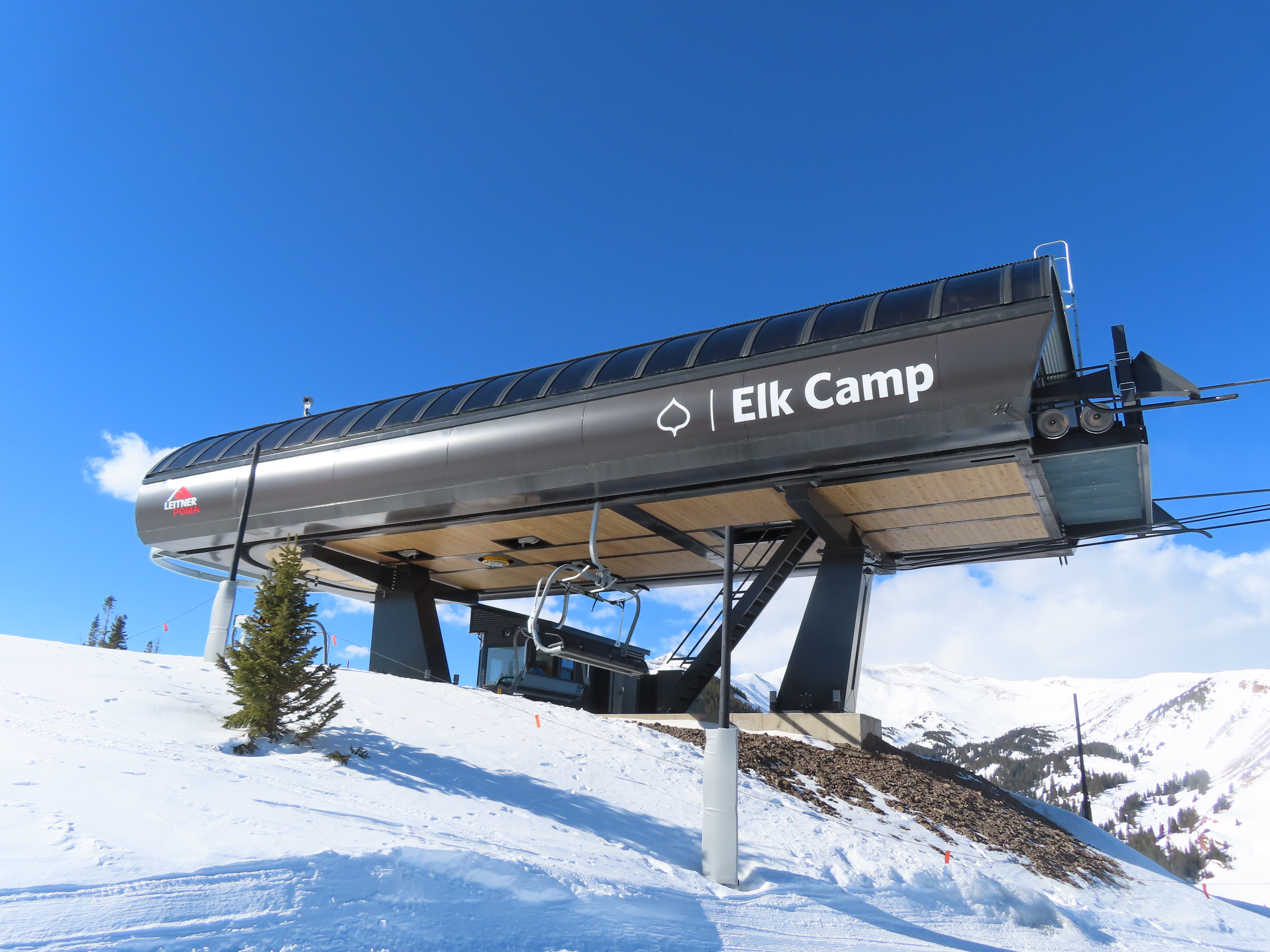 This detachable six pack replaced a detachable quad of the same name in 2025.Leitner-Poma LPA station and tower 1.Loading area and maintenance rail.View riding out of Elk Camp.Riding up the line at tower 10.View back down the lower line.Tower 12.Several towers are quite tall.Upper lift line.View back near the summit.Arriving at the drive station.Unloading area and drive terminal.Upper station overview.Terminal under cover.Breakover towers at the top.Looking up at the top station.View down the long lift line.Upper line.Middle part of the line.View down at tower 13.Long, consistent pitched alignment.Lower lift line.View up at T4.Return station overview.Lift overview and a large maintenance bay.