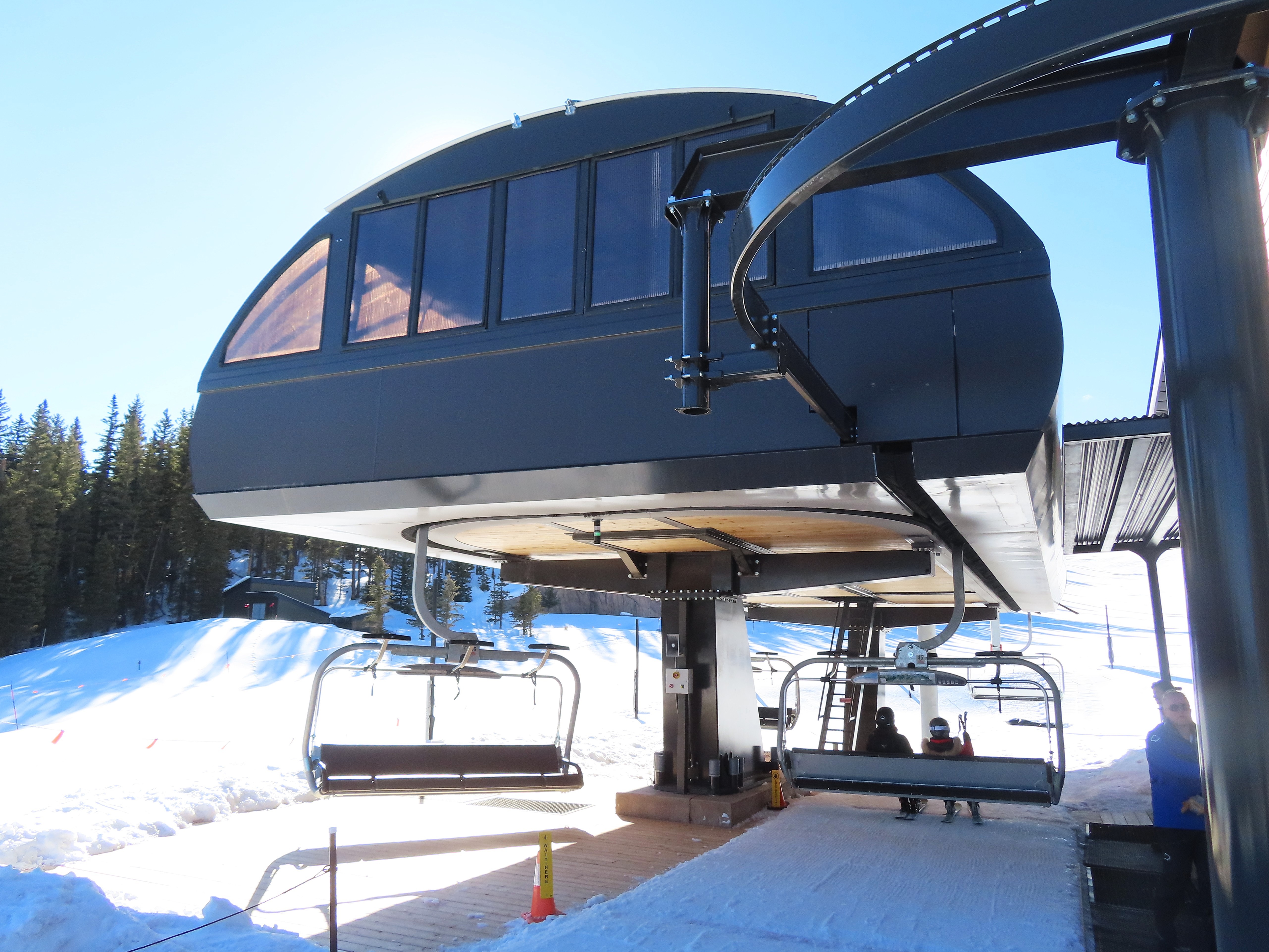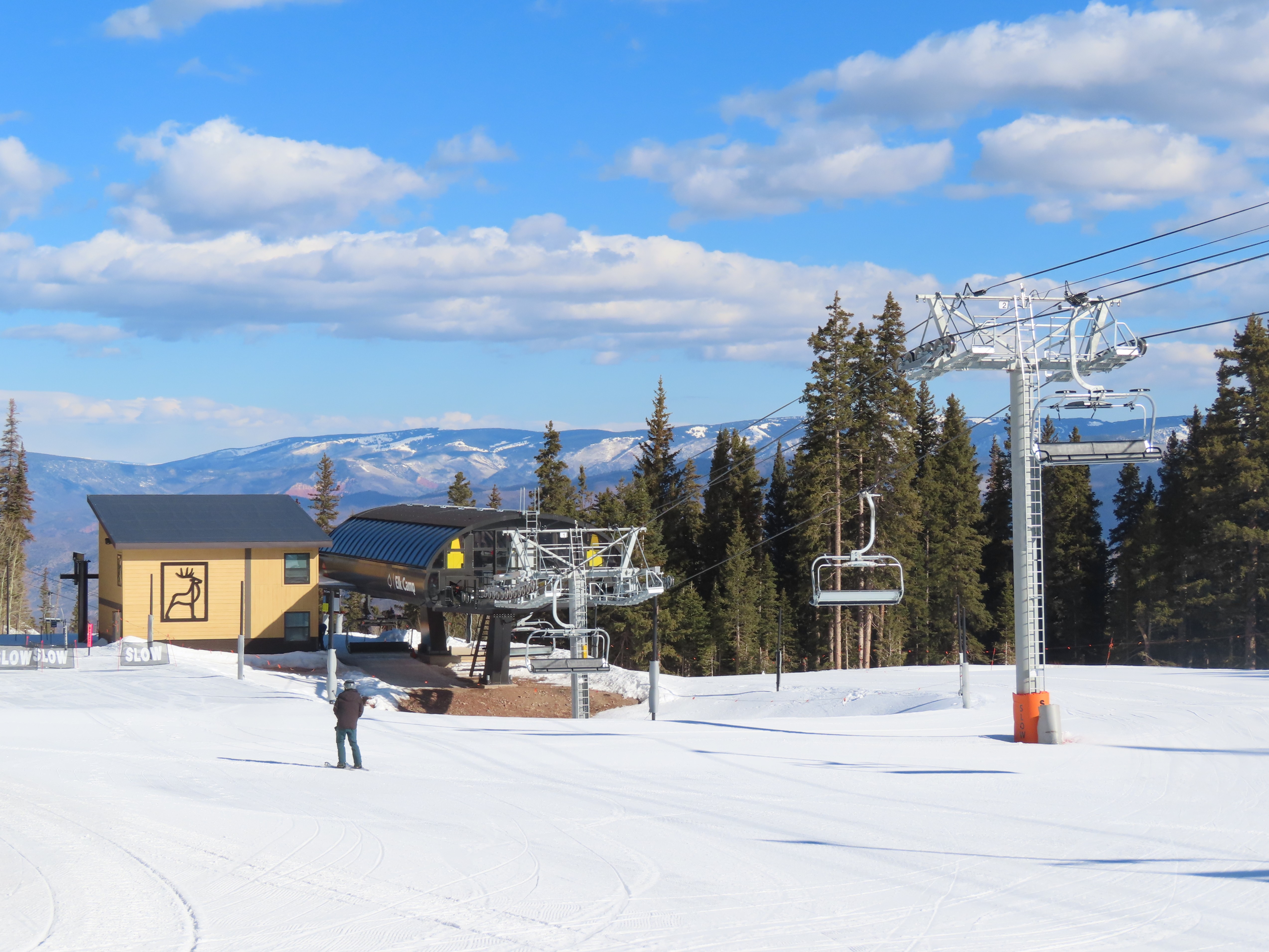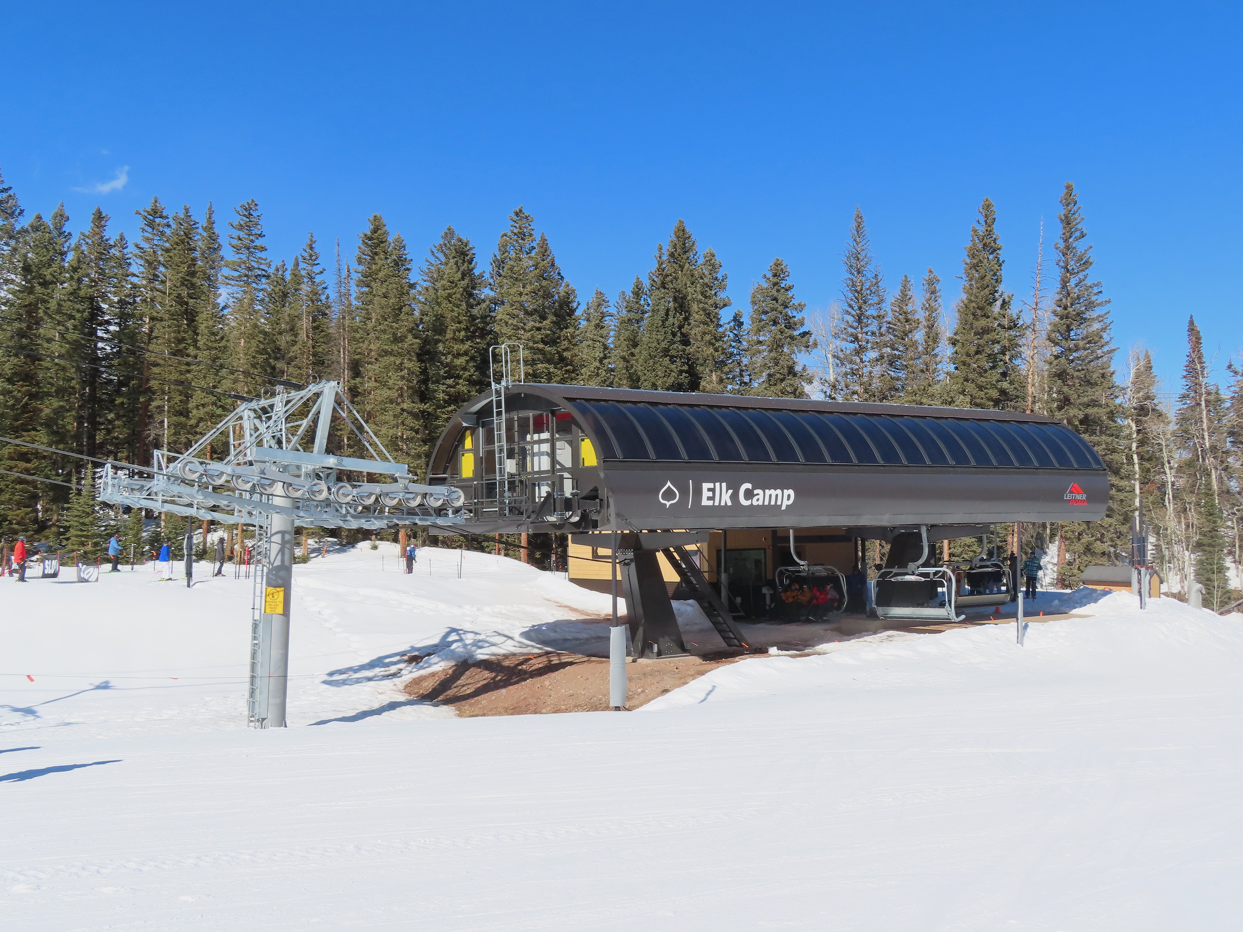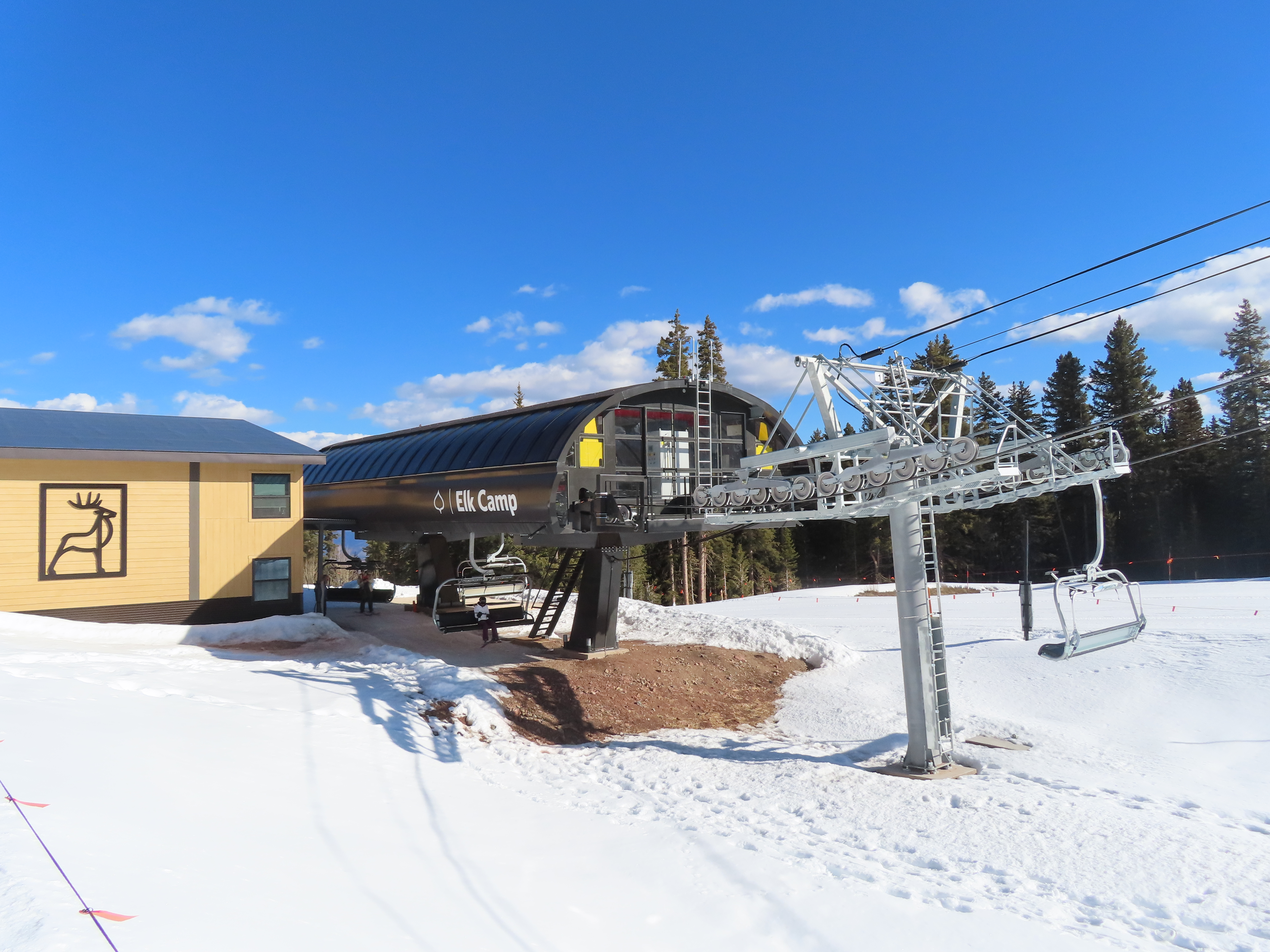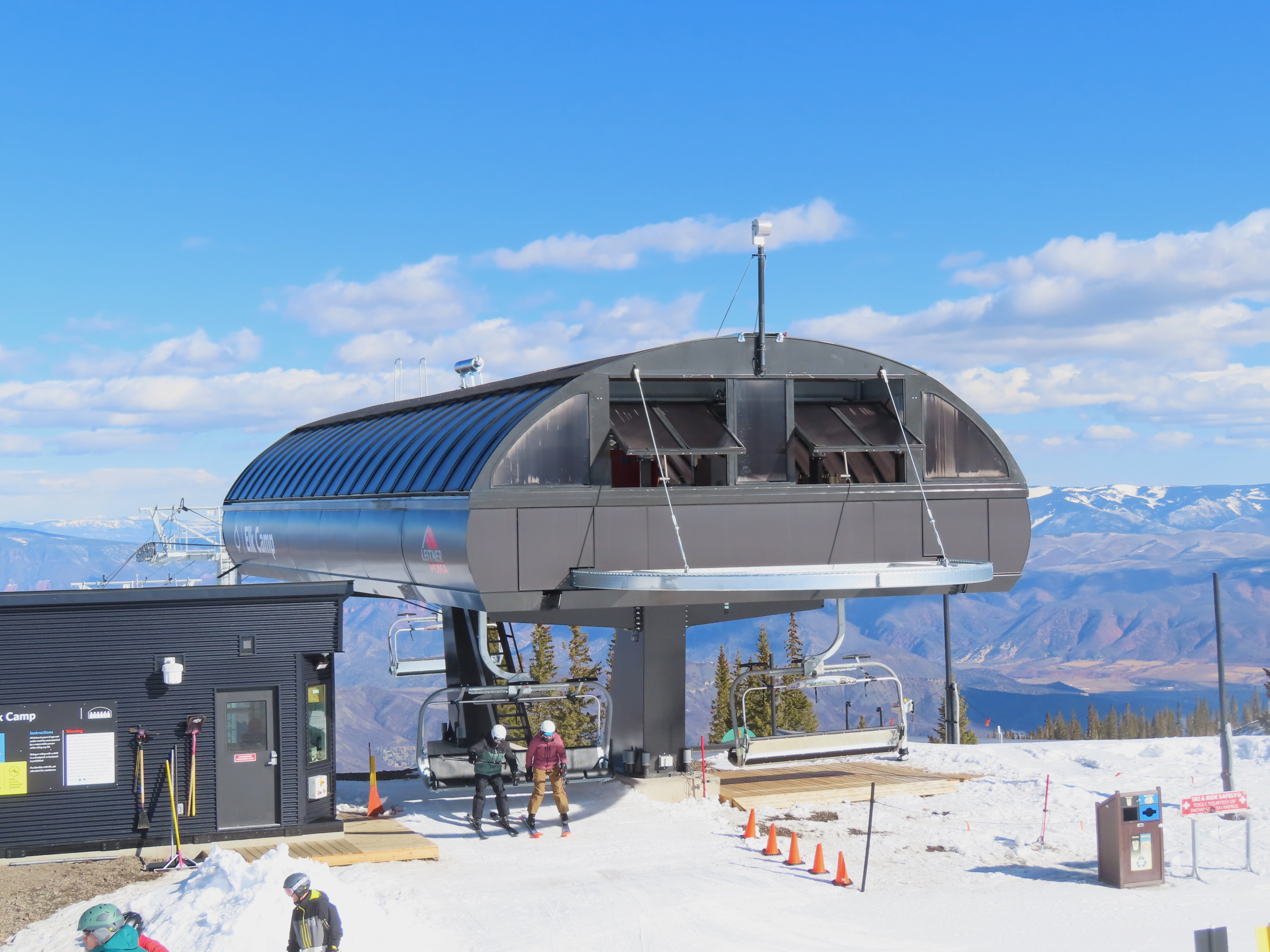 This detachable six pack replaced a detachable quad of the same name in 2025.Leitner-Poma LPA station and tower 1.Loading area and maintenance rail.View riding out of Elk Camp.Riding up the line at tower 10.View back down the lower line.Tower 12.Several towers are quite tall.Upper lift line.View back near the summit.Arriving at the drive station.Unloading area and drive terminal.Upper station overview.Terminal under cover.Breakover towers at the top.Looking up at the top station.View down the long lift line.Upper line.Middle part of the line.View down at tower 13.Long, consistent pitched alignment.Lower lift line.View up at T4.Return station overview.Lift overview and a large maintenance bay.