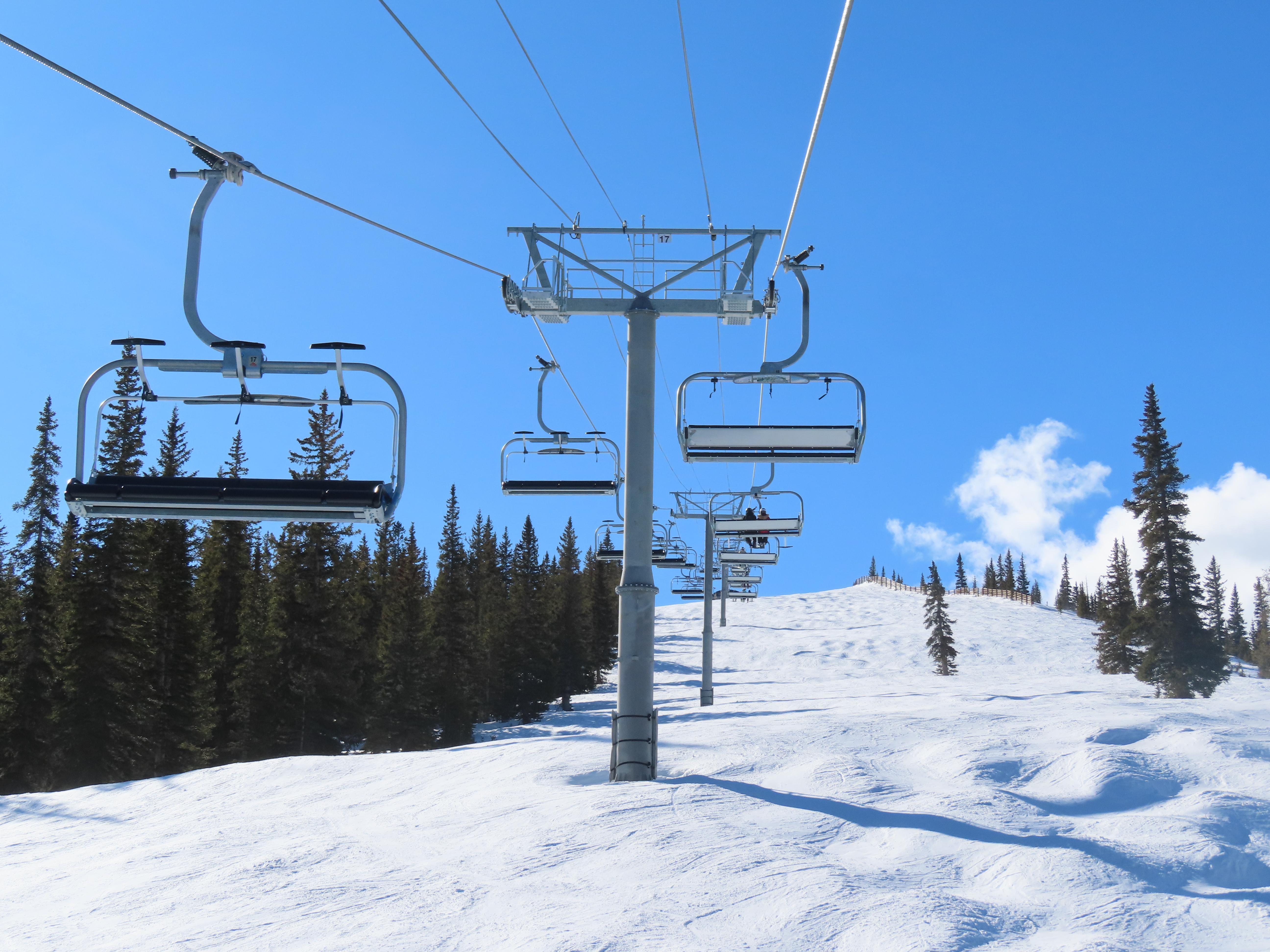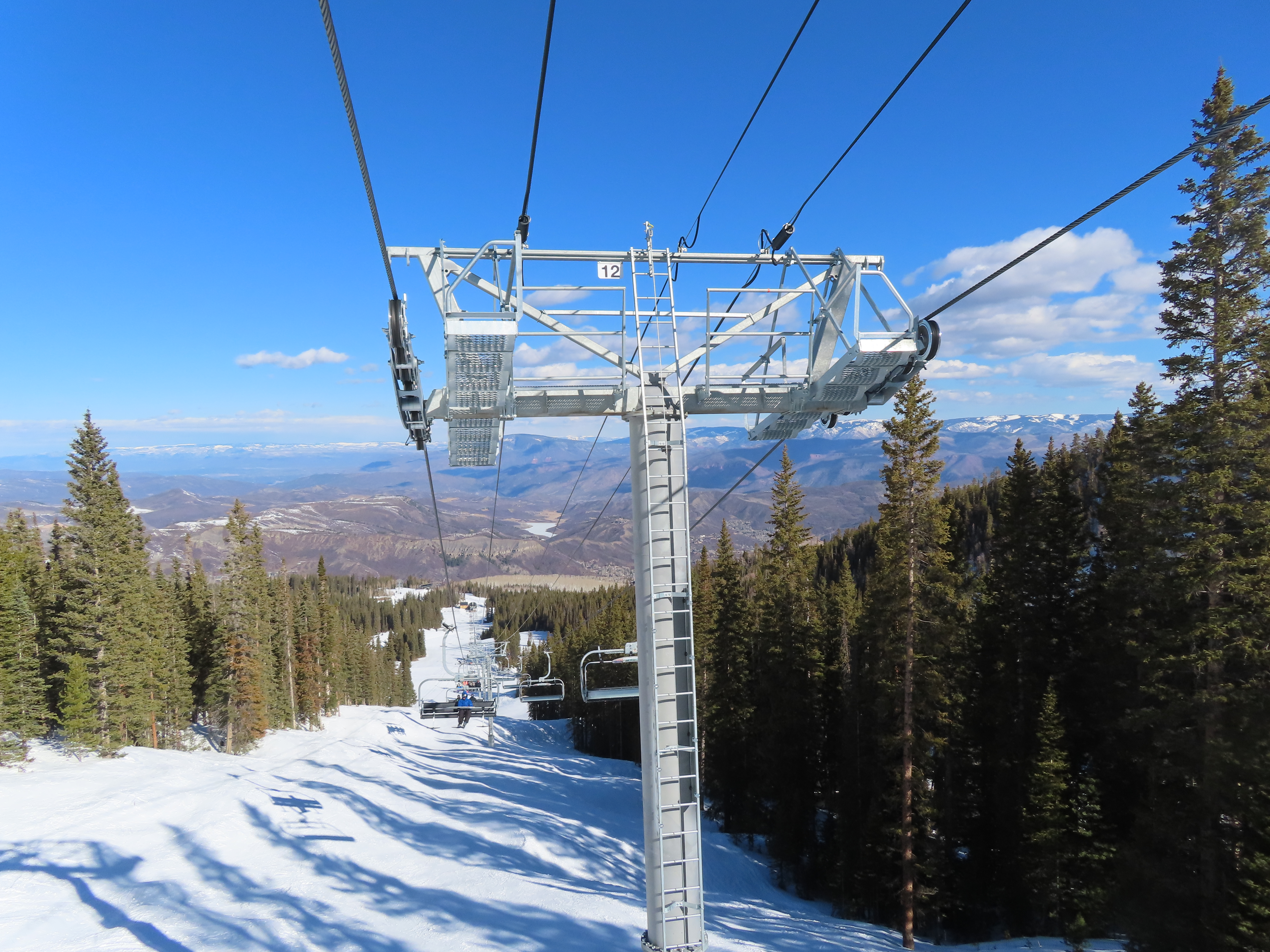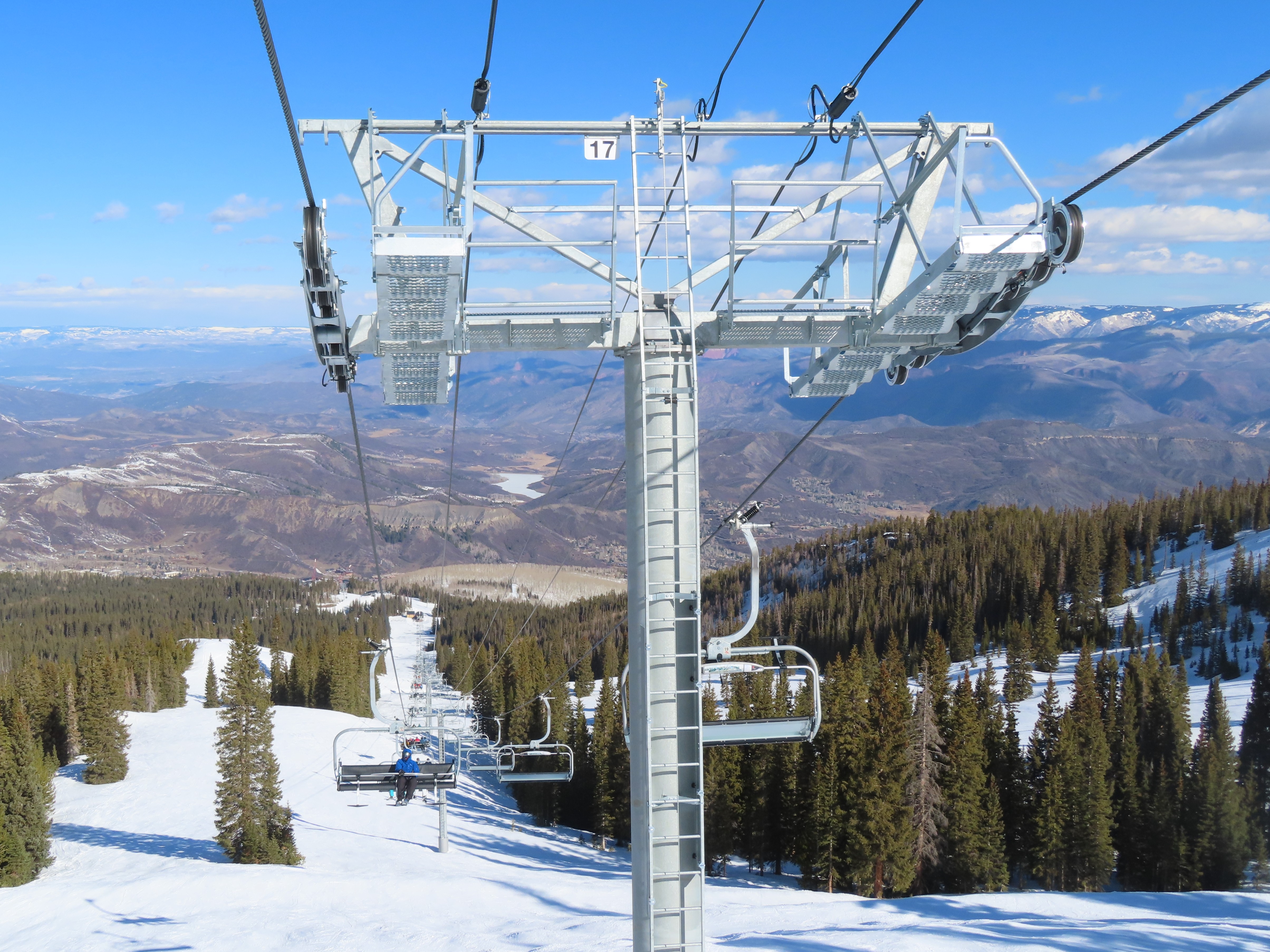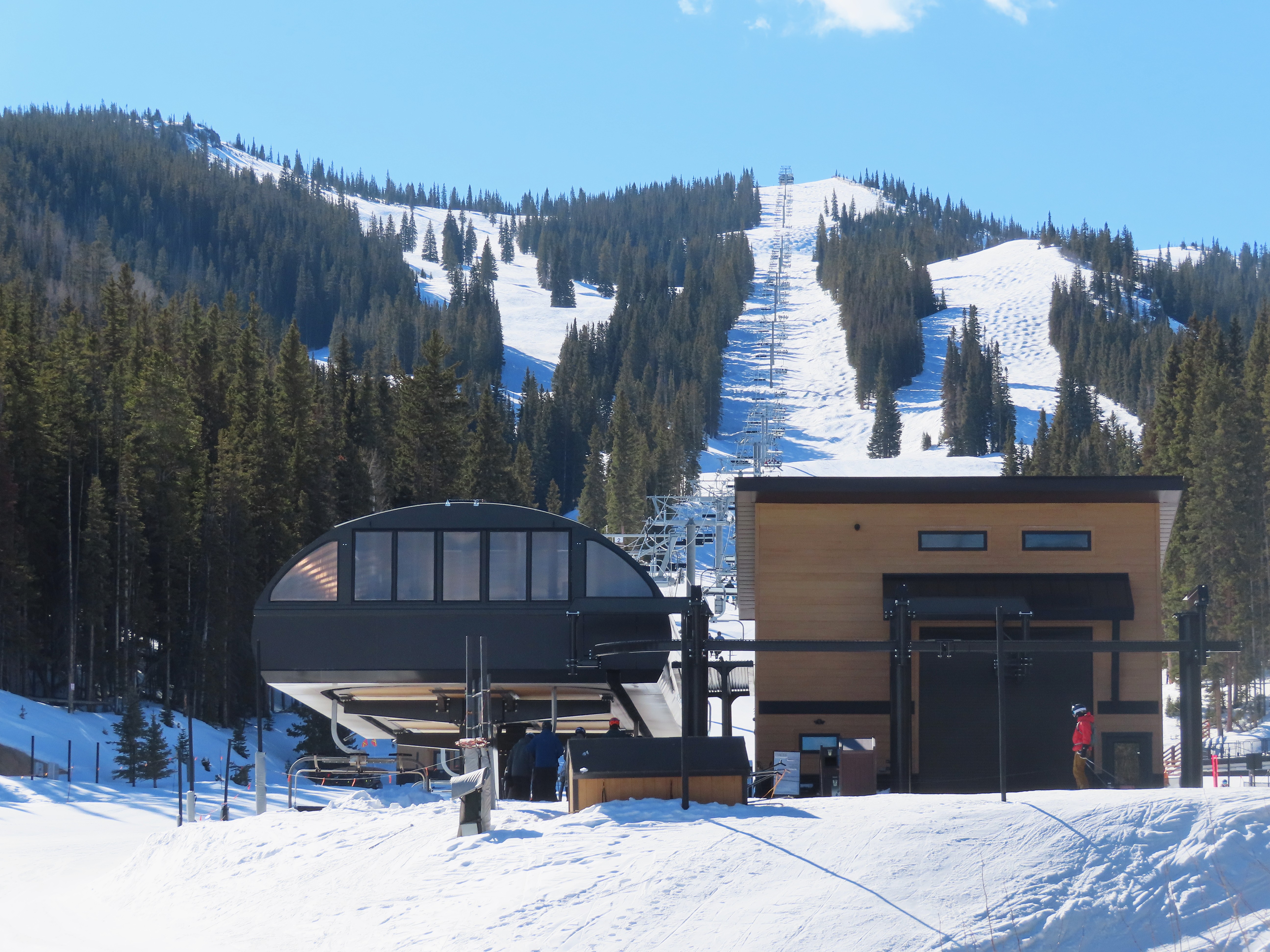 This detachable six pack replaced a detachable quad of the same name in 2025.Leitner-Poma LPA station and tower 1.Loading area and maintenance rail.View riding out of Elk Camp.Riding up the line at tower 10.View back down the lower line.Tower 12.Several towers are quite tall.Upper lift line.View back near the summit.Arriving at the drive station.Unloading area and drive terminal.Upper station overview.Terminal under cover.Breakover towers at the top.Looking up at the top station.View down the long lift line.Upper line.Middle part of the line.View down at tower 13.Long, consistent pitched alignment.Lower lift line.View up at T4.Return station overview.Lift overview and a large maintenance bay.
