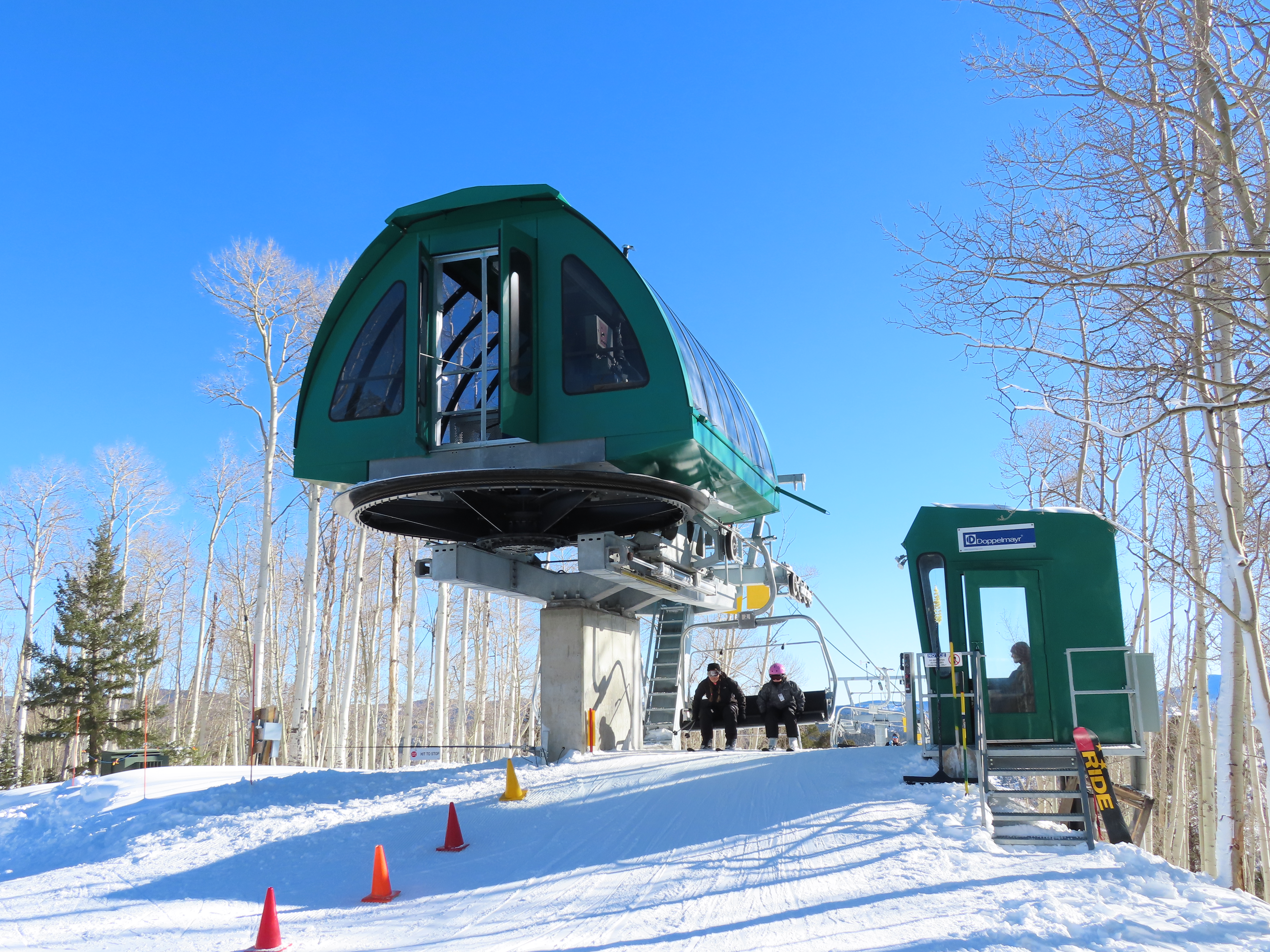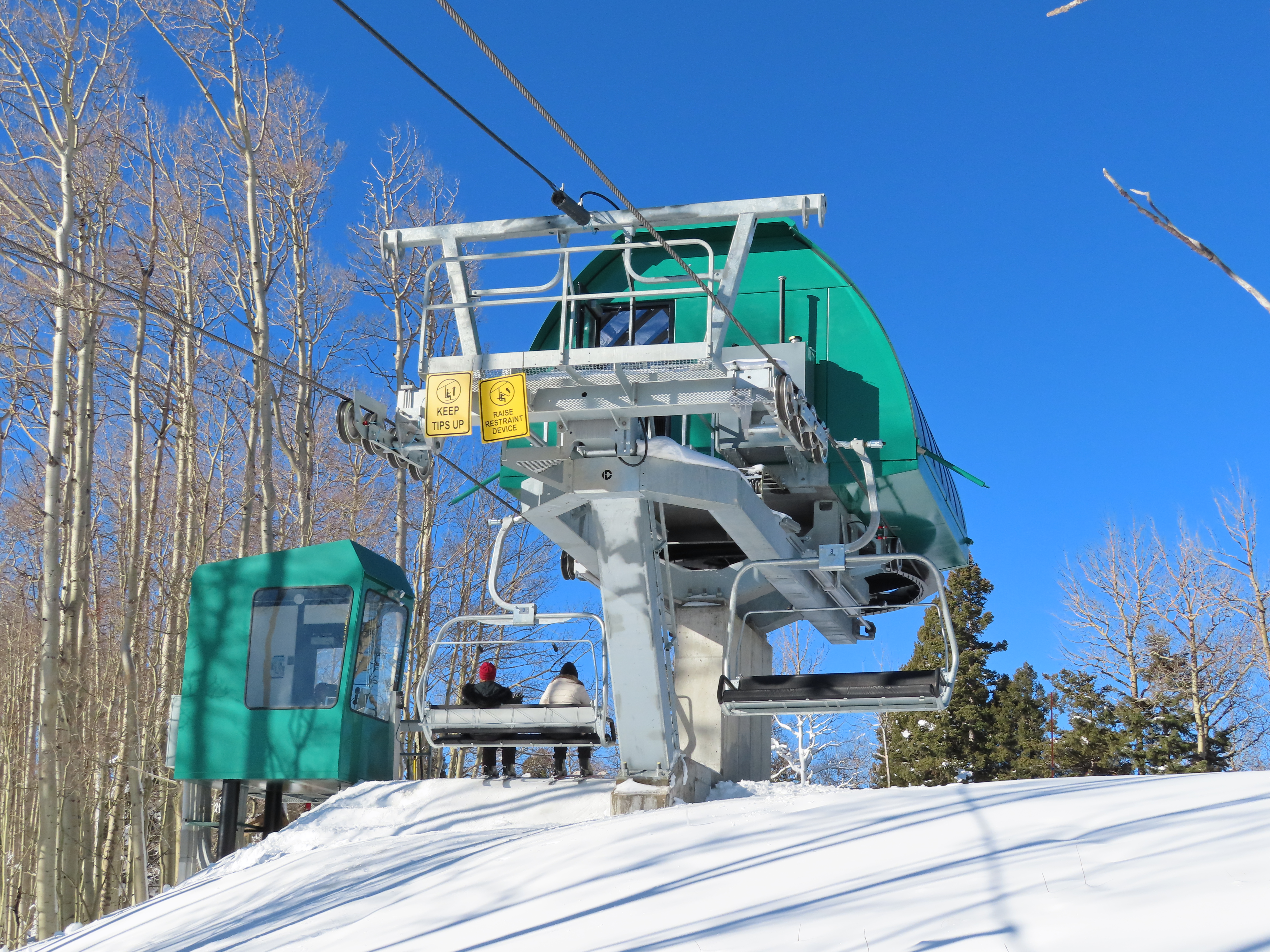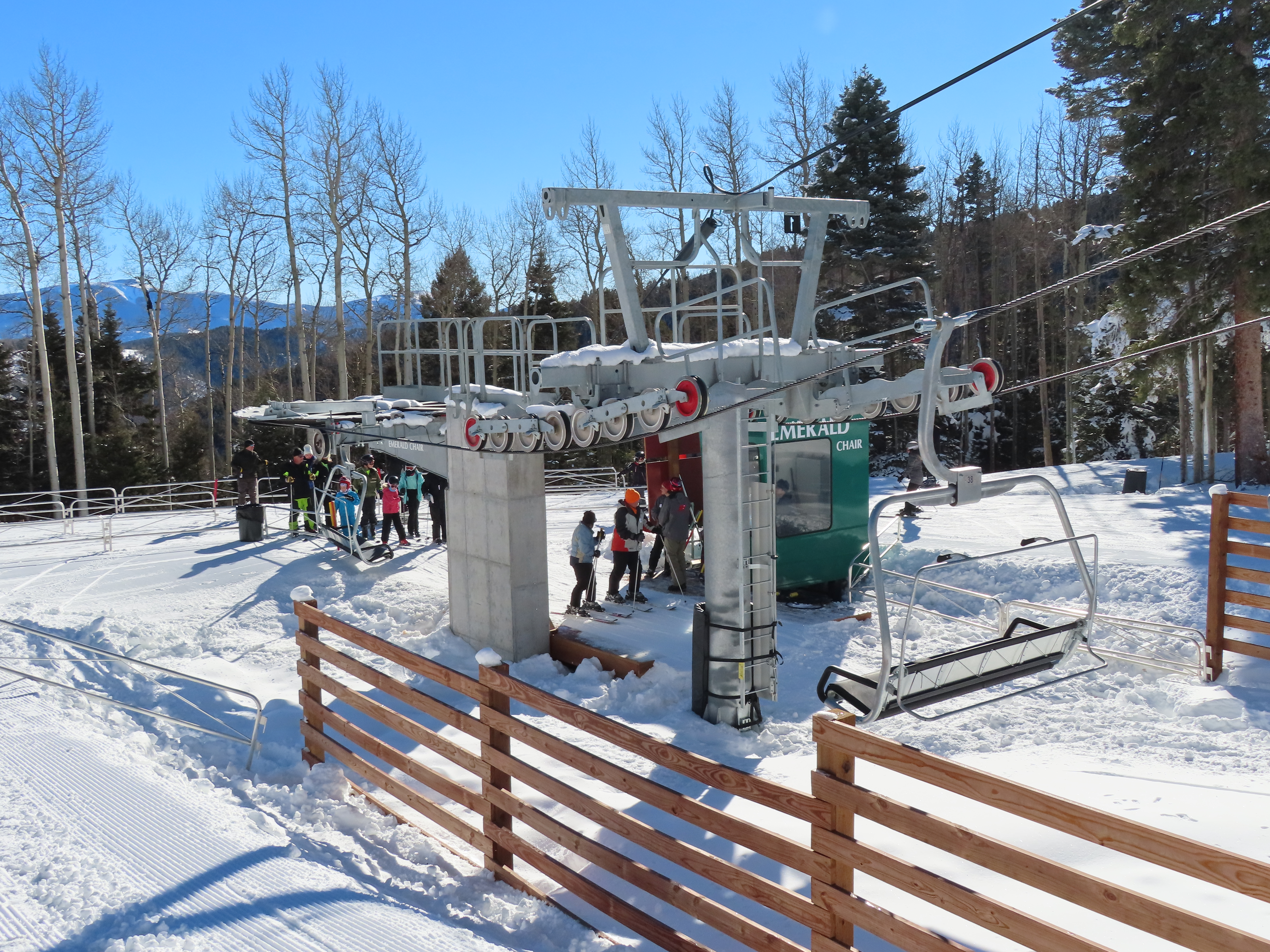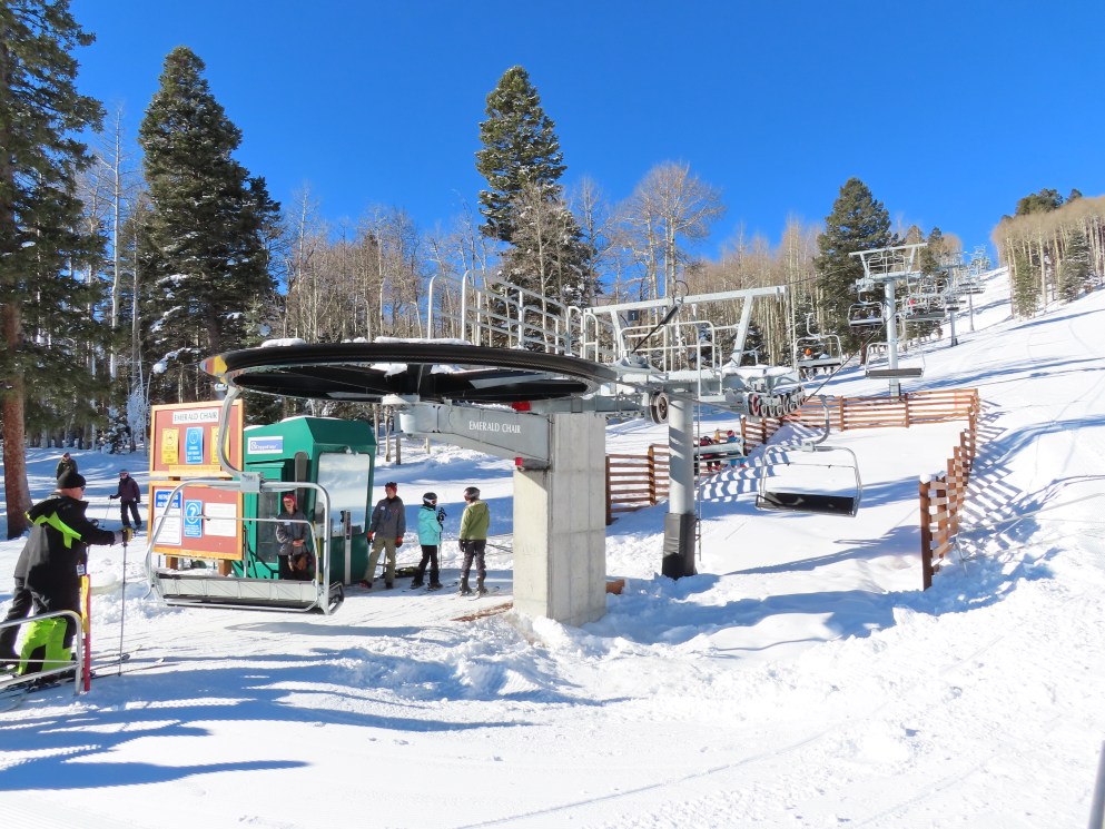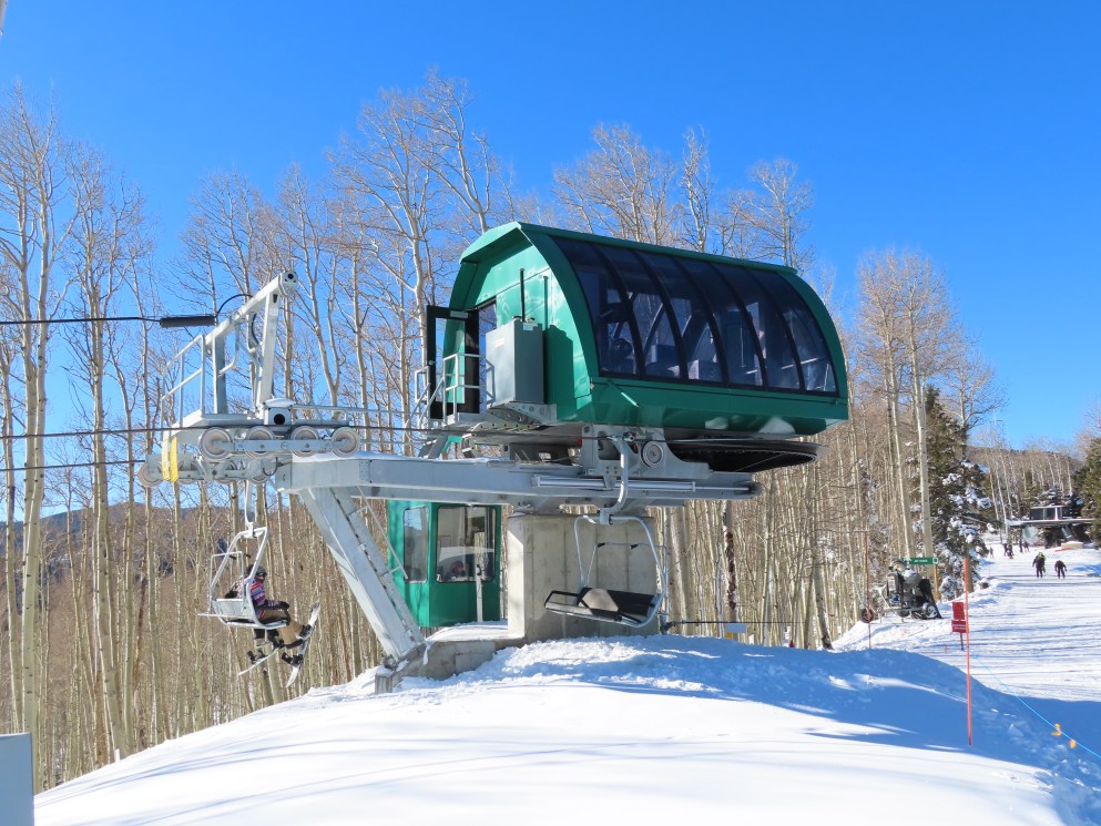 The Emerald chair services popular beginner terrain on the back side of the summit.This lift replaced a Riblet double in a longer alignment ending higher up.Tower 1.Lift overview.View back down the lift line.Nearing the top.Unloading area and operator house.Doppelmayr Alpen-Star terminal with the Silver chair in the background.Top tower integrated into the terminal.T6.