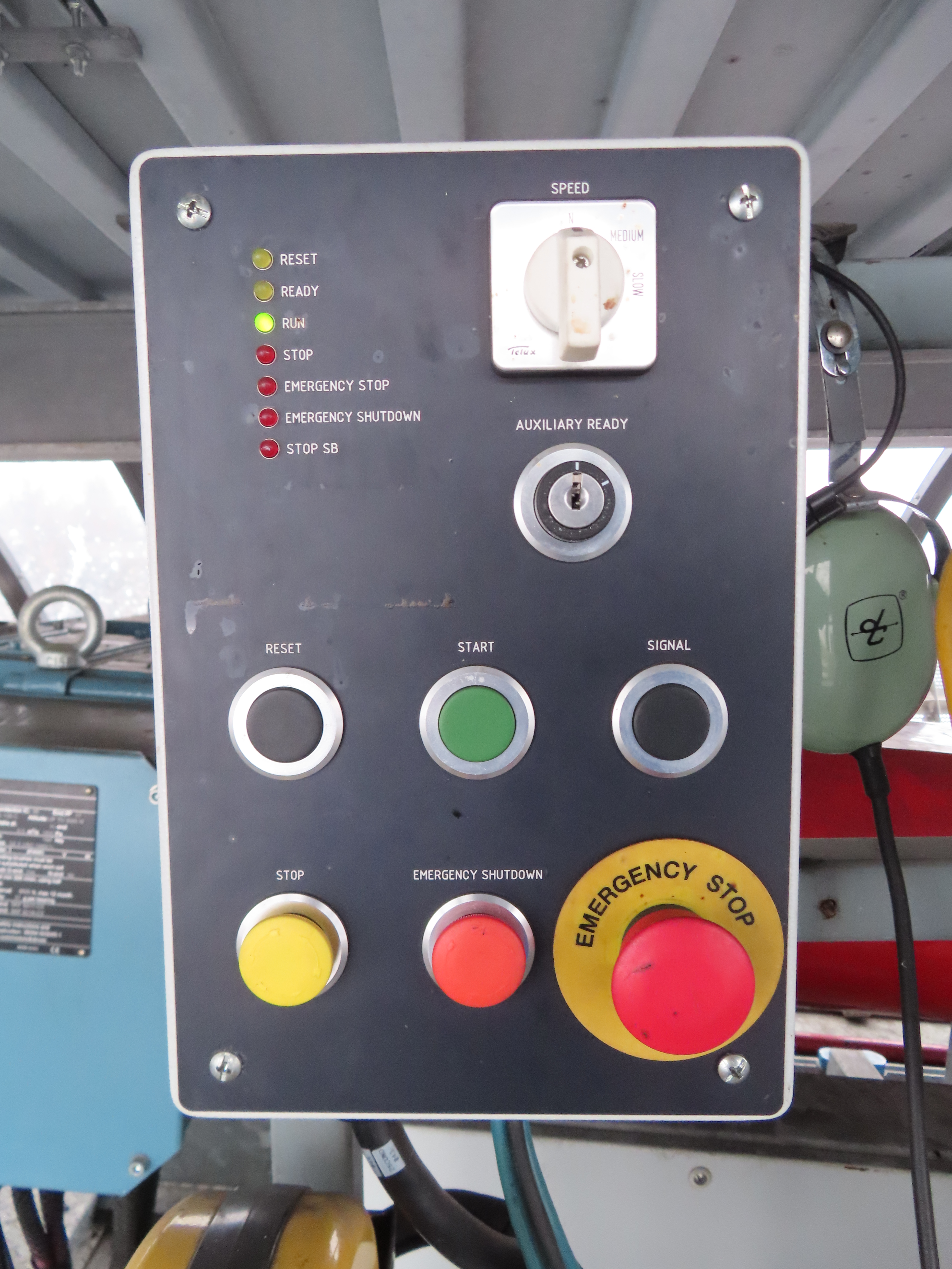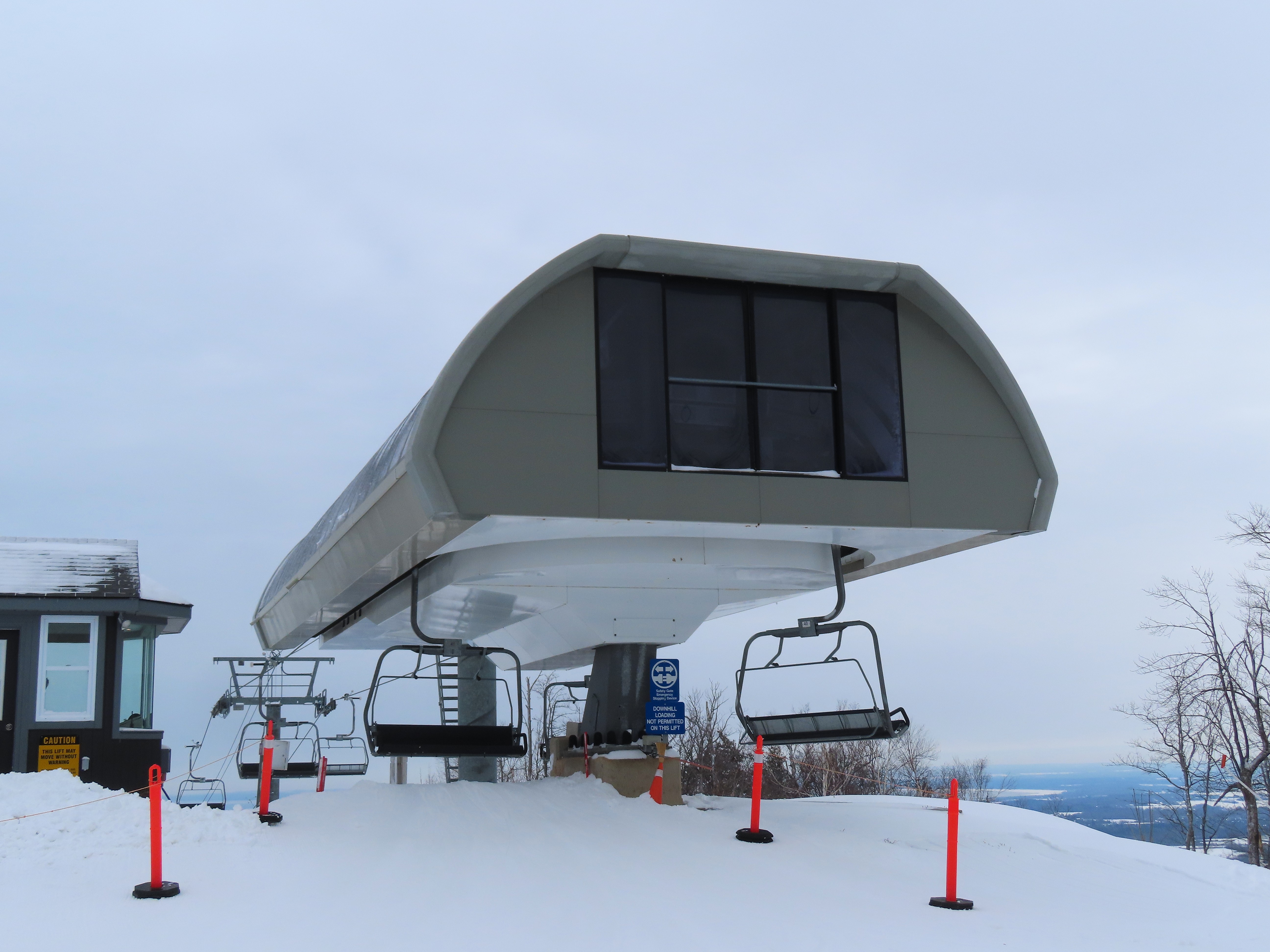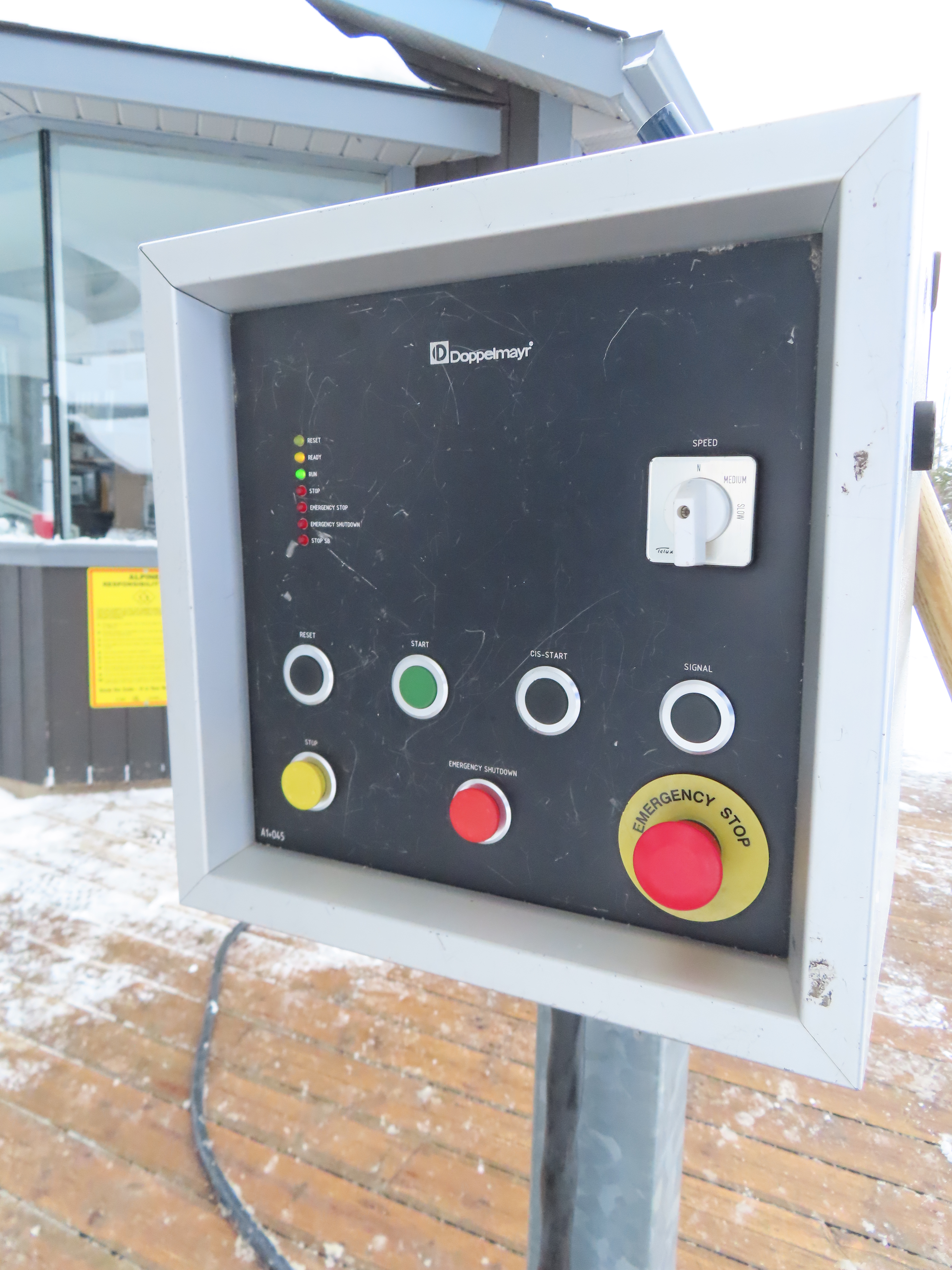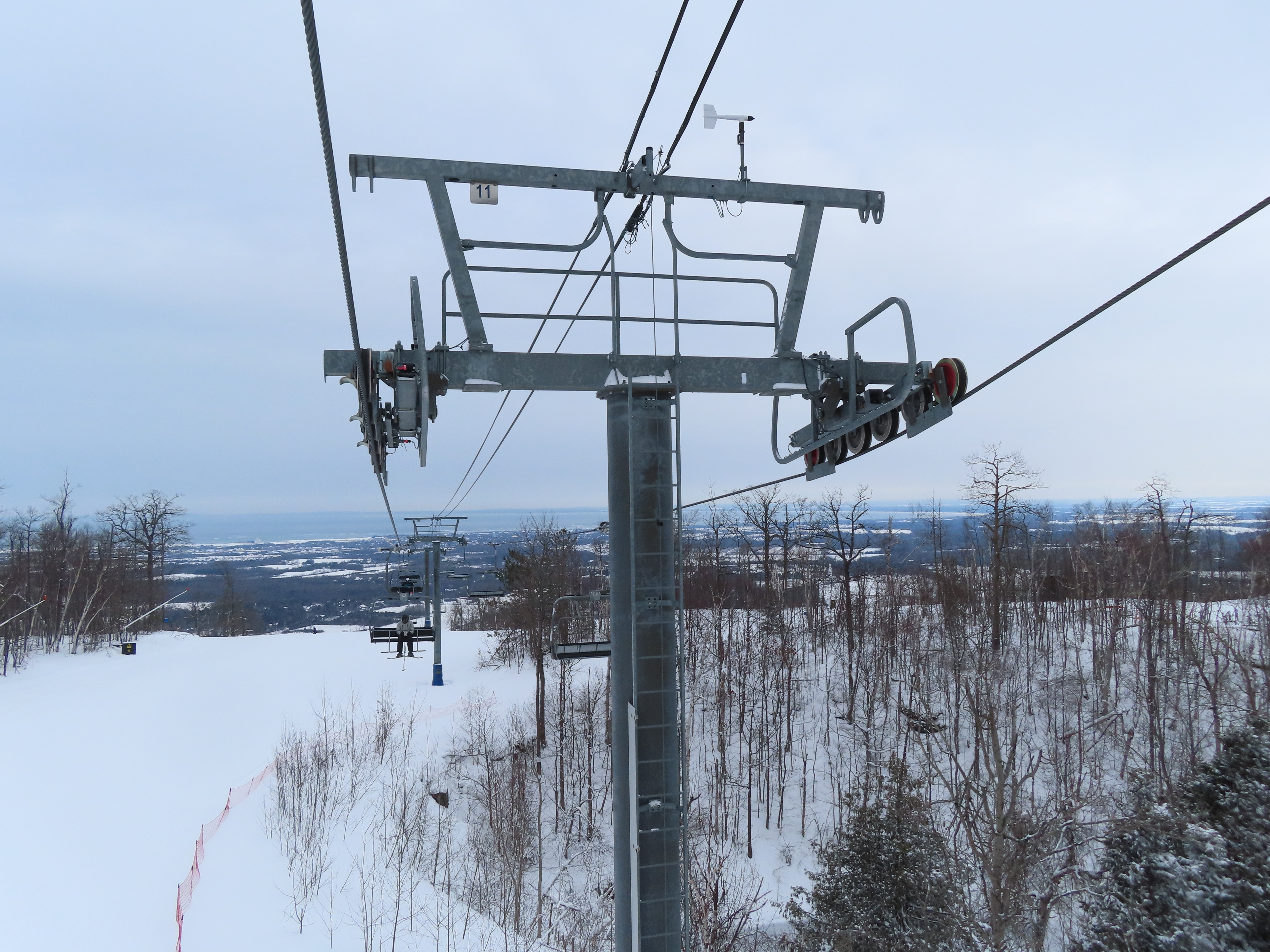 This UNI-G detachable services the Orchard pod.Side view of the drive station.View up the line from the base area.Tower 5.View back down the lower line.Middle section of the line.A convex section of the line.Tower 9.Hold down tower due to varied topography.Nearing the summit.Arriving at the return.Unloading area.Upper station overview.Another view of the top station.View from the summit.Looking down at tower 11.Tower 8.Lower lift line.Combination assemblies.Side view of the drive.Bottom station overview.Control cabinets in the bottom operator hut.Inside the drive-tension station.Connection between the motor and gearbox.Tension and brake pumps.Controls inside the drive terminal.Outside operator controls.