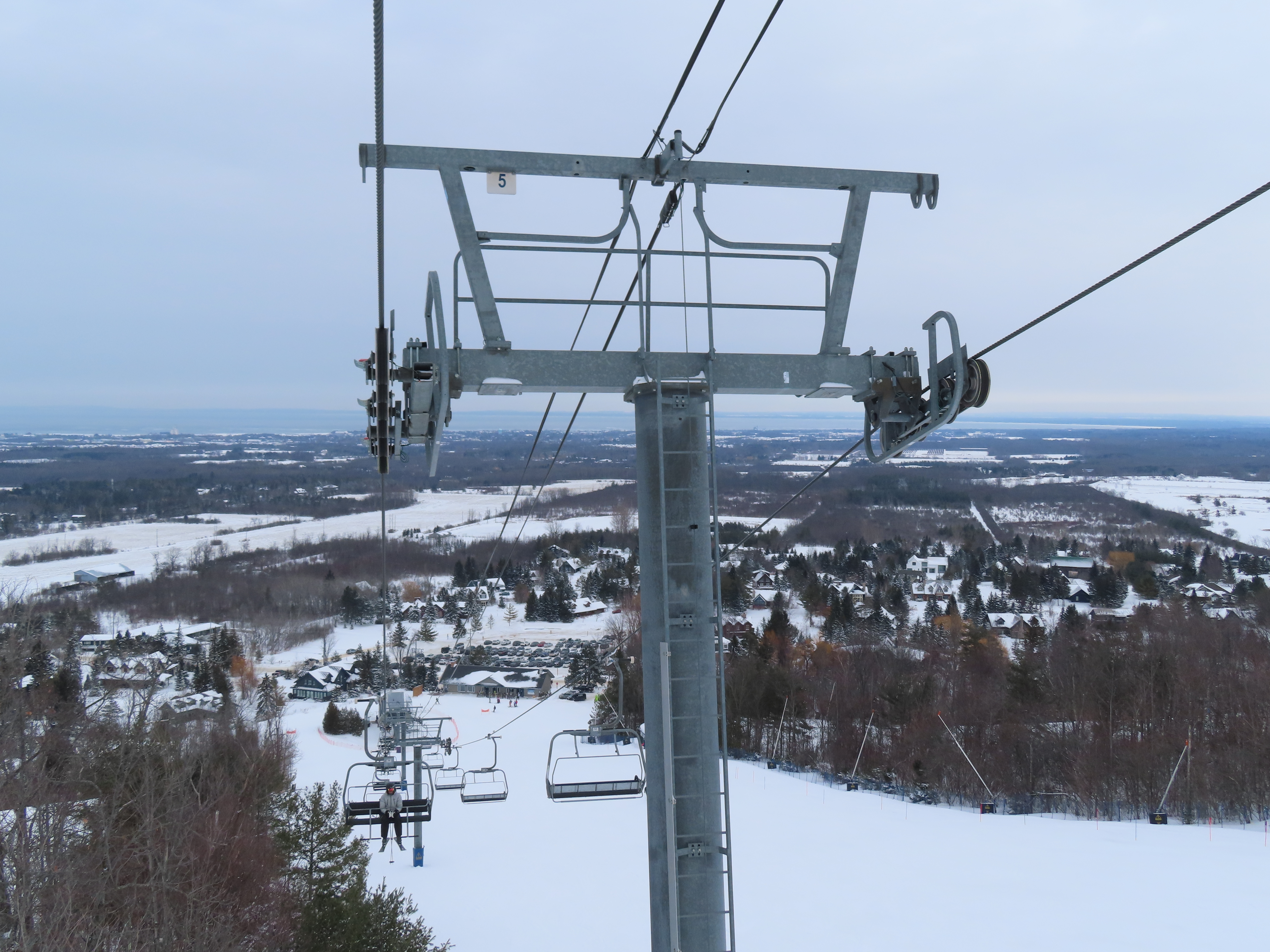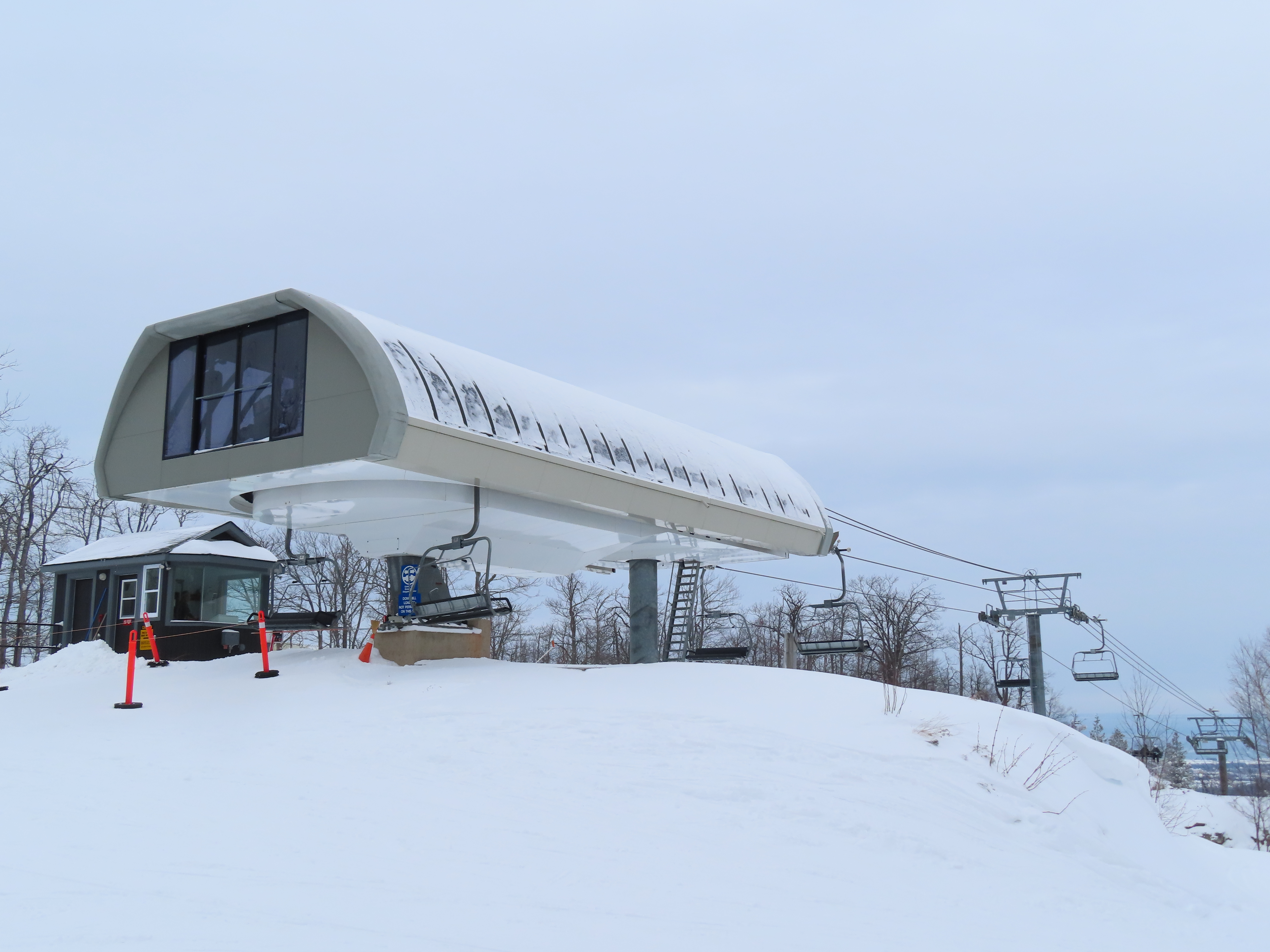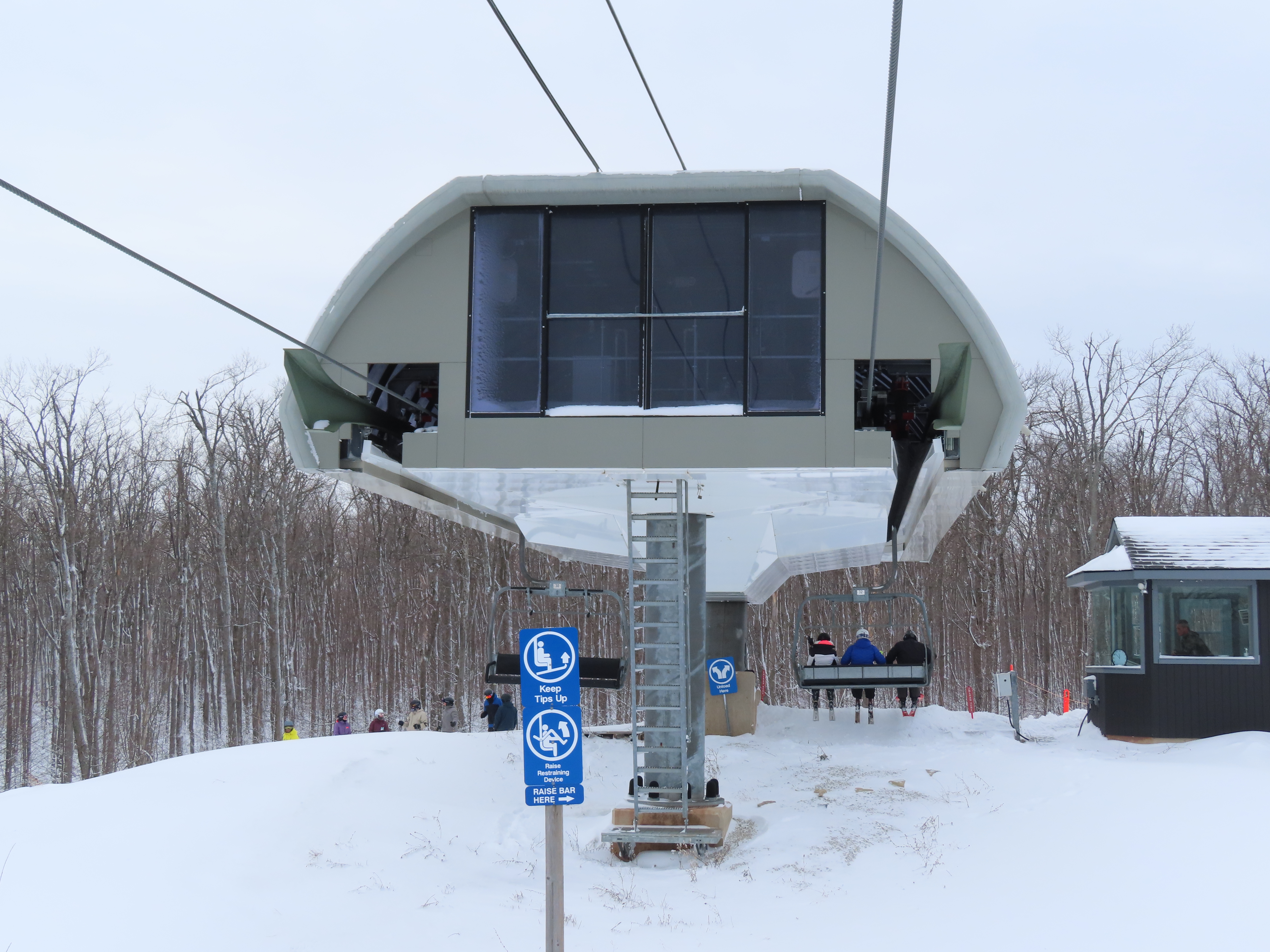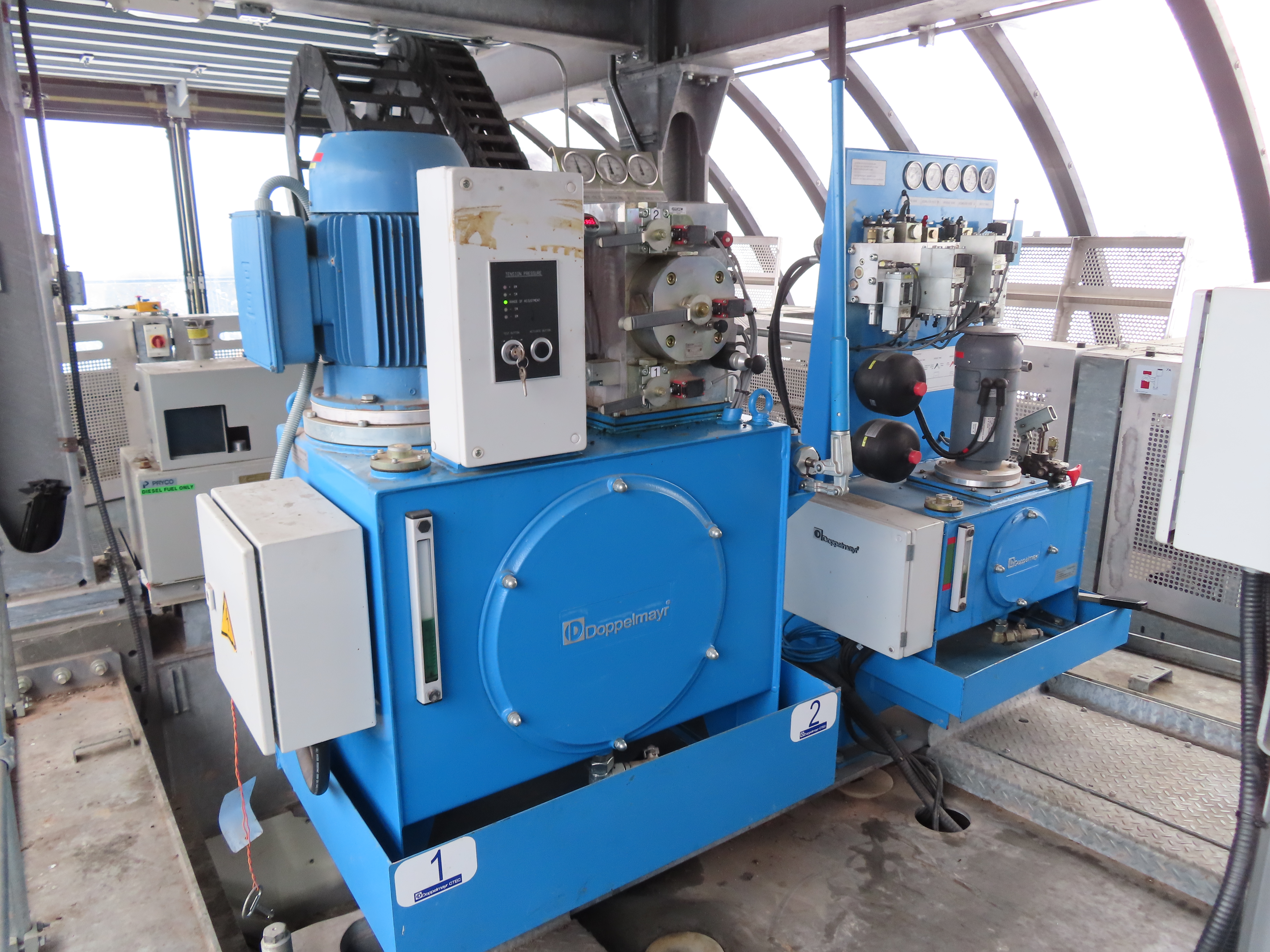 This UNI-G detachable services the Orchard pod.Side view of the drive station.View up the line from the base area.Tower 5.View back down the lower line.Middle section of the line.A convex section of the line.Tower 9.Hold down tower due to varied topography.Nearing the summit.Arriving at the return.Unloading area.Upper station overview.Another view of the top station.View from the summit.Looking down at tower 11.Tower 8.Lower lift line.Combination assemblies.Side view of the drive.Bottom station overview.Control cabinets in the bottom operator hut.Inside the drive-tension station.Connection between the motor and gearbox.Tension and brake pumps.Controls inside the drive terminal.Outside operator controls.