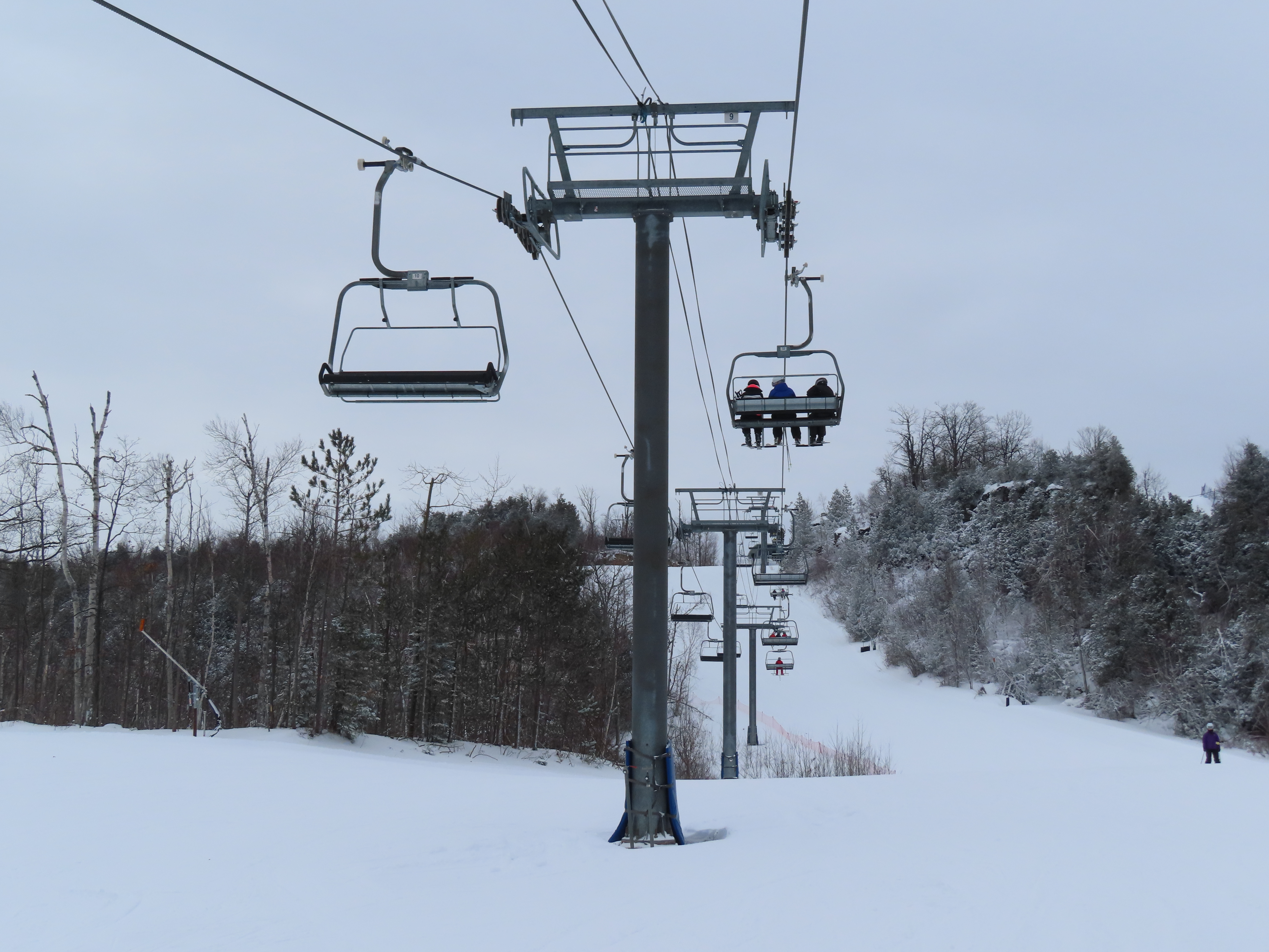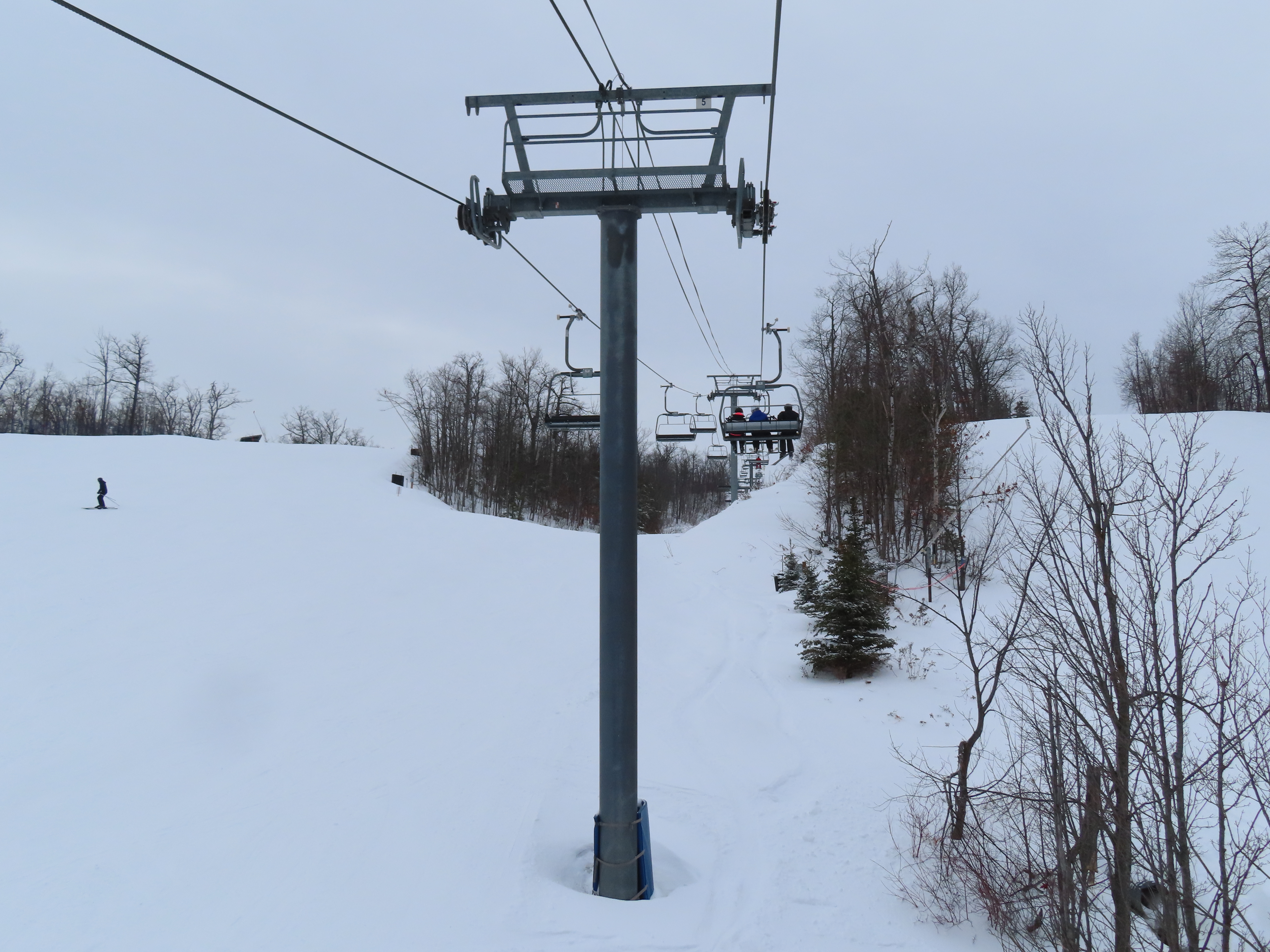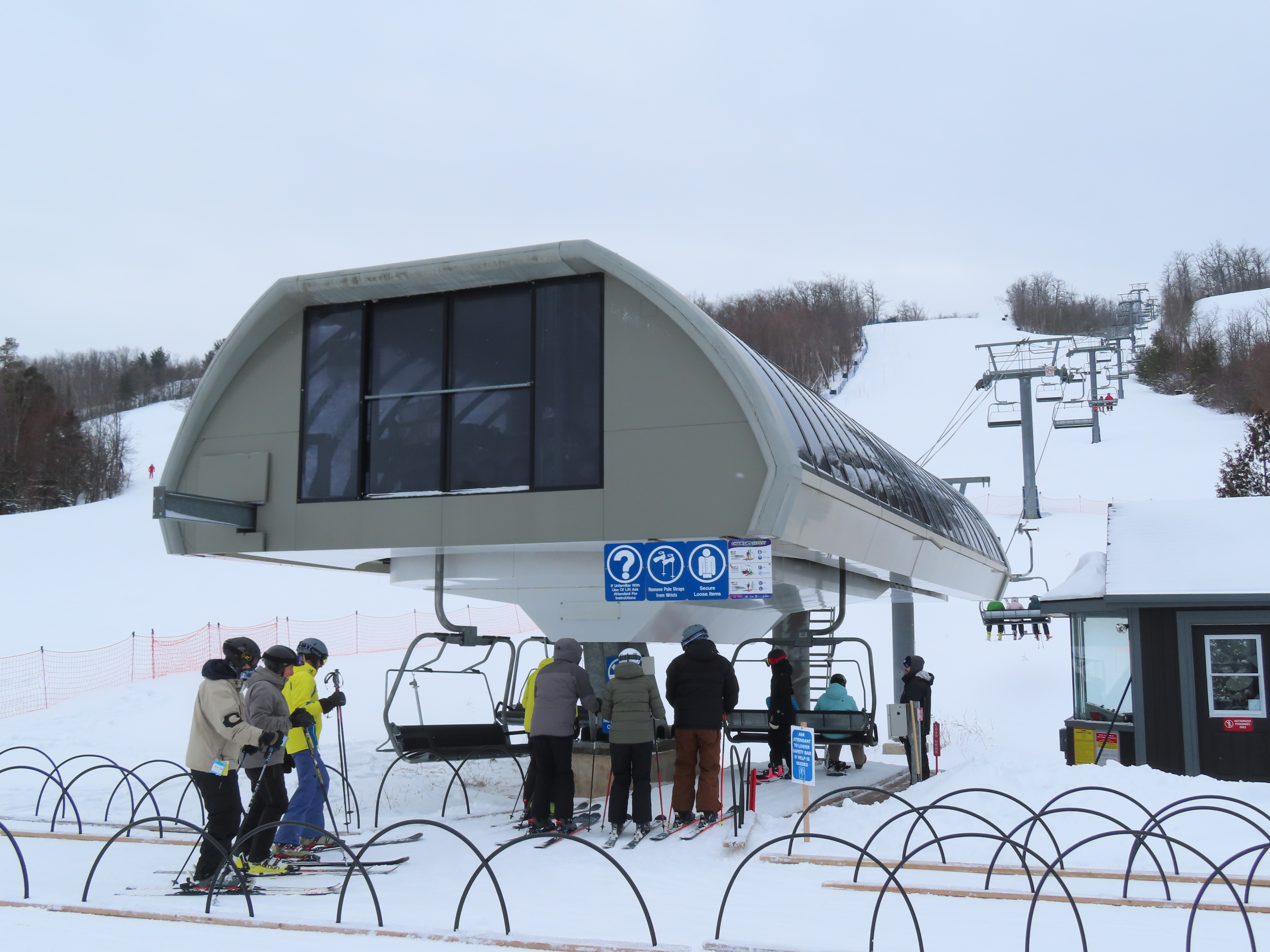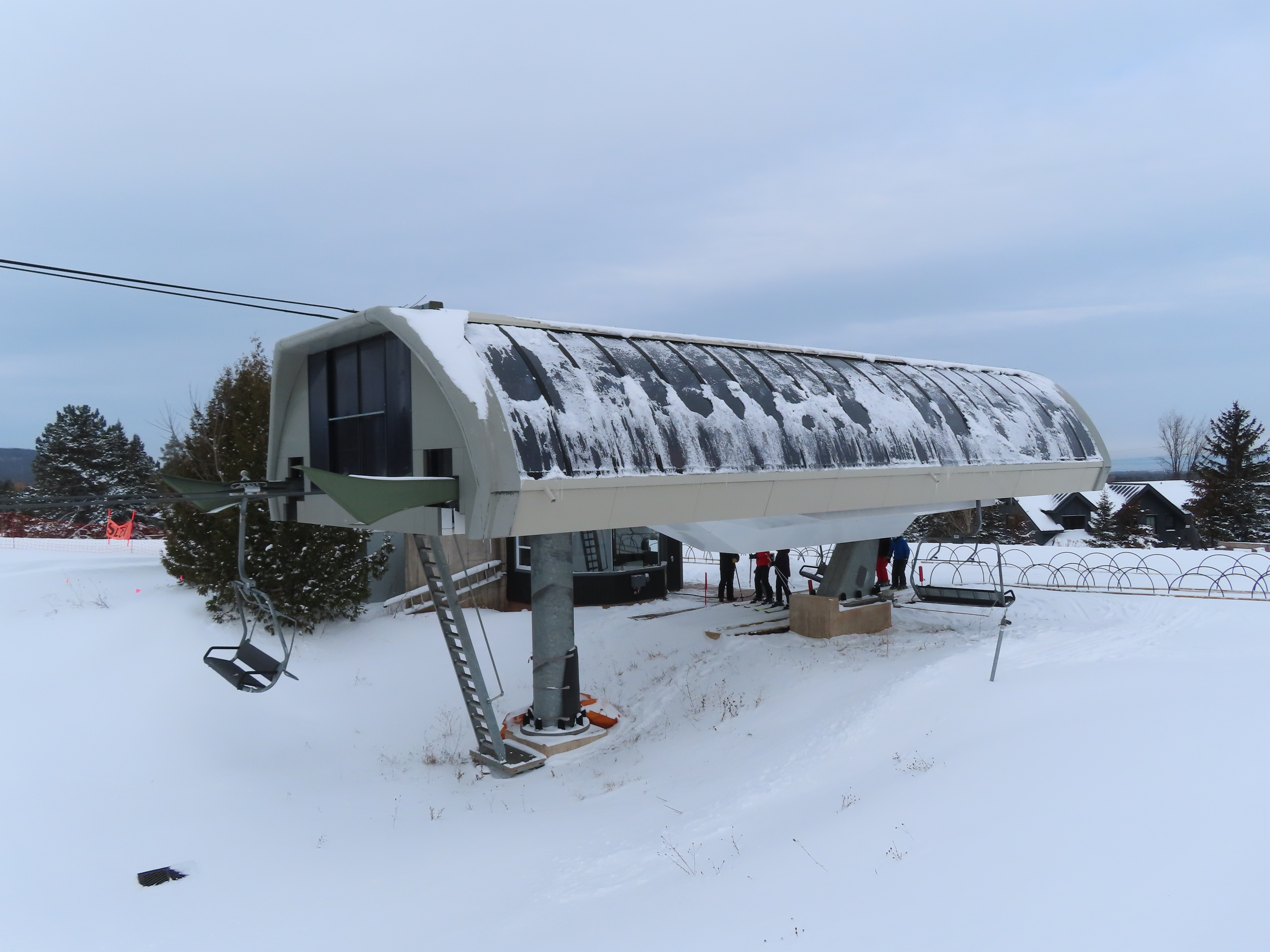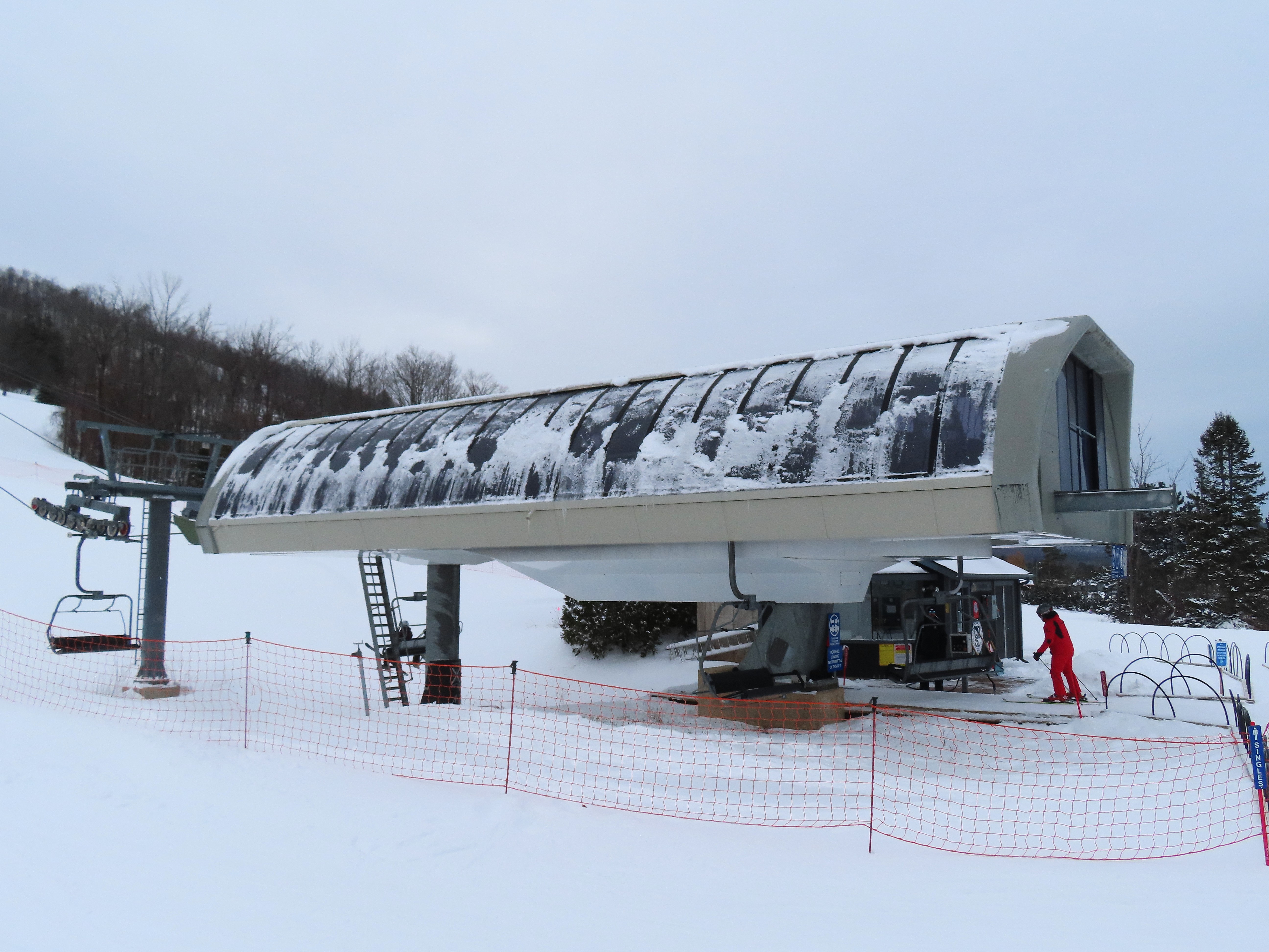 This UNI-G detachable services the Orchard pod.Side view of the drive station.View up the line from the base area.Tower 5.View back down the lower line.Middle section of the line.A convex section of the line.Tower 9.Hold down tower due to varied topography.Nearing the summit.Arriving at the return.Unloading area.Upper station overview.Another view of the top station.View from the summit.Looking down at tower 11.Tower 8.Lower lift line.Combination assemblies.Side view of the drive.Bottom station overview.Control cabinets in the bottom operator hut.Inside the drive-tension station.Connection between the motor and gearbox.Tension and brake pumps.Controls inside the drive terminal.Outside operator controls.
