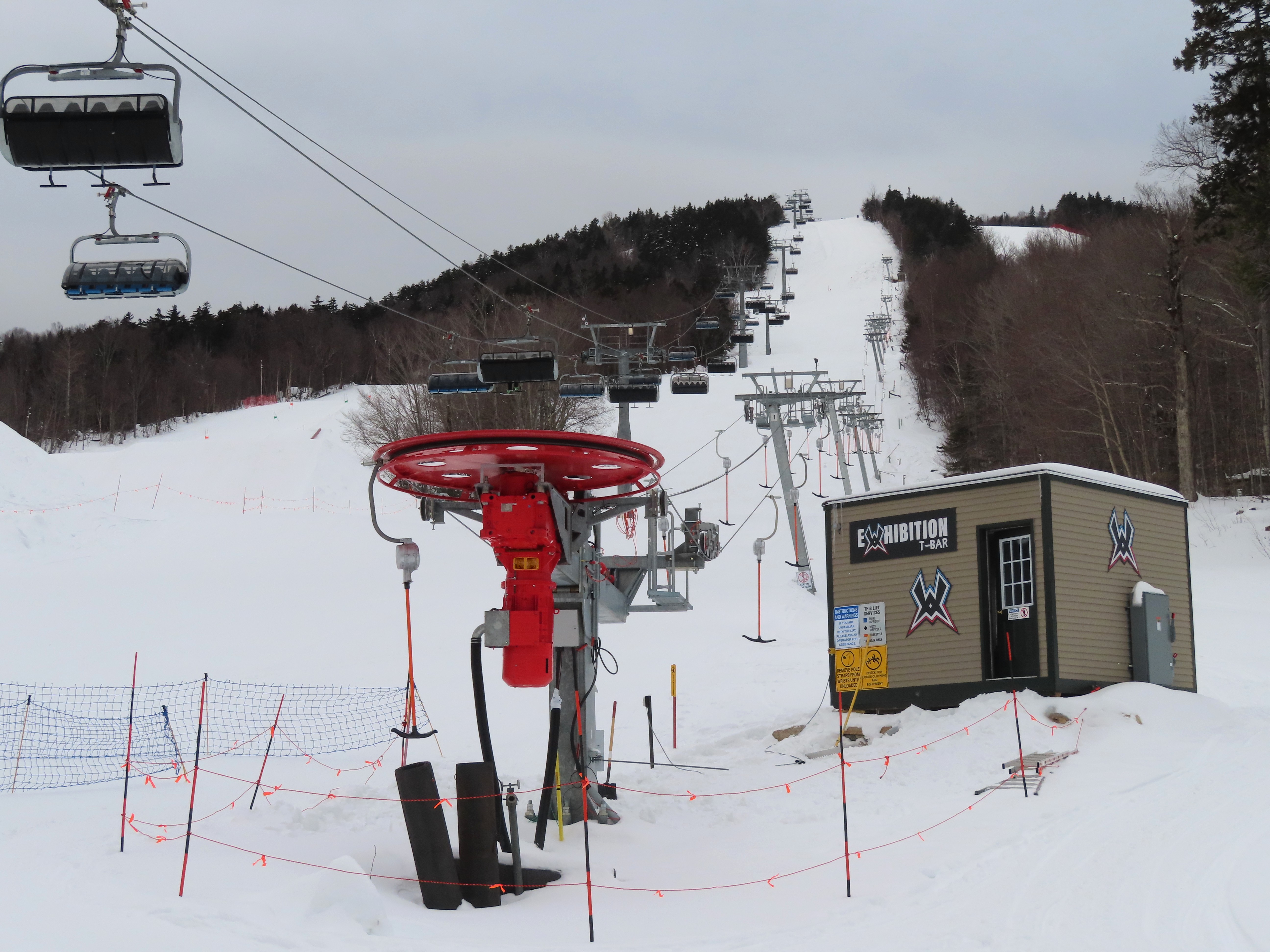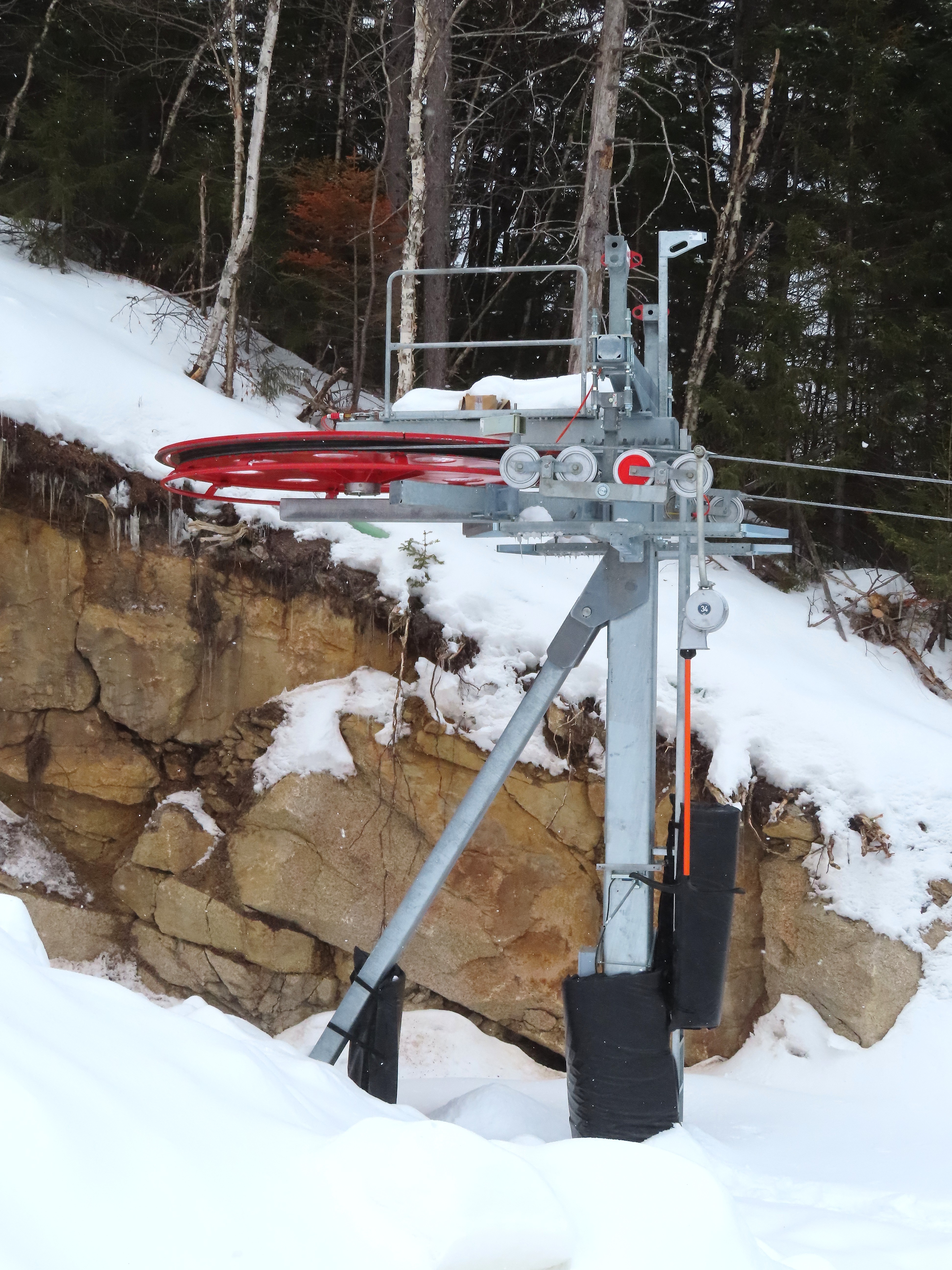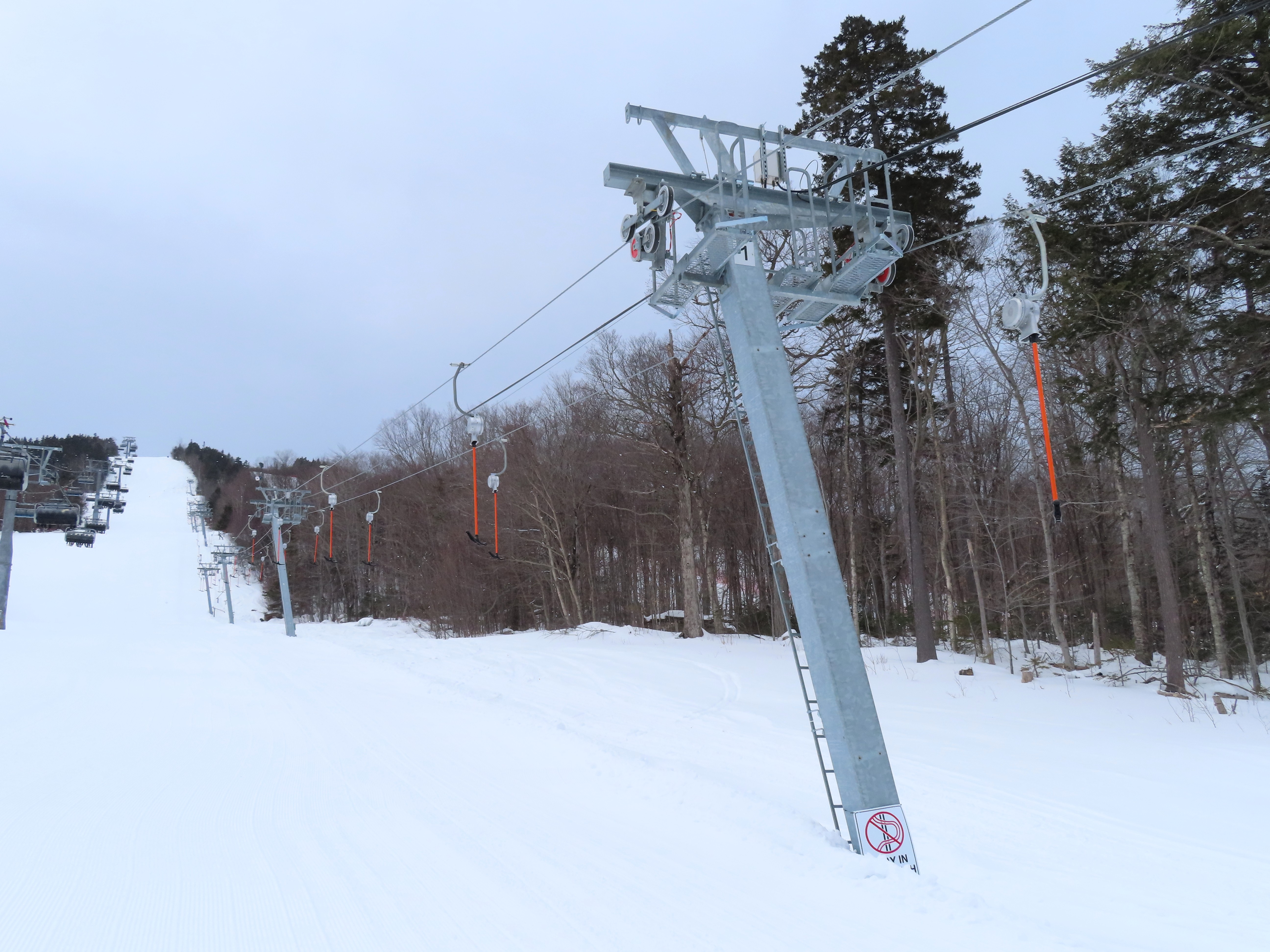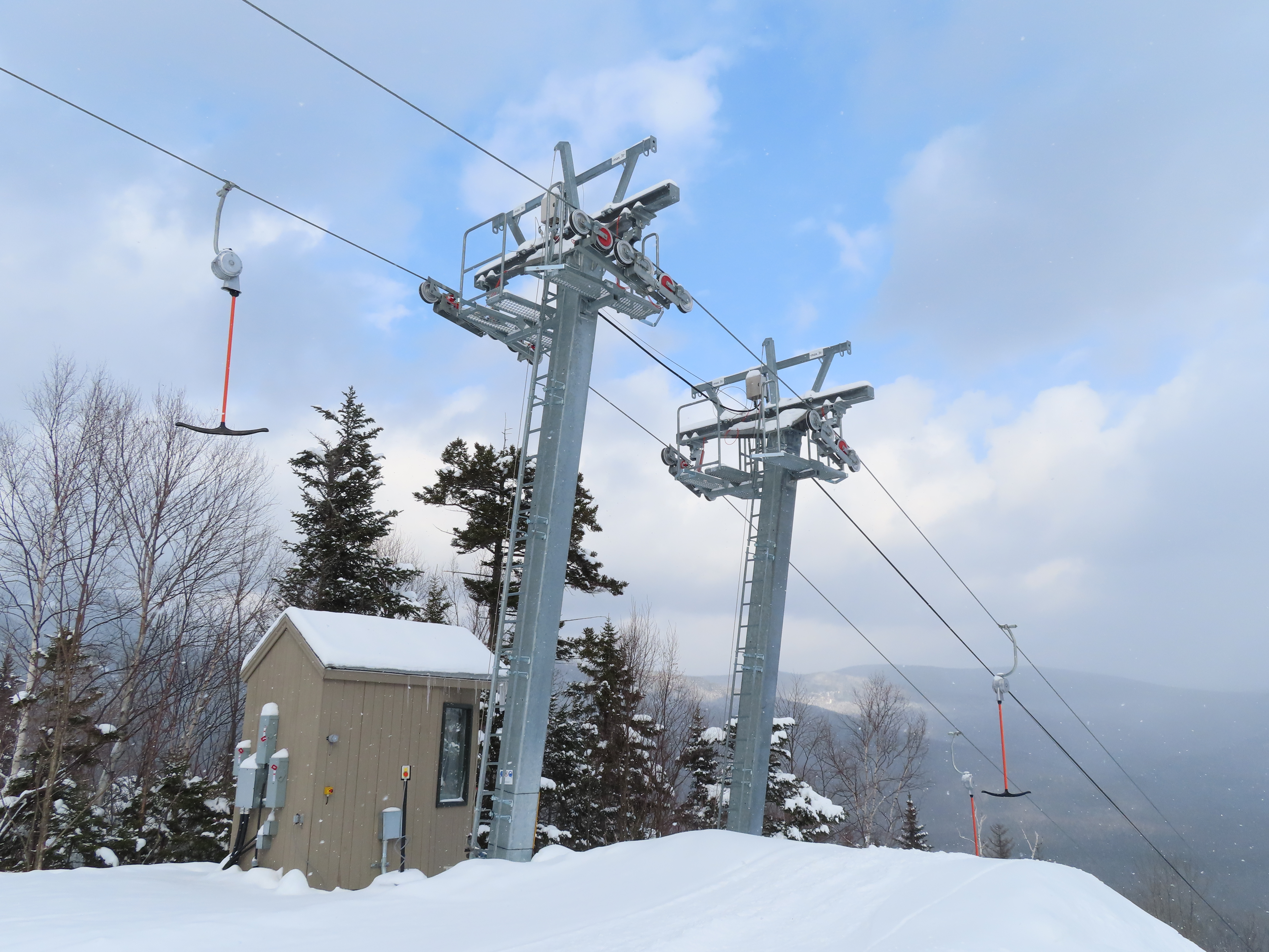This T-Bar serves several functions including night skiing, race training and a terrain park.It’s also the fifth MND lift at Waterville following another T-Bar, two conveyors and a detachable.The top terminal cut into a hillside.Breakover towers 10 and 11.Bottom terminal just above the base lodge.Side view of the drive terminal.The alignment parallels sister MND lift Tecumseh Express.Upper station overview.Side view of the top return terminal.View down the middle part of the line.Angled tower 6.Steep section of the line.The first few towers.T1.T-Bars.Lift overview.
