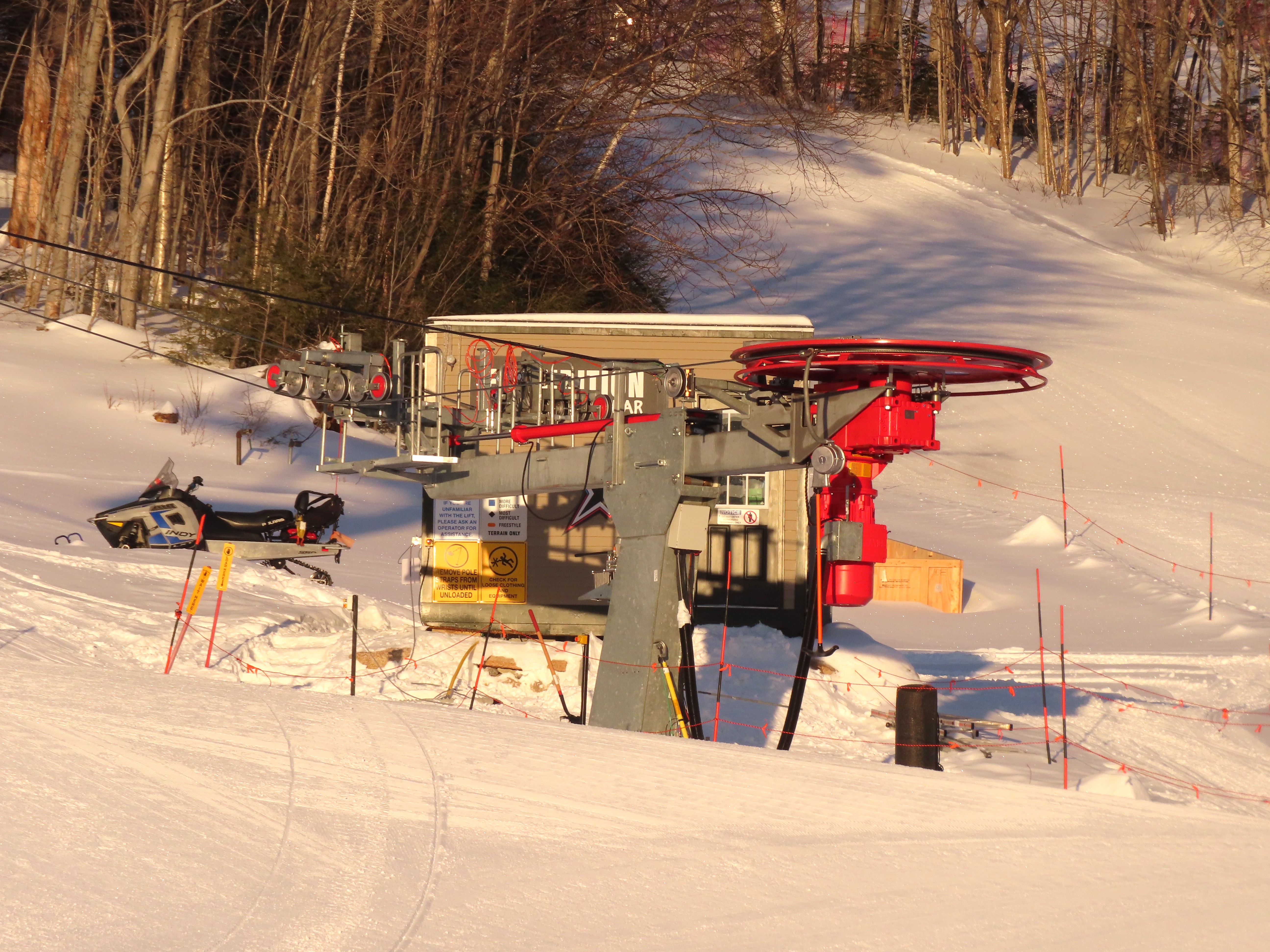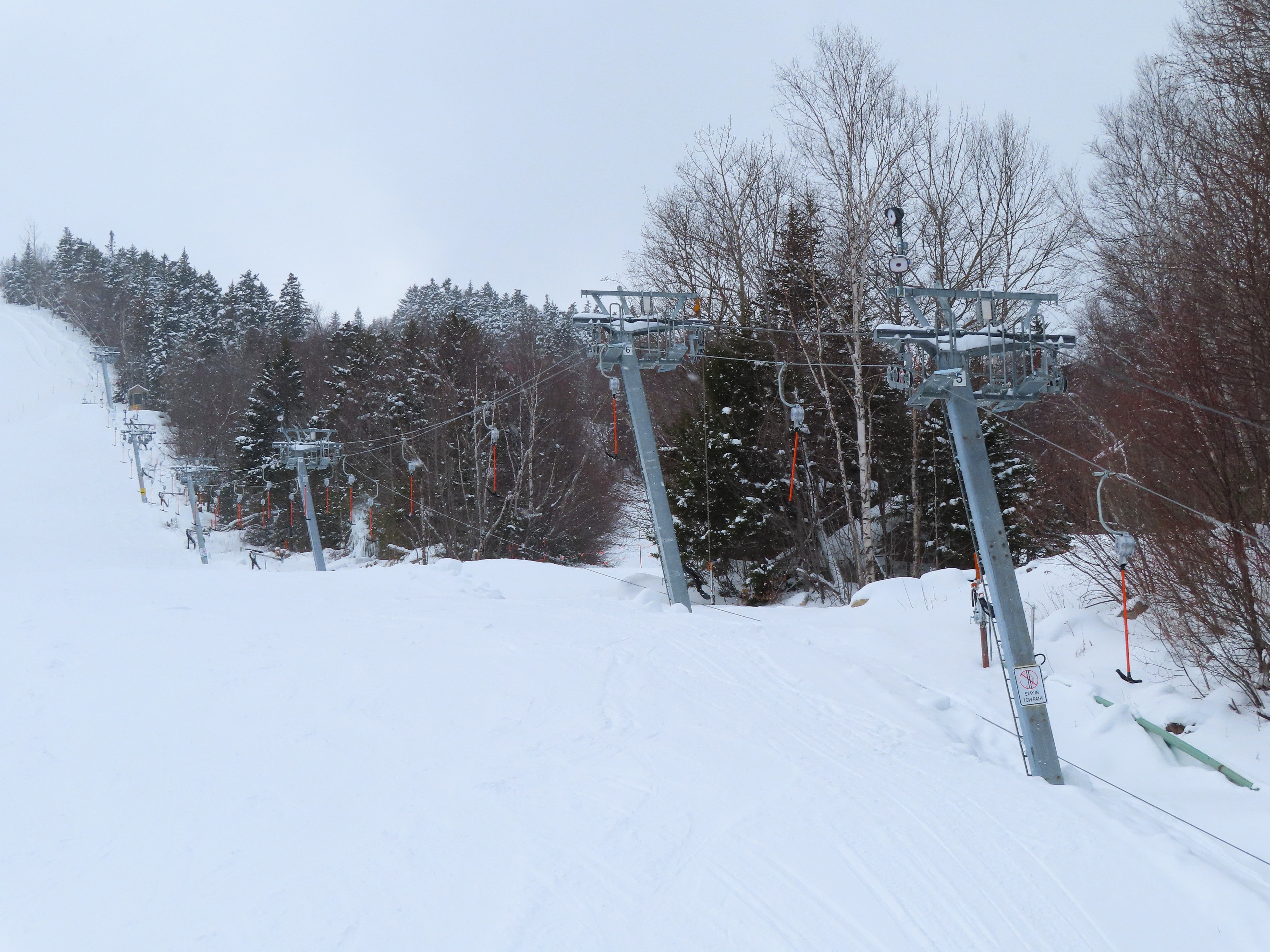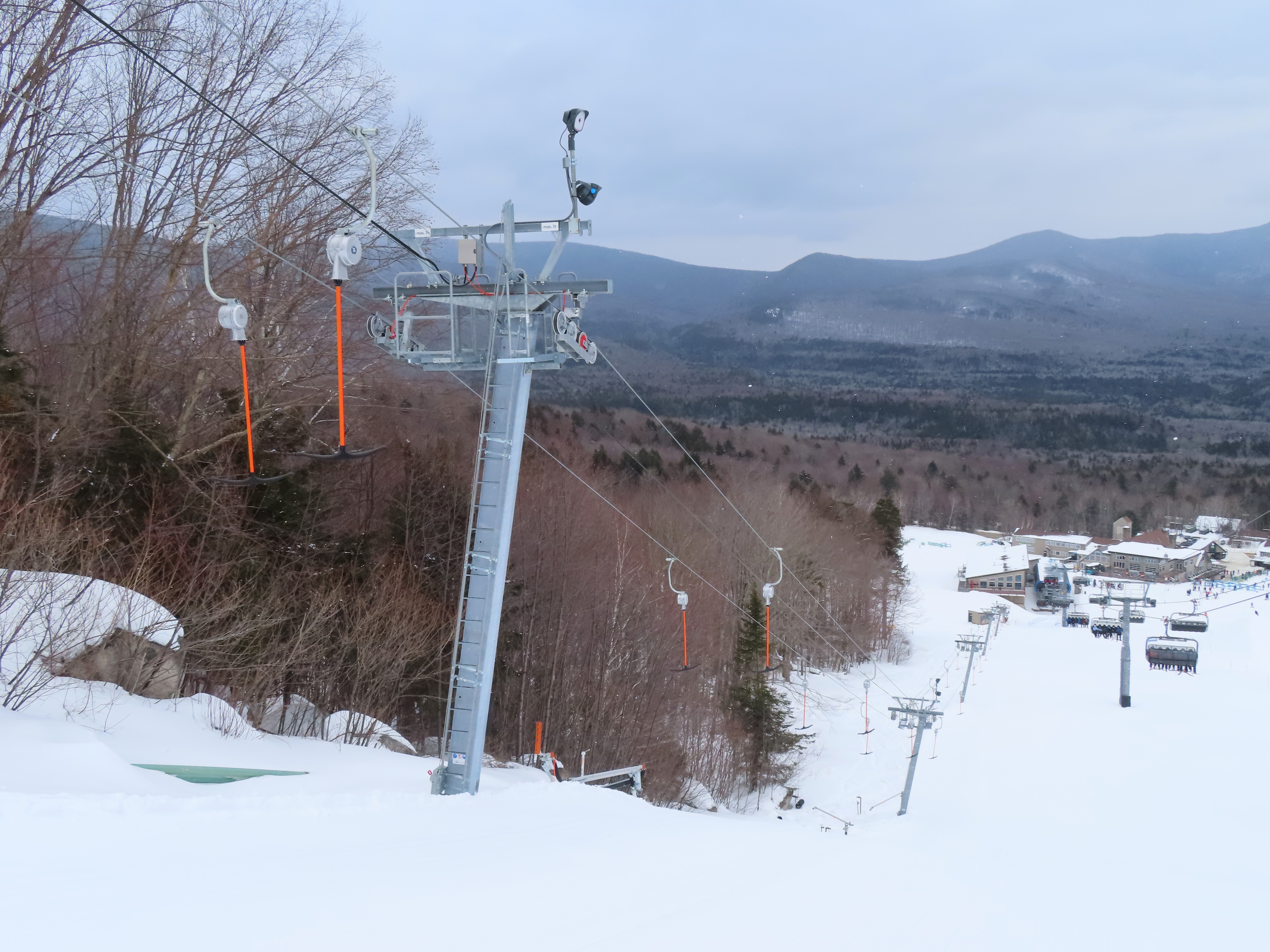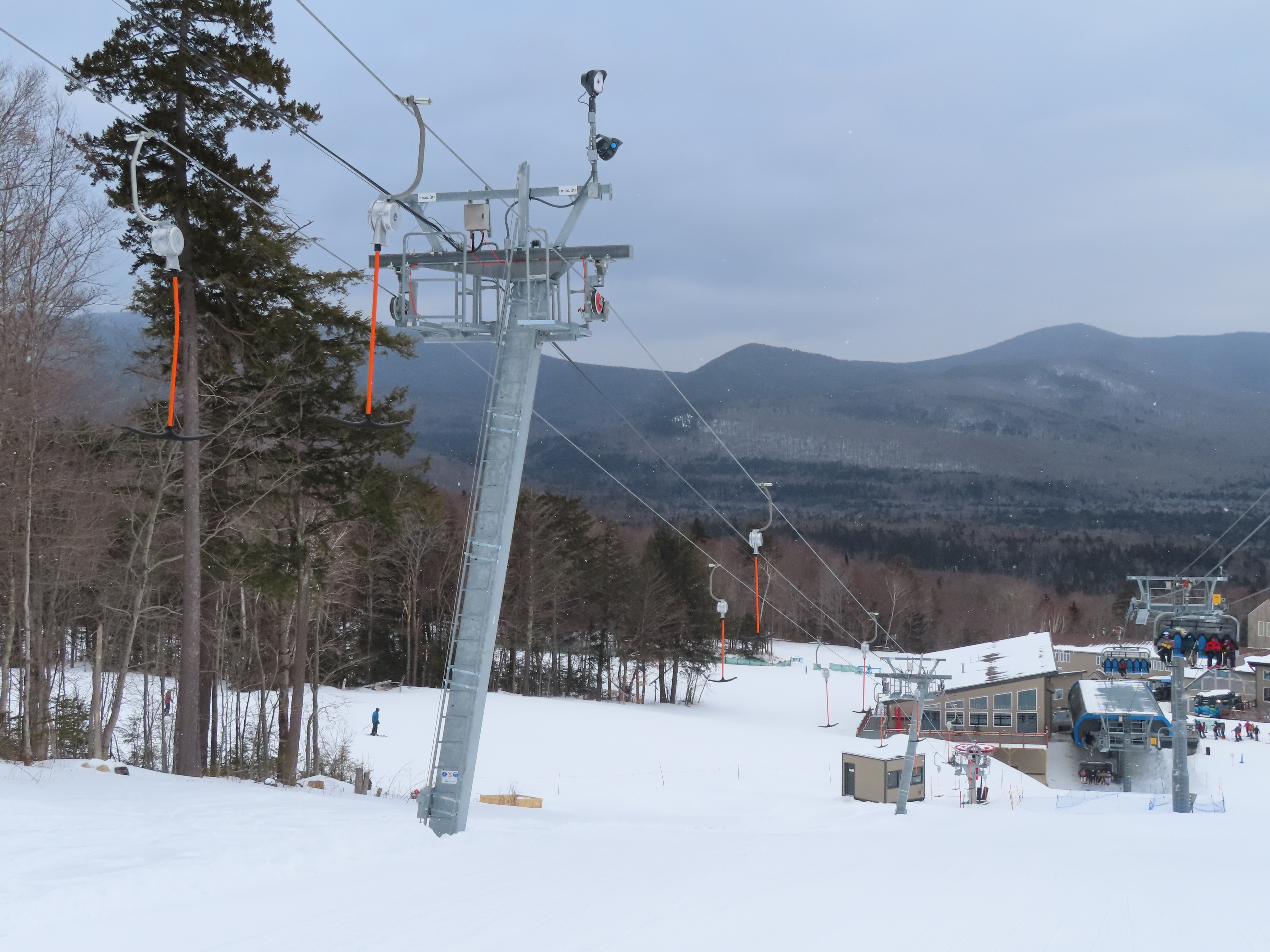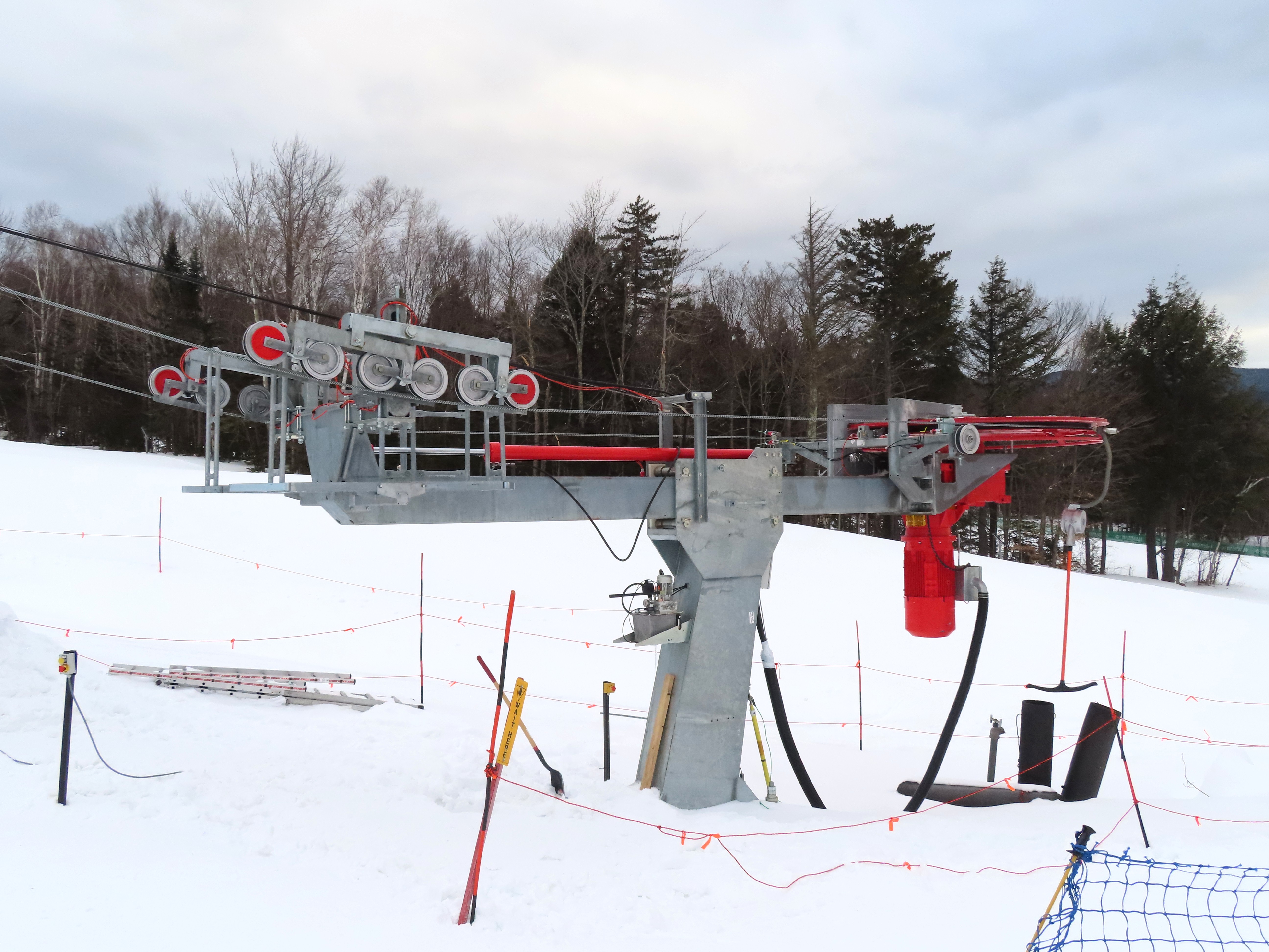 This T-Bar serves several functions including night skiing, race training and a terrain park.It’s also the fifth MND lift at Waterville following another T-Bar, two conveyors and a detachable.The top terminal cut into a hillside.Breakover towers 10 and 11.Bottom terminal just above the base lodge.Side view of the drive terminal.The alignment parallels sister MND lift Tecumseh Express.Upper station overview.Side view of the top return terminal.View down the middle part of the line.Angled tower 6.Steep section of the line.The first few towers.T1.T-Bars.Lift overview.