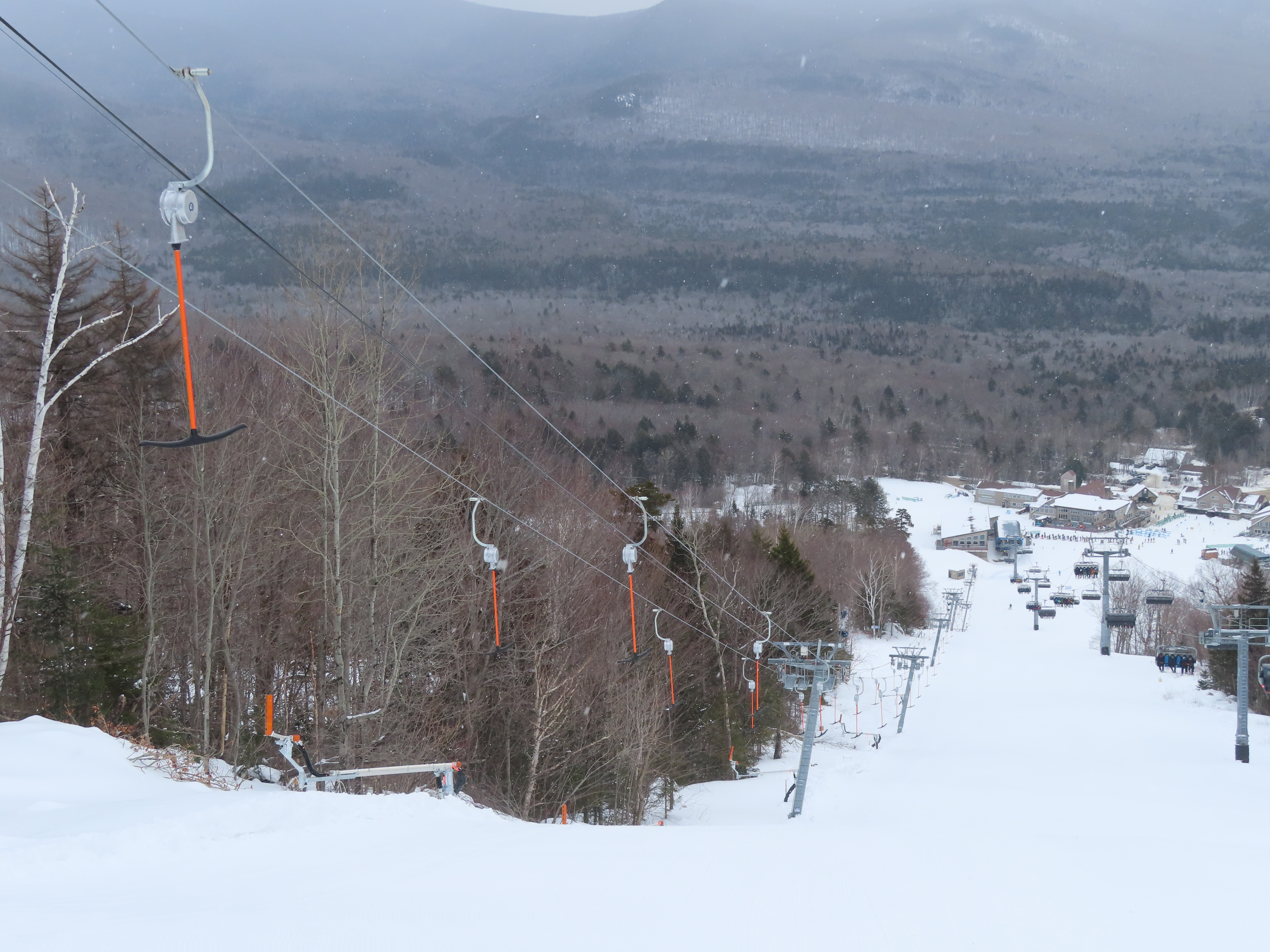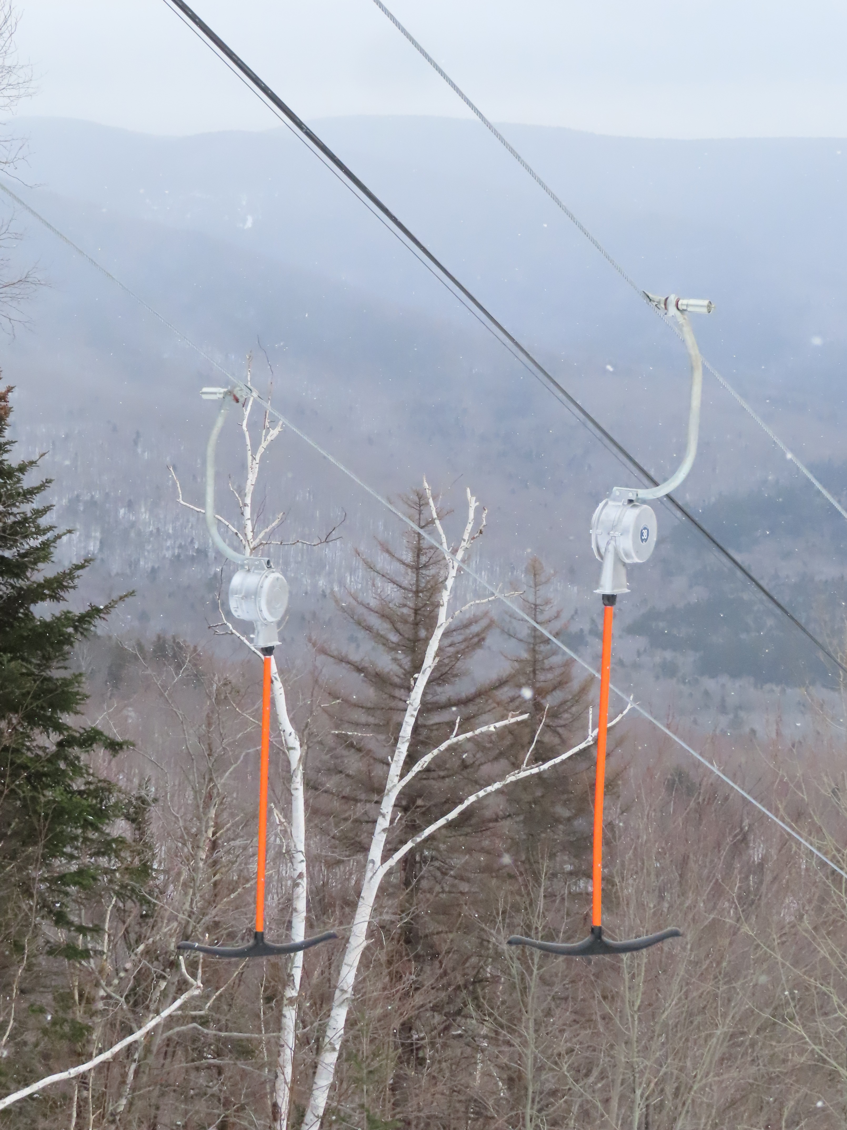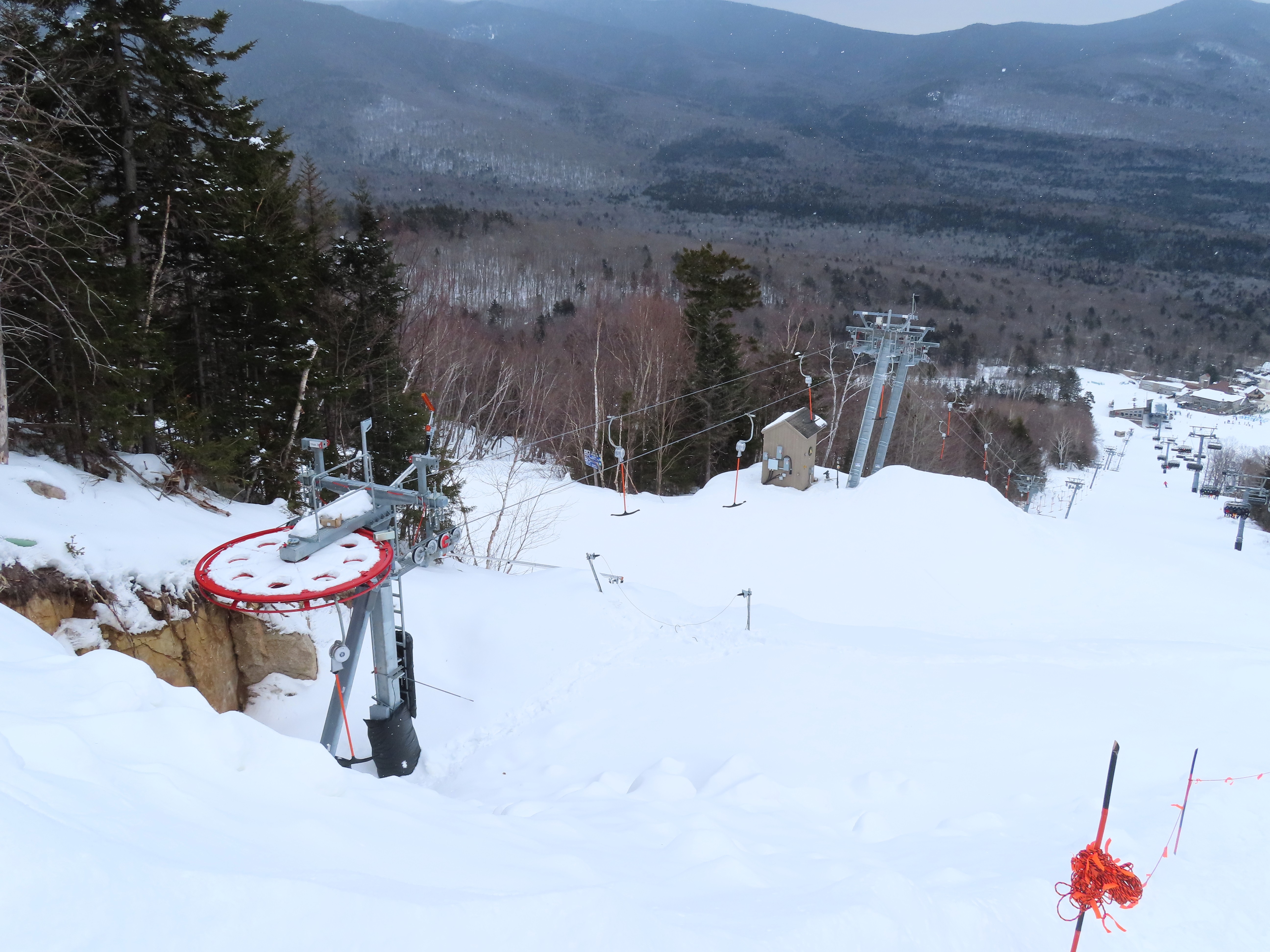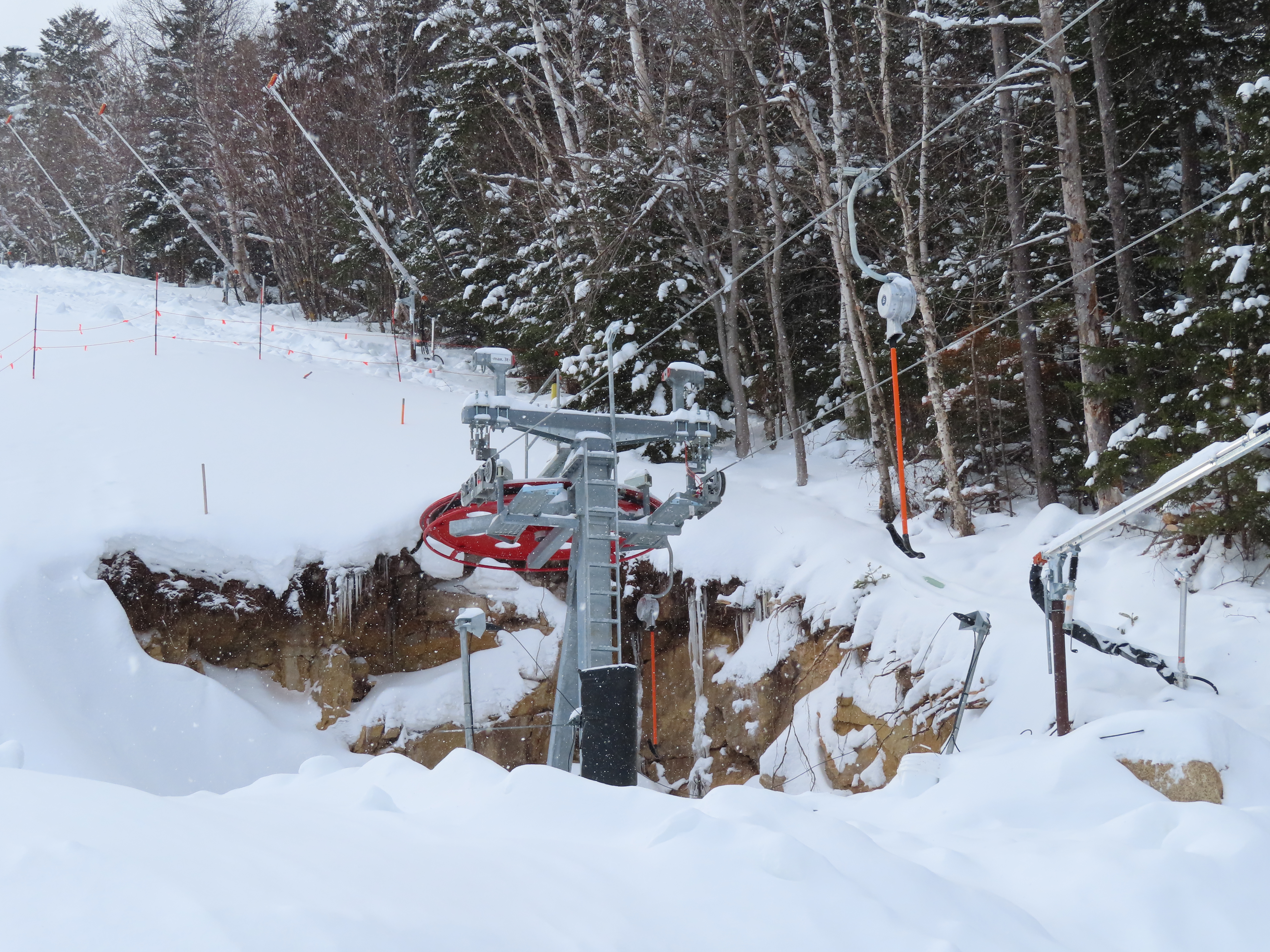 This T-Bar serves several functions including night skiing, race training and a terrain park.It’s also the fifth MND lift at Waterville following another T-Bar, two conveyors and a detachable.The top terminal cut into a hillside.Breakover towers 10 and 11.Bottom terminal just above the base lodge.Side view of the drive terminal.The alignment parallels sister MND lift Tecumseh Express.Upper station overview.Side view of the top return terminal.View down the middle part of the line.Angled tower 6.Steep section of the line.The first few towers.T1.T-Bars.Lift overview.