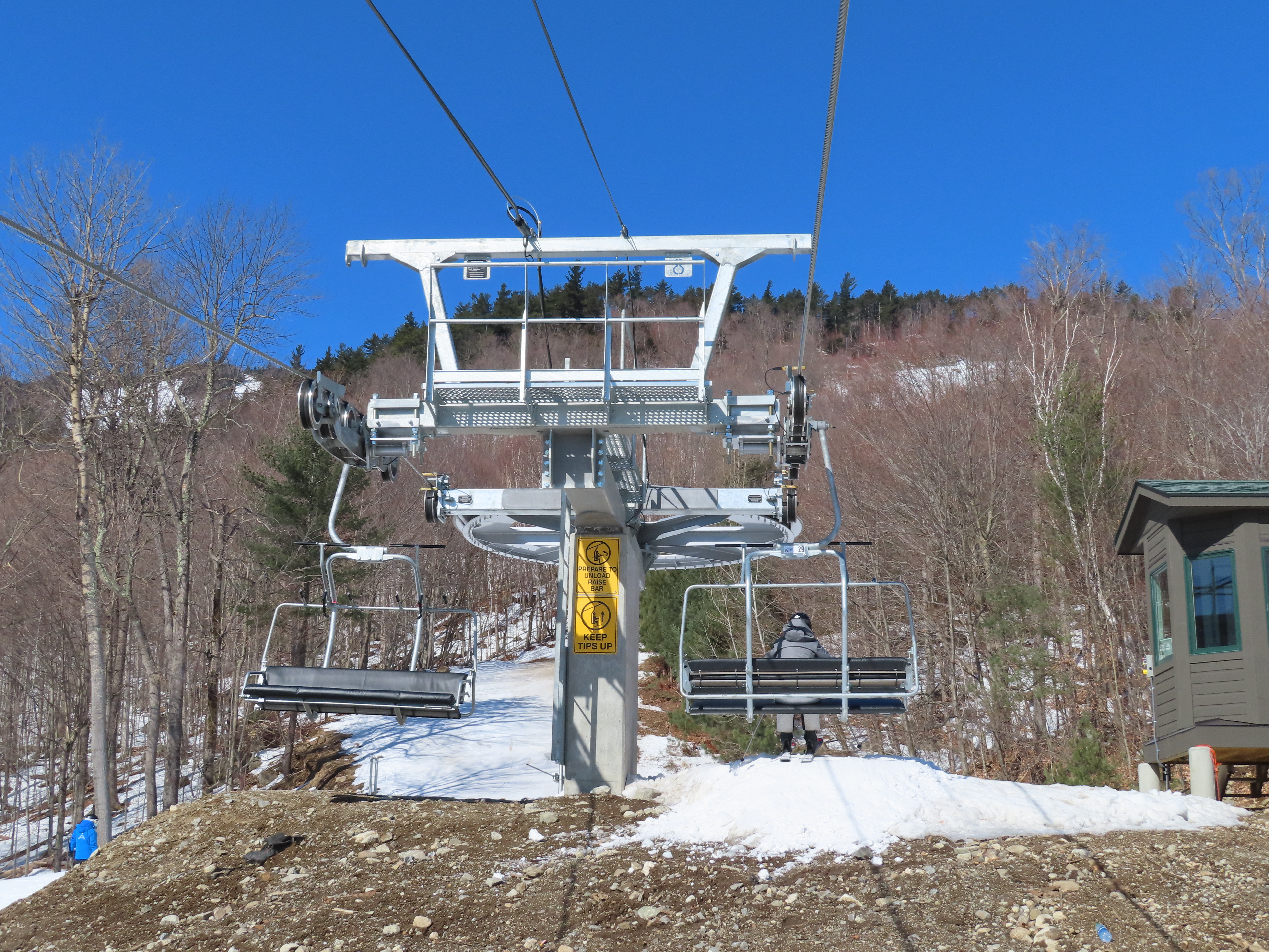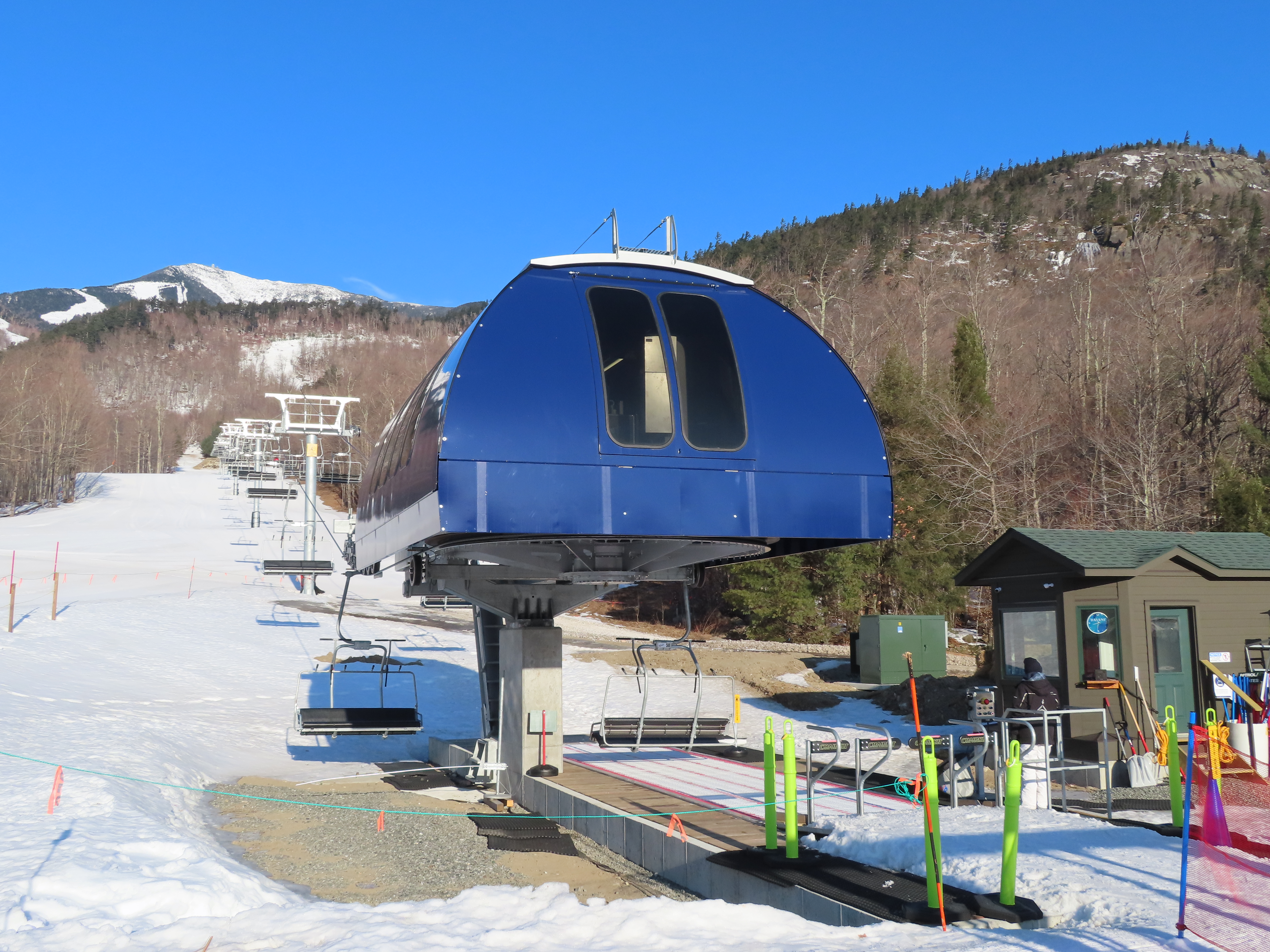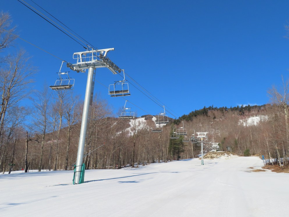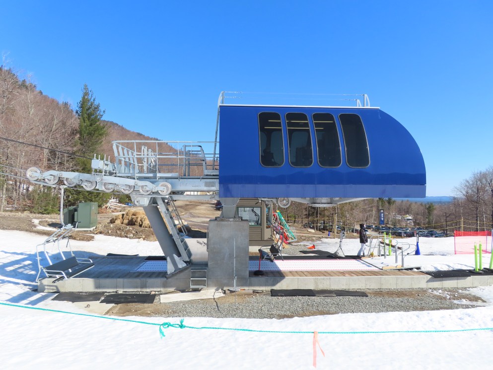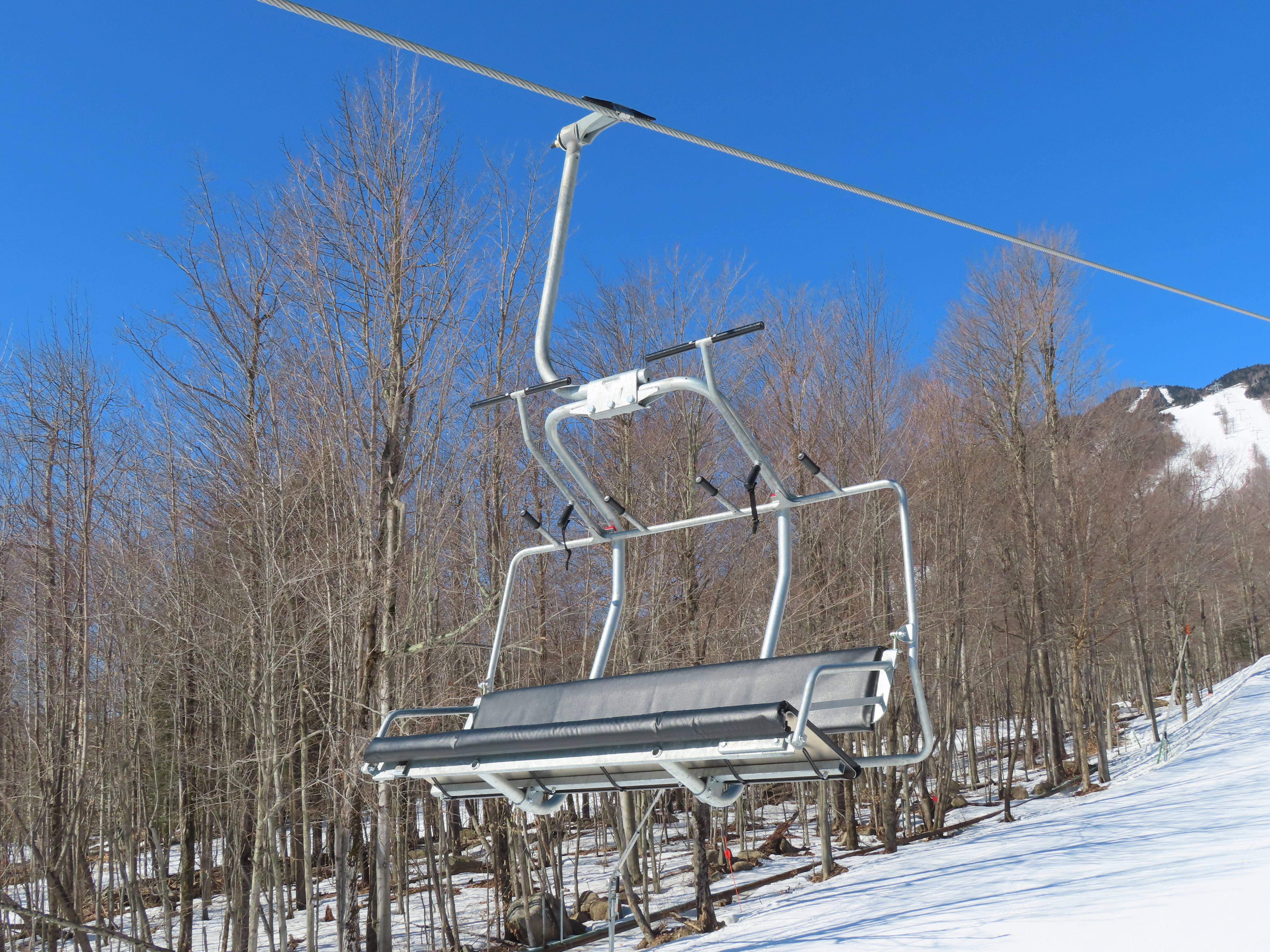 This carpet load fixed quad replaced a Riblet triple in 2020.Monarch drive station.Lift overview.View up the lift line.The last two towers.Most of the lift seen from the Wilmington trail.Side view of the upper terminal.View down the line.Tower 4.Upper half of the line.Chairkit loading conveyor.Side view of the drive station.Skytrac quad chair with foot rests.Riding up the line.Arriving at the summit.Top bullwheel.Another view of the bottom station.