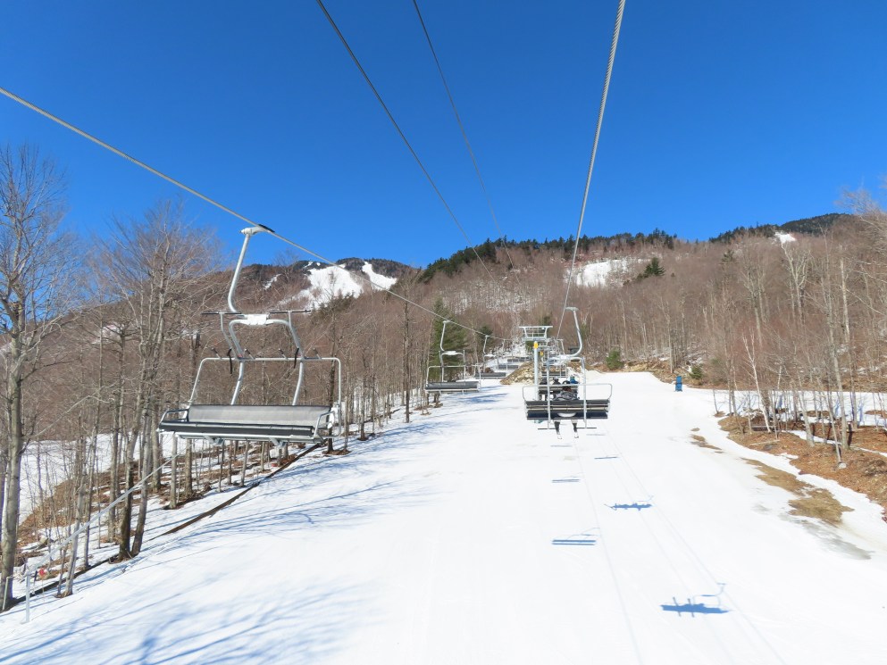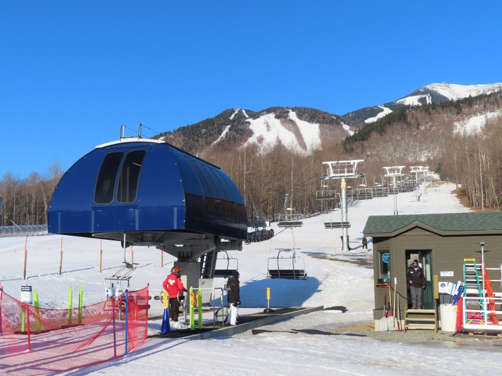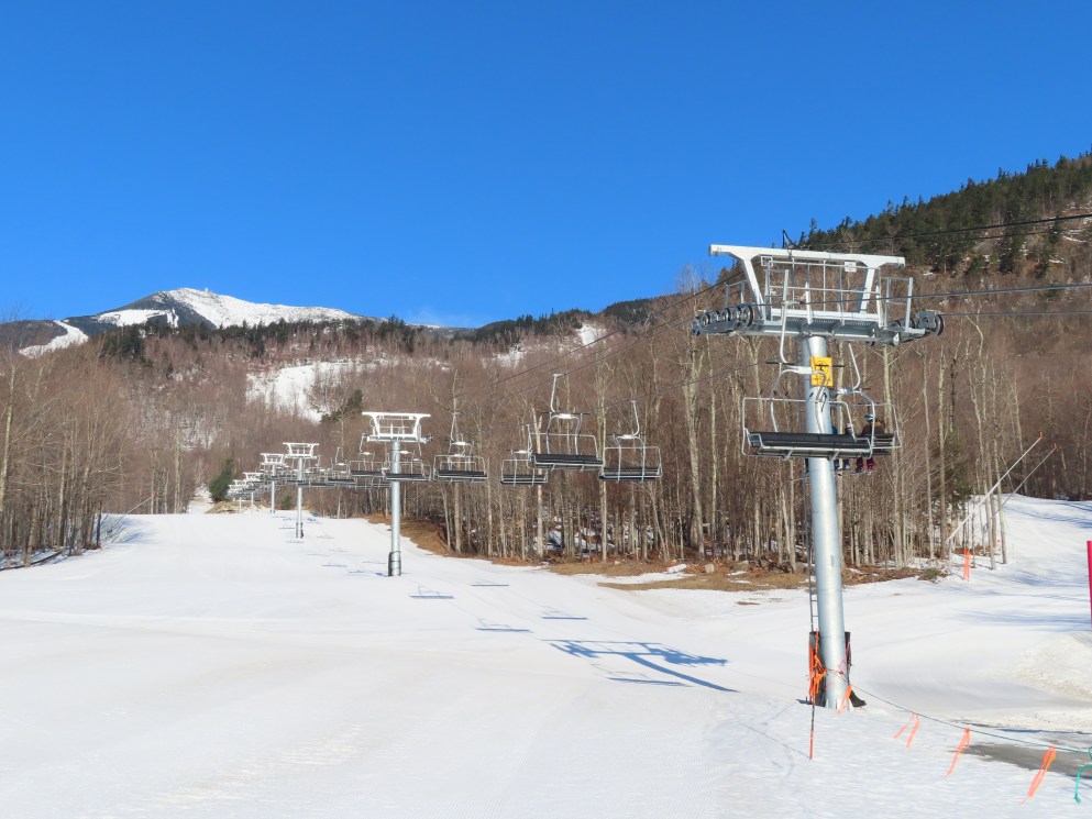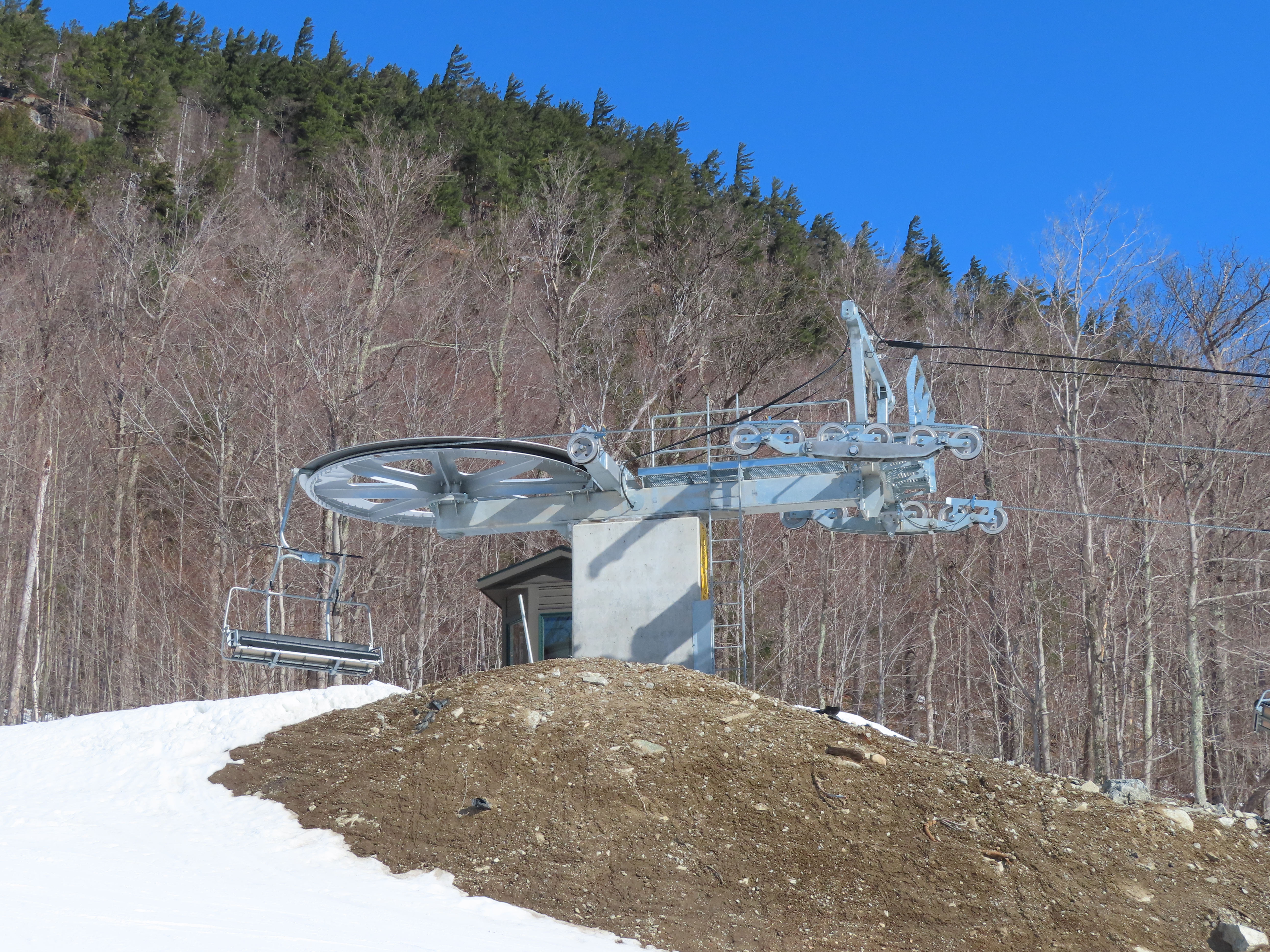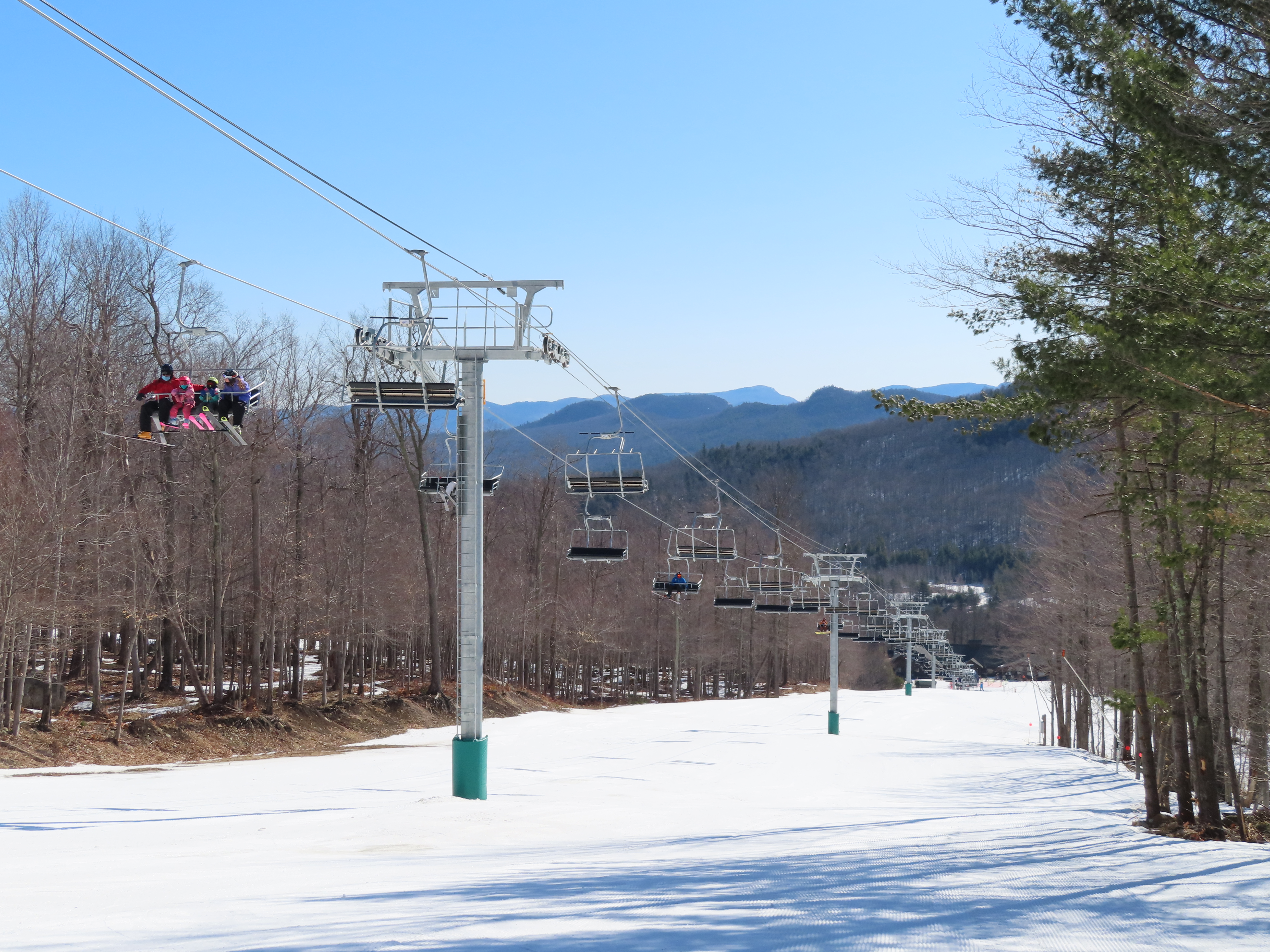 This carpet load fixed quad replaced a Riblet triple in 2020.Monarch drive station.Lift overview.View up the lift line.The last two towers.Most of the lift seen from the Wilmington trail.Side view of the upper terminal.View down the line.Tower 4.Upper half of the line.Chairkit loading conveyor.Side view of the drive station.Skytrac quad chair with foot rests.Riding up the line.Arriving at the summit.Top bullwheel.Another view of the bottom station.