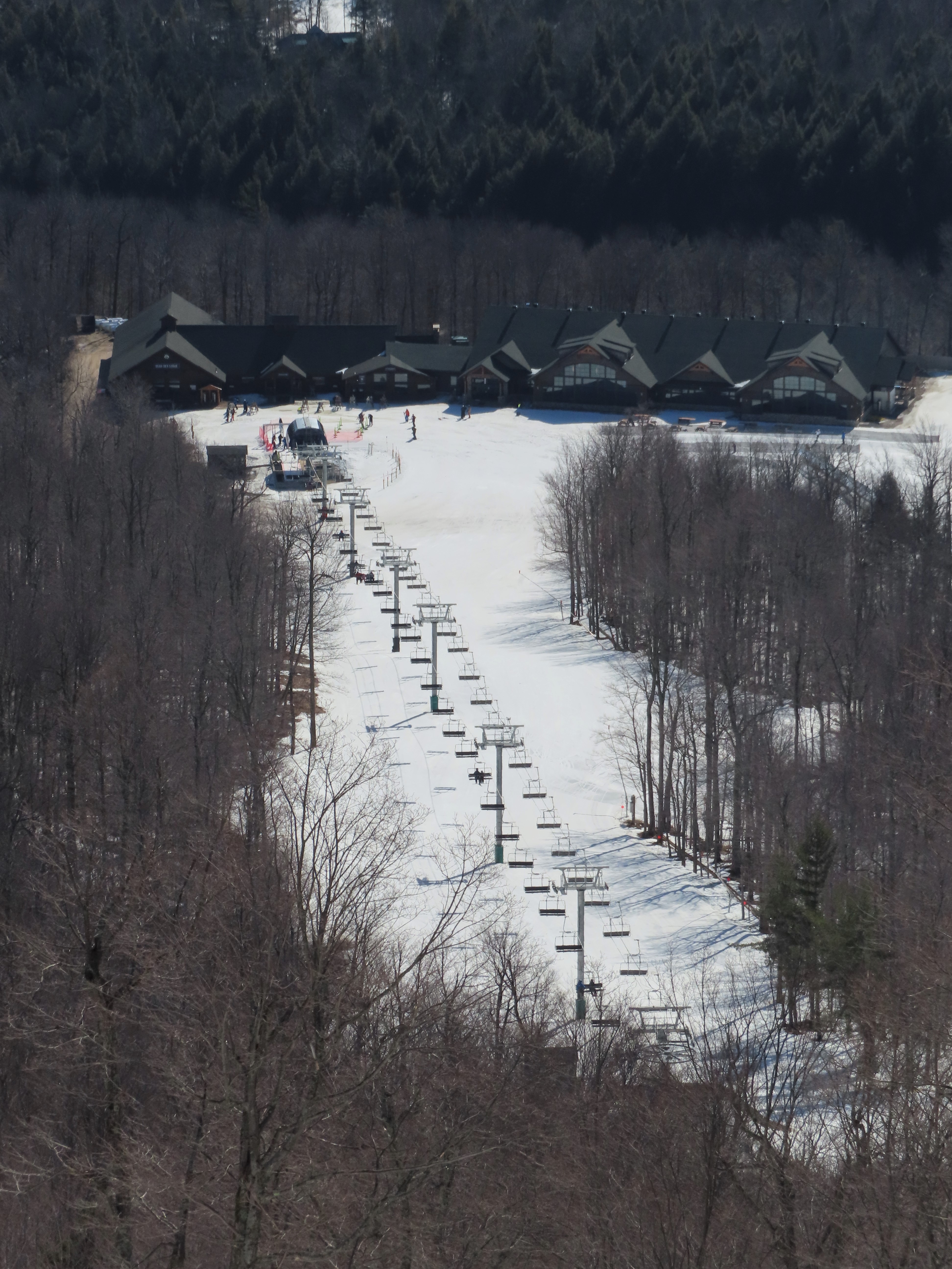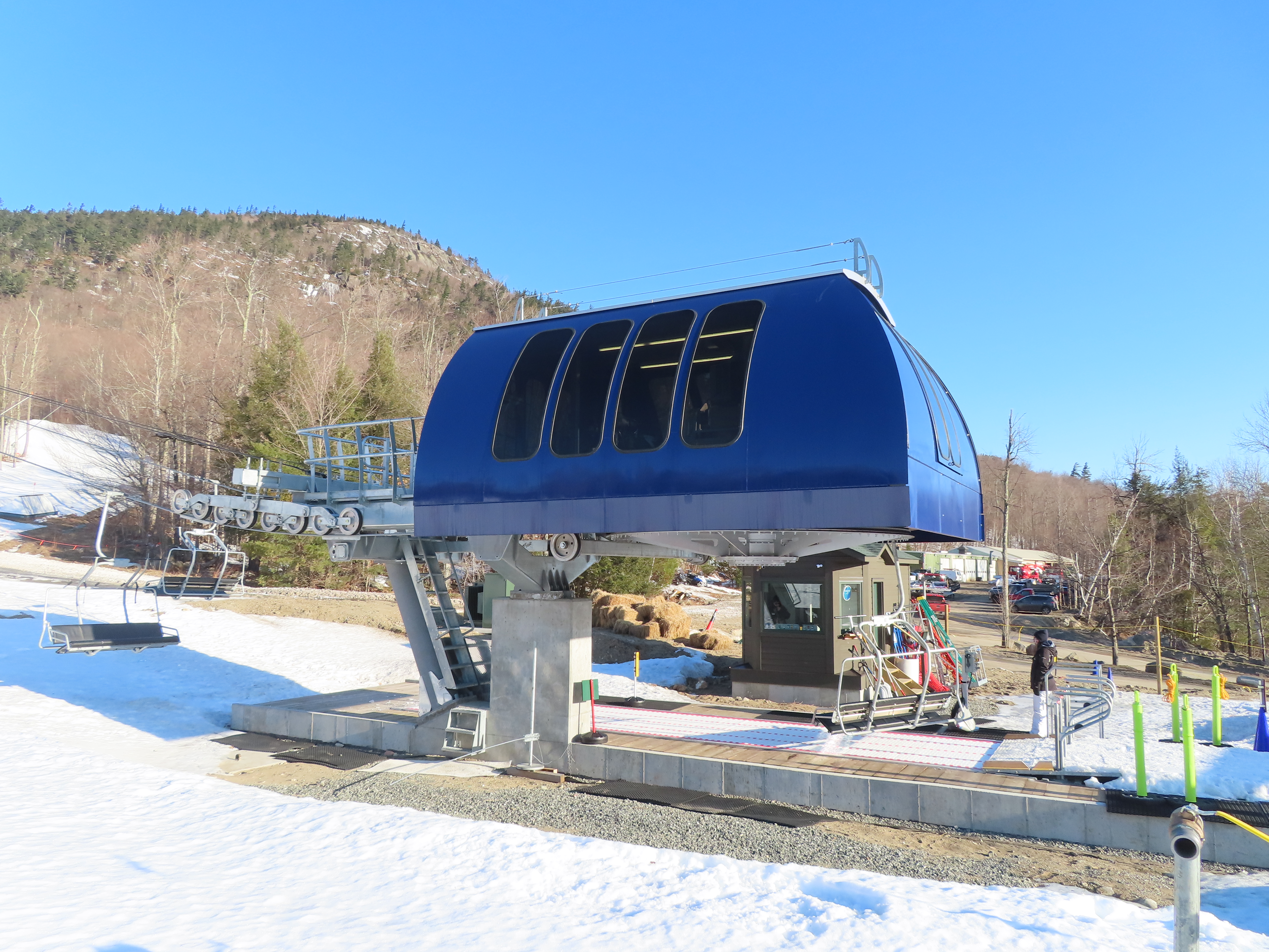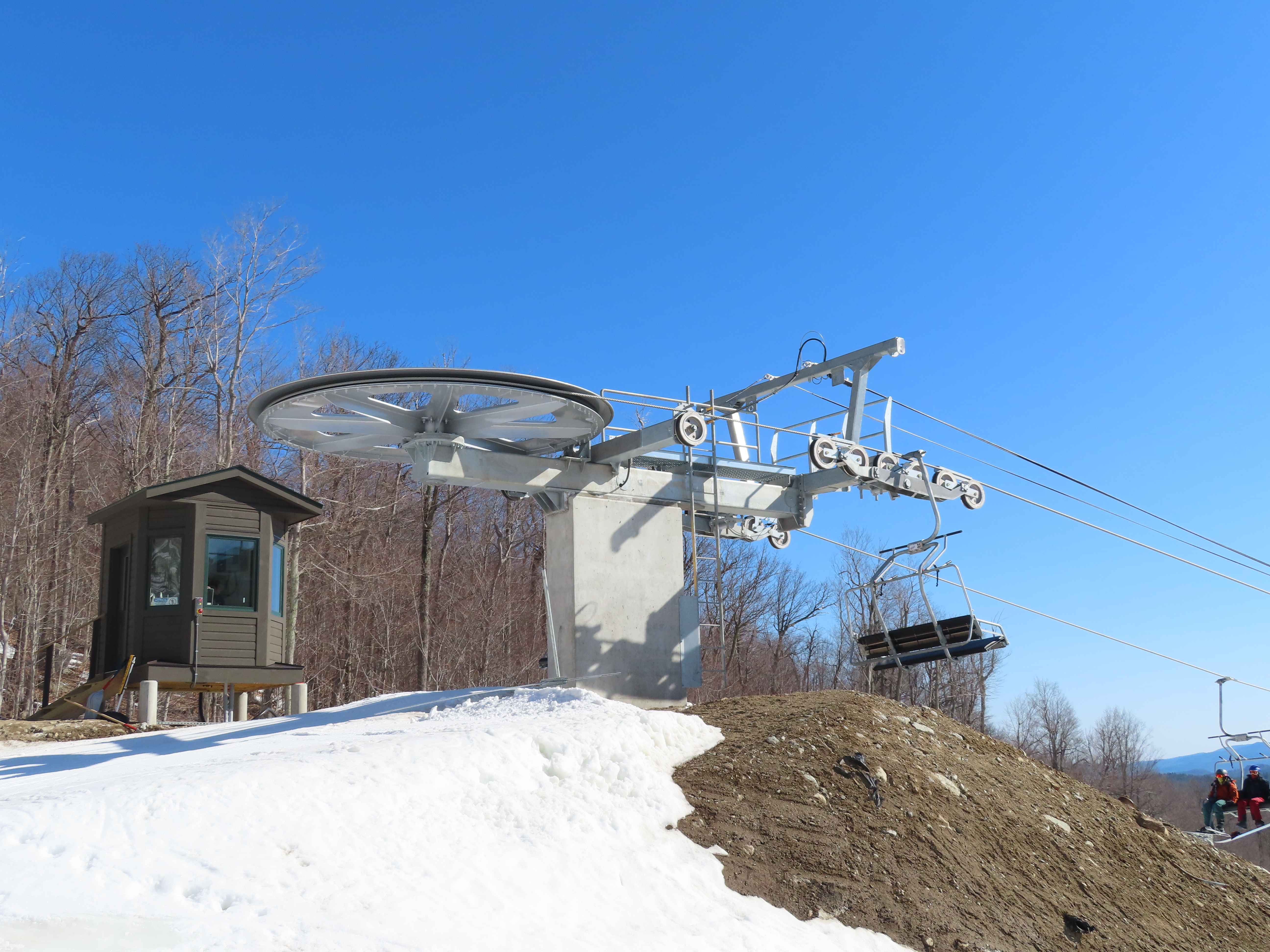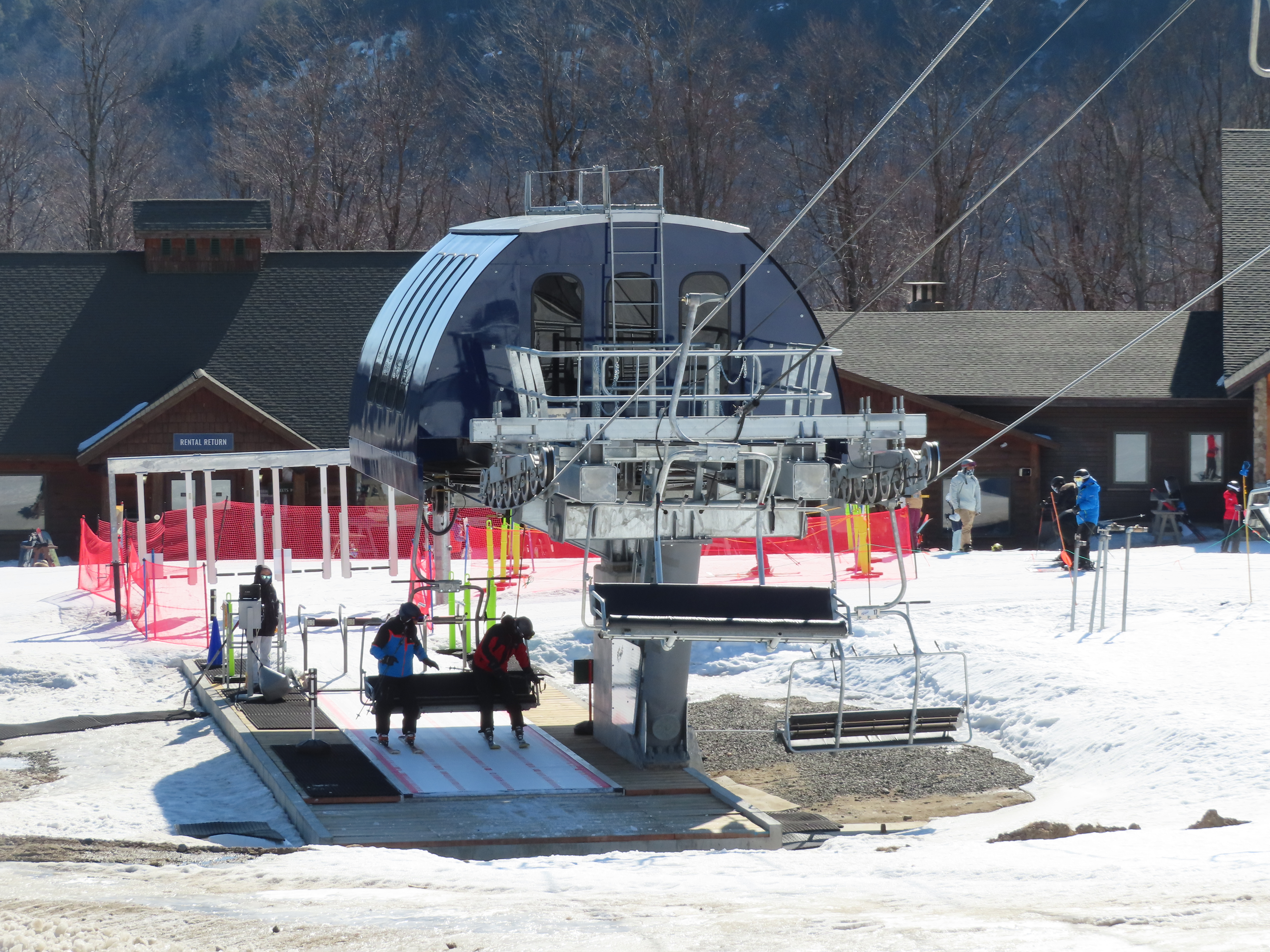 This carpet load fixed quad replaced a Riblet triple in 2020.Monarch drive station.Lift overview.View up the lift line.The last two towers.Most of the lift seen from the Wilmington trail.Side view of the upper terminal.View down the line.Tower 4.Upper half of the line.Chairkit loading conveyor.Side view of the drive station.Skytrac quad chair with foot rests.Riding up the line.Arriving at the summit.Top bullwheel.Another view of the bottom station.