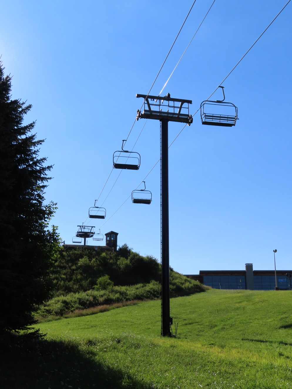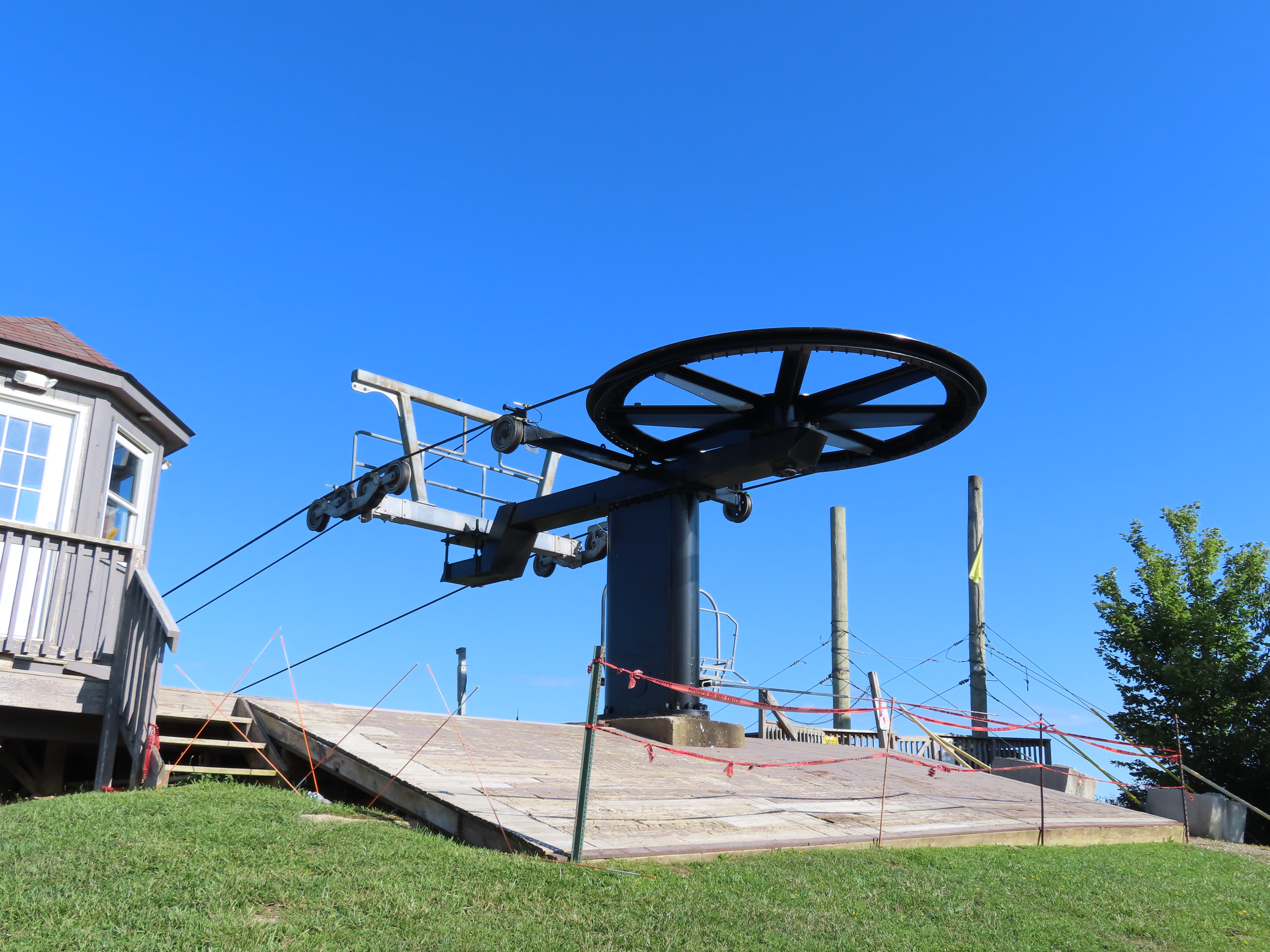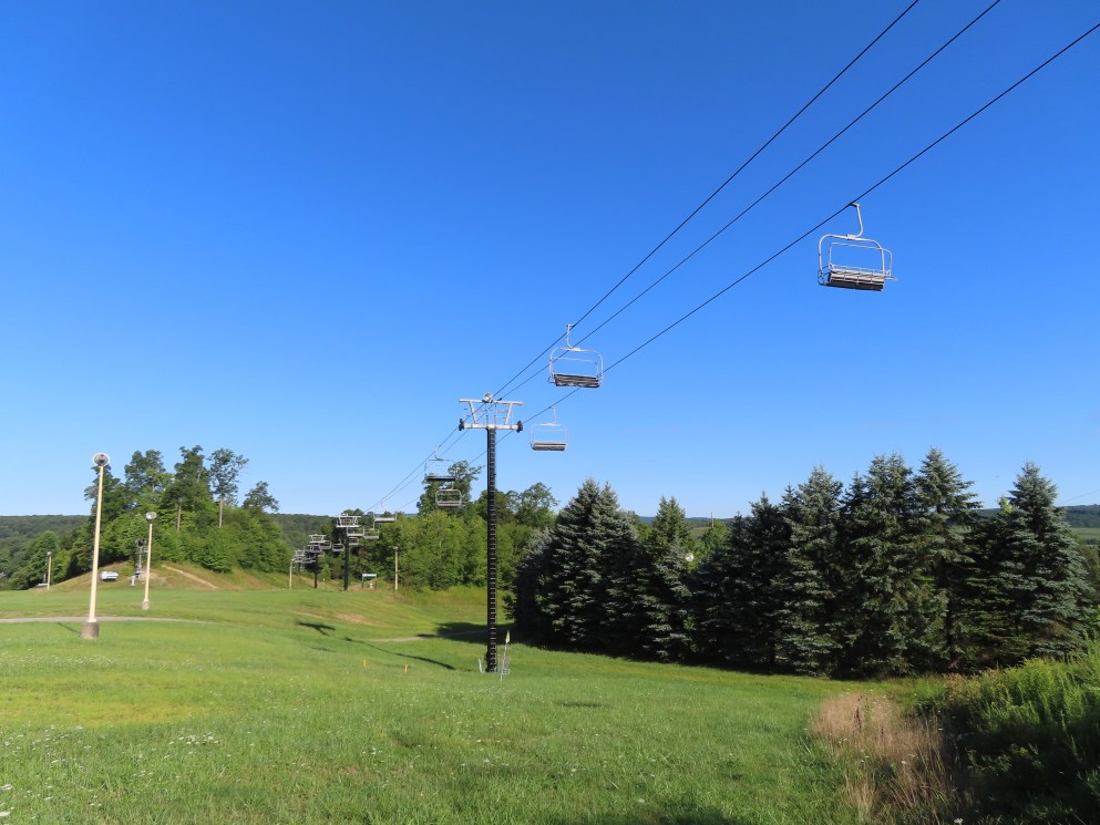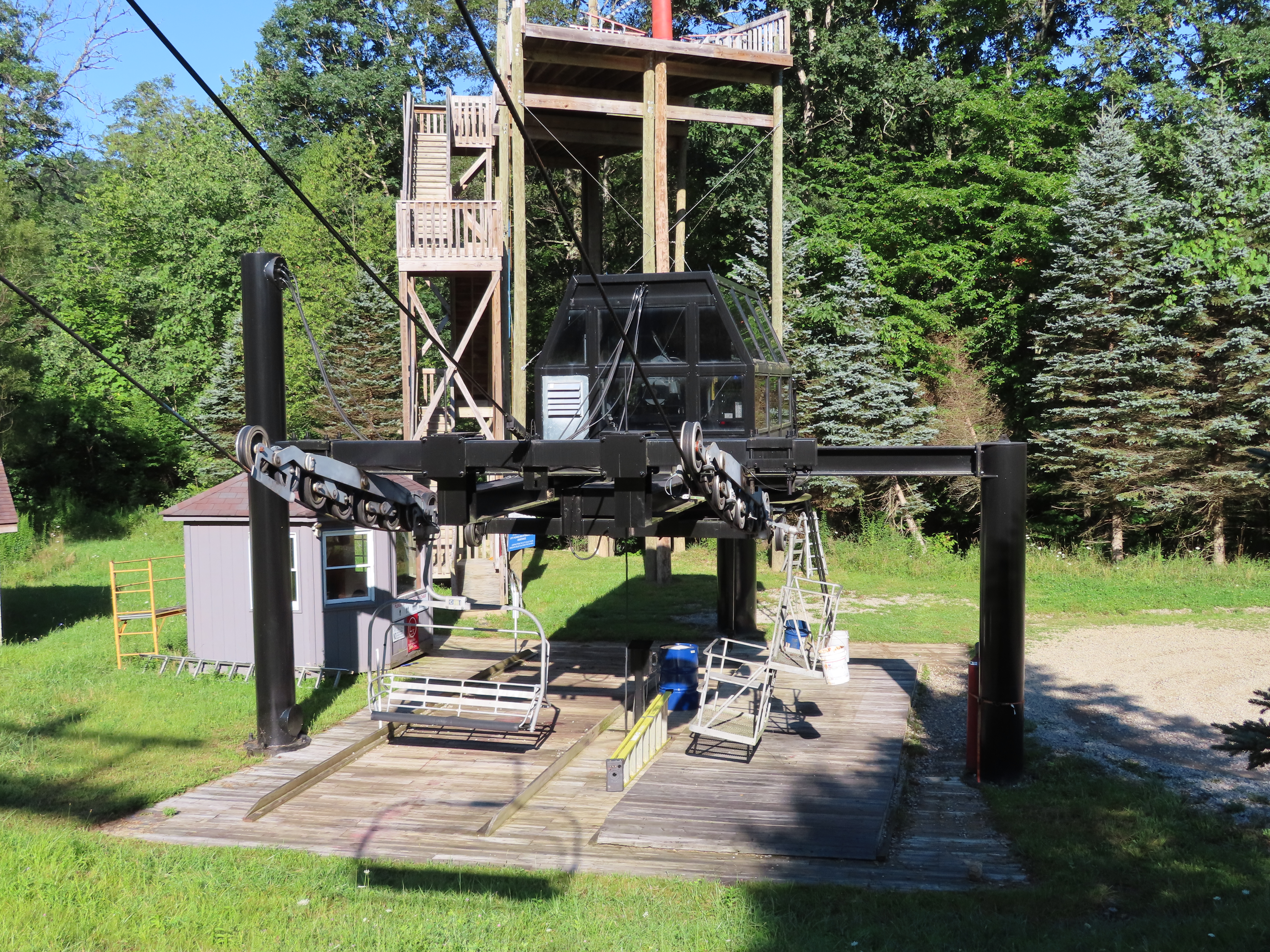 This ski area opened in 1996 and is exclusively for overnight guests of Nemacolin Woodlands Resort.Top unloading ramp.The upper half of the the lift line is fairly flat.Tower 6.View up the lift line.Sprint drive terminal.Loading area.There is a zip line above the bottom terminal.Summit terminal.Tall tower 8.View from the summit.