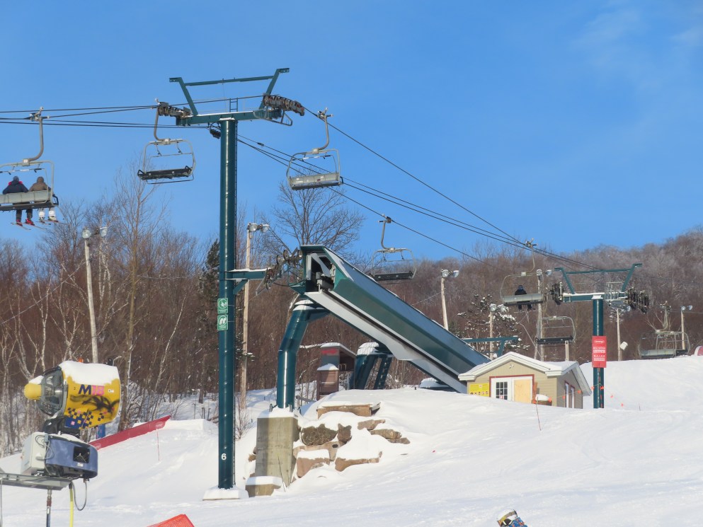 This lift has a much steeper initial climb out than the triple it replaced. To improve skier flow, they moved the base up by doing a lot of earthwork to keep the same elevation. They also opted for an S length terminal at the bottom so both the drive and tensioning are at the top, which is unusual for a detachable.