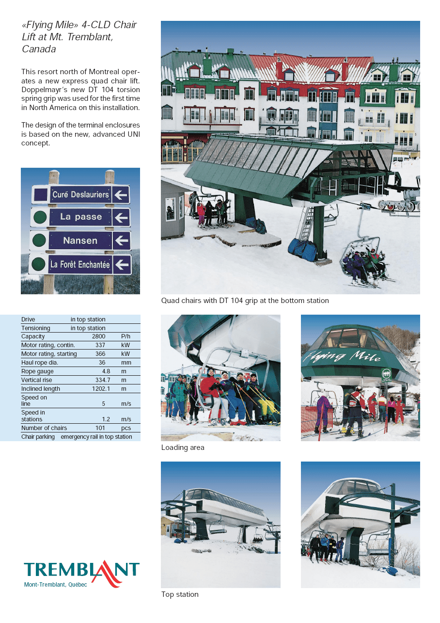 Built as part of the Intrawest expansion years, Flying Mile is not actually a mile long.There is a half mid-station that can be bypassed.View down the lower part of the line.View up the lift line just below the midstation.Towers 1 and 2.A very short Doppelmayr station.Loading area.Riding over the middle station when not in use.Nearing the summit.View down the lift line from the summit.Arriving at the drive terminal.Small maintenance rail near the unload ramp.An early model Uni Spacejet station.View up the upper part of the line.A side view of the intermediate stop.A tower with three sets of sheaves.Lift overview.In the summer this lift services a luge track.Arriving at the mid-station.Luge carts automatically unload at the mid-station.Mid-station in use for the summer.Tower 7 in summer configuration.Automated cart loading.Half mid-station unloading area.Summer overview.Doppelmayr Worldbook entry.