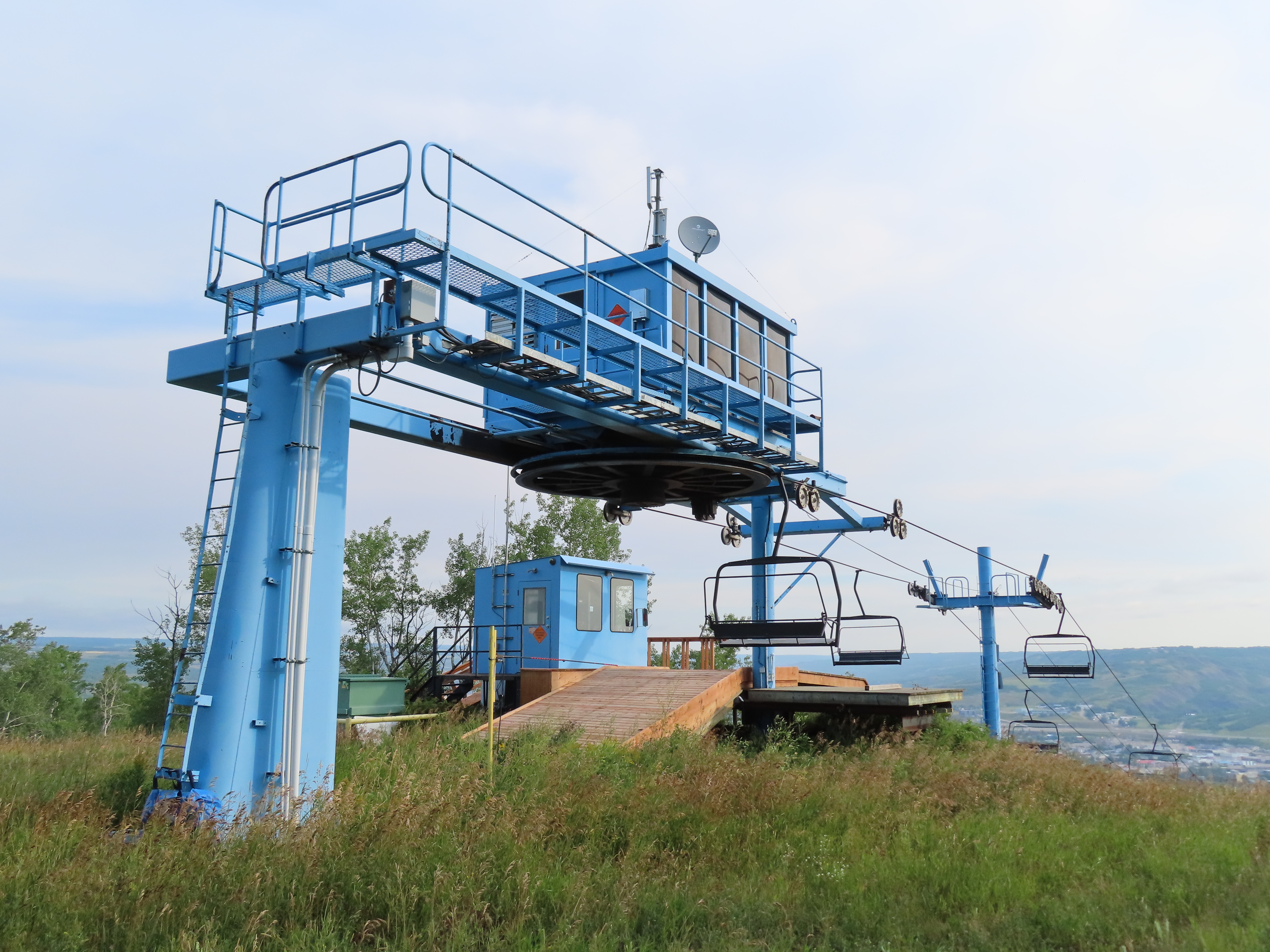This Riblet quad came from another Northern Alberta ski area in 2012.Previously, the mountain was served only by T-Bars, which remain in place.Bottom return terminal.Riblet name plate.Upper station overview.View down the lift line.Tower 12.Unloading area.Upper part of the lift line.The final few towers.Bambi watching the lift line.Flat middle section of the line.View up.Lower lift line.View up near the base.Tower 2.