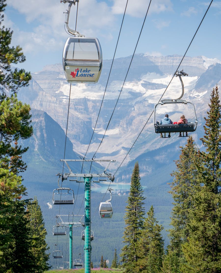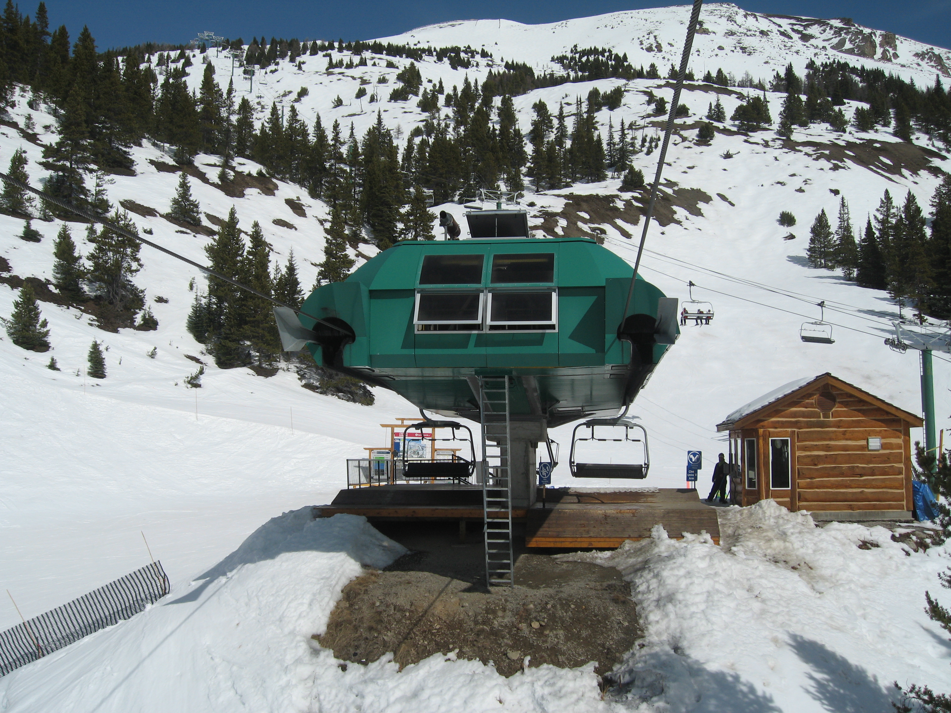 The lift actually has a clutch system allowing the chairs and cabins to stop at the top and bottom terminals for loading and unloading. It runs at a slower speed as it is a sightseeing lift in summer and you can often see grizzly bears grazing under the lift. They operate this lift in summer as there is a lodge and sightseeing area at mid mountain accessed by this lift whereas the top of the gondola is currently undeveloped.