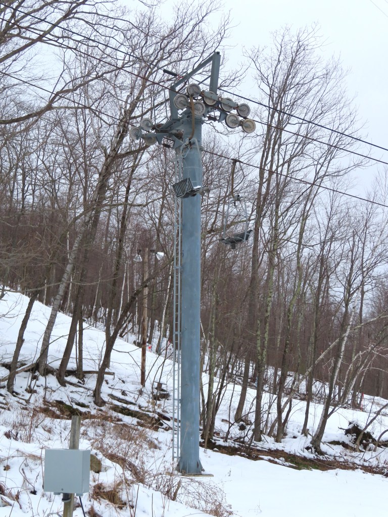 Most of the parts here were sourced through West Mountain, NY. The chairs are left over from Haystack’s former Barnstormer Triple, which was reinstalled as West’s summit lift in 2015. The drive terminal, also sourced through West, was originally installed on Sugarbush’s Valley House Double and was moved to West to be installed with the leftover Barnstormer components, although West opted to install a new Partek in 2019 instead. The towers were sourced, I believe, from the former Big Burn lift at Snowmass. The return is custom-made by Skytrans