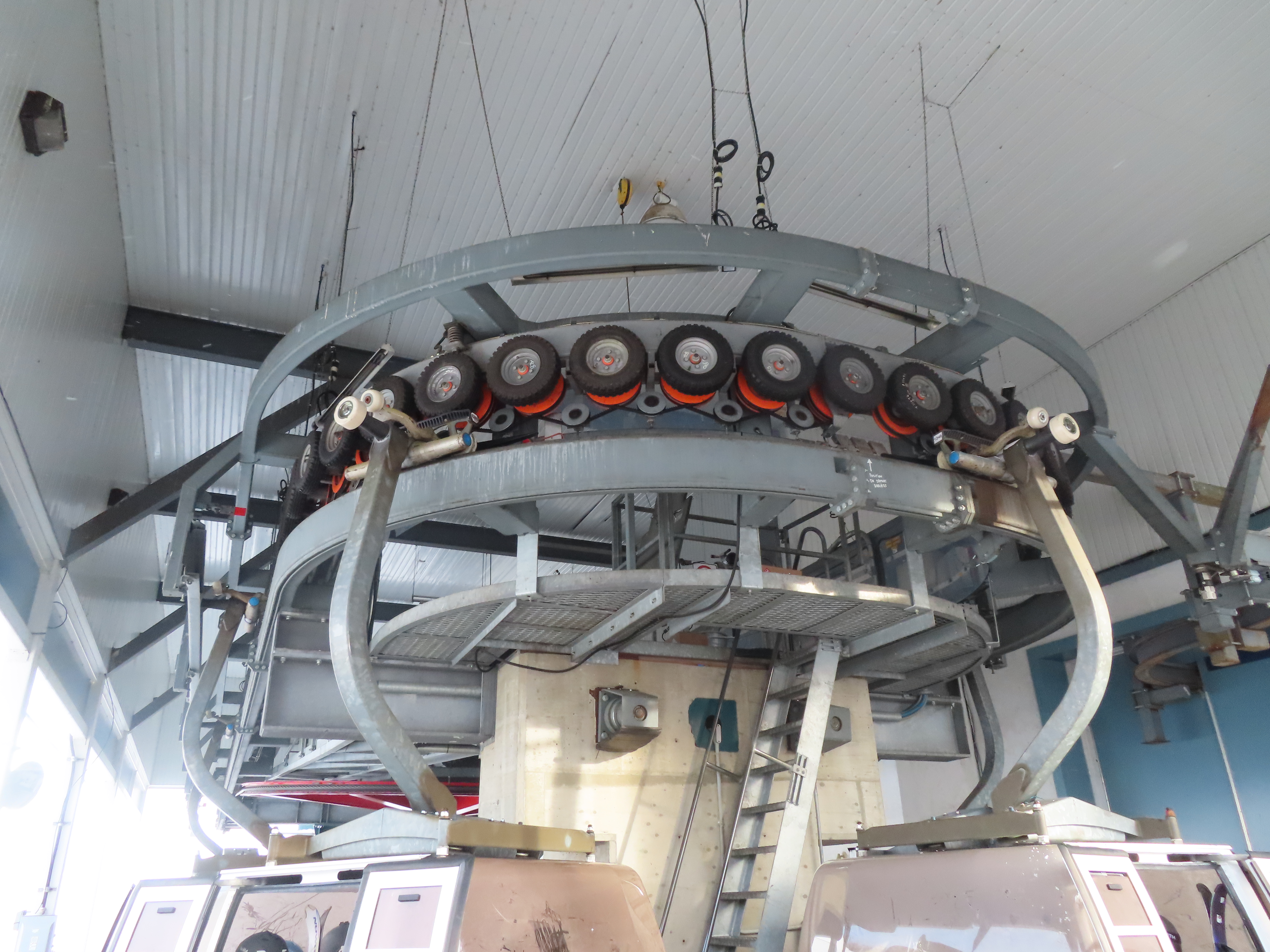 I asked to see the lift shack at the top once, and there’s a sign saying they are allowed to run it at 5.8 m/s which translates to about 1140 fpm. I’m not sure the exact reason the shack is on the wrong side, but I think it’s due to space constraints with the lodge on one side and cabin parking on the other, but there are mirrors and cameras that allow the entire platform to be seen from inside the shack. It used the be the cabin parking building was reserved for use by ski school during the day, but I was also able to go in it once last season.