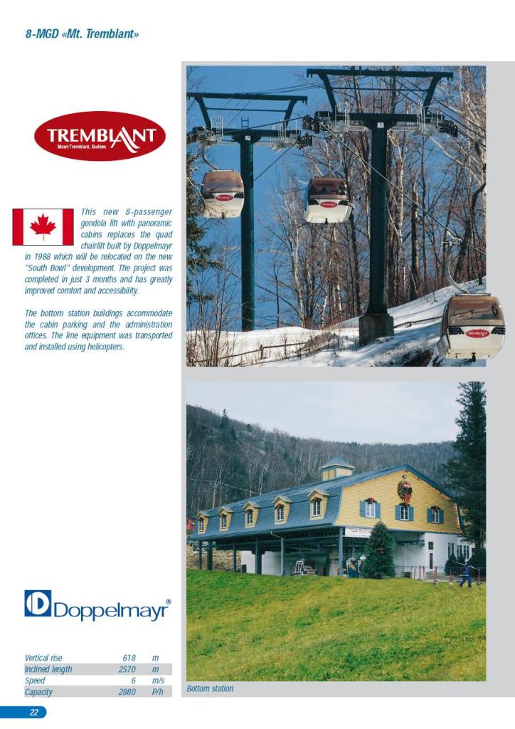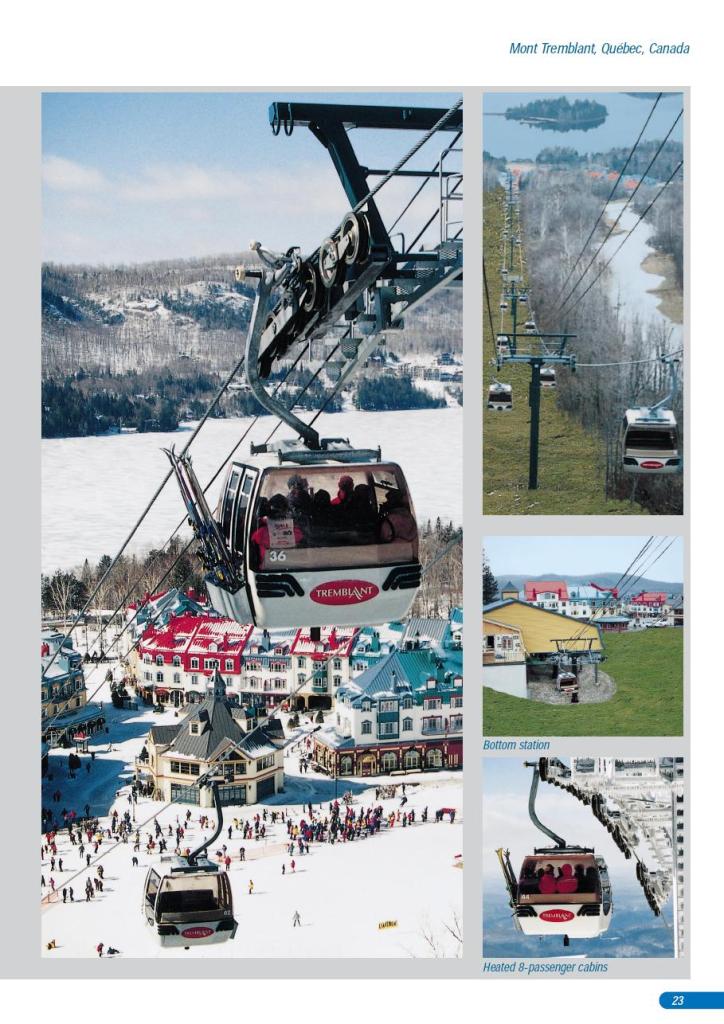 The Tremblant gondola opened in 1998 and replaced a Doppelmayr high speed quad.The bottom terminal is located in a building which also houses cabin parking.The top terminal has more parking and a Doppelmayr enclosure.Unloading area up top.Big breakover.View down a section of the line.The lower station building.Laoding and maze area.Terminal placement within the village next to the Cabriolet.Tower 2.The cabins are Gangloff rather than CWA.Side view of the bottom terminal.Lower terminal overview.Doppelmayr detachable equipment in the return station.View up at the top terminal.Looking down from near the summit.The gondola is over 8,000 feet long.View up at tower 16.Lower part of the lift line.View up at tower 6.A cabin with new CWA ski racks.Doppelmayr Worldbook entry.Part two from the Worldbook.