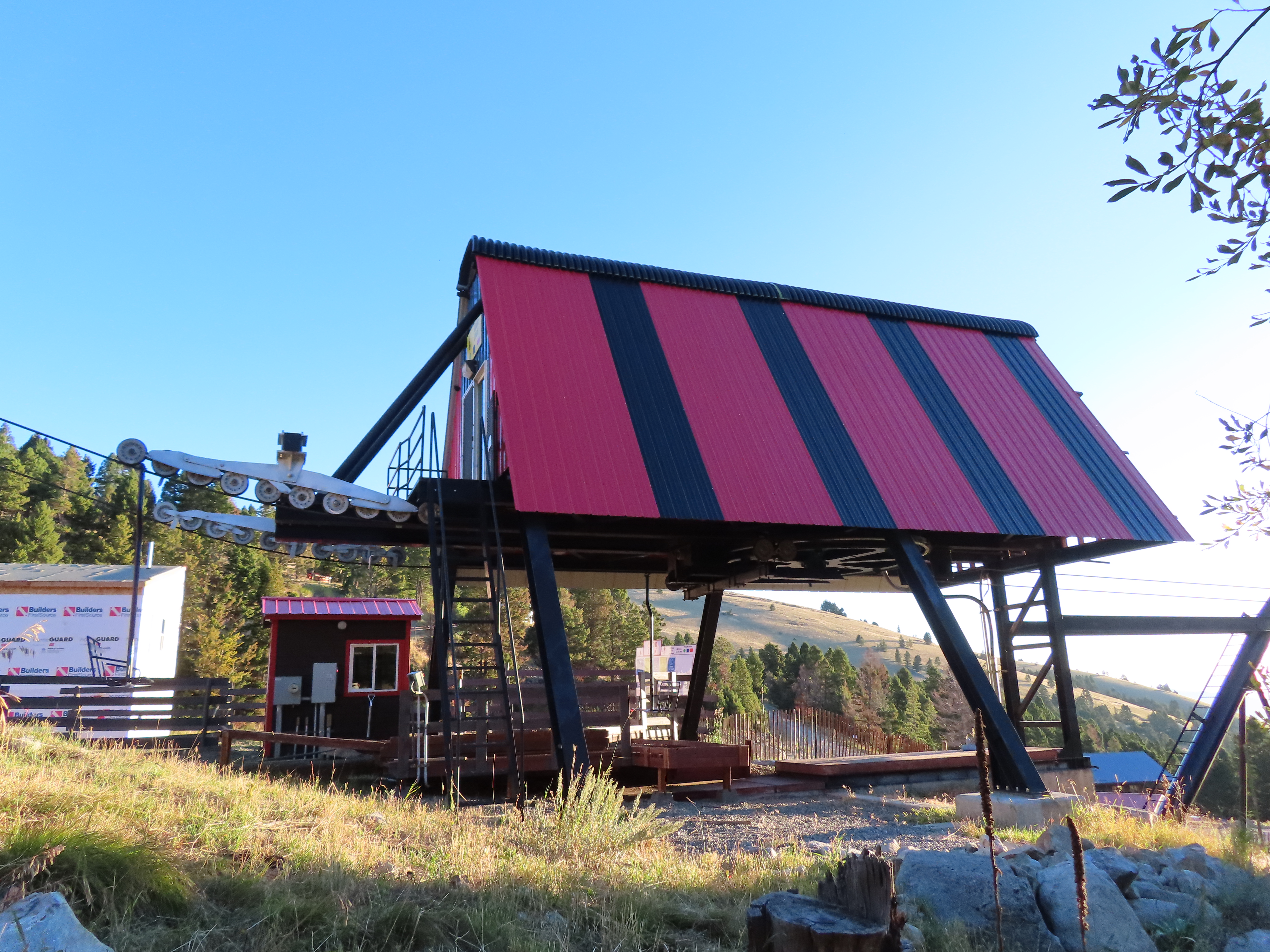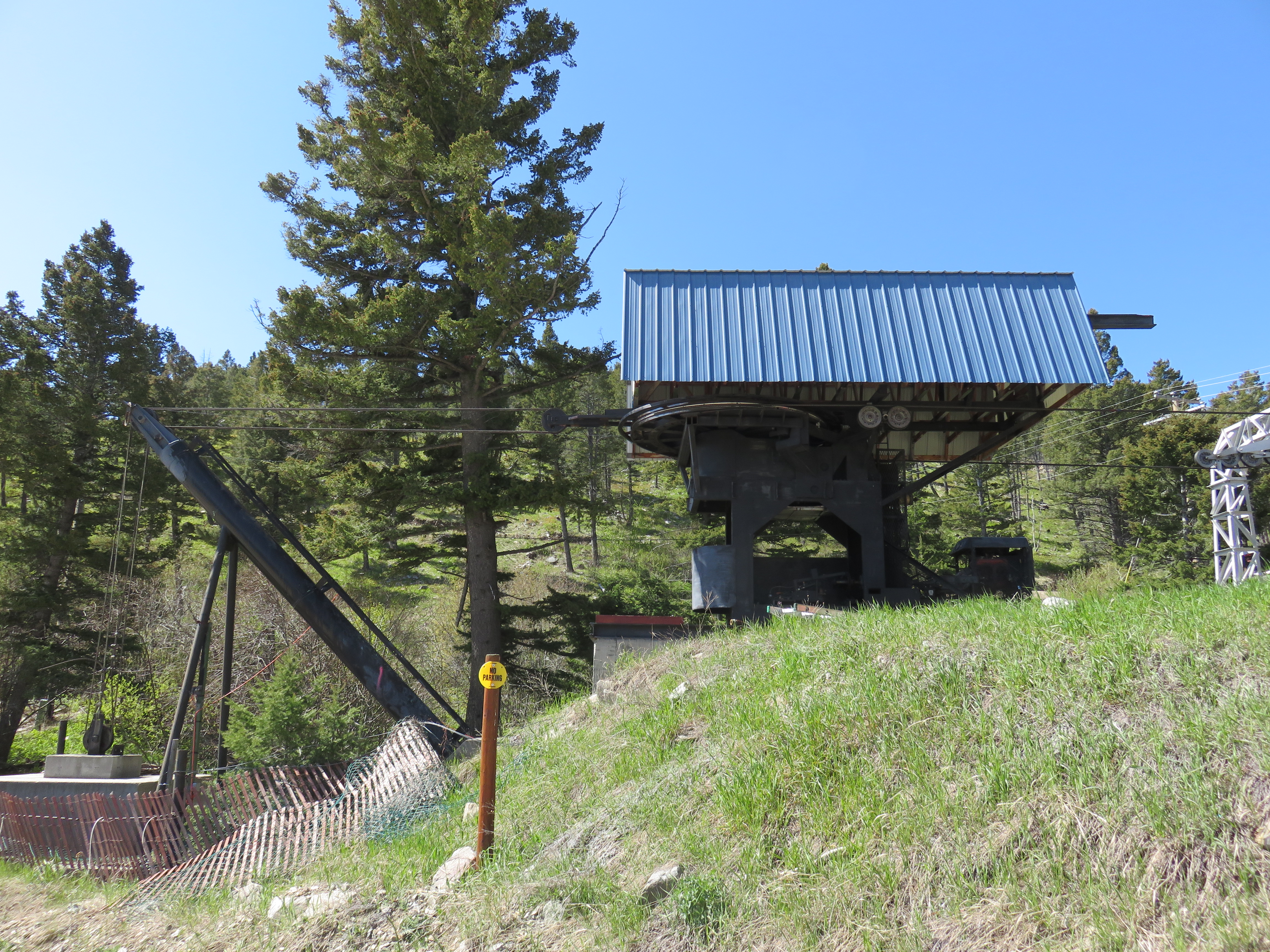 This bottom terminal was replaced in 2016.View down the line with lattice towers.Top bullwheel.Breakover towers.Portal tower at the base.Drive bullwheel from below.Looking up the line.In 2018 this lift received a new drive terminal.This station came used from Canada Olympic Park in Calgary.New terminal with old counterweight structure.