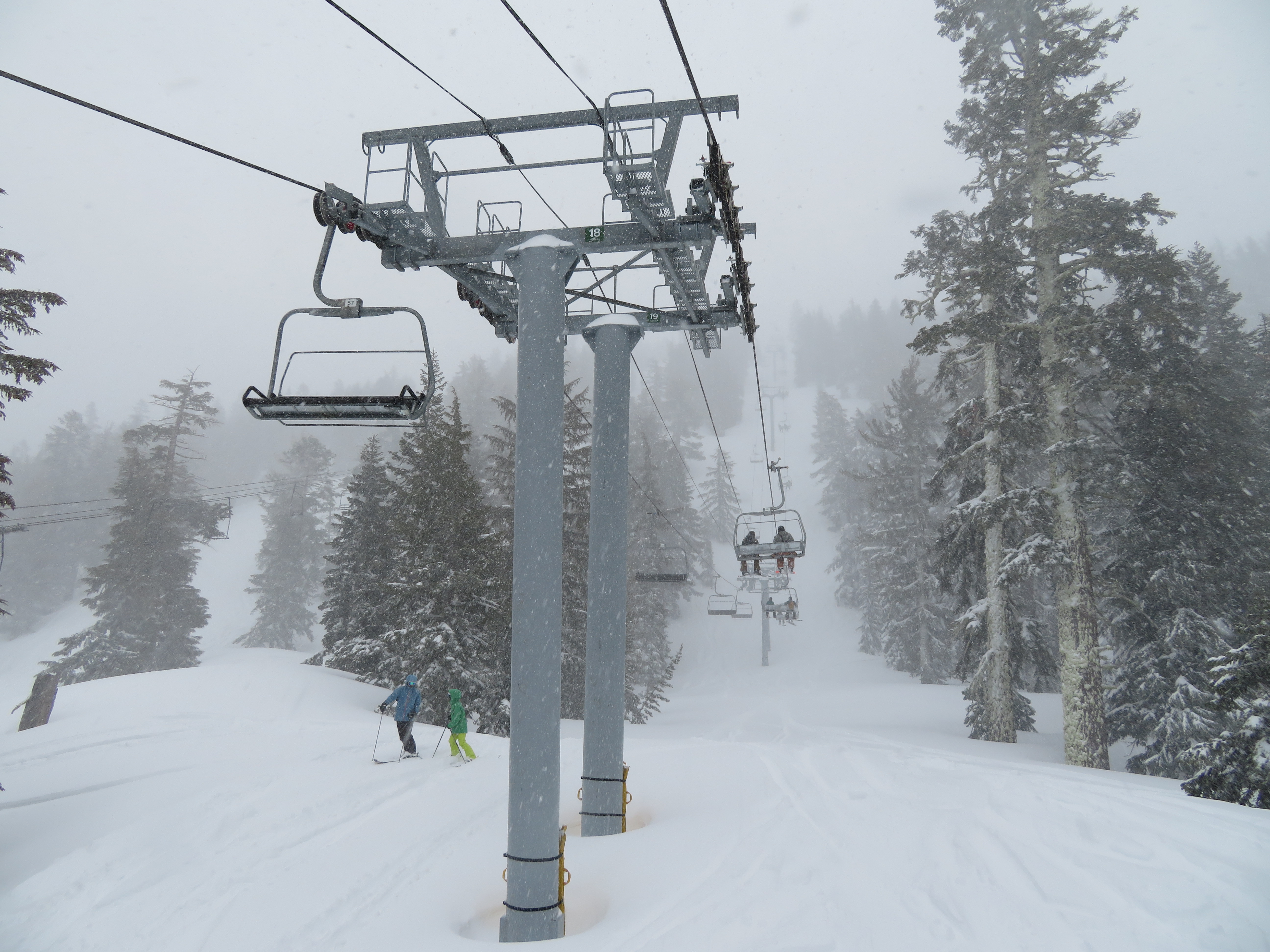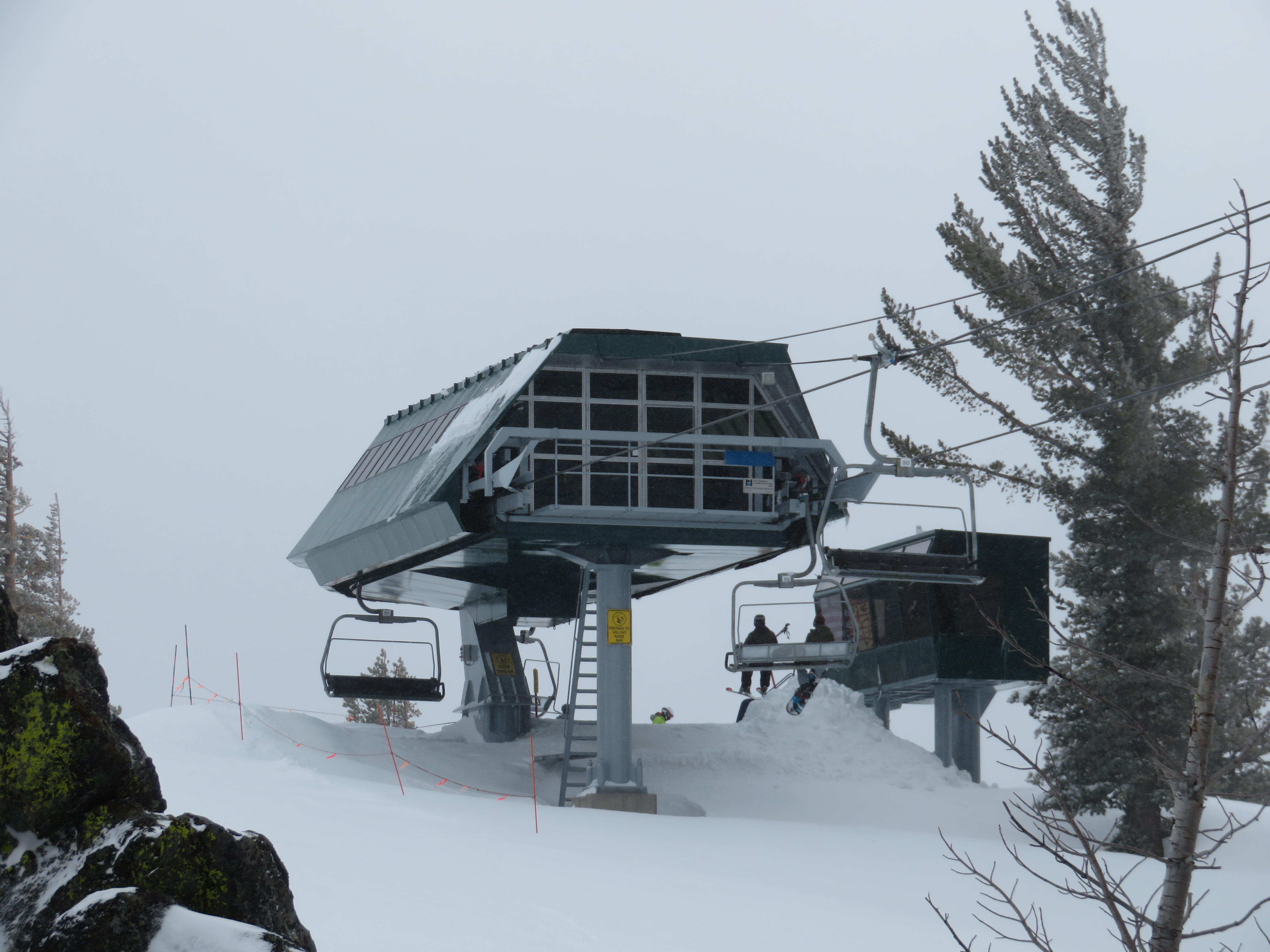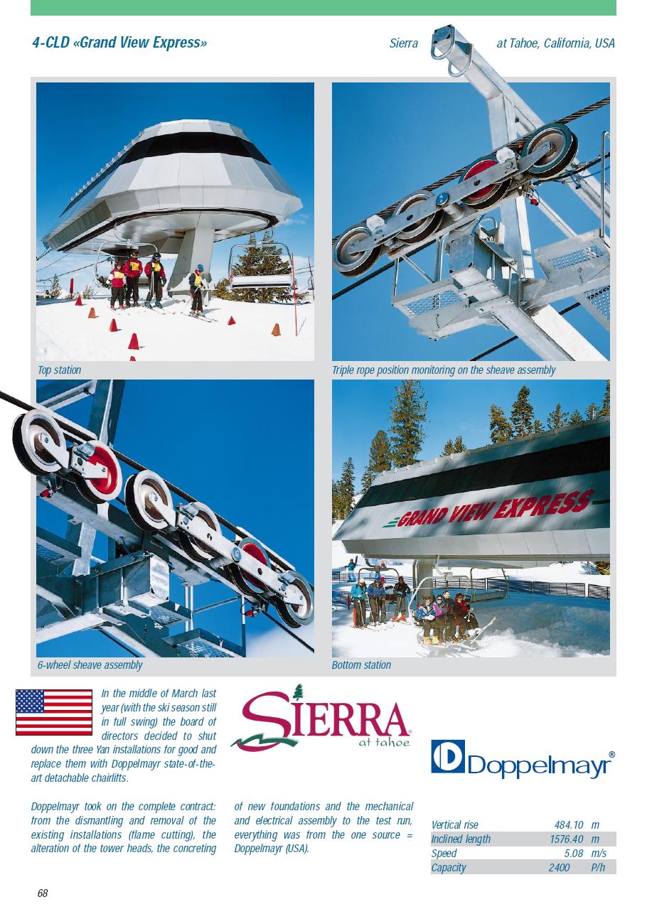 Two main lifts run side-by-side – the Grandview Express and Tahoe King.Height-adjustable Doppelmayr return station.Top drive station.Side view of the top station.Downhill side of the top.View down the lift line.Middle lift line.Lower lift line.Bottom terminal with integrated tower 1.View up from the base area.Riding up the line.Double support towers.Tower with two tubes.Top terminal underskin.Doppelmayr Worldbook entry.