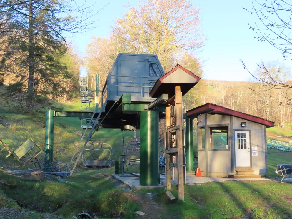 I actually discovered most of this lift today on the side of an upper trail at Berkshire East, Catamount’s sister mountain. Components that were there included the motor room (including both the main and auxiliary motor as well as the gearbox and most of the electronics), a few towers, structural components of the drive and return terminals, control pedestals, a wooden crate labelled “seat pads” and lots of sheaves and assemblies. Notably absent were both bullwheels, the haul rope, and the chairs. Interestingly there were also some galvanized terminal structure tubes that likely did not come from this lift as well as what appears to be part of an old tension carriage with concrete wheels (see right side of first photo). Curious as to what BEast’s plans for this lift are.