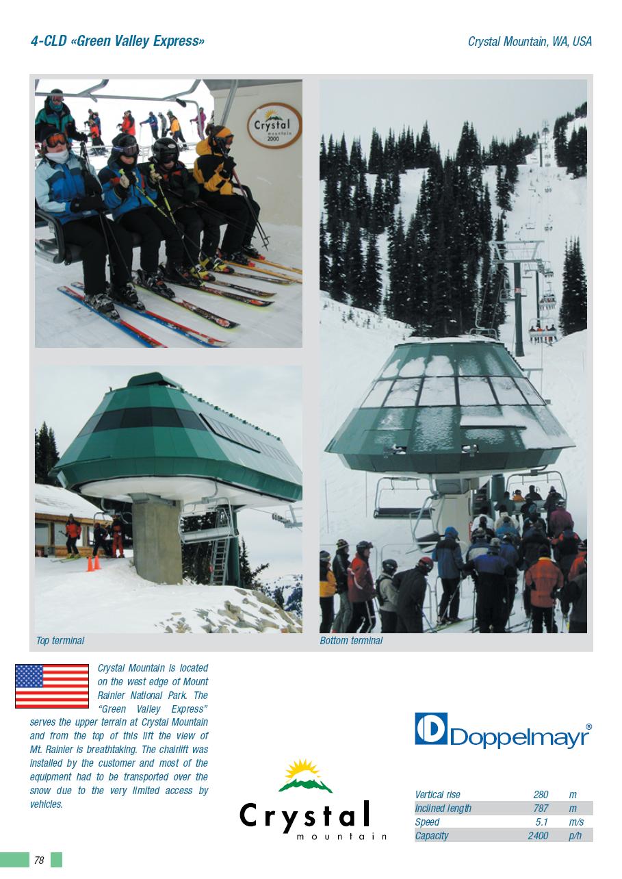 Bottom terminal.Lower station looking up the lift line.Looking up the lift line.Hold down tower 7.Approaching the top terminal with Mt. Rainier in the background.Top terminal in the summer.The upper terminal tucked into a hillside.Upper station turnaround.View down from the summit.Middle part of the lift line.This lift has a very interesting profile with ups and downs.Lower lift line.The first two towers.Side view of the bottom station.Green Valley.Loading area.Tower 4.