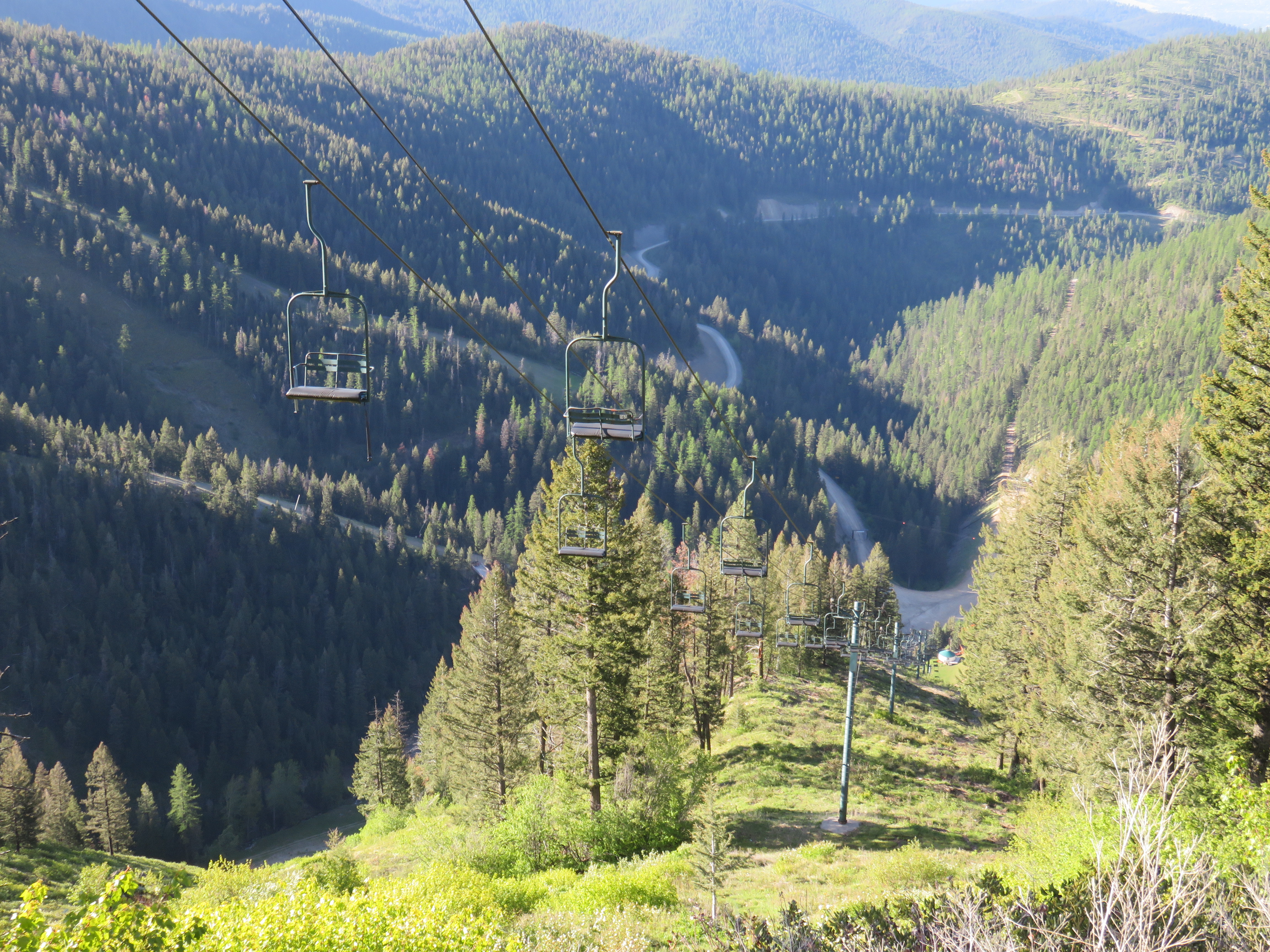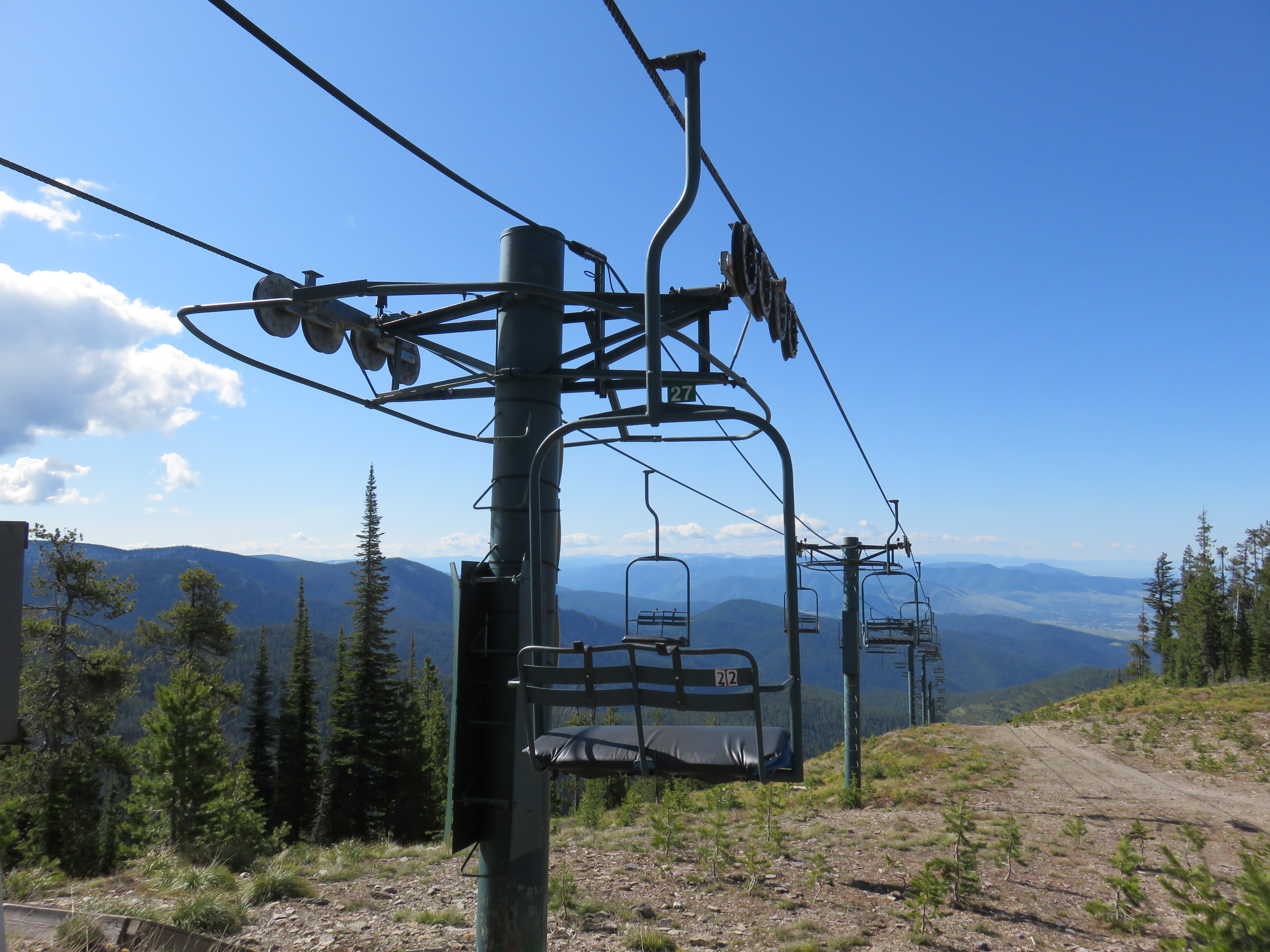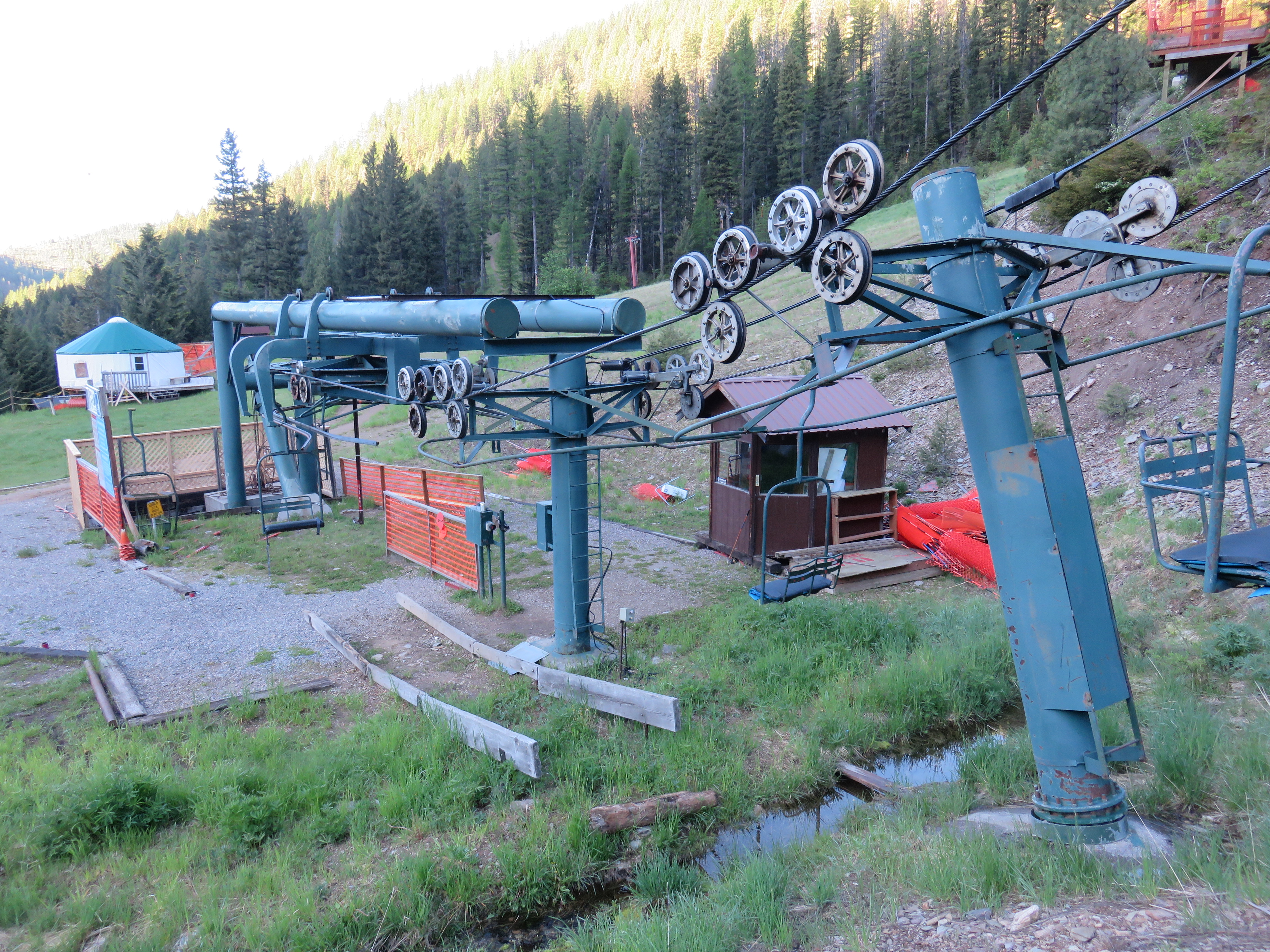 Lower terminal setup for summer operations.This lift was renovated in 1994 with parts from Big Sky’s Mad Wolf double.Grizzly rises 2,000 vertical feet.Fixed drive station up top.Tower 27.Top station from below.60s style Riblet breakover towers.View down the very steep line.Riblet bail-style chairs.Lift line from below.