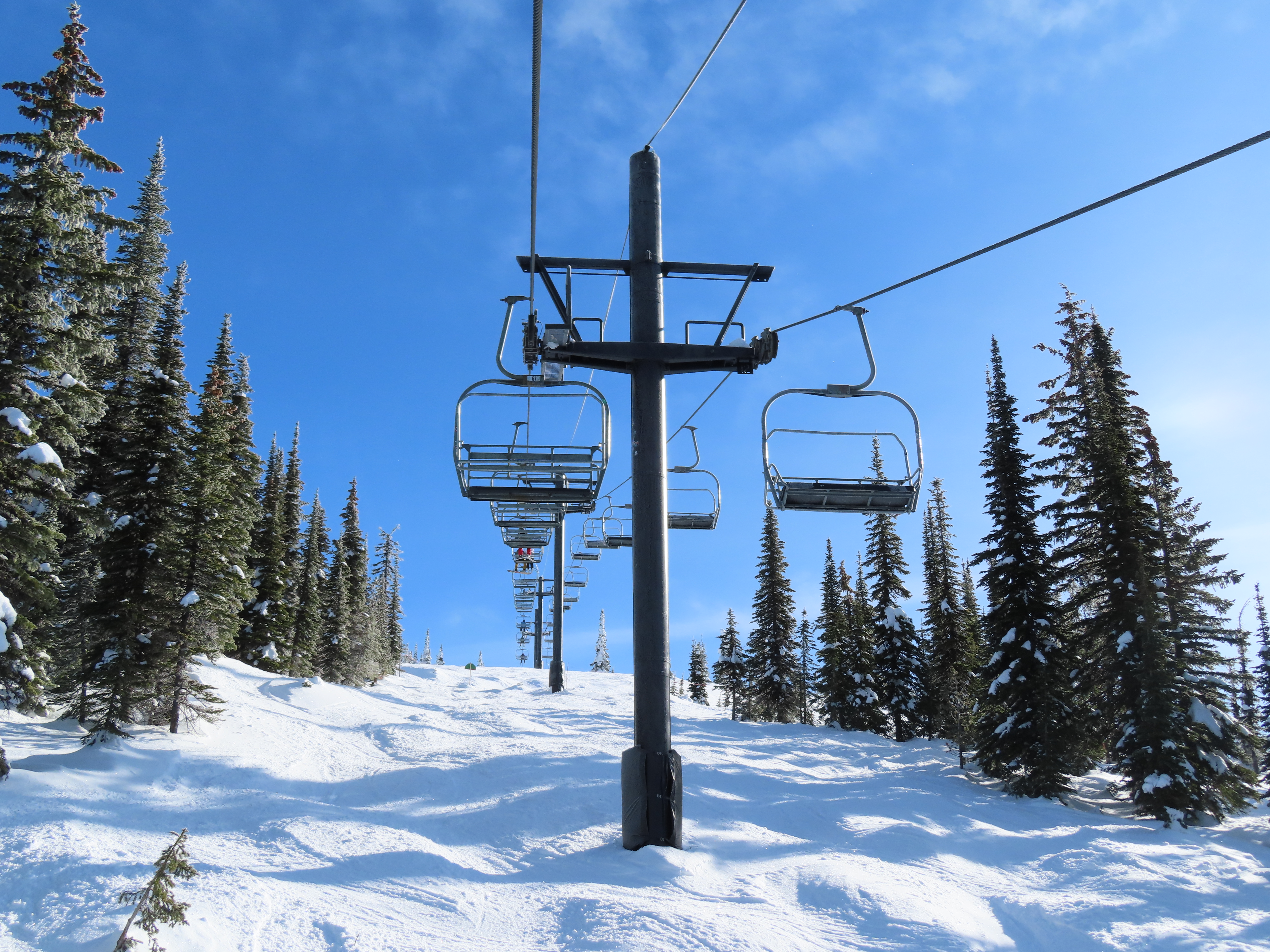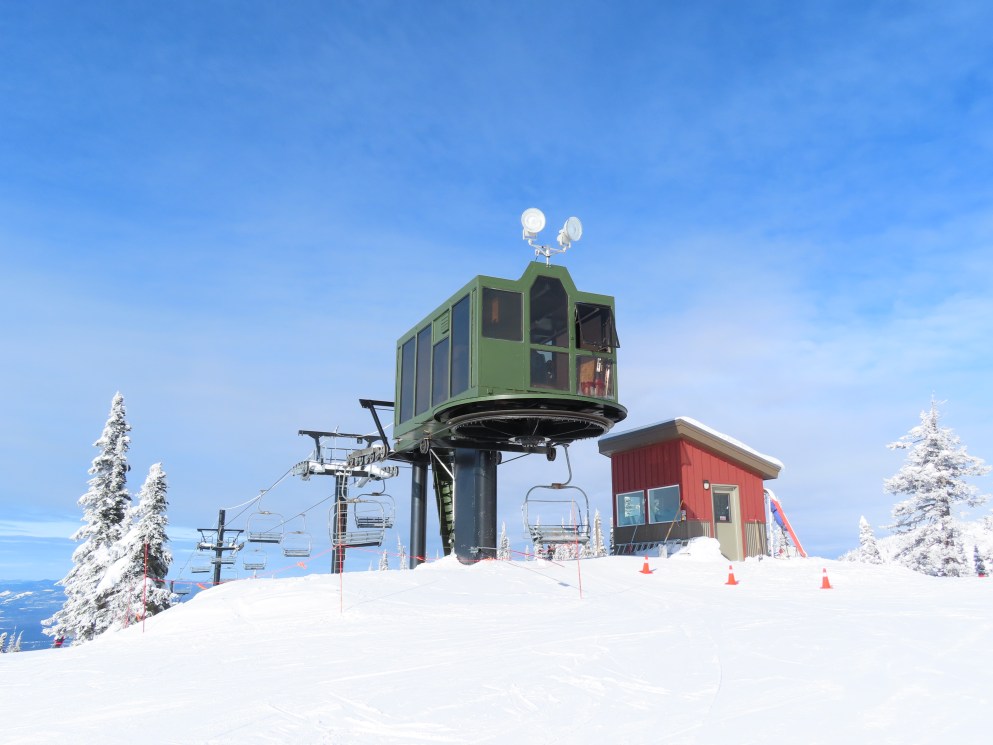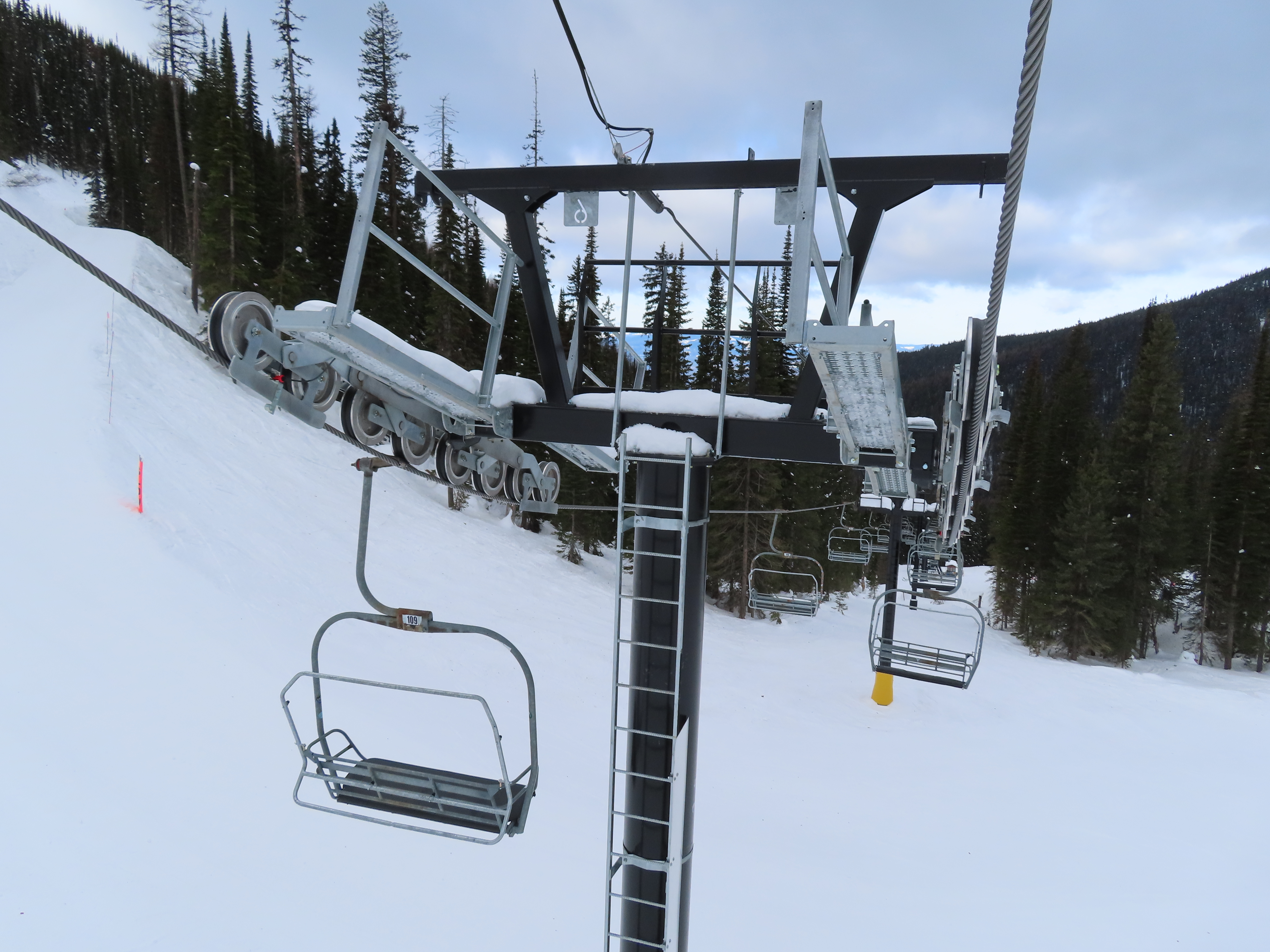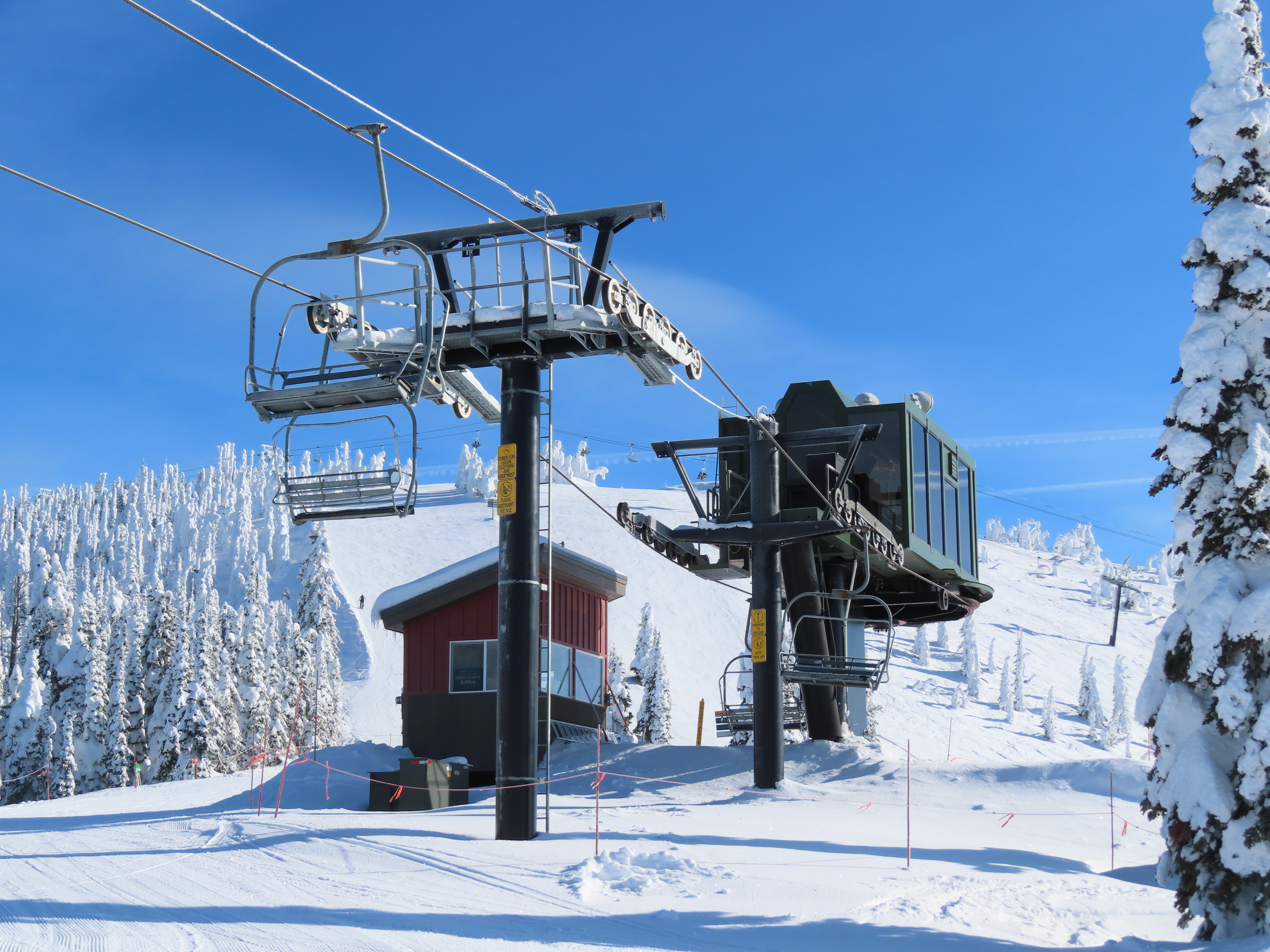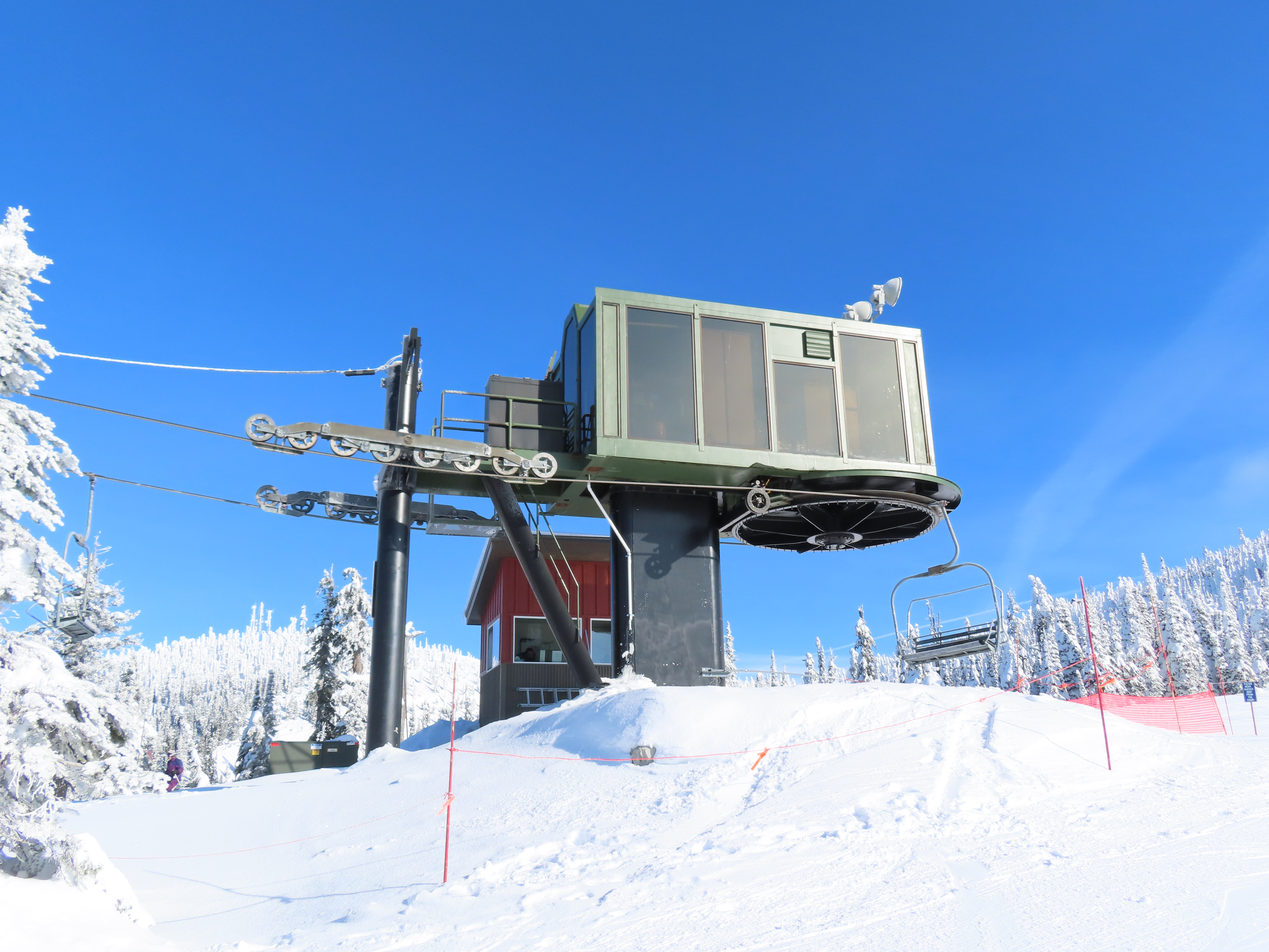 This lift was entirely relocated from one part of Hellroaring Basin to another in 2021.Side view of the relocated top drive terminal.Skytrac tower next to a CTEC tower.Upper lift line.View from the summit.View down the line.Skytrac did the relocation and added bars to the chairs.Two of the 18 towers are new from Skytrac.View up the steep part of the line.The first few towers.Tower 3.Lower station overview.Loading area.Skytrac also converted the lift to hydraulic tensioning.T1.View riding up.View back down the line.The last carrier is a special ambulance chair for toboggans.The first of two Skytrac tower heads.Upper lift line.