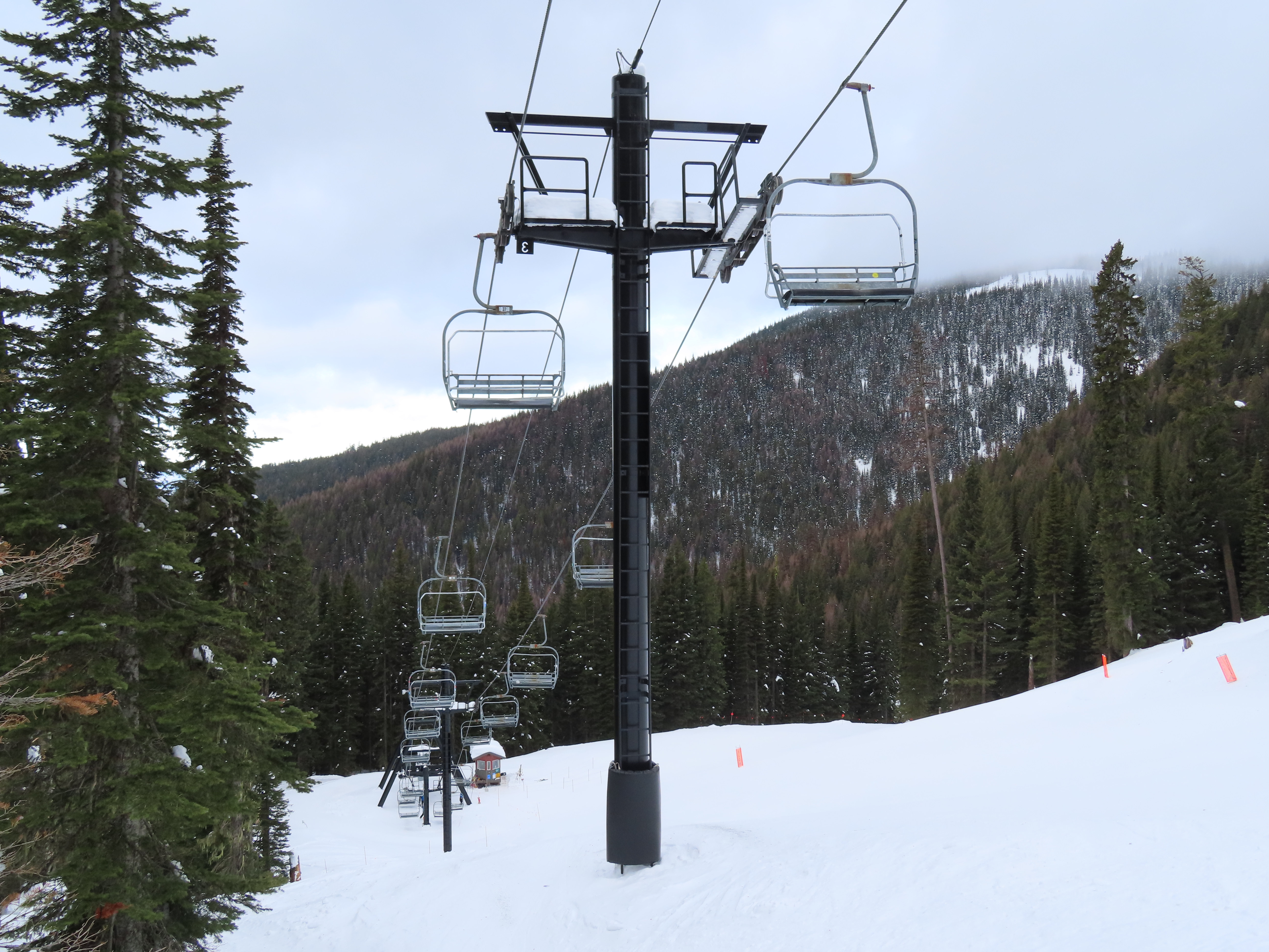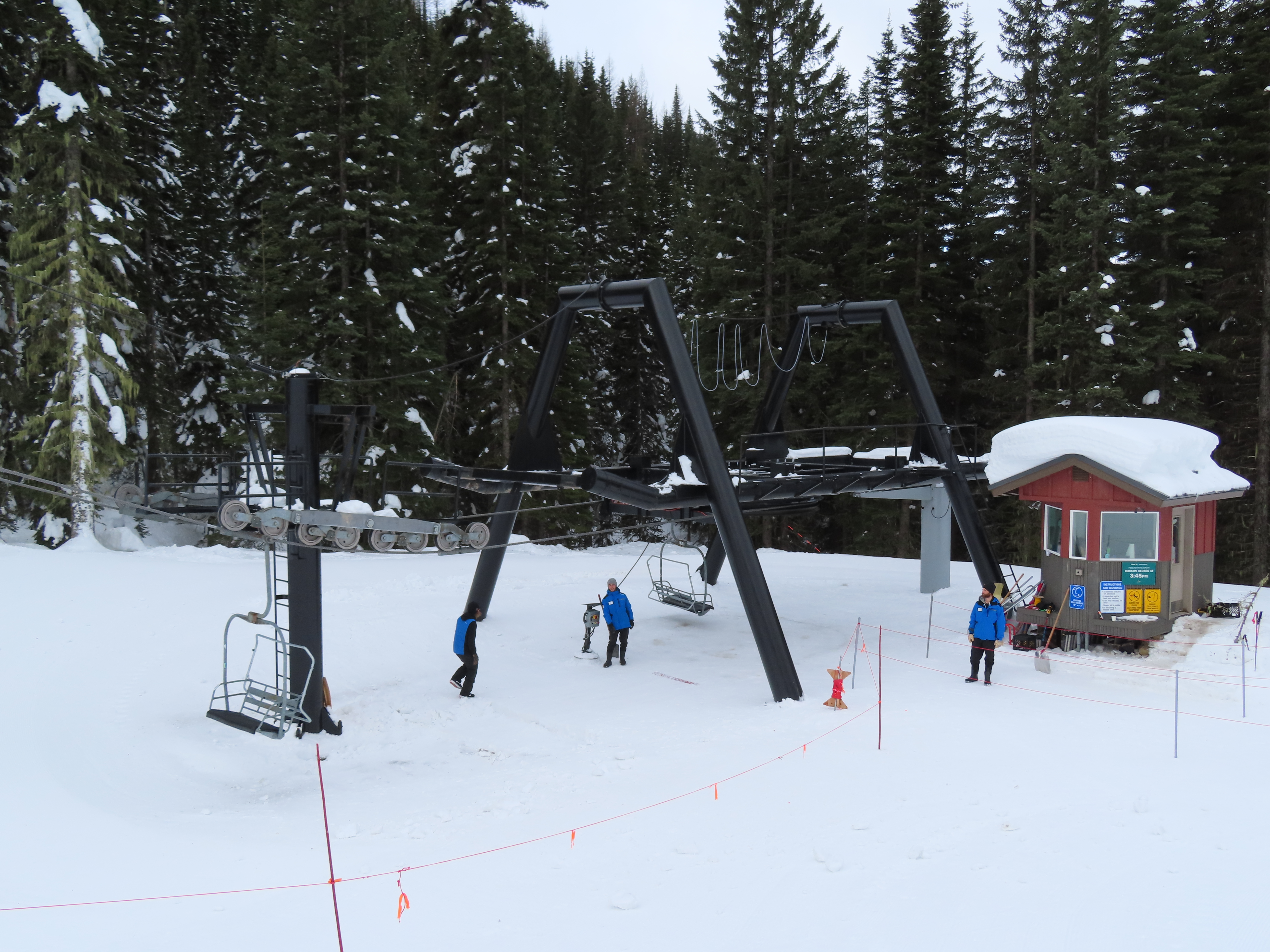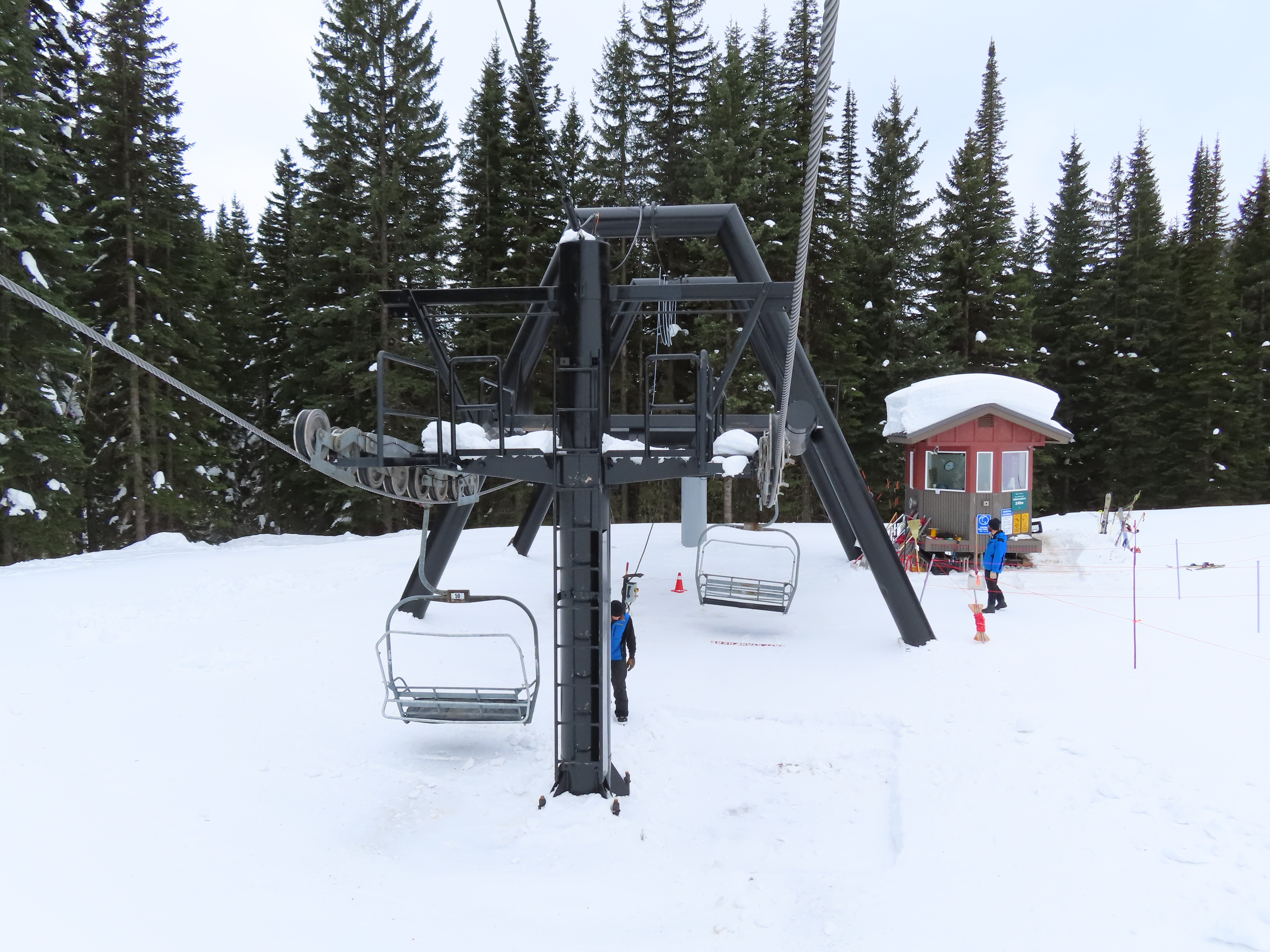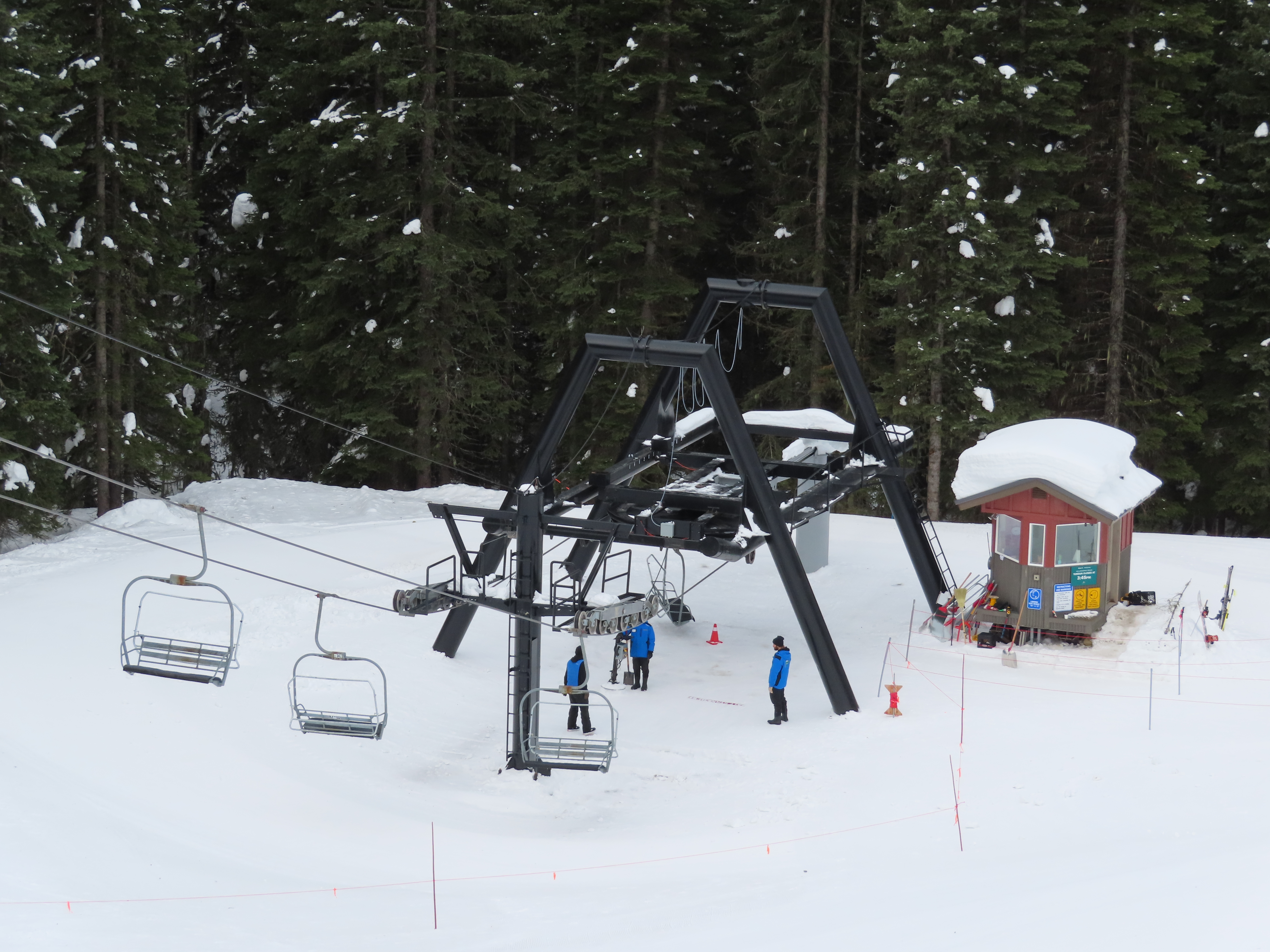 This lift was entirely relocated from one part of Hellroaring Basin to another in 2021.Side view of the relocated top drive terminal.Skytrac tower next to a CTEC tower.Upper lift line.View from the summit.View down the line.Skytrac did the relocation and added bars to the chairs.Two of the 18 towers are new from Skytrac.View up the steep part of the line.The first few towers.Tower 3.Lower station overview.Loading area.Skytrac also converted the lift to hydraulic tensioning.T1.View riding up.View back down the line.The last carrier is a special ambulance chair for toboggans.The first of two Skytrac tower heads.Upper lift line.