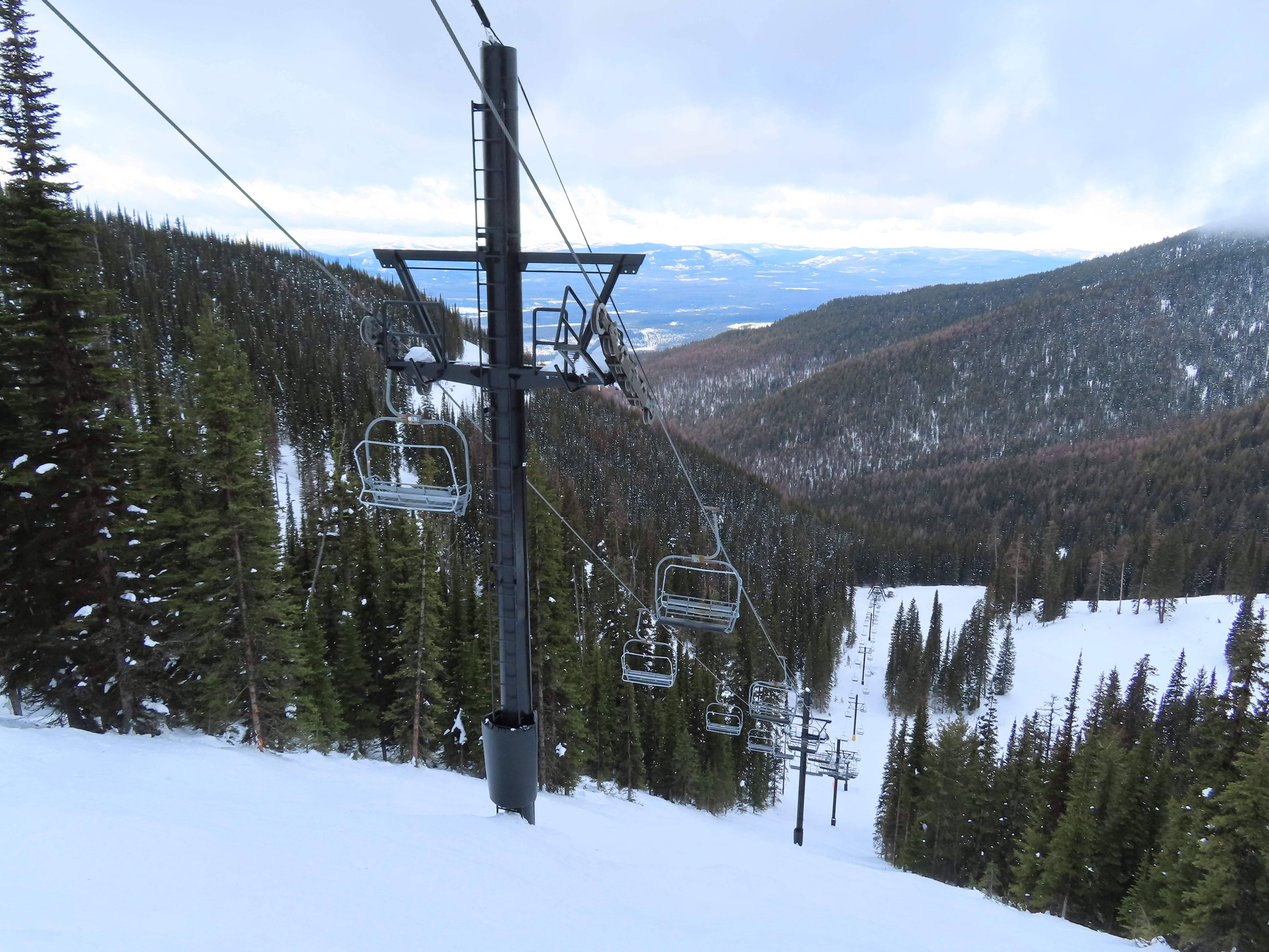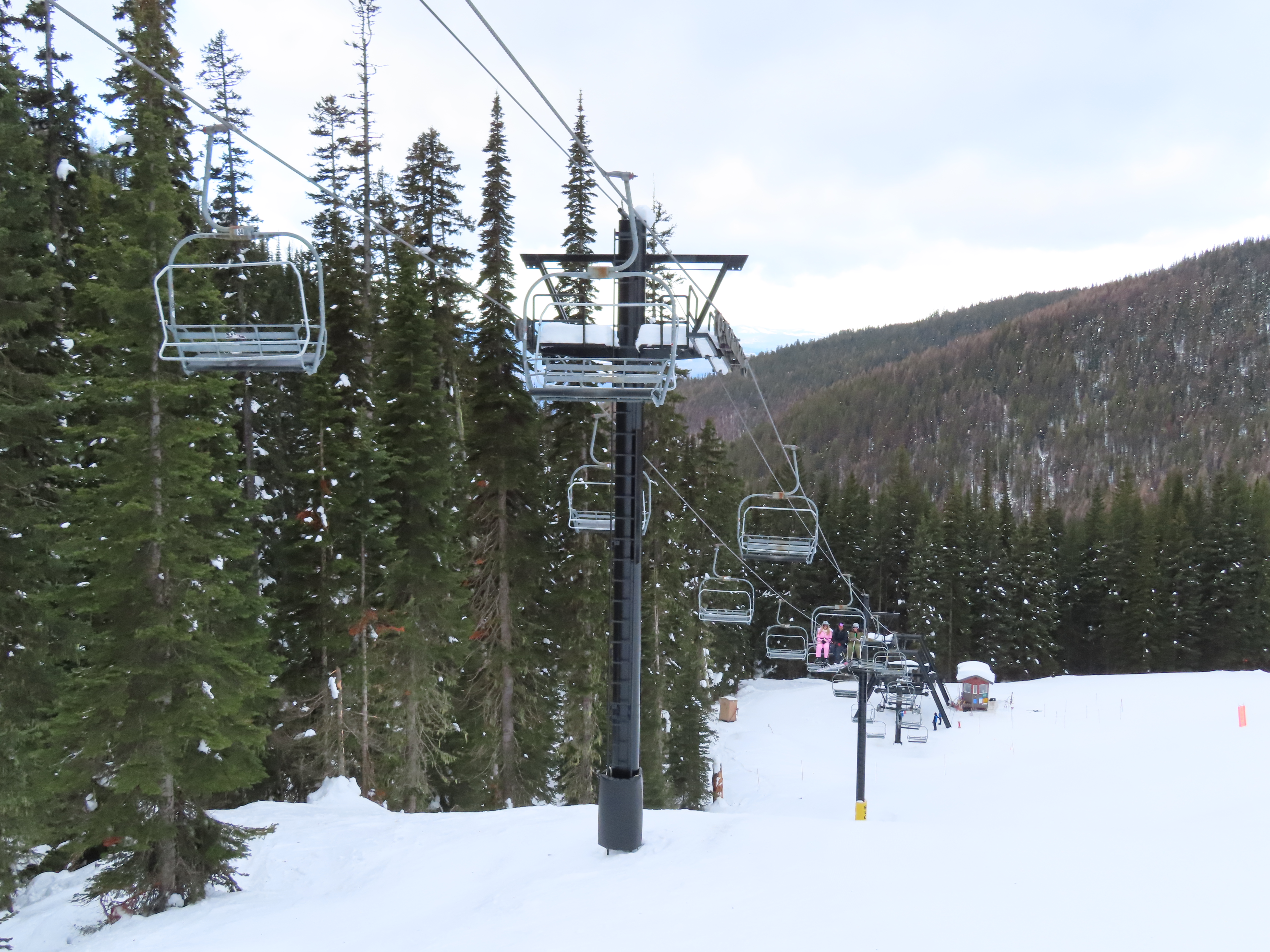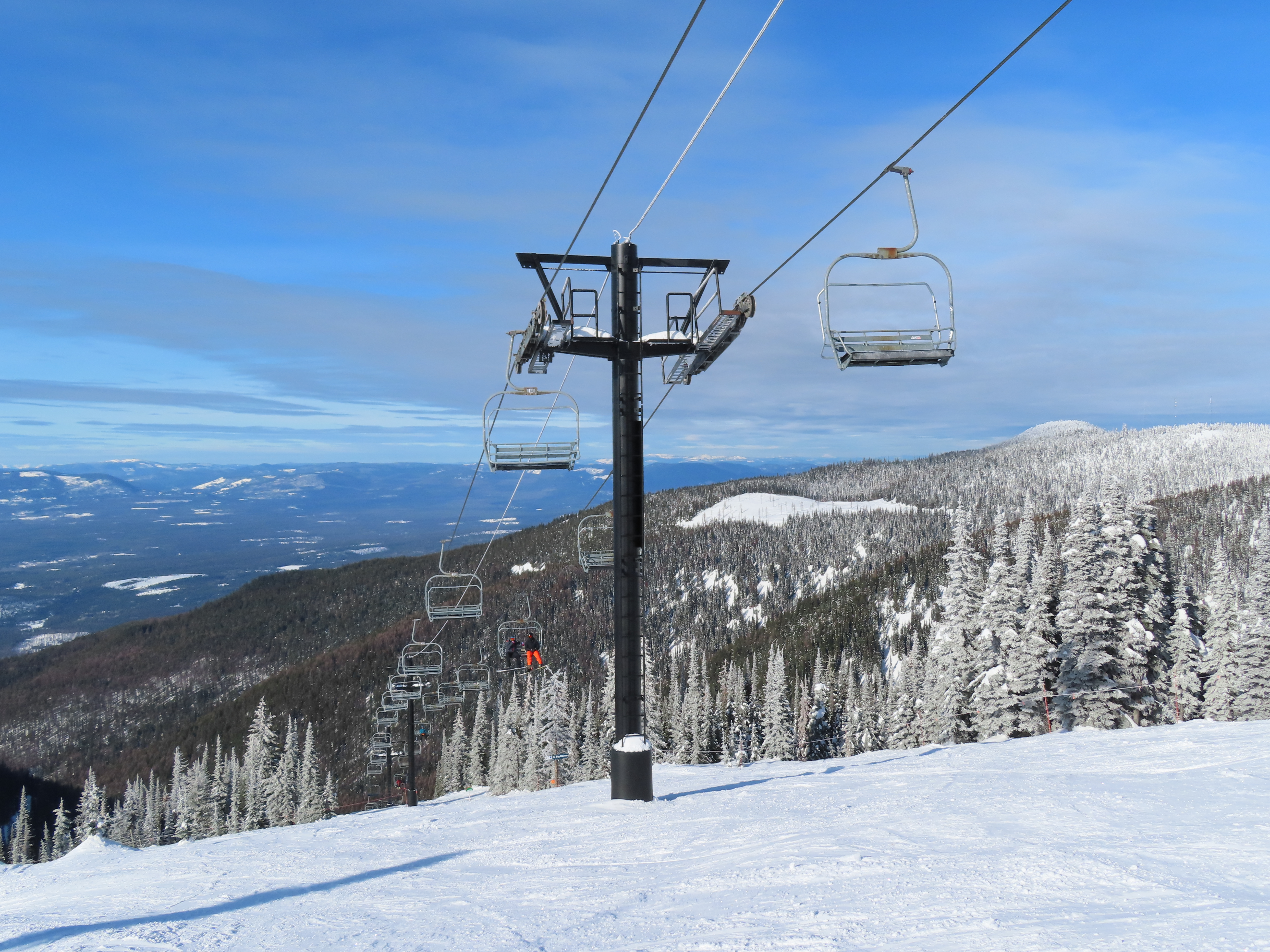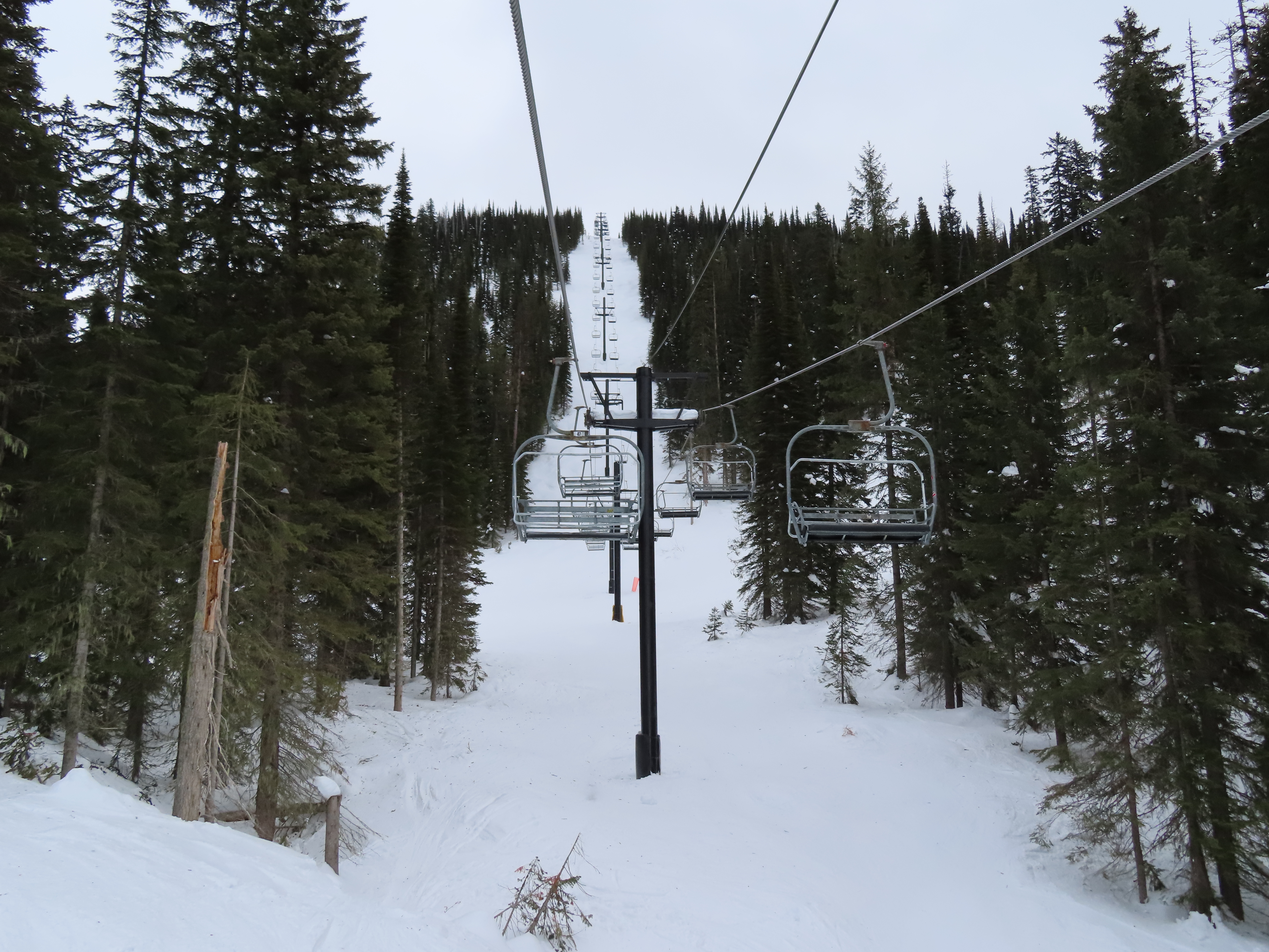 This lift was entirely relocated from one part of Hellroaring Basin to another in 2021.Side view of the relocated top drive terminal.Skytrac tower next to a CTEC tower.Upper lift line.View from the summit.View down the line.Skytrac did the relocation and added bars to the chairs.Two of the 18 towers are new from Skytrac.View up the steep part of the line.The first few towers.Tower 3.Lower station overview.Loading area.Skytrac also converted the lift to hydraulic tensioning.T1.View riding up.View back down the line.The last carrier is a special ambulance chair for toboggans.The first of two Skytrac tower heads.Upper lift line.