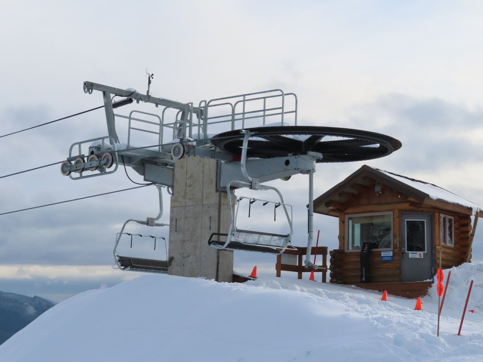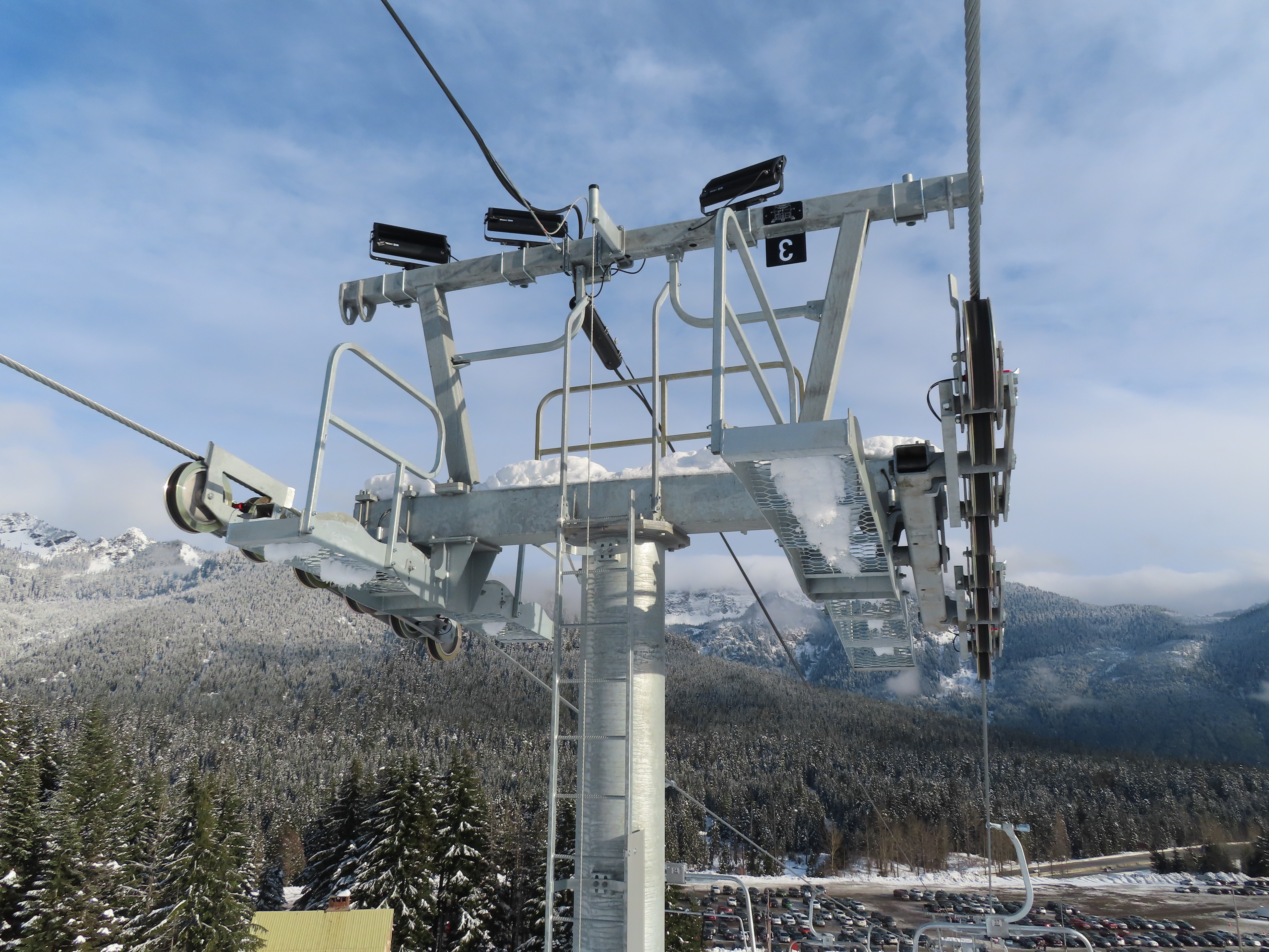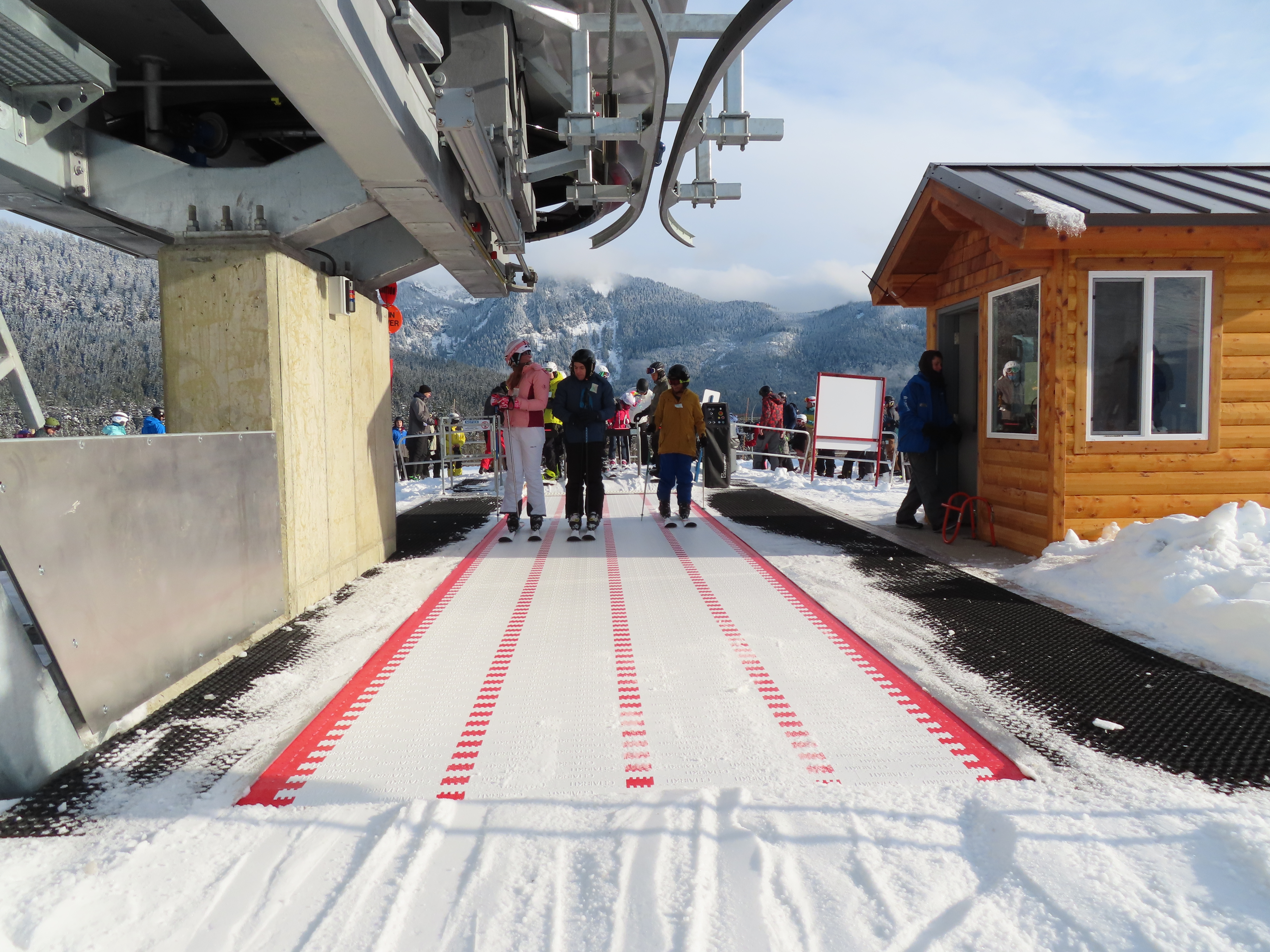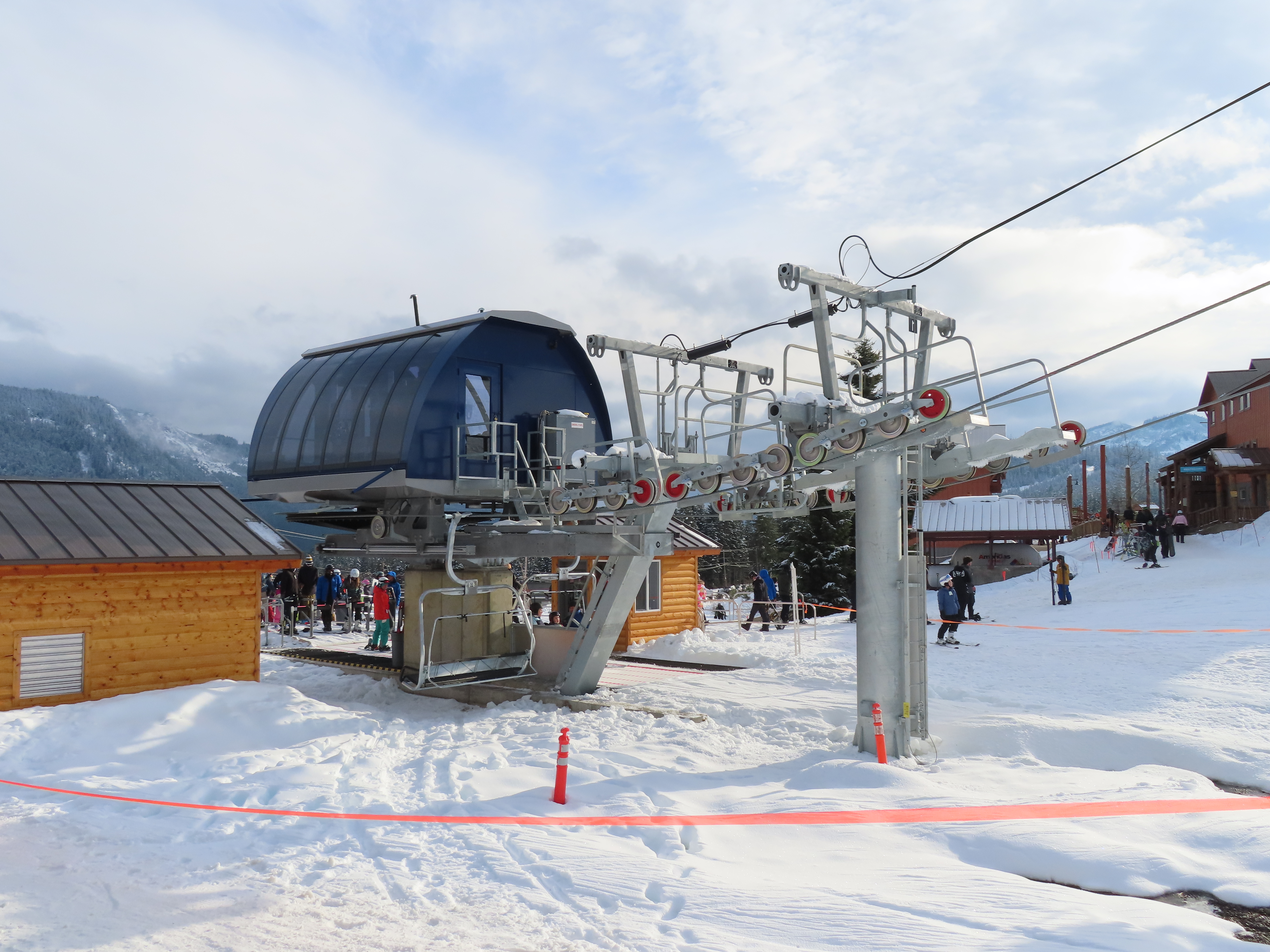 This Alpen Star quad replaced a Riblet double of the same name in 2019.Tower 1.The top terminal and reused lift shack from the previous chair.View down the lift line.Return bullwheel up top.Tower 6.Looking up the line.Lower part of the line at Summit Central.Side view of the bottom station.Loading carpet.Tower 2.Tower head with night lighting.Arriving at the summit.Tower 5.View up from the base area.Another view of the drive terminal.Loading area and motor room.Riding up the line.View down at tower 6.Lift overview.
