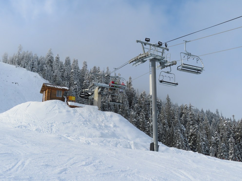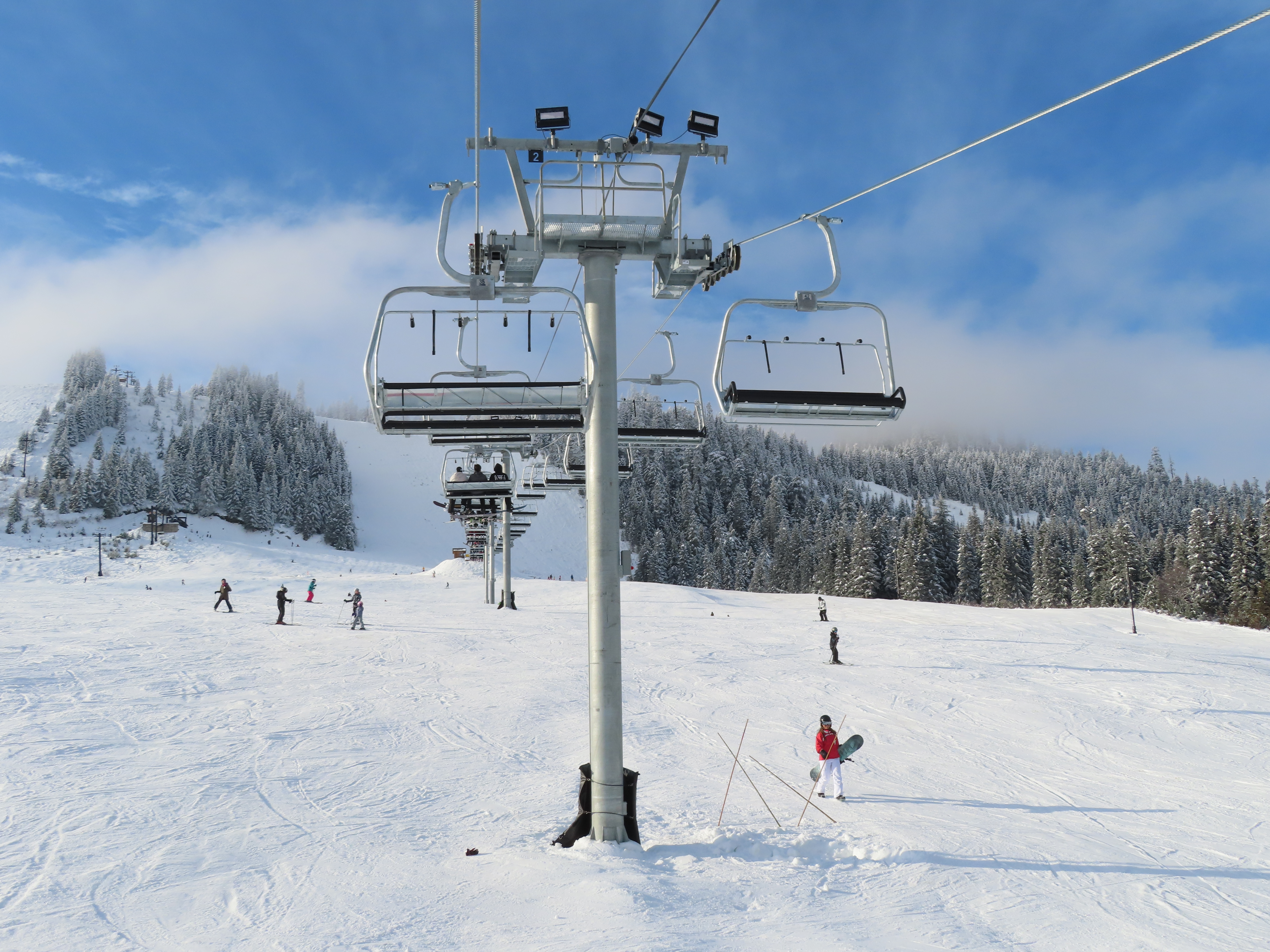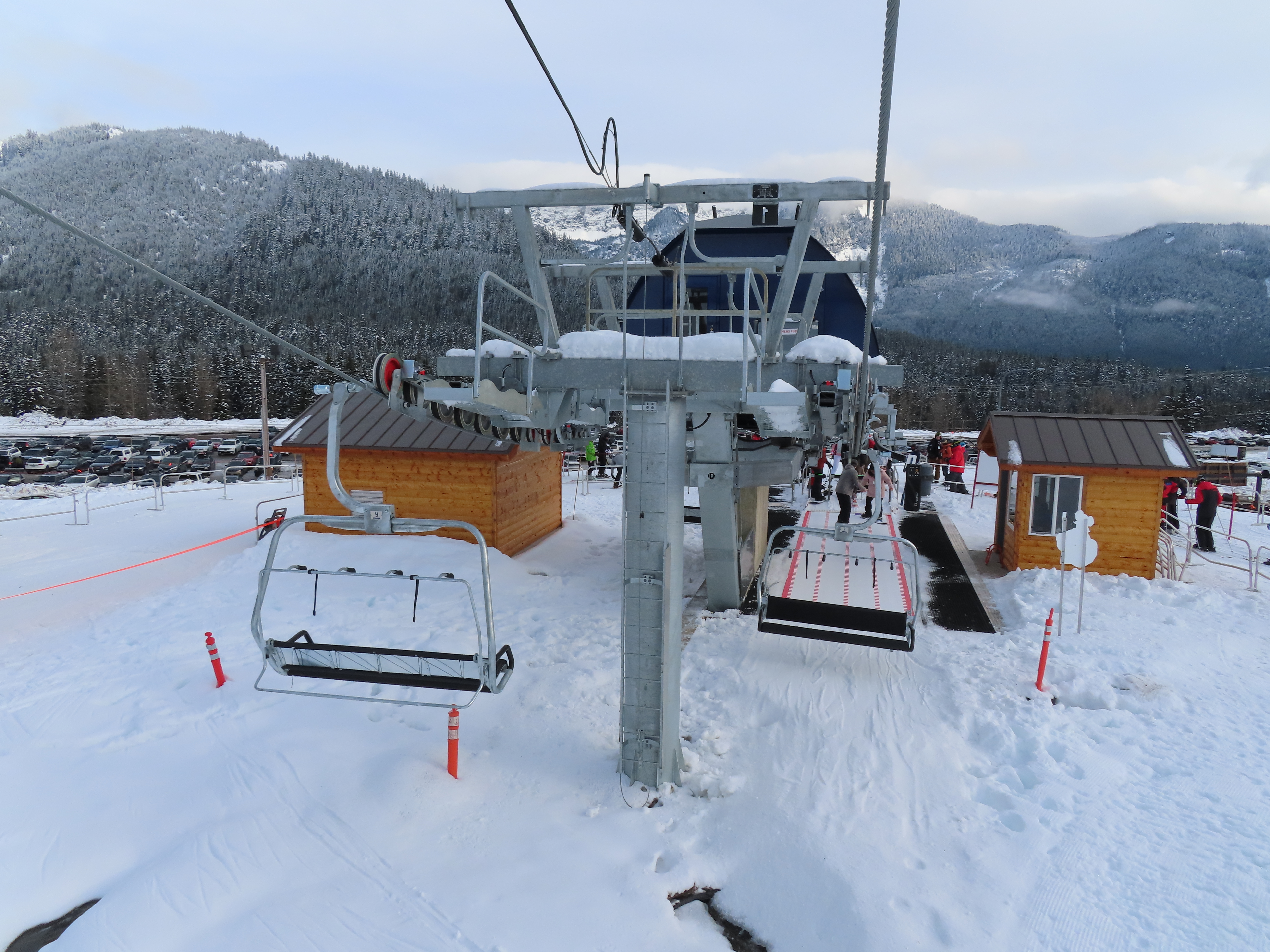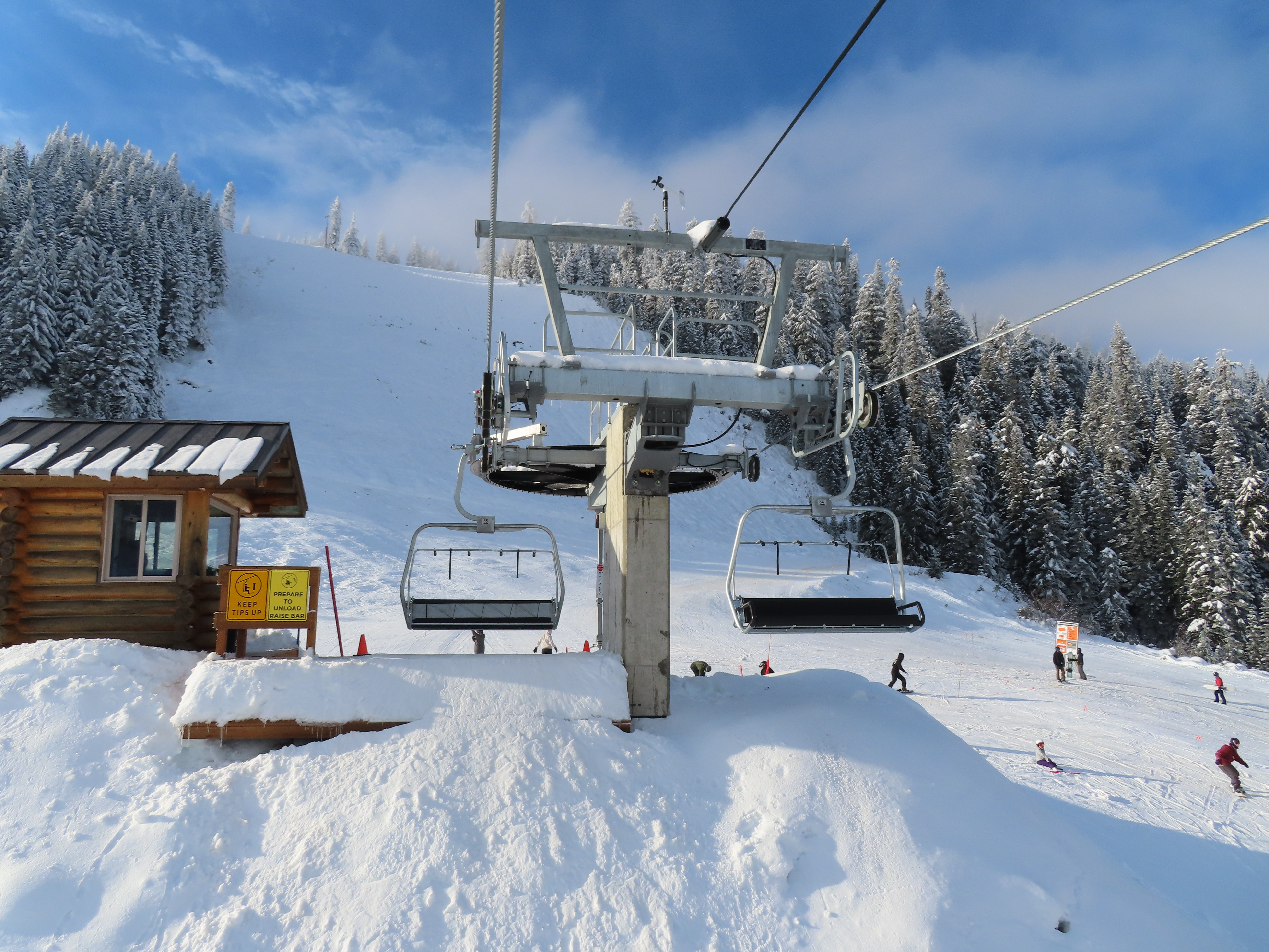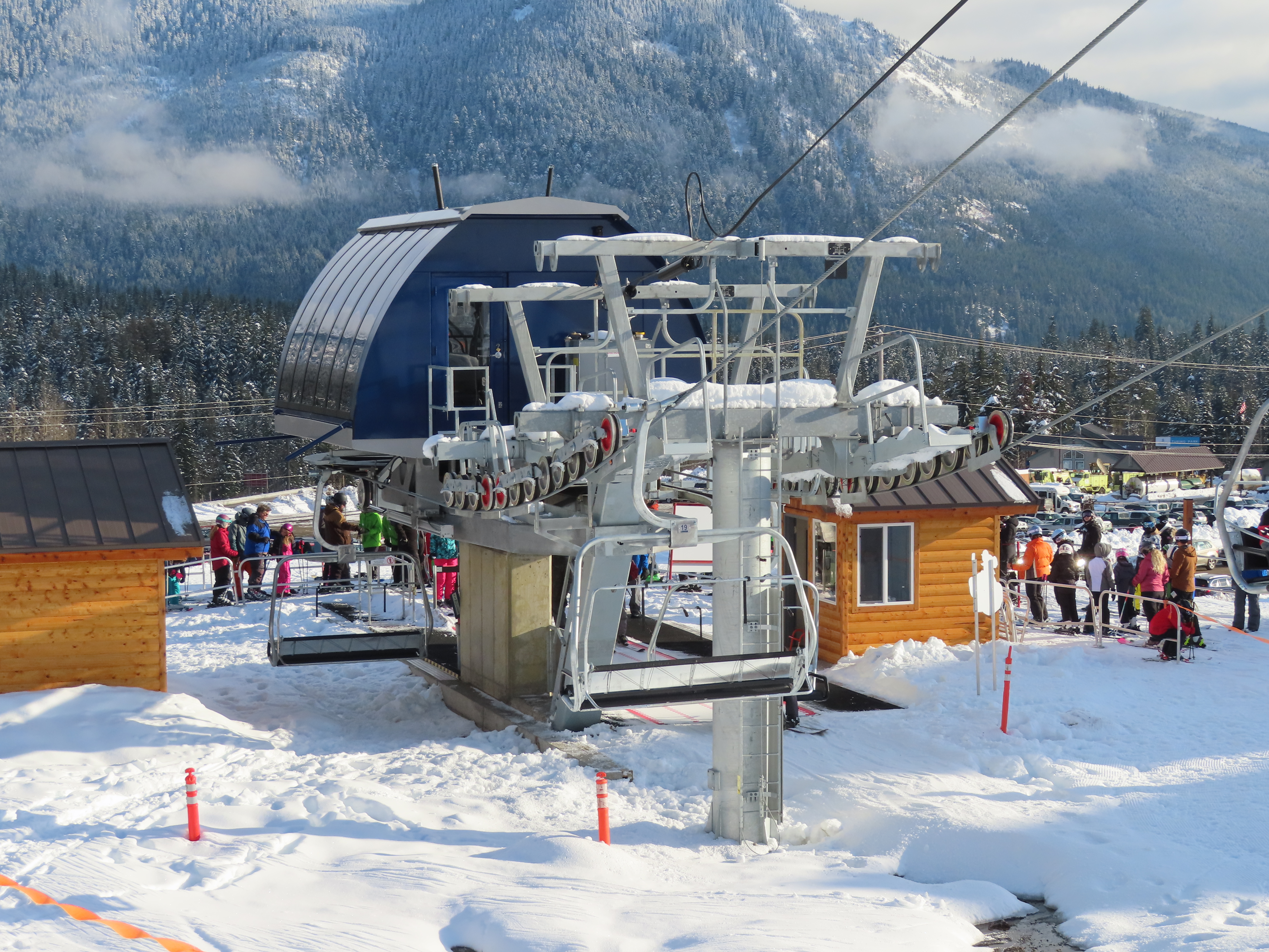 This Alpen Star quad replaced a Riblet double of the same name in 2019.Tower 1.The top terminal and reused lift shack from the previous chair.View down the lift line.Return bullwheel up top.Tower 6.Looking up the line.Lower part of the line at Summit Central.Side view of the bottom station.Loading carpet.Tower 2.Tower head with night lighting.Arriving at the summit.Tower 5.View up from the base area.Another view of the drive terminal.Loading area and motor room.Riding up the line.View down at tower 6.Lift overview.