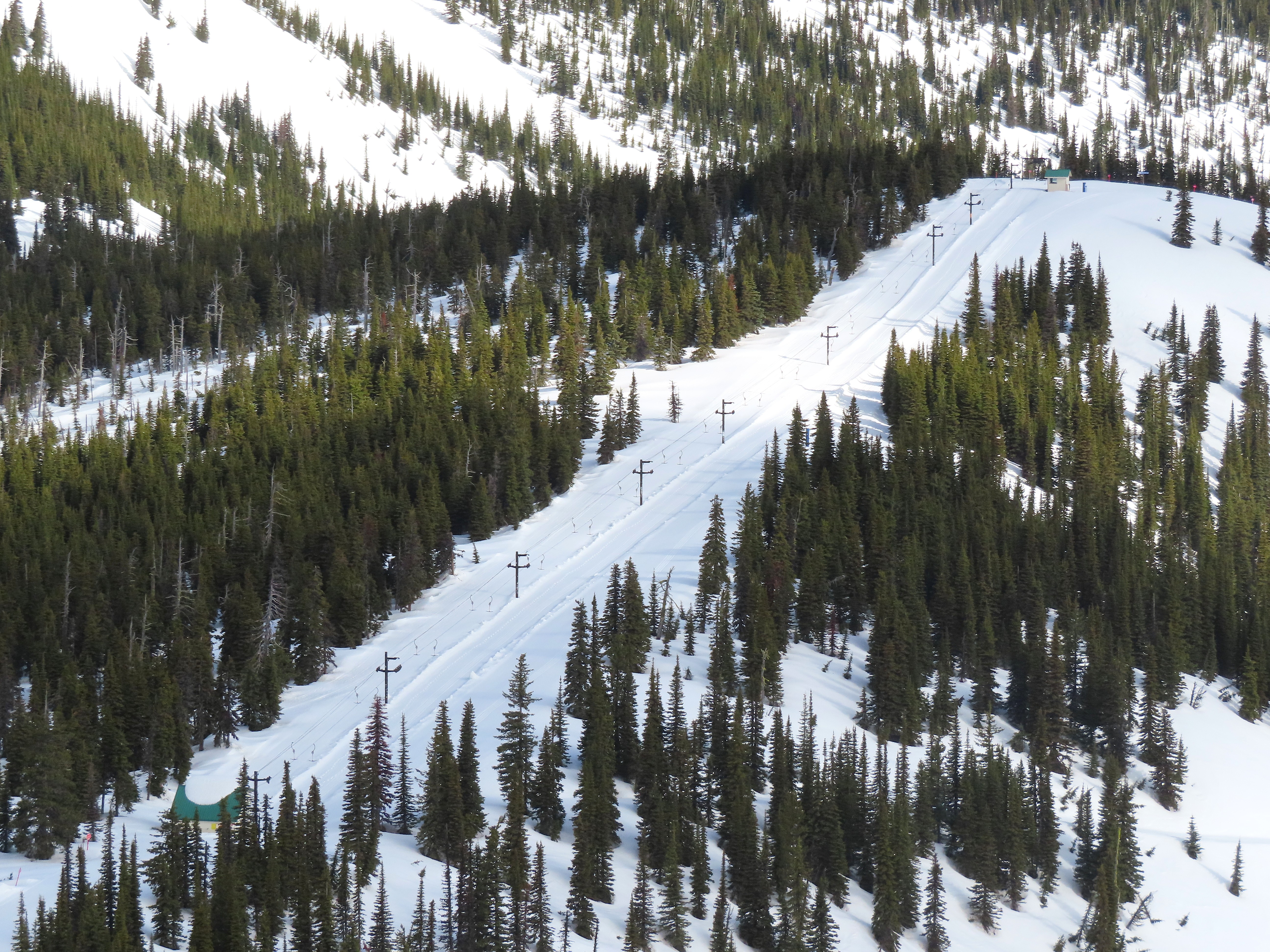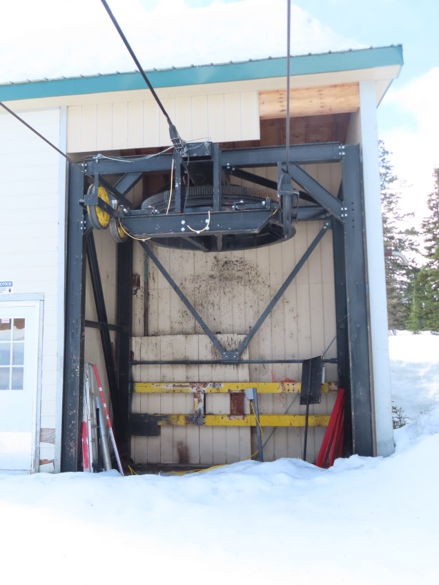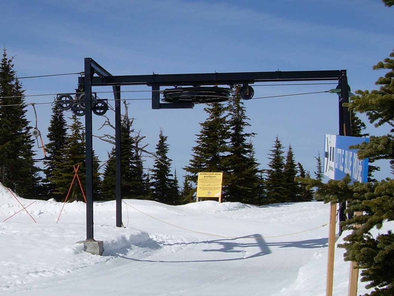 Top tension bullwheel.Bottom drive terminal.Lift line.Tower and line gear.Entire lift seen from above.View down the lower line.Upper lift line.The top terminal atop Little Blue Ridge.View from the summit.Drive bullwheel.