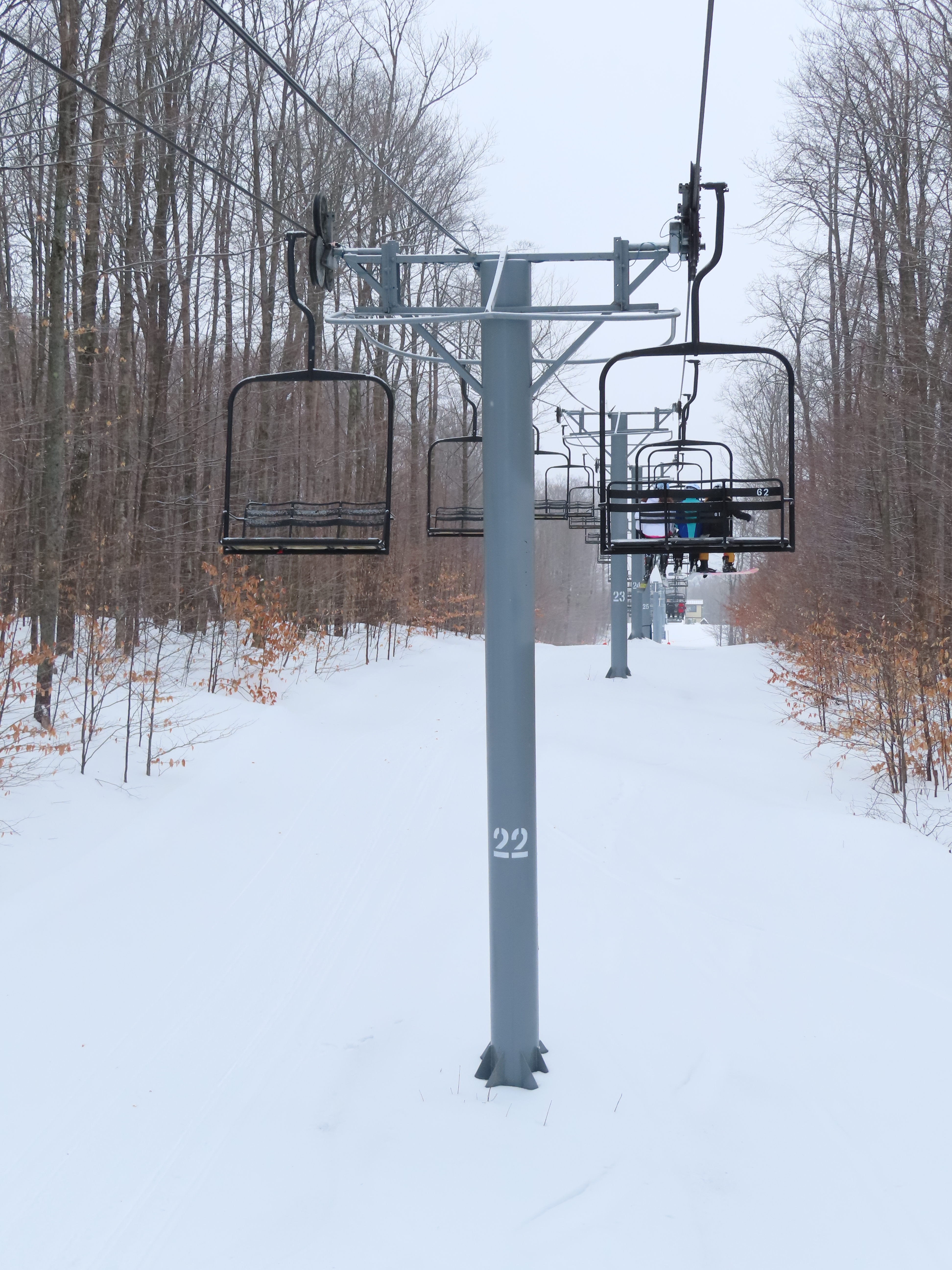 This late model Riblet triple connects the main face of Boyne Highlands with the North Face.Loading area.Look closely and you’ll see where the counterweight pit is.Departing the bottom station.Tower 9.The lift travels down at one point.View back at the middle section.Upper lift line.Nearing the summit.Arriving at the drive terminal.Unloading ramp.Upper terminal and the lift line.View down near the summit.Upper lift line.Tower 1 and the return terminal.