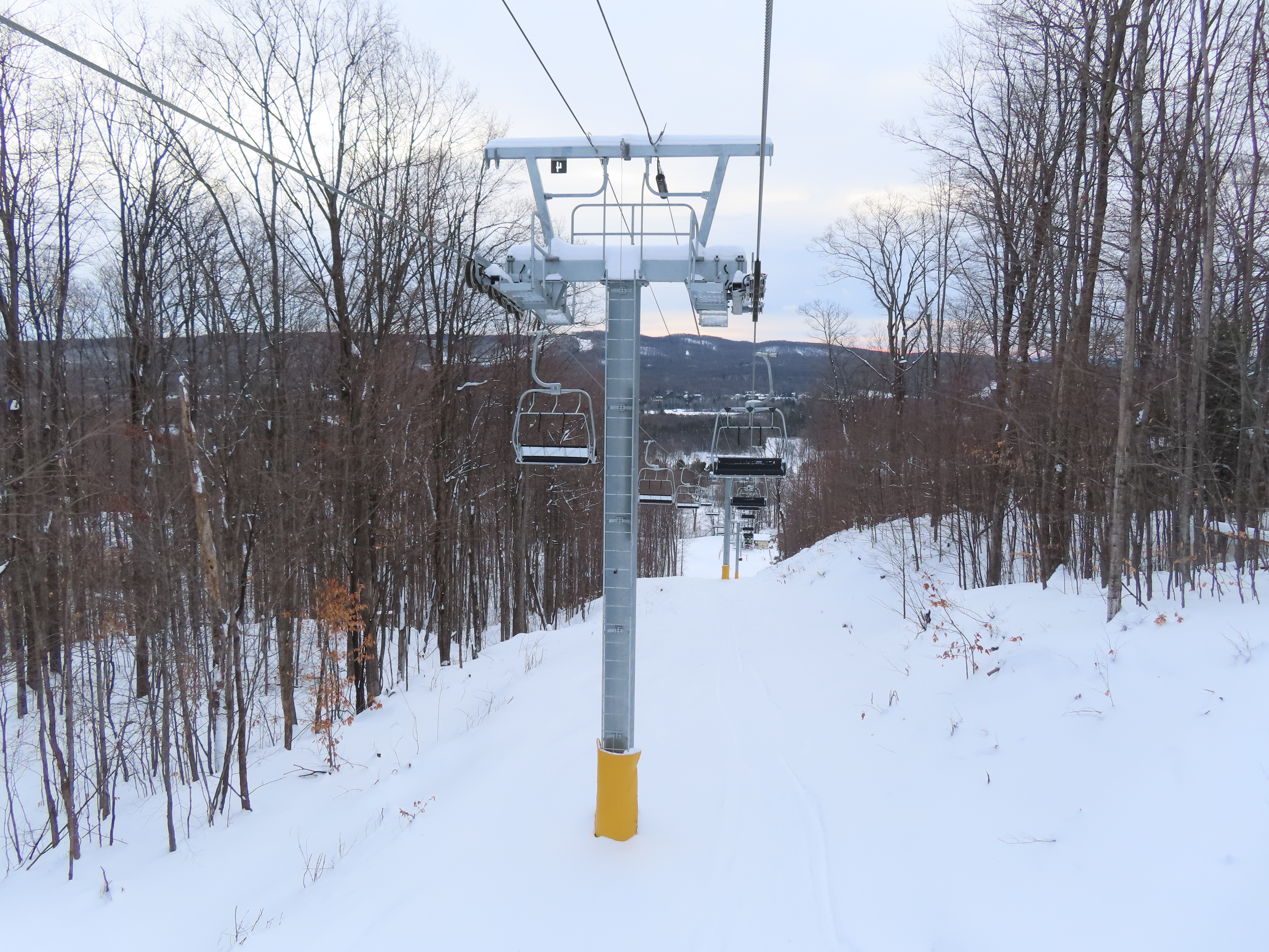 This Doppelmayr triple replaced a Riblet triple for the 2024-25 season.The bottom station features hydraulic tensioning and a loading conveyor.Tower 1 and the bottom station in the same location as the old lift.Doppelmayr name plate.The loading conveyor and queueing gates.Another view of the bottom station.Tower 3.View back down the line at tower 4.At one point this lift travels downhill.Tower 7 crossarm and lifting frame.Upper part of the very flat lift line.Rare fixed triple with puck style footrests.Tower 13.Arriving at the fixed drive up top.Unloading area and motor room.Upper station overview.Side view of the top station.View down near the summit with Nubs Nob Ski Area in the background.Upper lift line.The only section of the line with decent pitch.