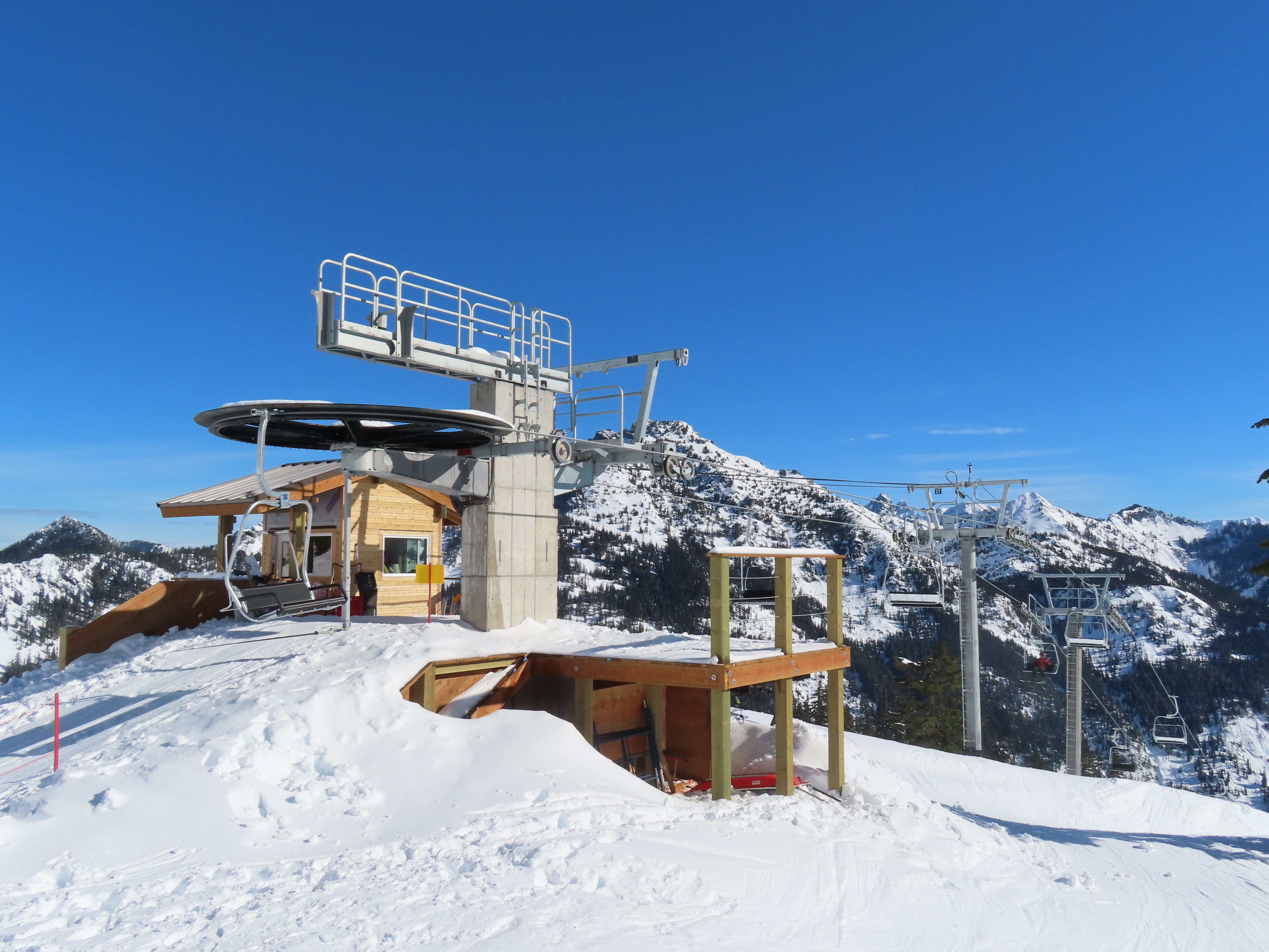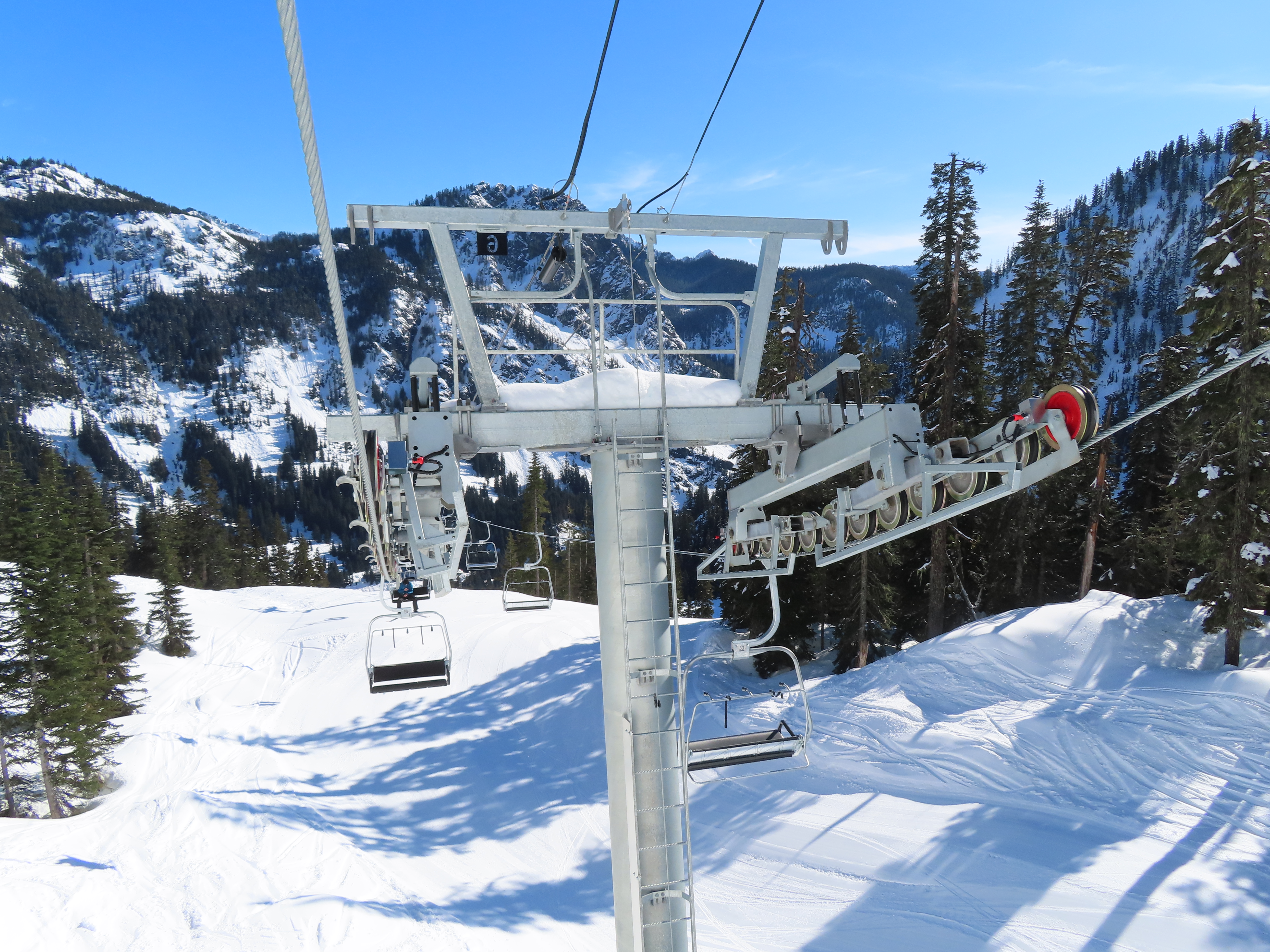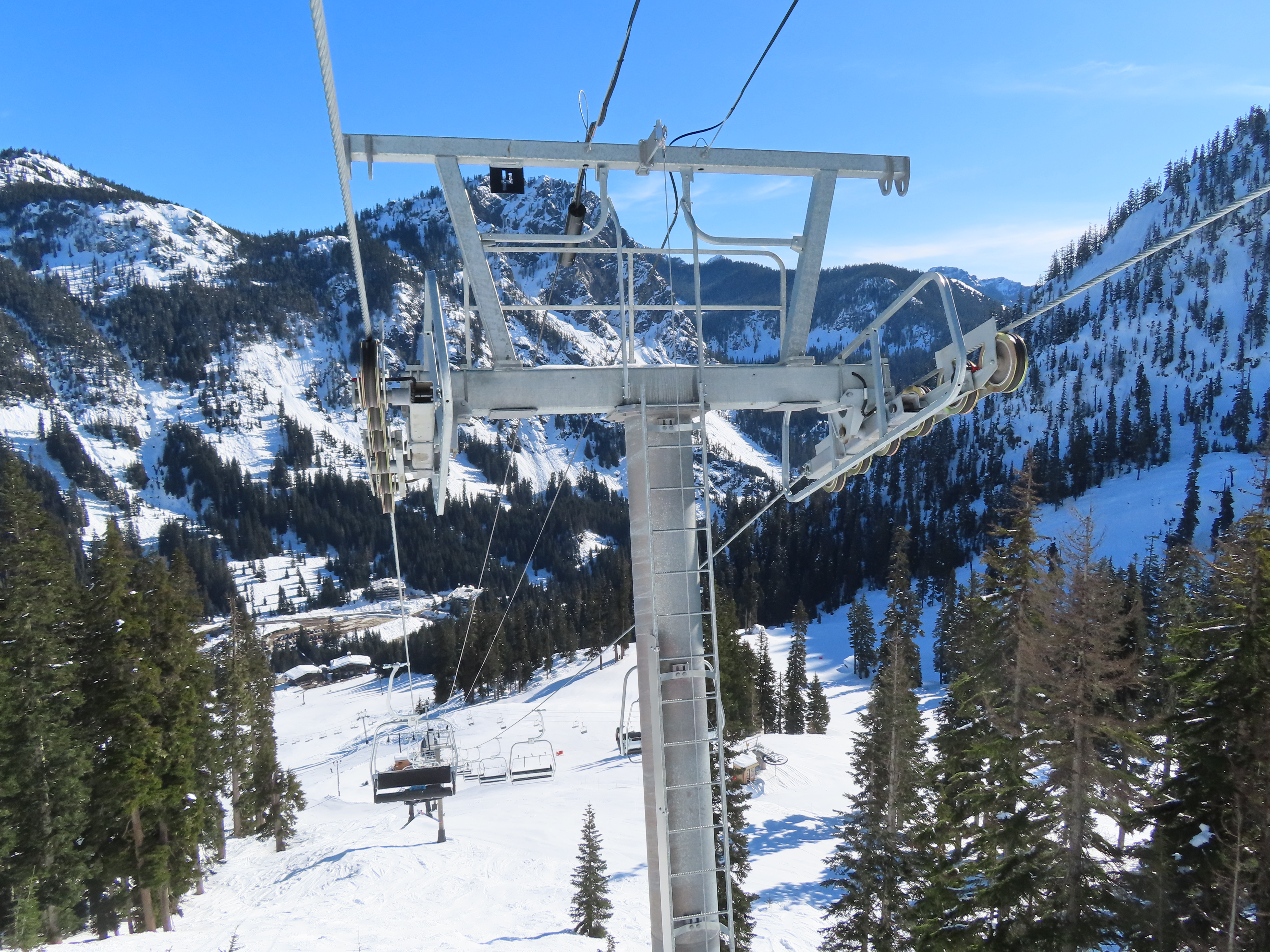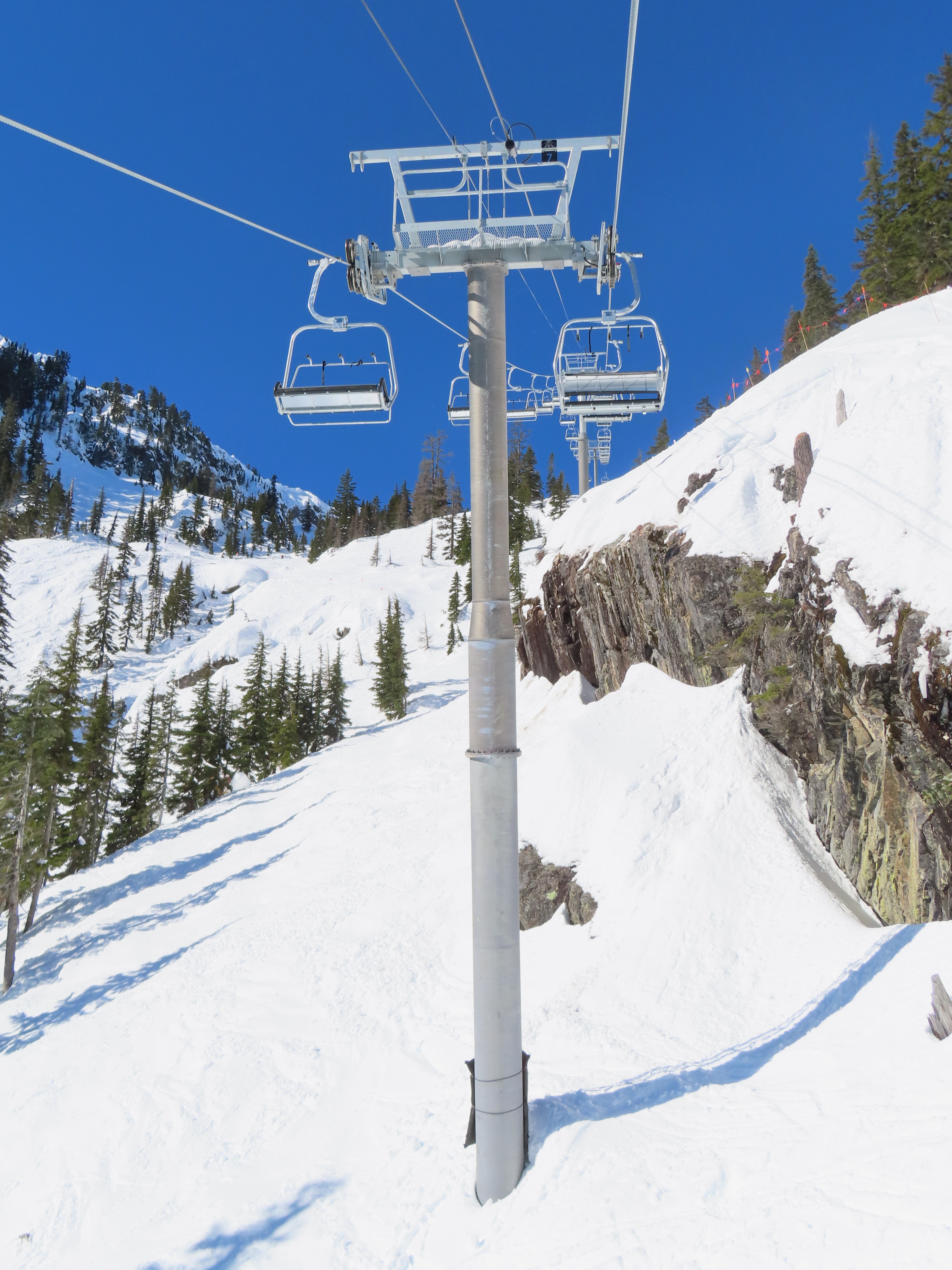 Doppelmayr and The Summit spent multiple years realizing this steep expansion lift in the International area of the mountain.The new lift does not feature a loading conveyor, breaking a long series of new fixed grip lifts with conveyors at Snoqualmie.View riding up the scenic lift line.Doppelmayr fixed grip tower head.Middle section of the lift line.Hold down tower 6.Towers 7 and 8 follow a steep cliff band.Very tall tower 8.Nearing the summit.Upper section of the lift line.The final breakover.This station has no road access and was installed by helicopter.Upper station with catwalk above.View from the summit.The last few towers seen from below.Steep lift line over rugged topography.Towers 9 and 10.View down the steepest section of the line.Tower 8.View up at tower 5.Lower lift line.The bottom station next to sister lift Sessel.The first few towers feature night lighting, though this lift doesn’t run at night.Loading area.Much of this lift was built over snow due to minimal access.Unloading area.A section of the line near the summit.Another view up at tower 8.Combination assembly.Flat part of the line.Internationale seen from International.Upper lift line seen from below.Lift line passing over cliffs.Lift overview.
