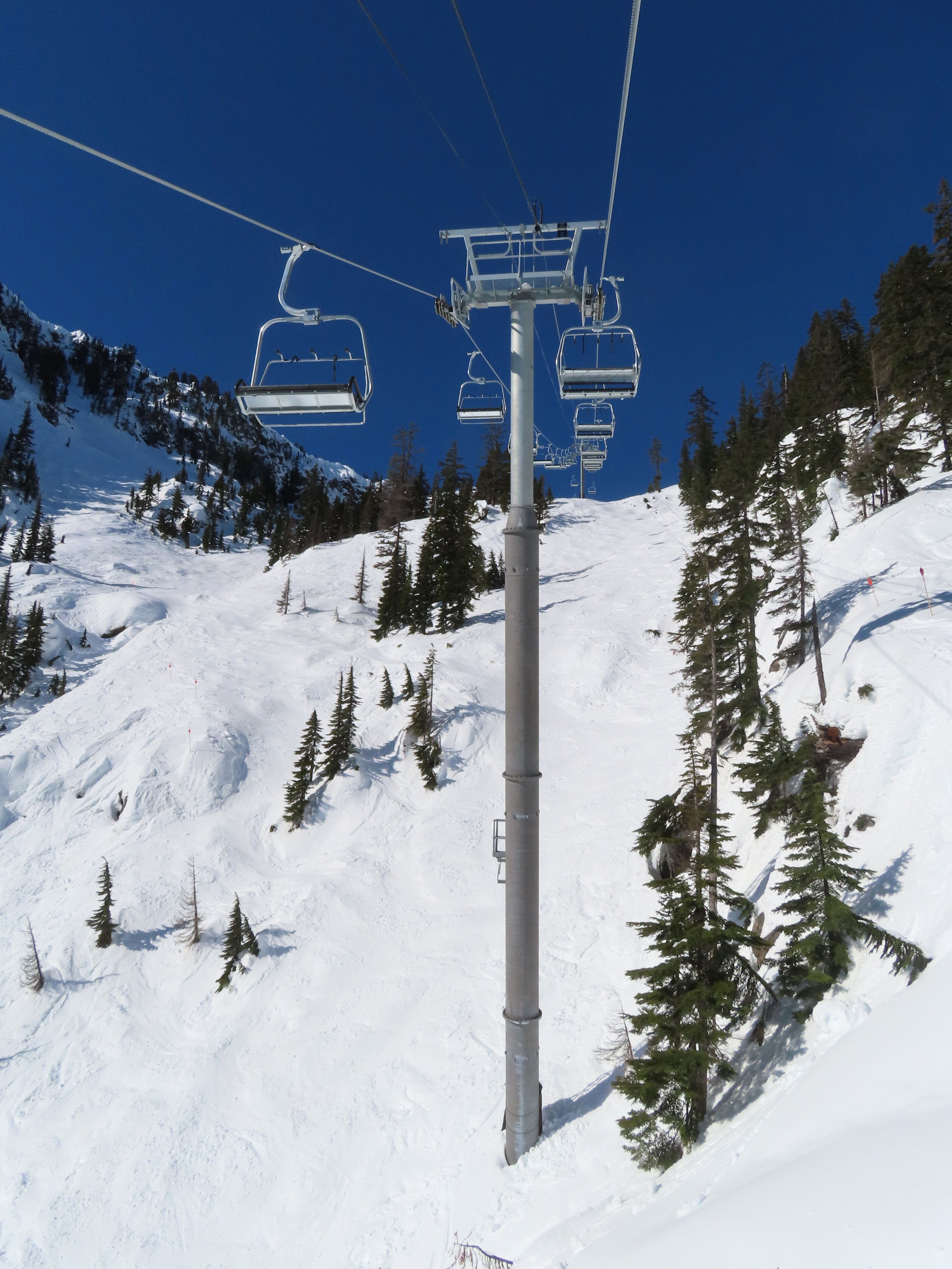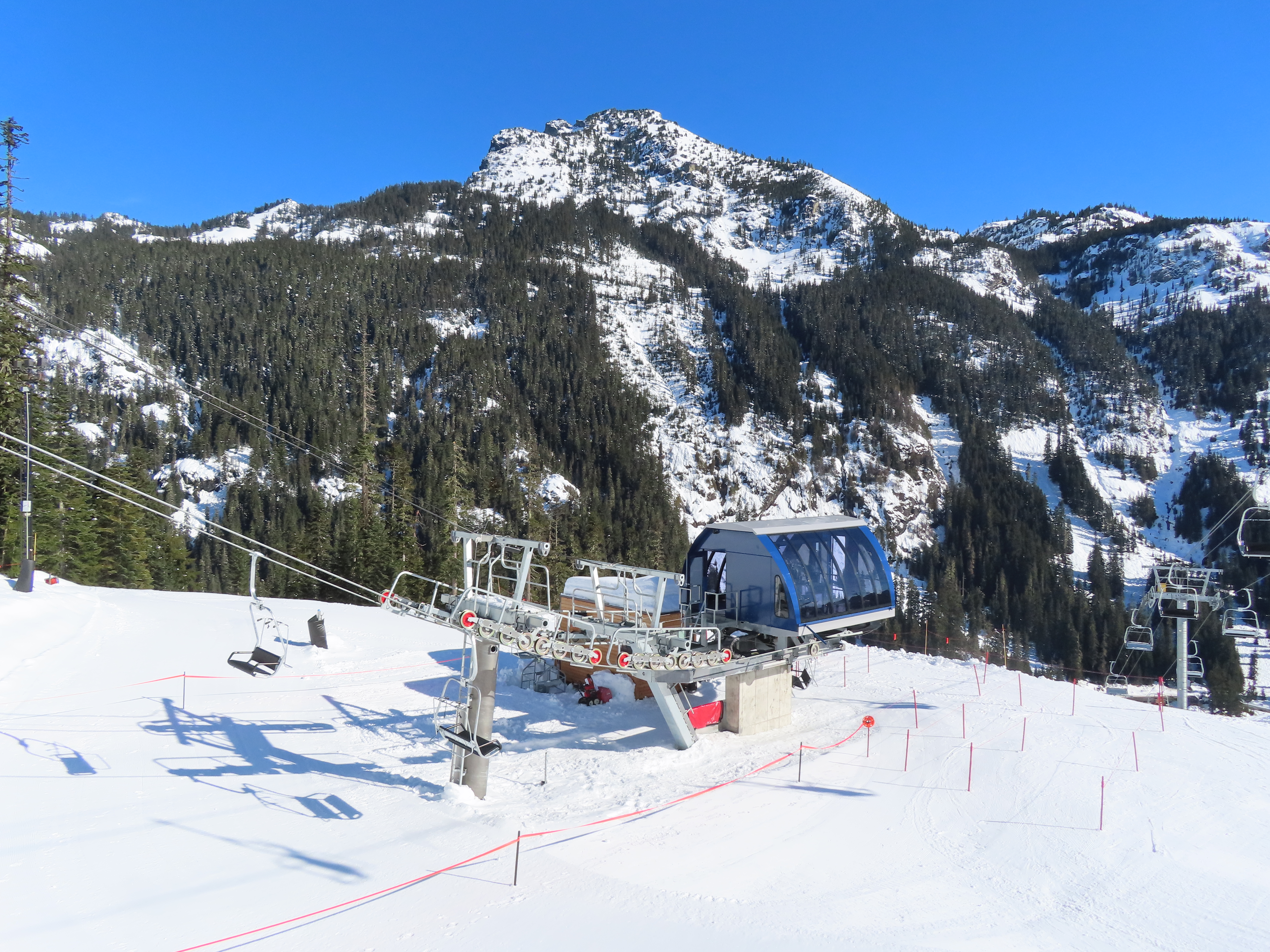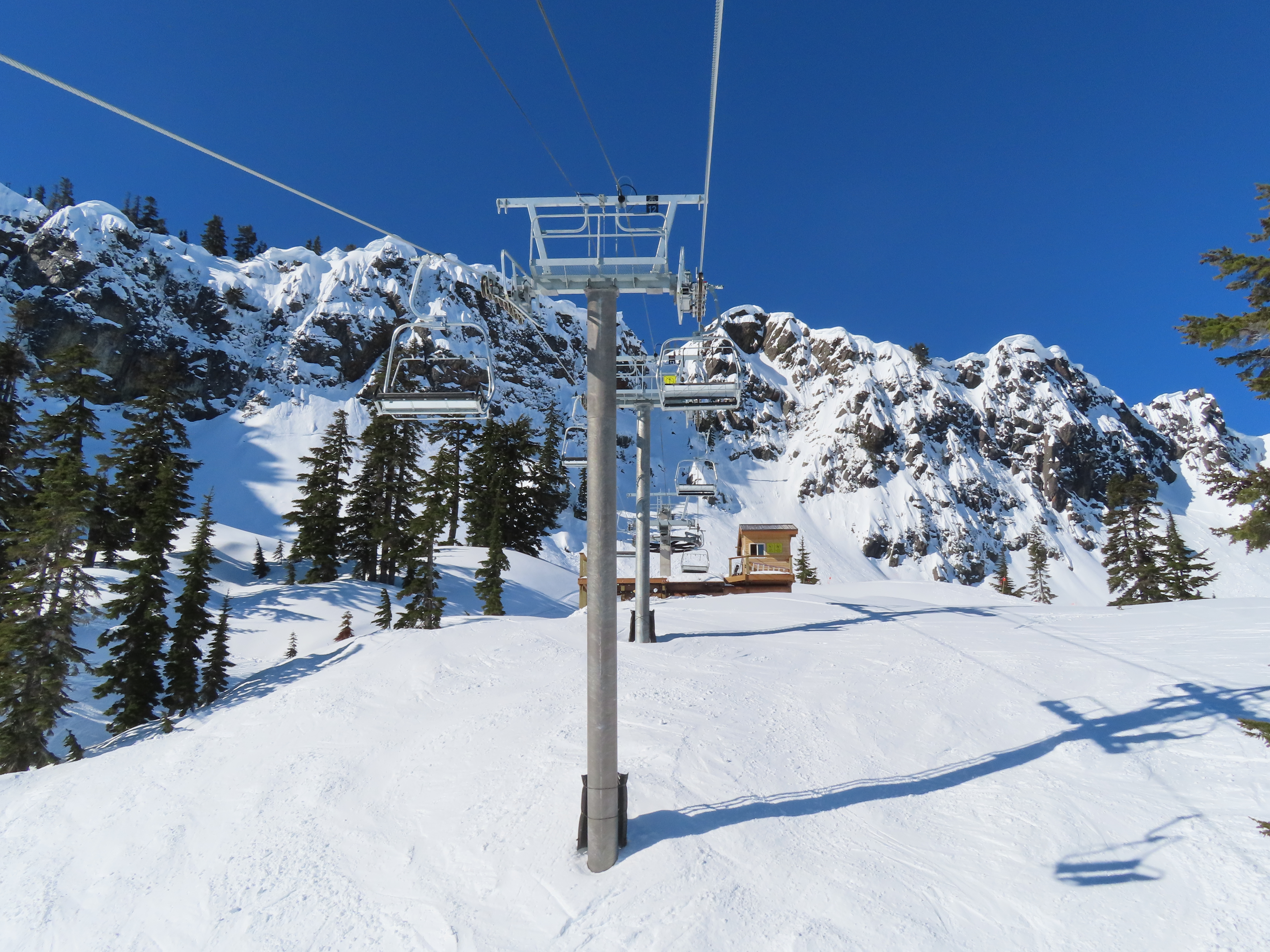 Doppelmayr and The Summit spent multiple years realizing this steep expansion lift in the International area of the mountain.The new lift does not feature a loading conveyor, breaking a long series of new fixed grip lifts with conveyors at Snoqualmie.View riding up the scenic lift line.Doppelmayr fixed grip tower head.Middle section of the lift line.Hold down tower 6.Towers 7 and 8 follow a steep cliff band.Very tall tower 8.Nearing the summit.Upper section of the lift line.The final breakover.This station has no road access and was installed by helicopter.Upper station with catwalk above.View from the summit.The last few towers seen from below.Steep lift line over rugged topography.Towers 9 and 10.View down the steepest section of the line.Tower 8.View up at tower 5.Lower lift line.The bottom station next to sister lift Sessel.The first few towers feature night lighting, though this lift doesn’t run at night.Loading area.Much of this lift was built over snow due to minimal access.Unloading area.A section of the line near the summit.Another view up at tower 8.Combination assembly.Flat part of the line.Internationale seen from International.Upper lift line seen from below.Lift line passing over cliffs.Lift overview.