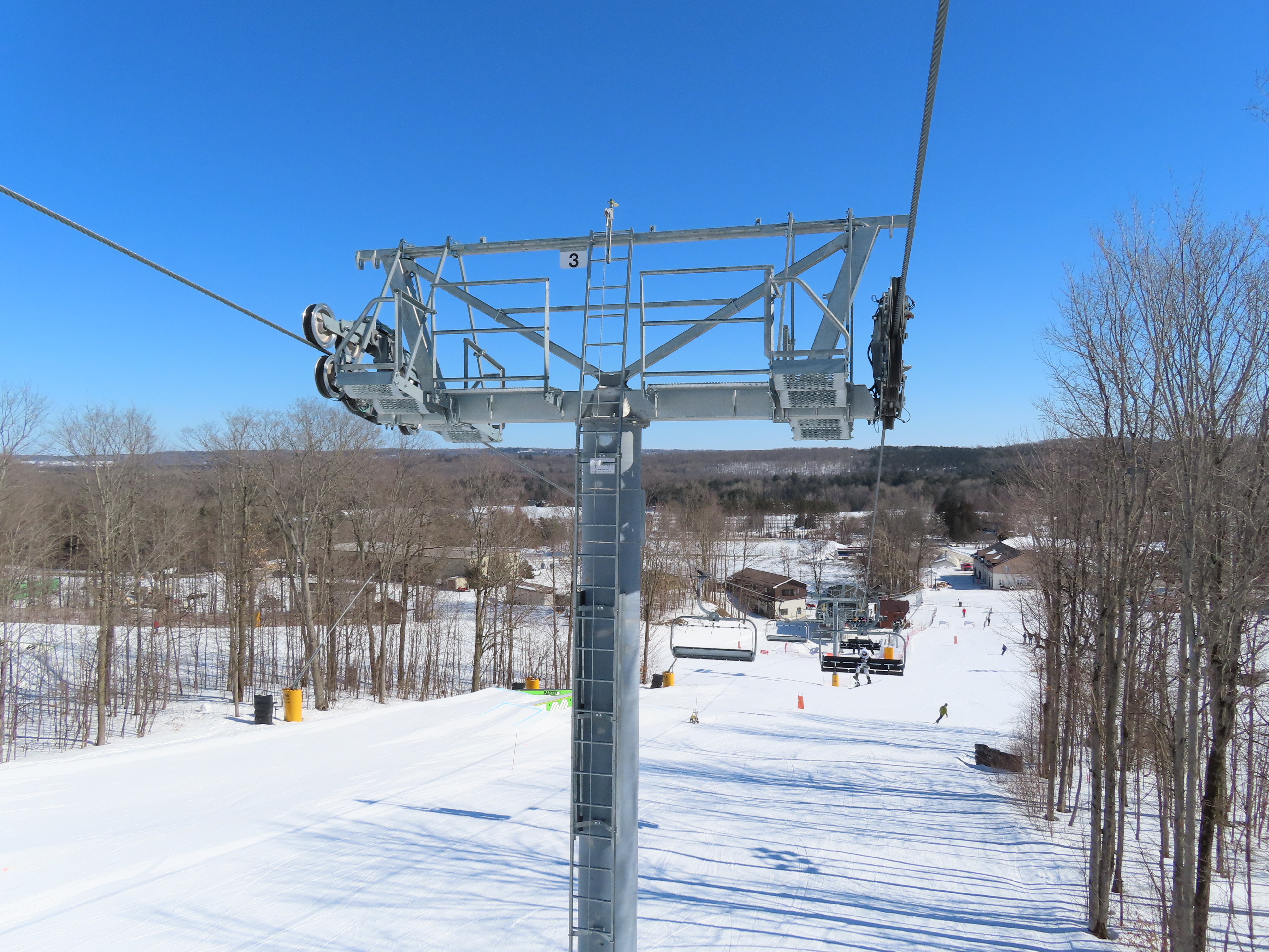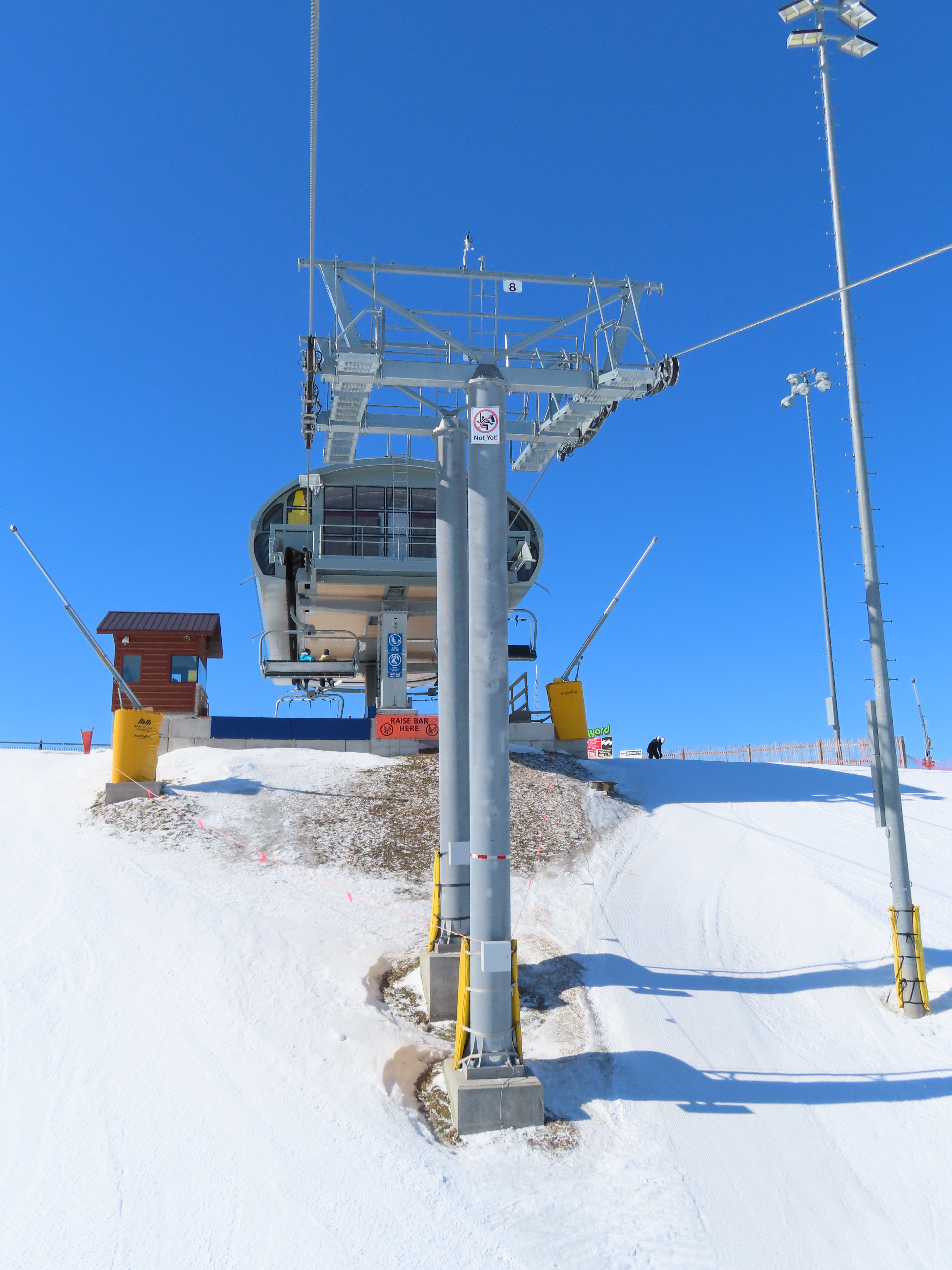 This Leitner-Poma six place replaced an older detachable quad.Loading area and lift line.Leitner-Poma tower head.The new lift ends higher than the old and follows an adjusted alignment further looker’s left.Breakover towers 8 and 9.Arriving at the return terminal.Upper station with short maintenance rail.View from the summit.Upper part of the lift line on man-made fill.Middle lift line.View up at tower 5.Lower part of the line on natural ground.Lower station overview.View up from the base area.Leitner chair from Austria.Side view of the upper station.