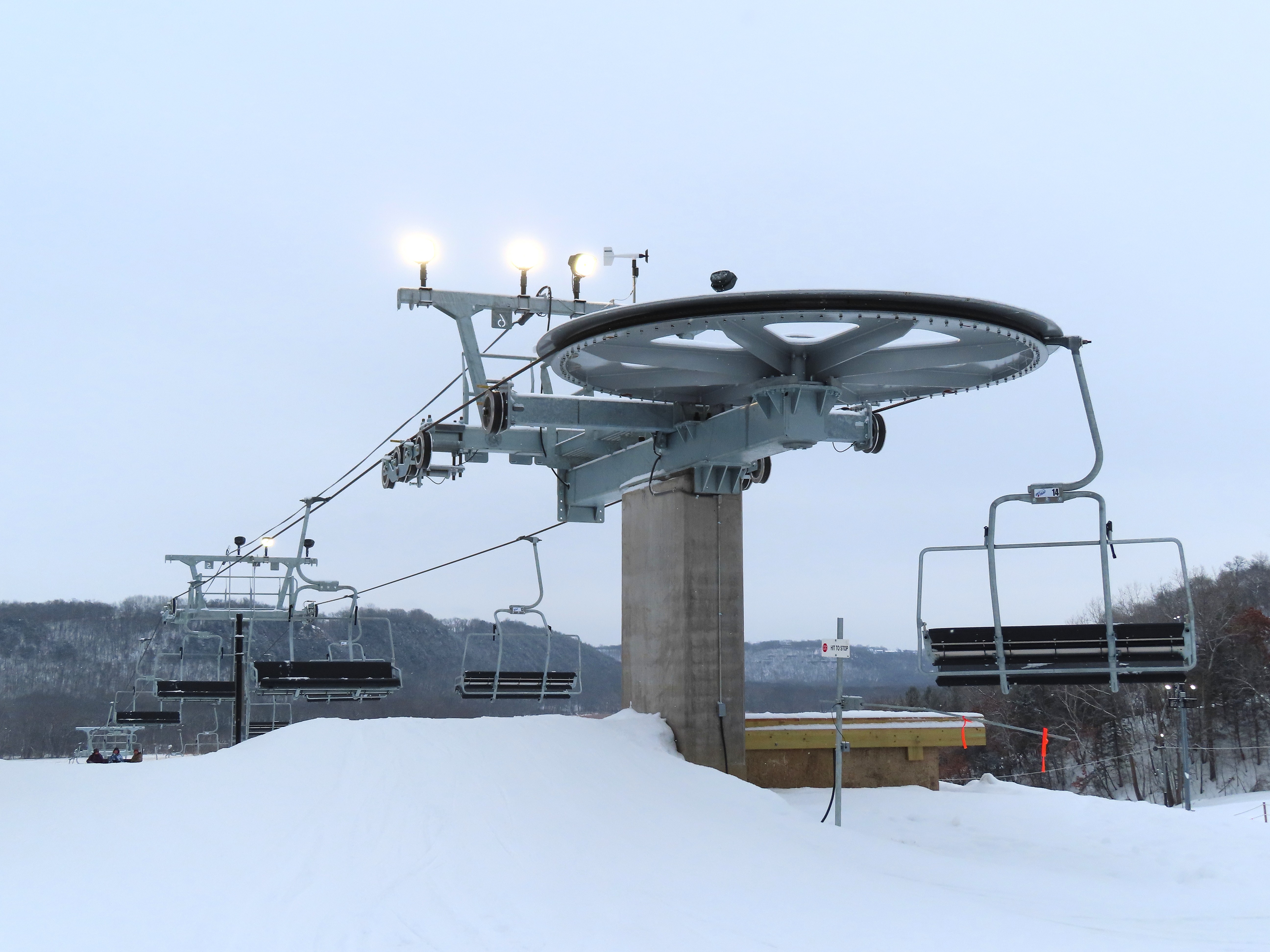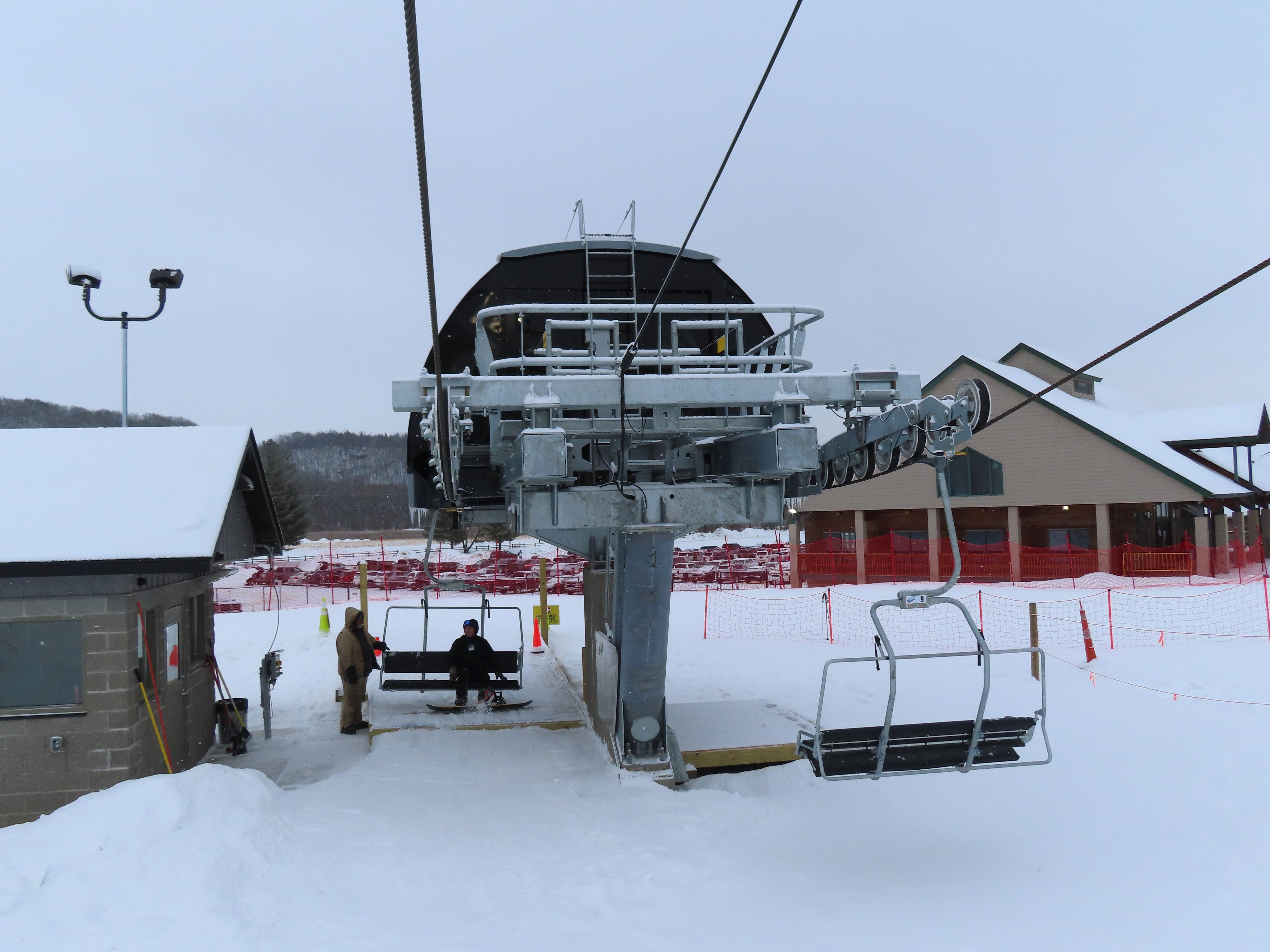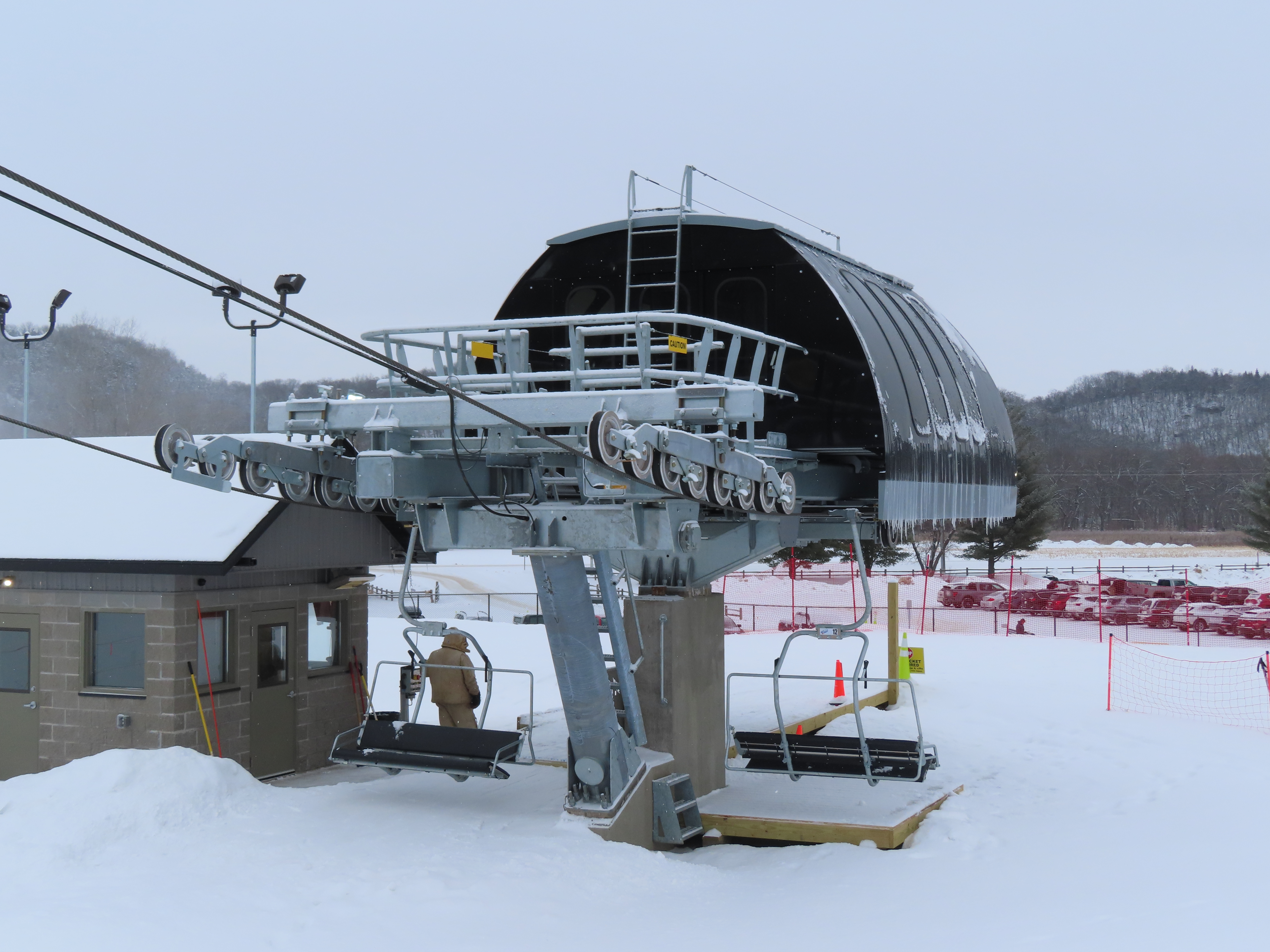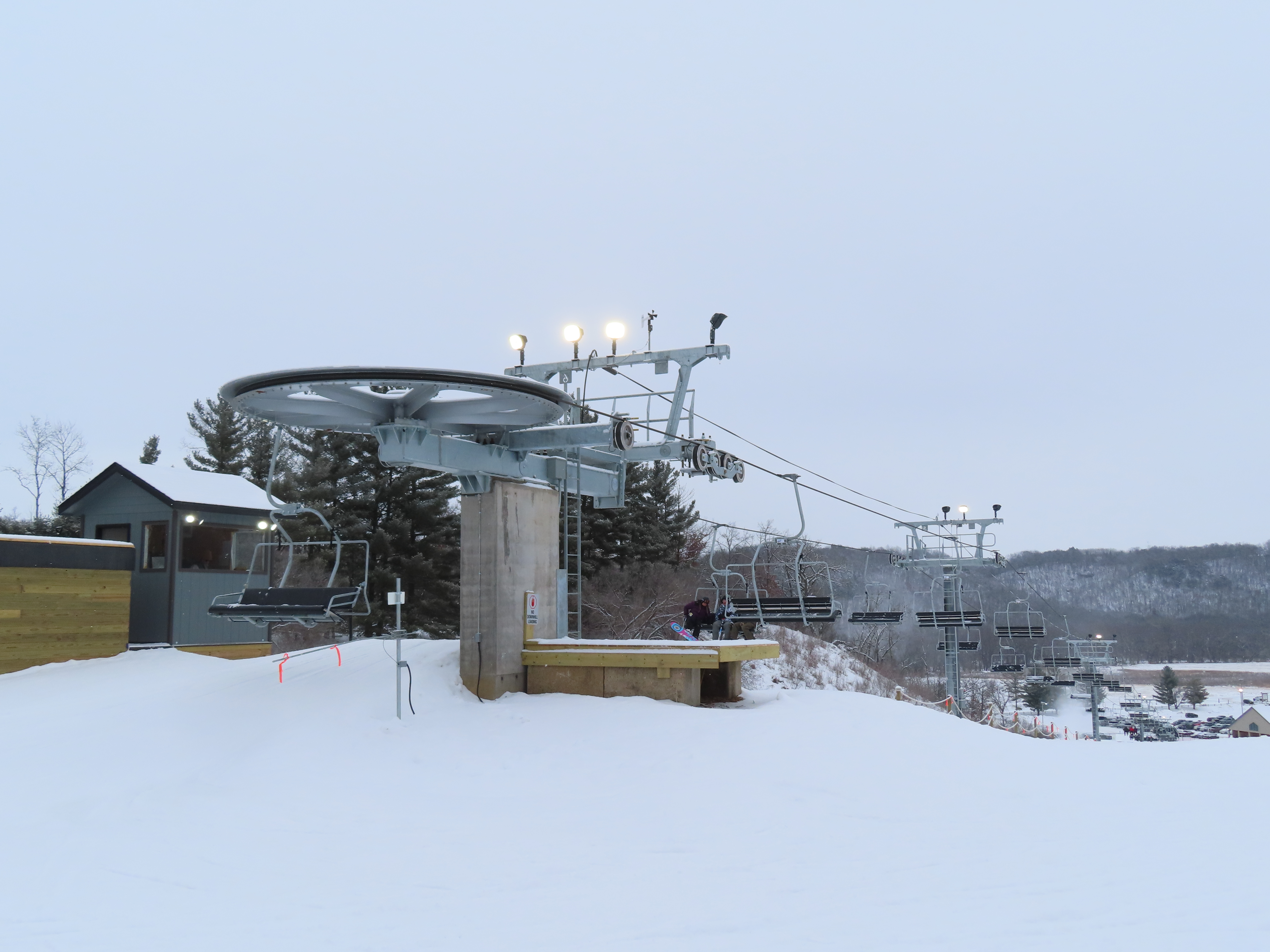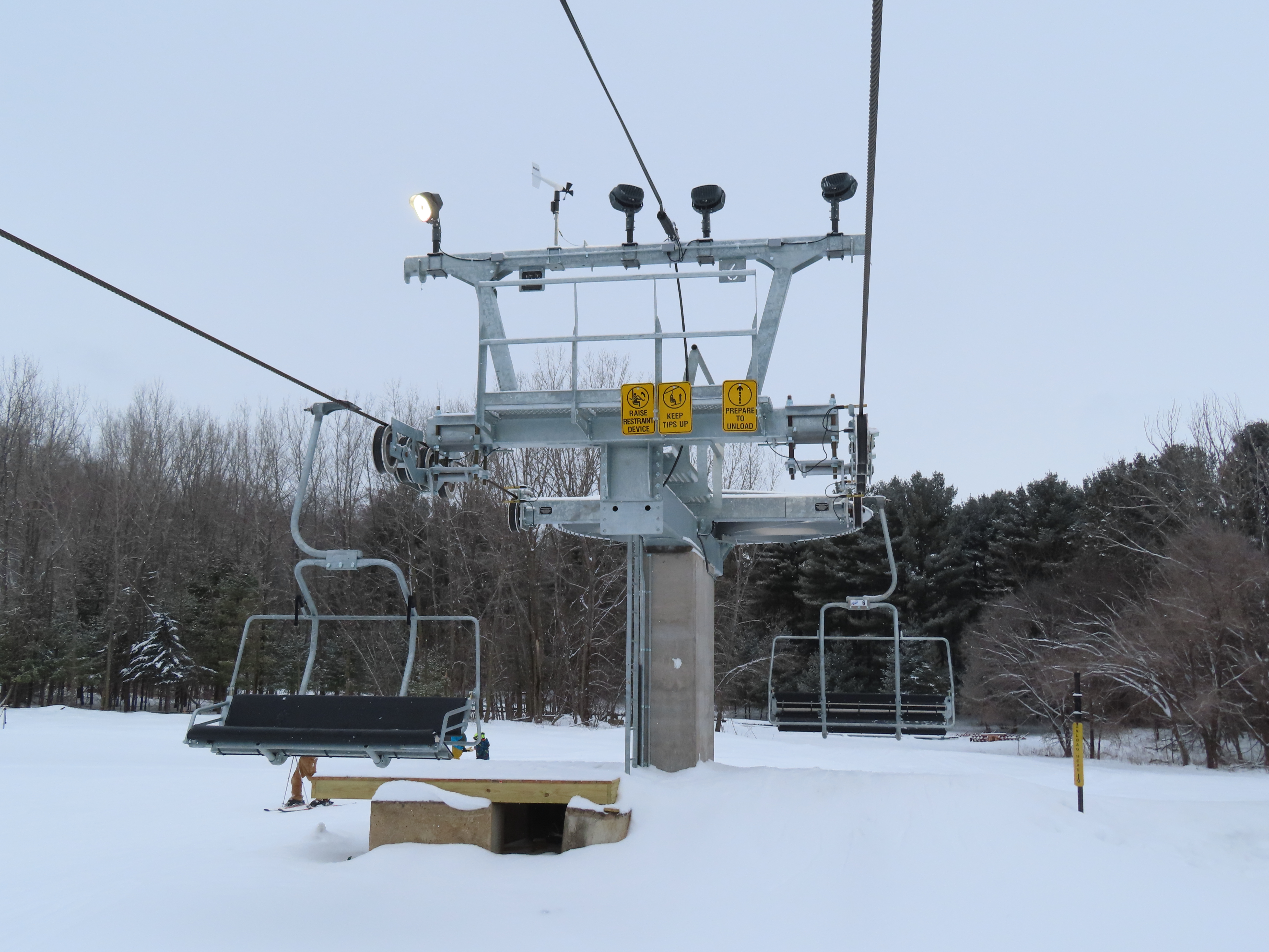 This lift anchors a new beginner area where a park and rope tow used to run.This is the first Skytrac for Welch, which also has Doppelmayr, Riblet and Doppelmayr CTEC fixed quads.View leaving the bottom terminal.Arriving at the top terminal location.Unload area with night lighting.Upper lift line overview.View down from tower 5.The top few towers with no ski under clearance.Lower lift line.Another view of the drive-tension station.Looking up the line from the magic carpet lift.Tower 2.Loading area.Side view of the Monarch station.
